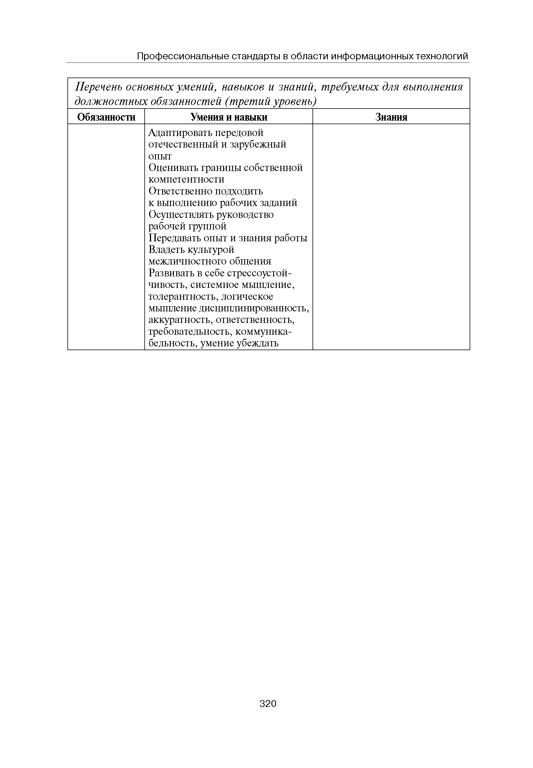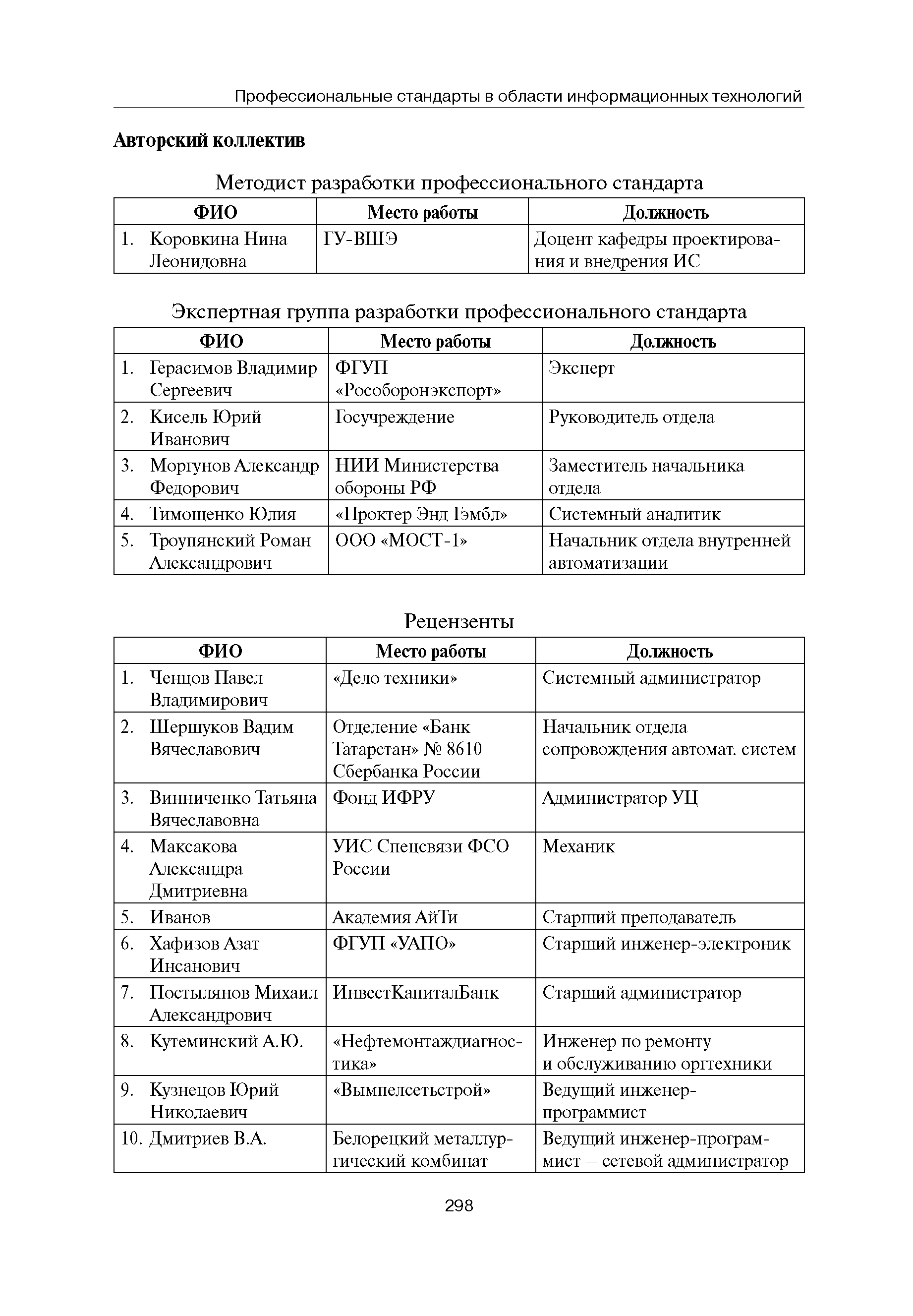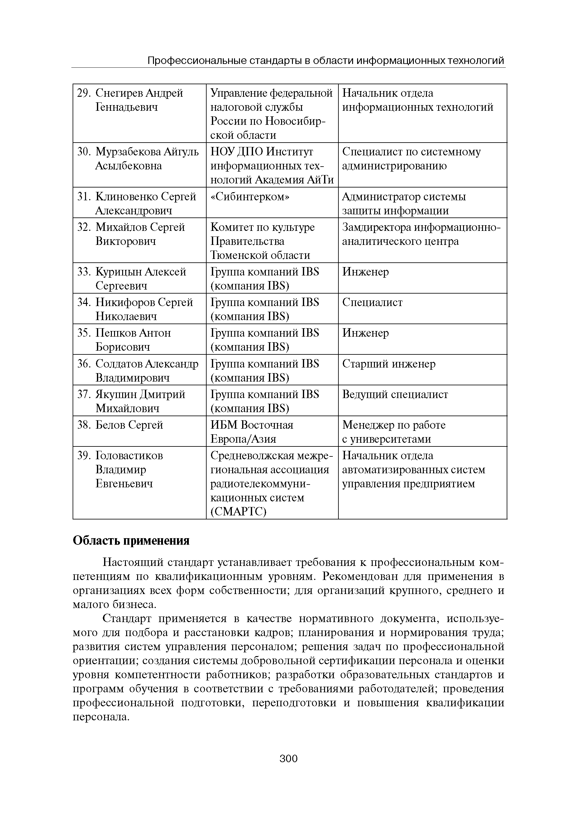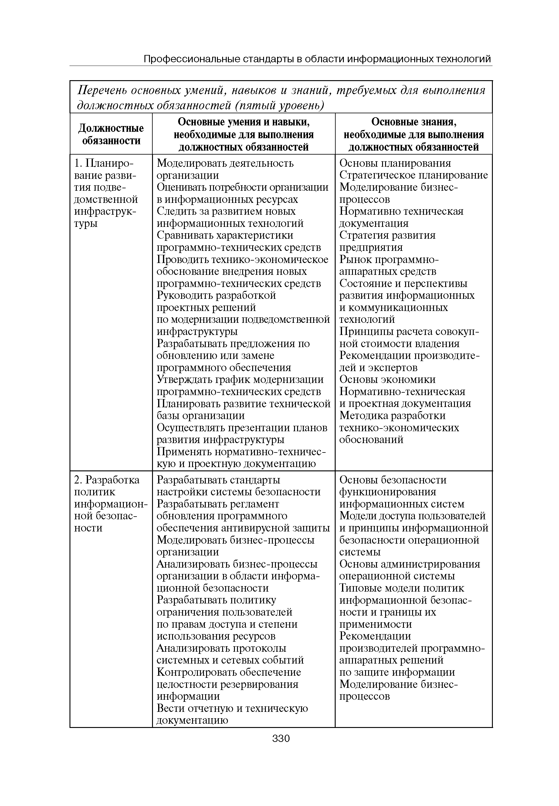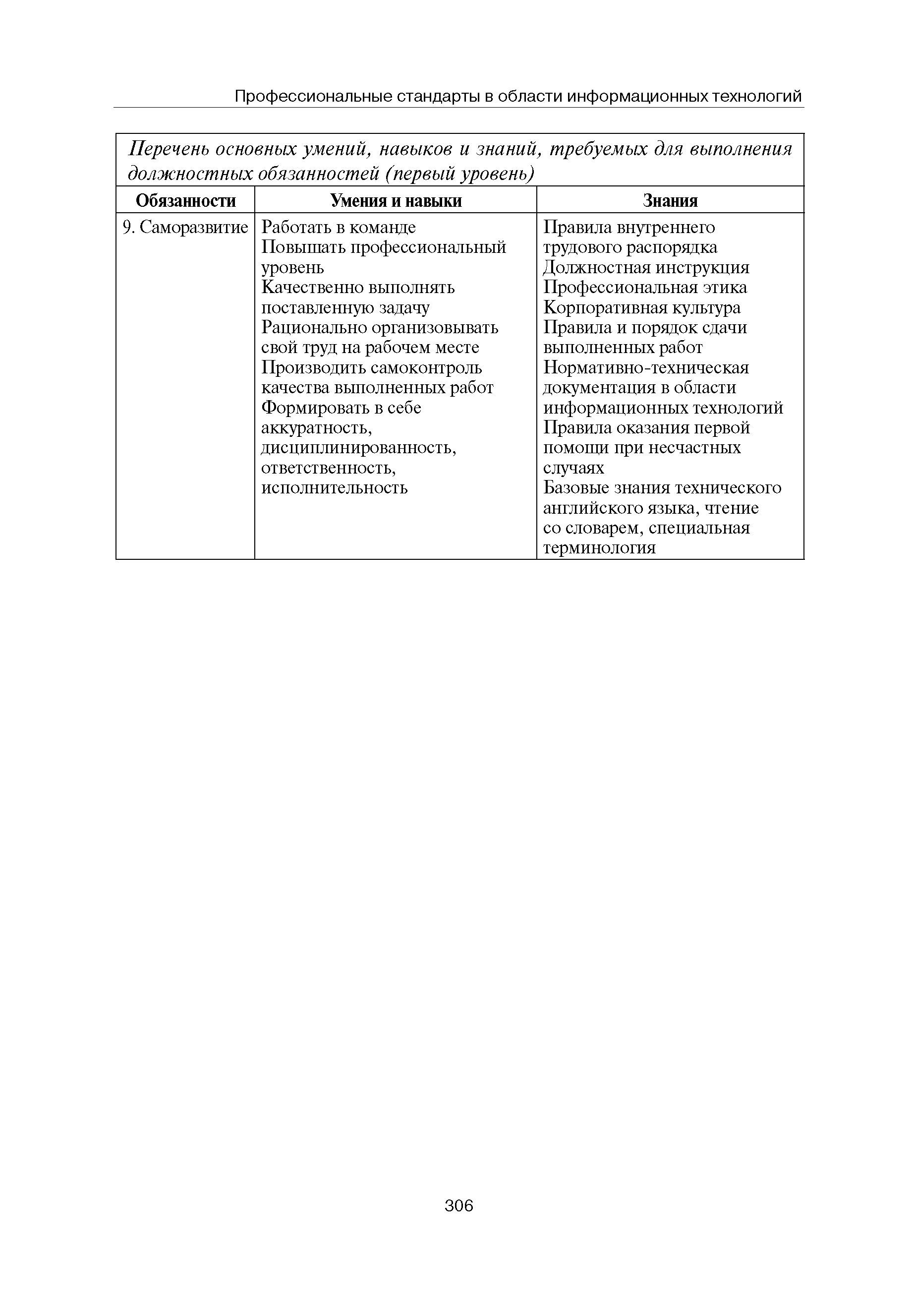 Квалификационные требования (профессиональный стандарт) в области информационных технологий "СПЕЦИАЛИСТ ПО СИСТЕМНОМУ АДМИНИСТРИРОВАНИЮ"| Статус: | действует | | Название рус.: | Квалификационные требования (профессиональный стандарт) в области информационных технологий "СПЕЦИАЛИСТ ПО СИСТЕМНОМУ АДМИНИСТРИРОВАНИЮ" | | Дата добавления в базу: | 01.09.2013 | | Дата актуализации: | 01.01.2021 | | Область применения: | Стандарт устанавливает требования к профессиональным компетенциям по квалификационным уровням. Рекомендован для применения в организациях всех форм собственности; для организаций крупного, среднего и малого бизнеса. Стандарт применяется в качестве нормативного документа, применяемого для подбора и расстановки кадров; планирования и нормирования труда; развития систем управления персоналом; для решения задач по профессиональной ориентации; для создания системы добровольной сертификации персонала и оценки уровня компетентности работников; для разработки образовательных стандартов и программ обучения в соответствии с требованиями работодателей; для проведения профессиональной подготовки, переподготовки и повышения квалификации персонала. | | Оглавление: | Авторский коллектив Область применения Указание сегмента сферы труда Профессиональный стандарт по профессии "Специалист по системному администрированию" Первый квалификационный уровень Перечень должностных обязанностей для первого квалификационного уровня Перечень основных умений, навыков и знаний, требуемых для выполнения должностных обязанностей (1 уровень) Второй квалификационный уровень Перечень должностных обязанностей для второго квалификационного уровня Перечень основных умений, навыков и знаний, требуемых для выполнения должностных обязанностей (2 уровень) Третий квалификационный уровень Перечень должностных обязанностей для третьего квалификационного уровня Перечень основных умений, навыков и знаний, требуемых для выполнения должностных обязанностей (3 уровень) Четвертый квалификационный уровень Перечень должностных обязанностей для четвертого квалификационного уровня Перечень основных умений, навыков и знаний, требуемых для выполнения должностных обязанностей (4 уровень) Пятый квалификационный уровень Перечень должностных обязанностей для пятого квалификационного уровня Перечень основных умений, навыков и знаний, требуемых для выполнения должностных обязанностей (5 уровень) | | Разработан: | Государственный университет - Высшая школа экономики ФГУП Рособоронэкспорт НИИ Министерства обороны РФ Проктер Энд Гэмбл ООО МОСТ-1