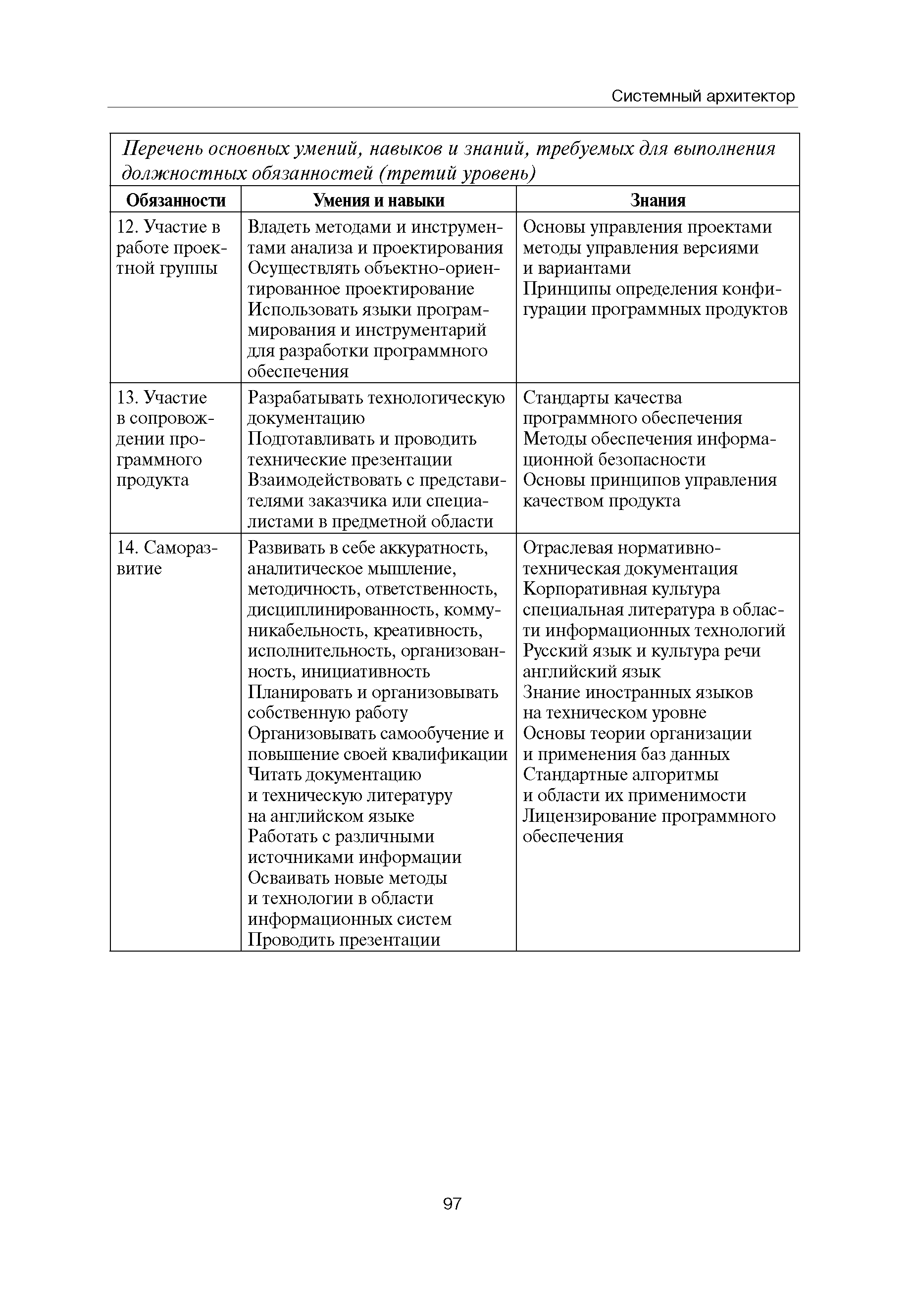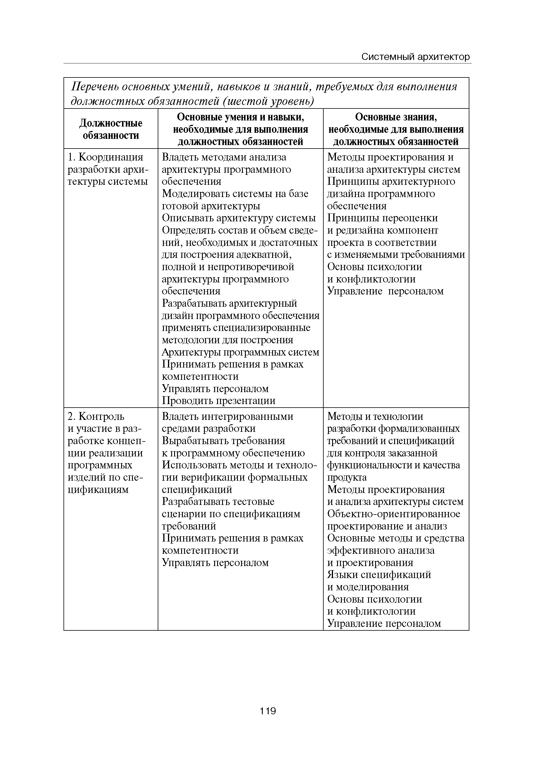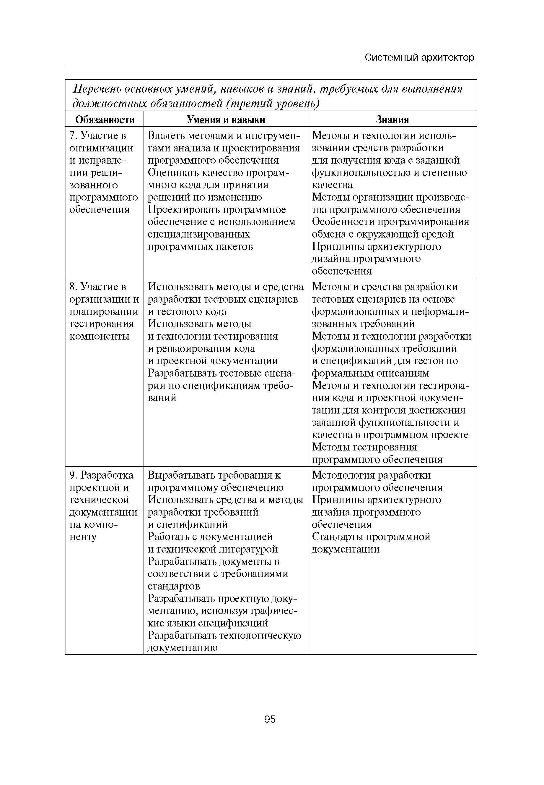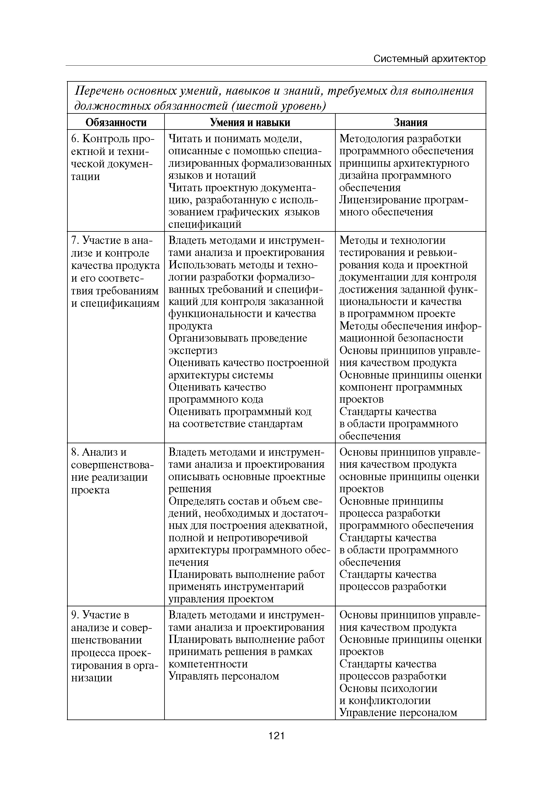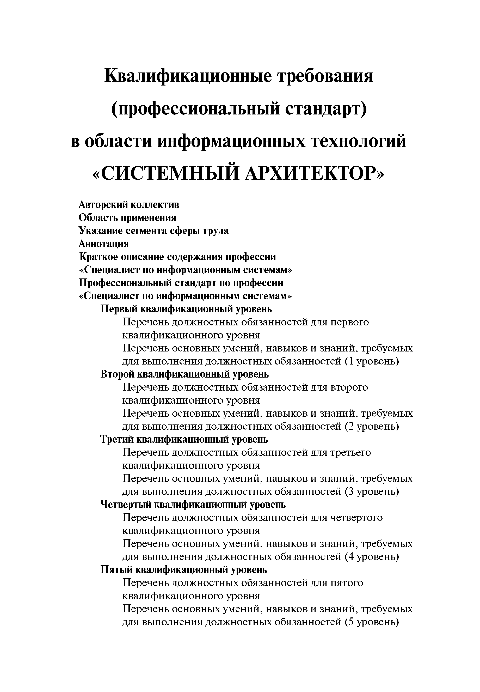 Квалификационные требования (профессиональный стандарт) в области информационных технологий "СИСТЕМНЫЙ АРХИТЕКТОР"| Статус: | действует | | Название рус.: | Квалификационные требования (профессиональный стандарт) в области информационных технологий "СИСТЕМНЫЙ АРХИТЕКТОР" | | Дата добавления в базу: | 01.09.2013 | | Дата актуализации: | 01.01.2021 | | Область применения: | Стандарт устанавливает требования к профессиональным компетенциям по квалификационным уровням. Рекомендован для применения в организациях всех форм собственности; для организаций крупного, среднего и малого бизнеса. Стандарт применяется в качестве нормативного документа, применяемого для подбора и расстановки кадров; планирования и нормирования труда; развития систем управления персоналом; для решения задач по профессиональной ориентации; для создания системы добровольной сертификации персонала и оценки уровня компетентности работников; для разработки образовательных стандартов и программ обучения в соответствии с требованиями работодателей; для проведения профессиональной подготовки, переподготовки и повышения квалификации персонала. | | Оглавление: | Авторский коллектив Область применения Указание сегмента сферы труда Профессиональный стандарт по профессии "Системный архитектор" Третий квалификационный уровень Перечень должностных обязанностей для третьего квалификационного уровня Перечень основных умений, навыков и знаний, требуемых для выполнения должностных обязанностей (3 уровень) Четвертый квалификационный уровень Перечень должностных обязанностей для четвертого квалификационного уровня Перечень основных умений, навыков и знаний, требуемых для выполнения должностных обязанностей (4 уровень) Пятый квалификационный уровень Перечень должностных обязанностей для пятого квалификационного уровня Перечень основных умений, навыков и знаний, требуемых для выполнения должностных обязанностей (5 уровень) Шестой квалификационный уровень Перечень должностных обязанностей для шестого квалификационного уровня Перечень основных умений, навыков и знаний, требуемых для выполнения должностных обязанностей (6 уровень) | | Разработан: | Аналитический центр REAL-IT Государственный университет - Высшая школа экономики Motorola ИСП РАН Группа компаний IBS Лаборатория Касперского 1С