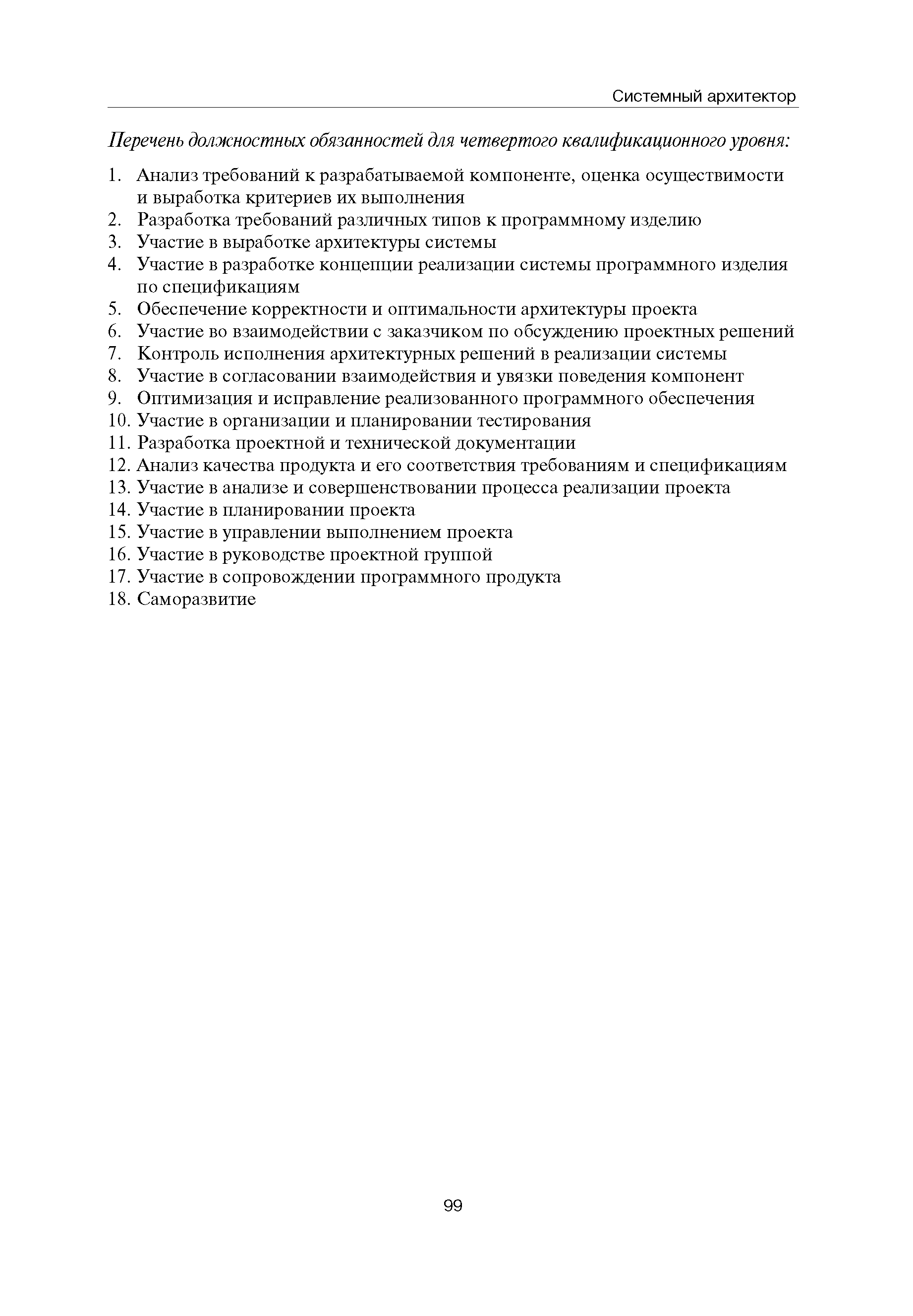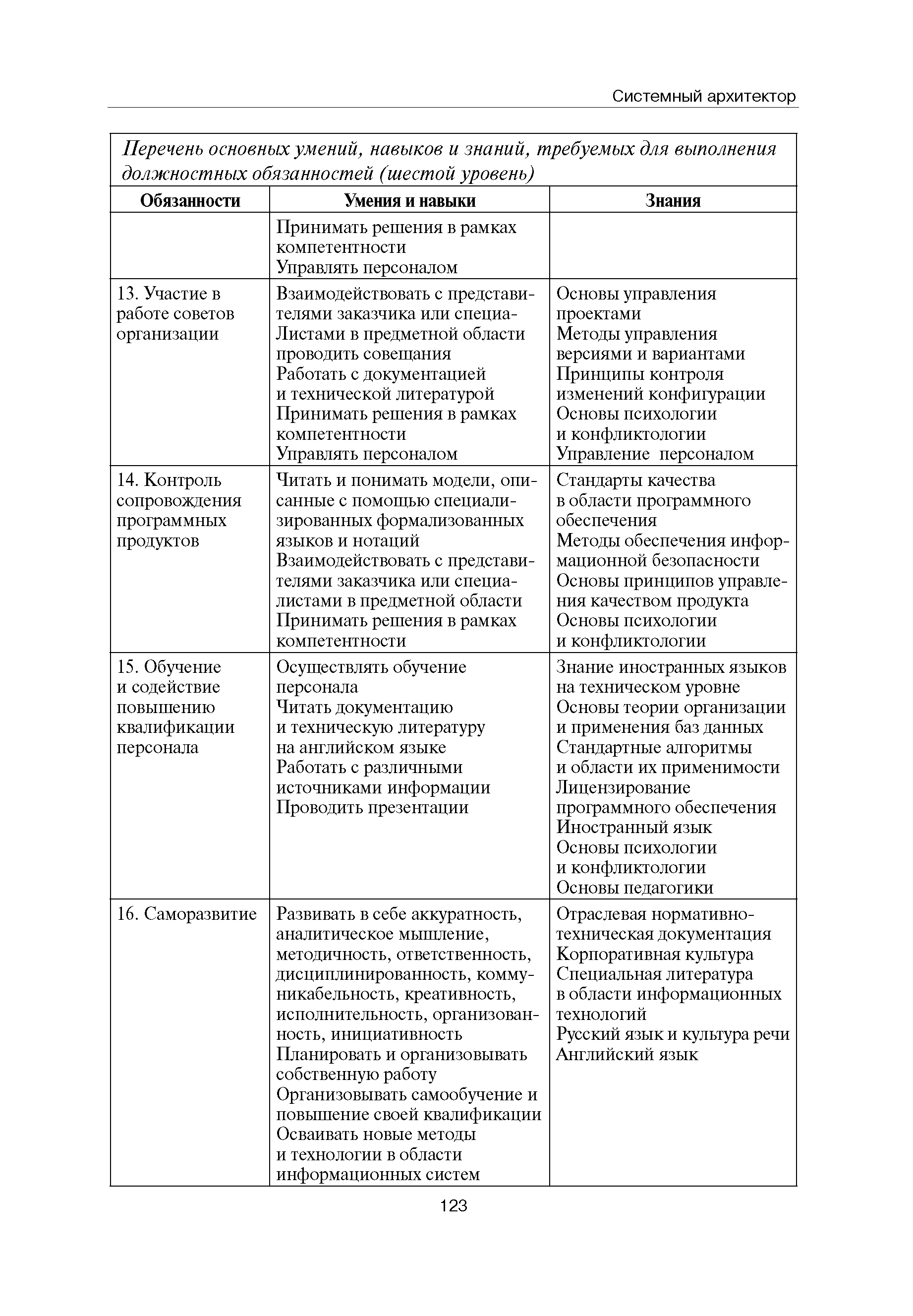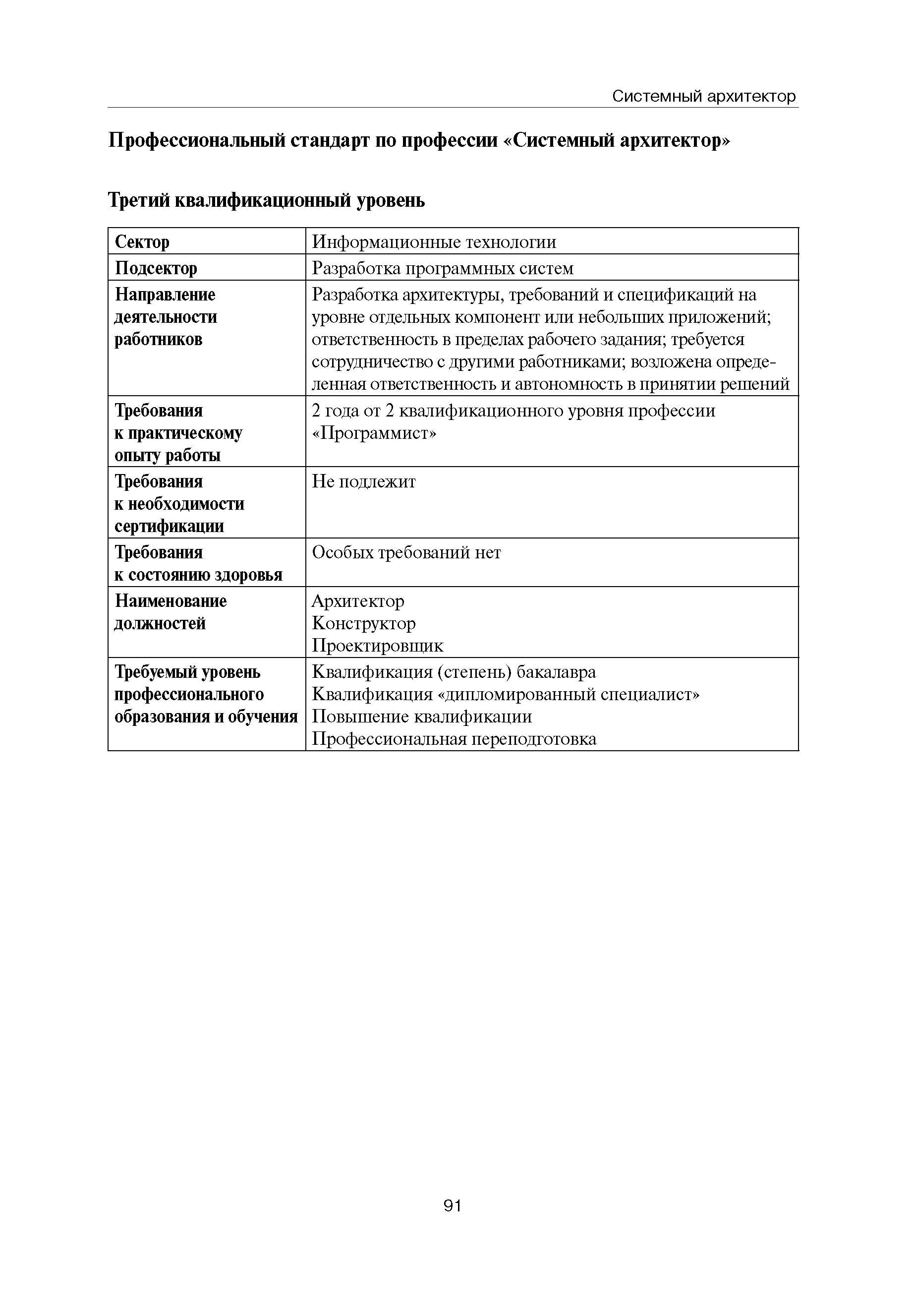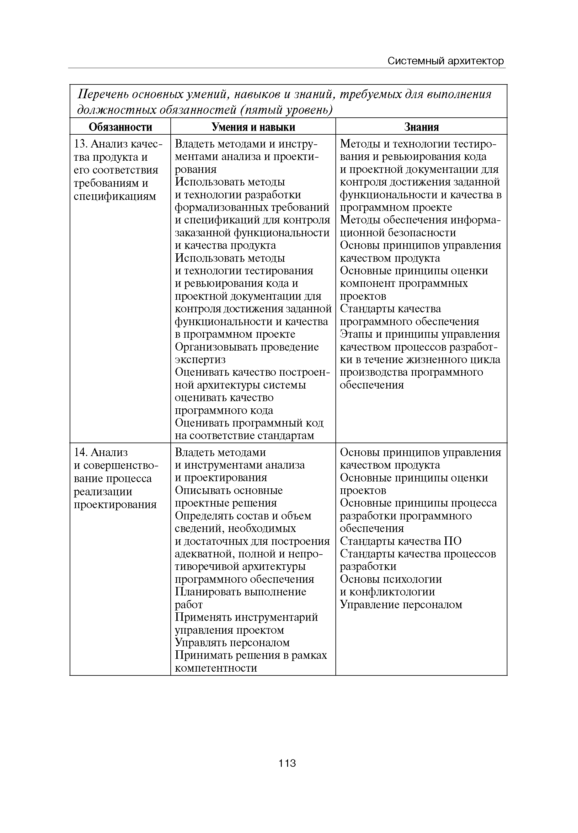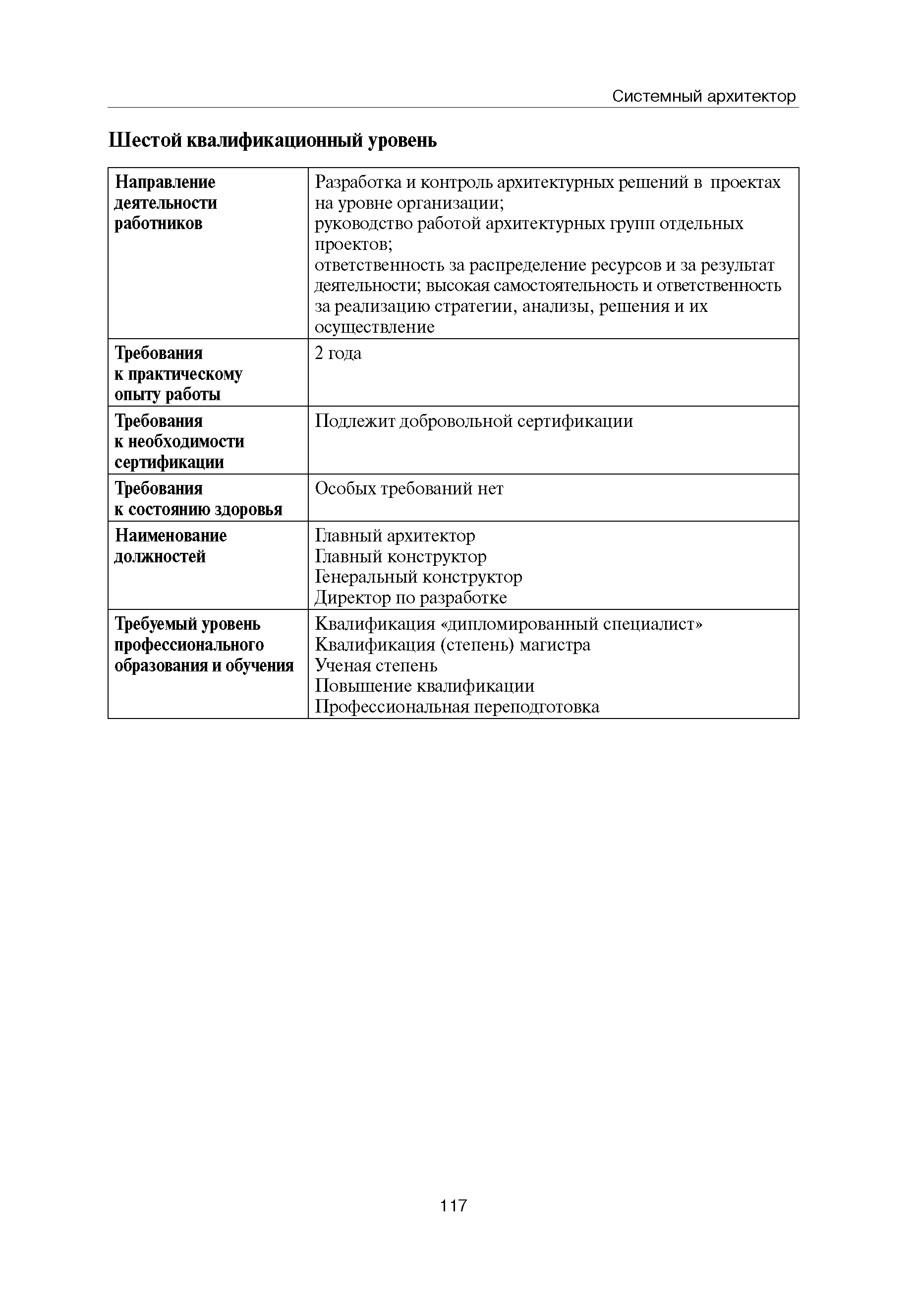 Квалификационные требования (профессиональный стандарт) в области информационных технологий "СИСТЕМНЫЙ АРХИТЕКТОР"| Статус: | действует | | Название рус.: | Квалификационные требования (профессиональный стандарт) в области информационных технологий "СИСТЕМНЫЙ АРХИТЕКТОР" | | Дата добавления в базу: | 01.09.2013 | | Дата актуализации: | 01.01.2021 | | Область применения: | Стандарт устанавливает требования к профессиональным компетенциям по квалификационным уровням. Рекомендован для применения в организациях всех форм собственности; для организаций крупного, среднего и малого бизнеса. Стандарт применяется в качестве нормативного документа, применяемого для подбора и расстановки кадров; планирования и нормирования труда; развития систем управления персоналом; для решения задач по профессиональной ориентации; для создания системы добровольной сертификации персонала и оценки уровня компетентности работников; для разработки образовательных стандартов и программ обучения в соответствии с требованиями работодателей; для проведения профессиональной подготовки, переподготовки и повышения квалификации персонала. | | Оглавление: | Авторский коллектив Область применения Указание сегмента сферы труда Профессиональный стандарт по профессии "Системный архитектор" Третий квалификационный уровень Перечень должностных обязанностей для третьего квалификационного уровня Перечень основных умений, навыков и знаний, требуемых для выполнения должностных обязанностей (3 уровень) Четвертый квалификационный уровень Перечень должностных обязанностей для четвертого квалификационного уровня Перечень основных умений, навыков и знаний, требуемых для выполнения должностных обязанностей (4 уровень) Пятый квалификационный уровень Перечень должностных обязанностей для пятого квалификационного уровня Перечень основных умений, навыков и знаний, требуемых для выполнения должностных обязанностей (5 уровень) Шестой квалификационный уровень Перечень должностных обязанностей для шестого квалификационного уровня Перечень основных умений, навыков и знаний, требуемых для выполнения должностных обязанностей (6 уровень) | | Разработан: | Аналитический центр REAL-IT Государственный университет - Высшая школа экономики Motorola ИСП РАН Группа компаний IBS Лаборатория Касперского 1С