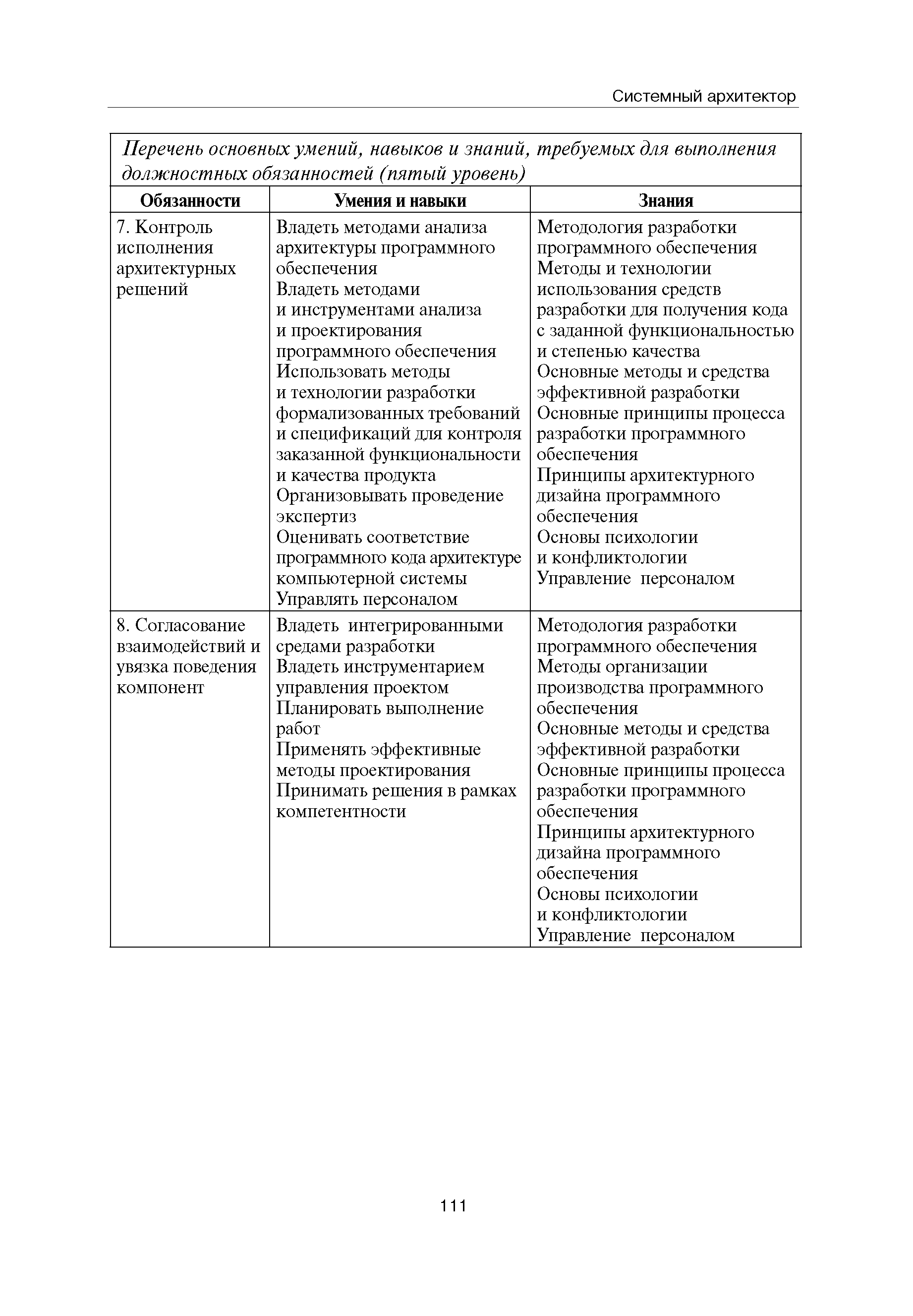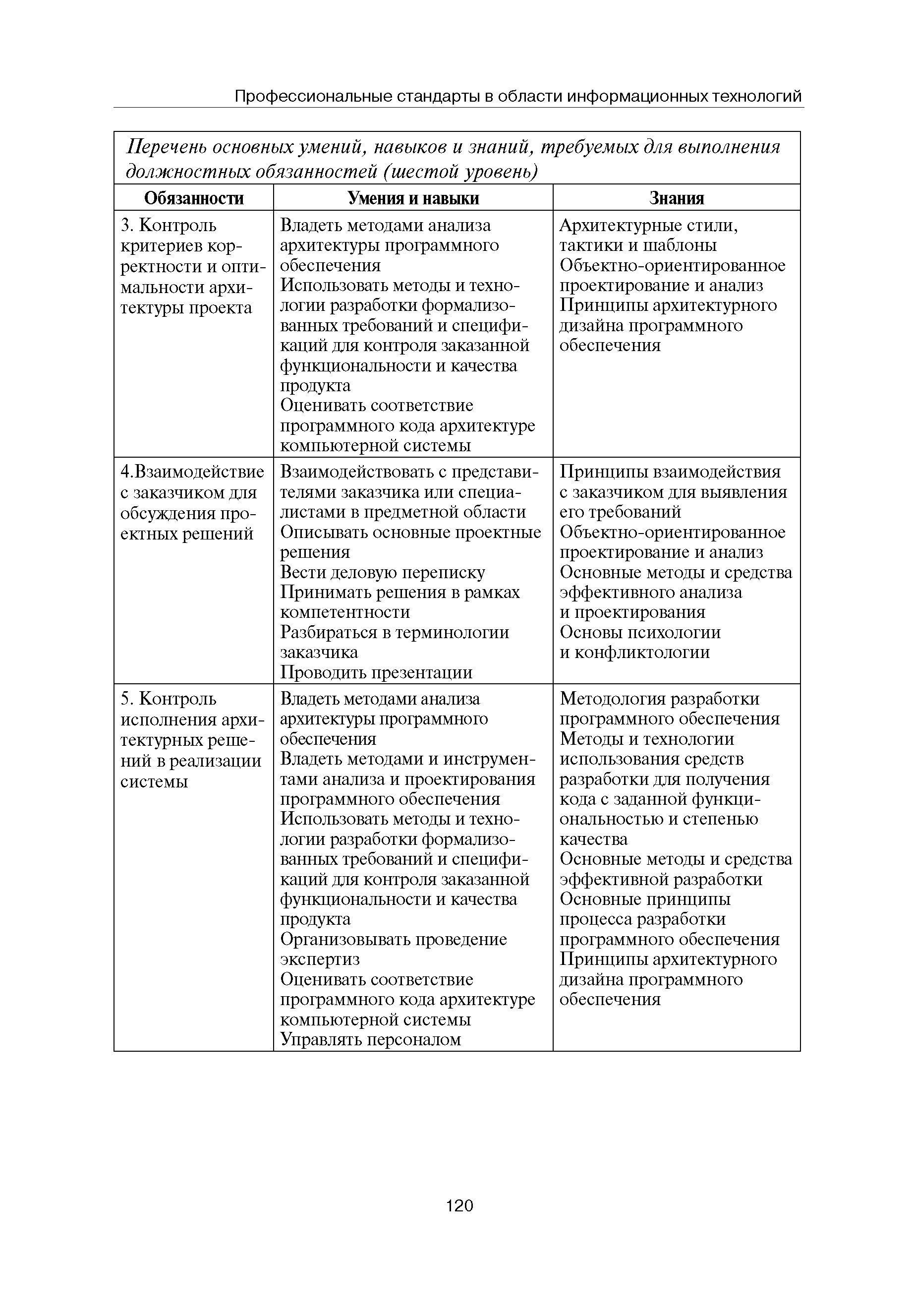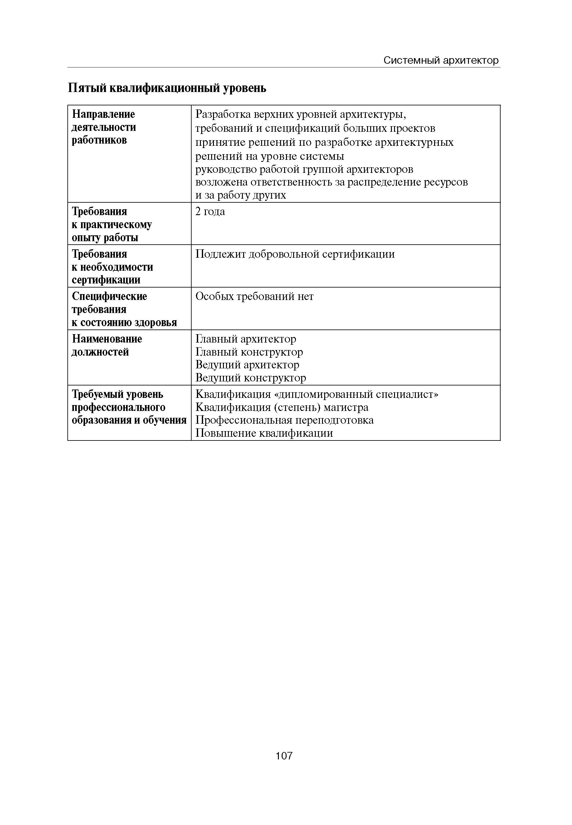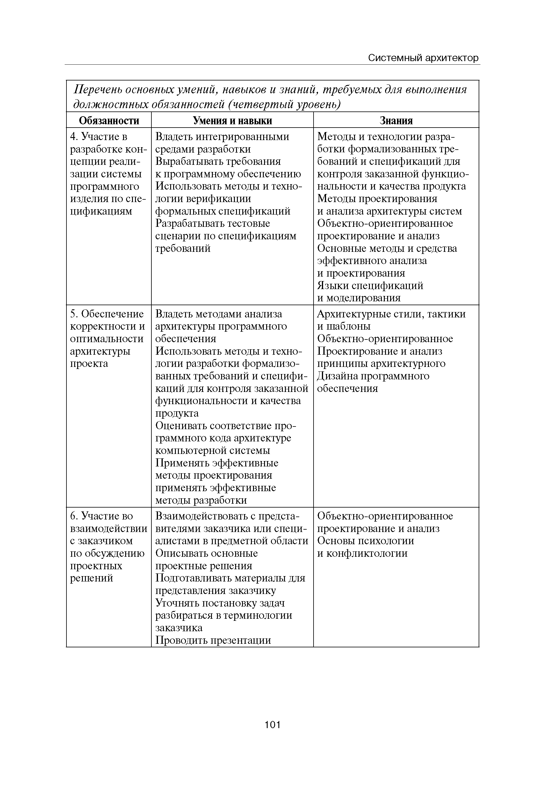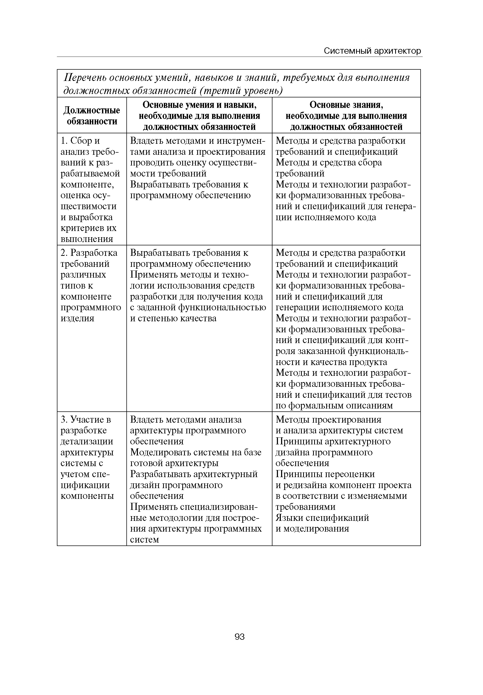 Квалификационные требования (профессиональный стандарт) в области информационных технологий "СИСТЕМНЫЙ АРХИТЕКТОР"| Статус: | действует | | Название рус.: | Квалификационные требования (профессиональный стандарт) в области информационных технологий "СИСТЕМНЫЙ АРХИТЕКТОР" | | Дата добавления в базу: | 01.09.2013 | | Дата актуализации: | 01.01.2021 | | Область применения: | Стандарт устанавливает требования к профессиональным компетенциям по квалификационным уровням. Рекомендован для применения в организациях всех форм собственности; для организаций крупного, среднего и малого бизнеса. Стандарт применяется в качестве нормативного документа, применяемого для подбора и расстановки кадров; планирования и нормирования труда; развития систем управления персоналом; для решения задач по профессиональной ориентации; для создания системы добровольной сертификации персонала и оценки уровня компетентности работников; для разработки образовательных стандартов и программ обучения в соответствии с требованиями работодателей; для проведения профессиональной подготовки, переподготовки и повышения квалификации персонала. | | Оглавление: | Авторский коллектив Область применения Указание сегмента сферы труда Профессиональный стандарт по профессии "Системный архитектор" Третий квалификационный уровень Перечень должностных обязанностей для третьего квалификационного уровня Перечень основных умений, навыков и знаний, требуемых для выполнения должностных обязанностей (3 уровень) Четвертый квалификационный уровень Перечень должностных обязанностей для четвертого квалификационного уровня Перечень основных умений, навыков и знаний, требуемых для выполнения должностных обязанностей (4 уровень) Пятый квалификационный уровень Перечень должностных обязанностей для пятого квалификационного уровня Перечень основных умений, навыков и знаний, требуемых для выполнения должностных обязанностей (5 уровень) Шестой квалификационный уровень Перечень должностных обязанностей для шестого квалификационного уровня Перечень основных умений, навыков и знаний, требуемых для выполнения должностных обязанностей (6 уровень) | | Разработан: | Аналитический центр REAL-IT Государственный университет - Высшая школа экономики Motorola ИСП РАН Группа компаний IBS Лаборатория Касперского 1С