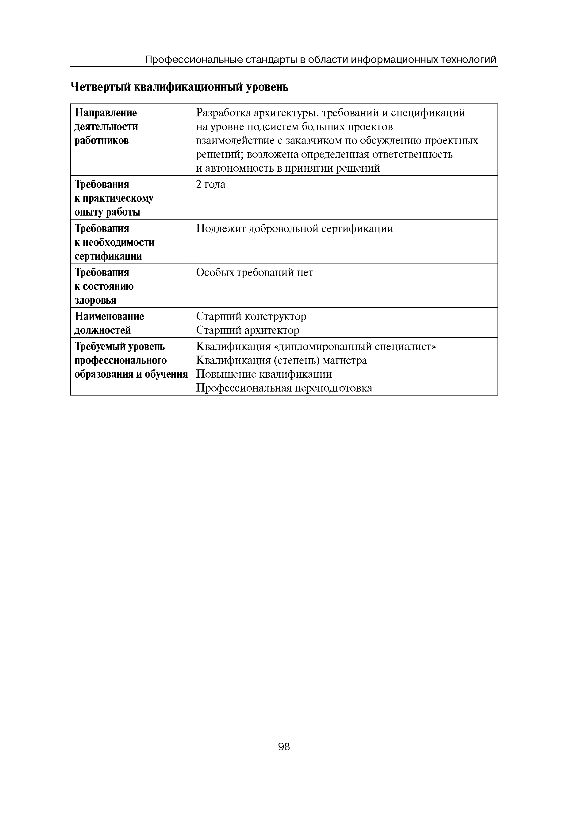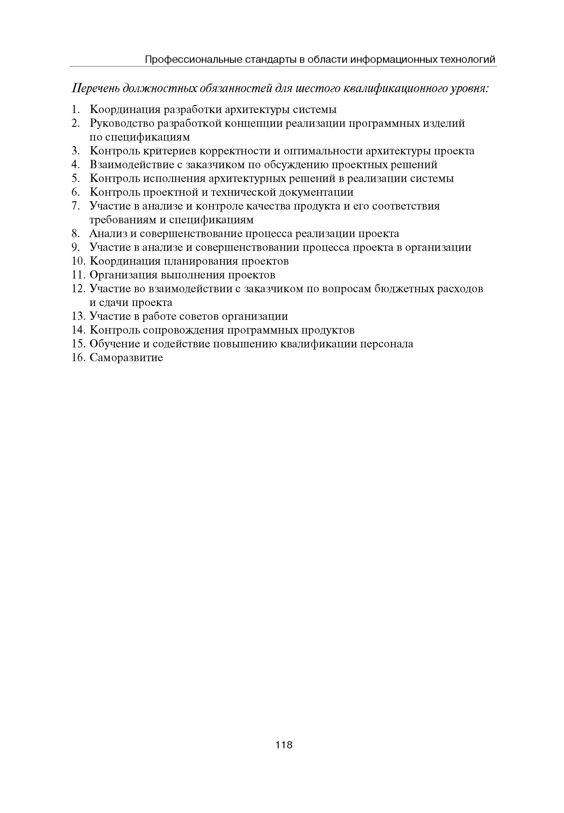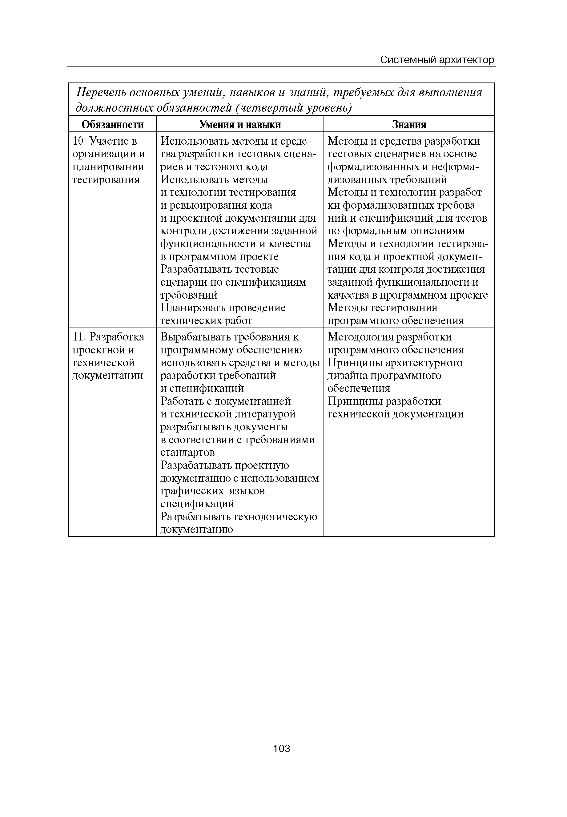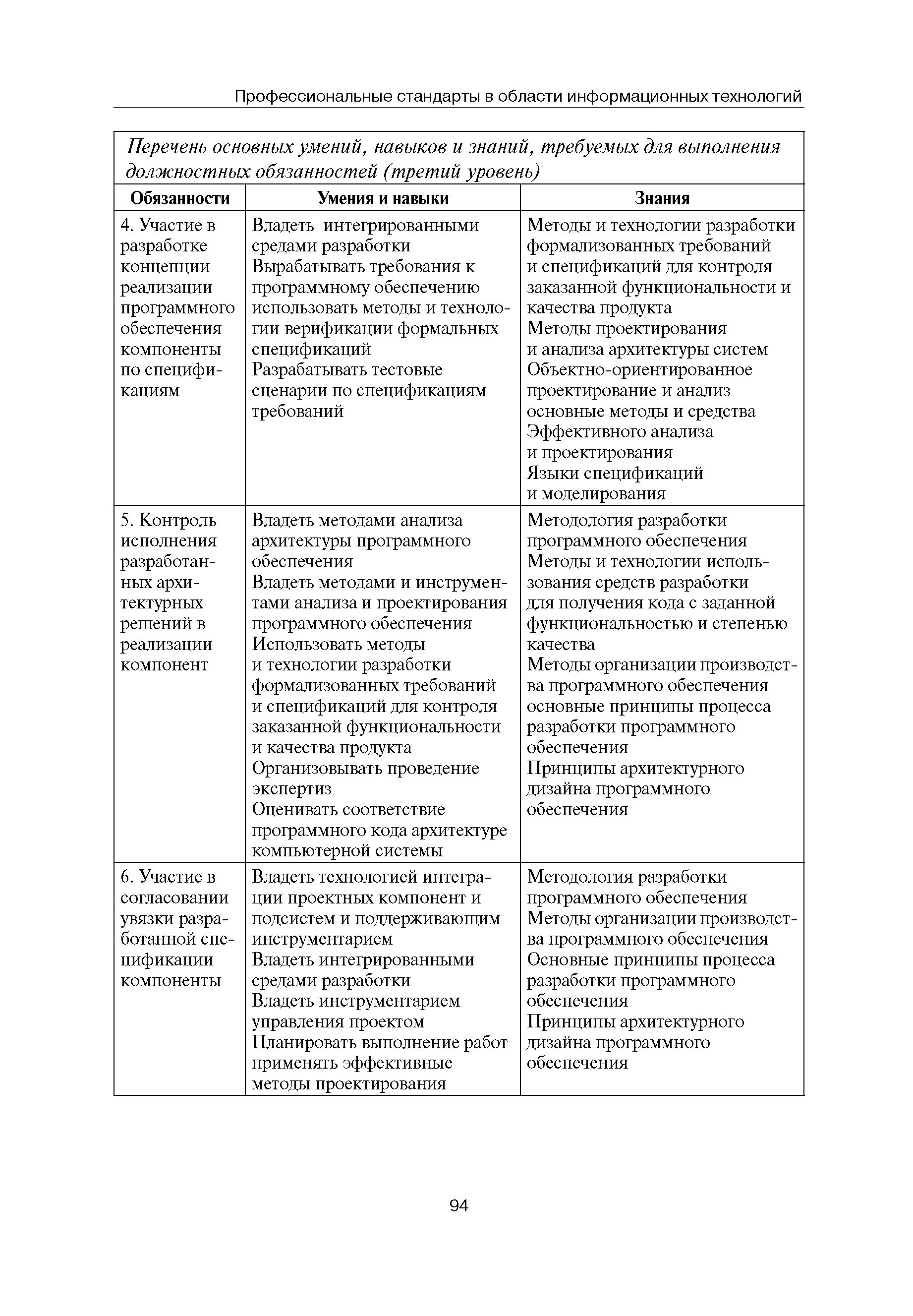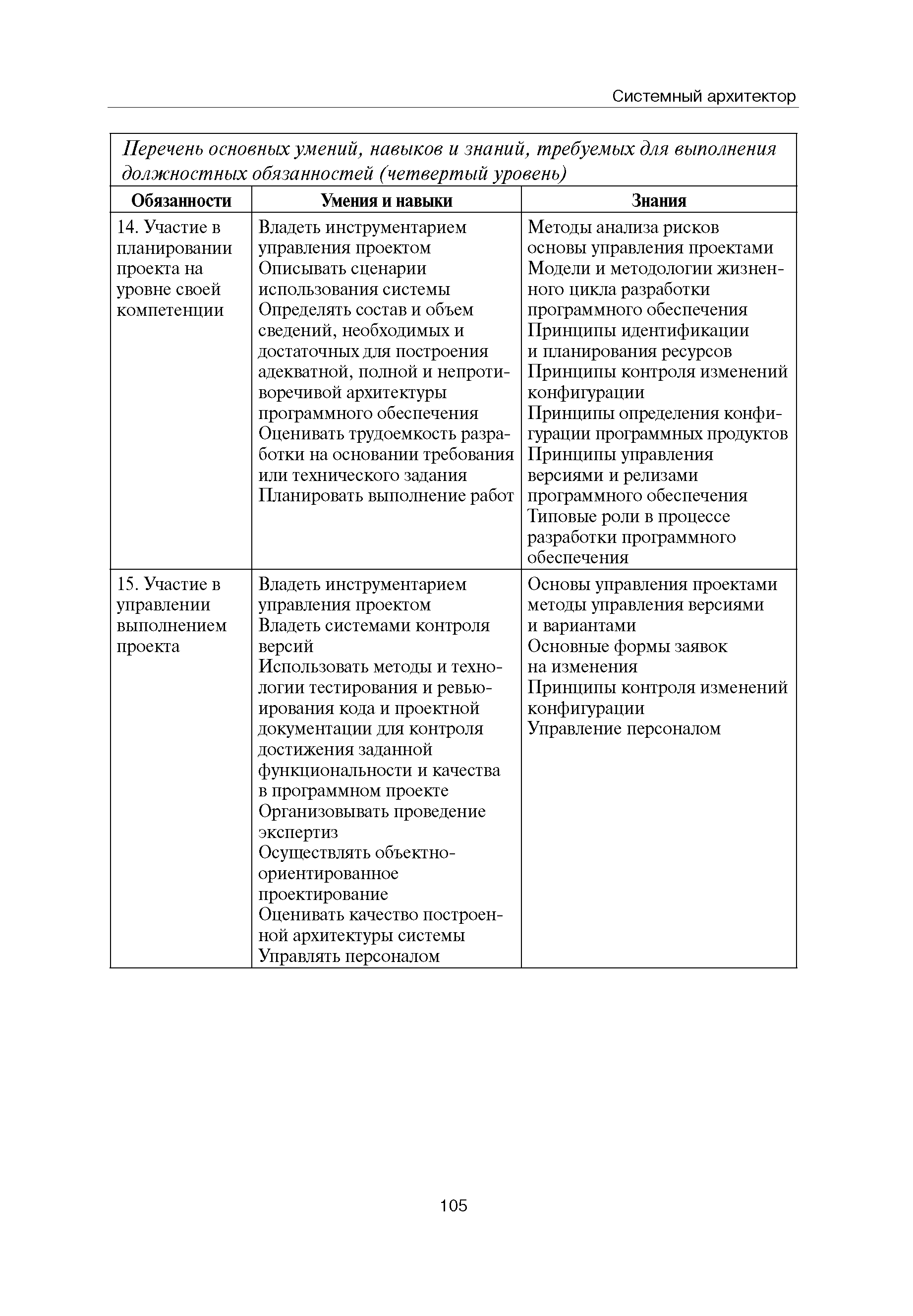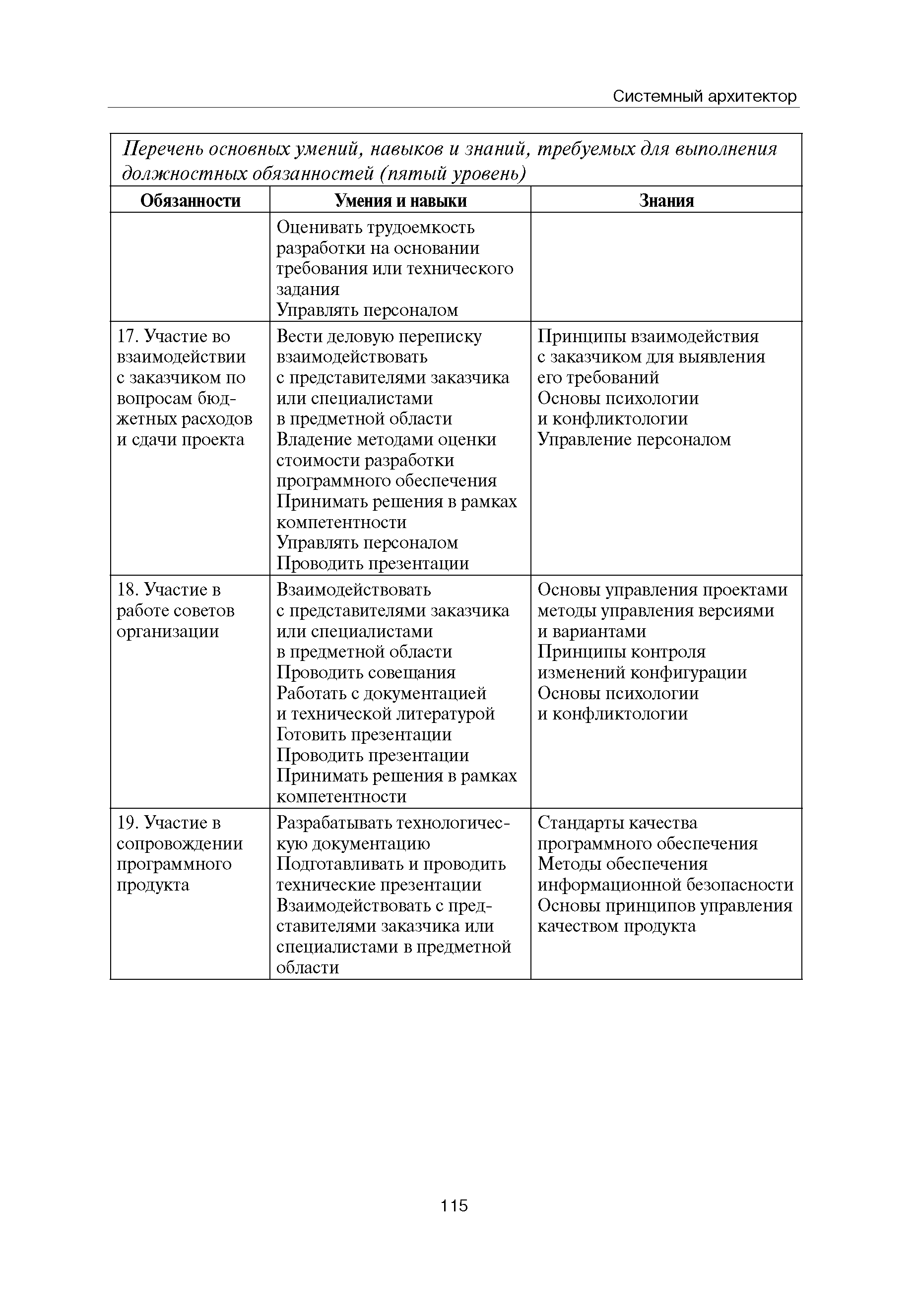Квалификационные требования (профессиональный стандарт) в области информационных технологий "СИСТЕМНЫЙ АРХИТЕКТОР"| Статус: | действует | | Название рус.: | Квалификационные требования (профессиональный стандарт) в области информационных технологий "СИСТЕМНЫЙ АРХИТЕКТОР" | | Дата добавления в базу: | 01.09.2013 | | Дата актуализации: | 01.01.2021 | | Область применения: | Стандарт устанавливает требования к профессиональным компетенциям по квалификационным уровням. Рекомендован для применения в организациях всех форм собственности; для организаций крупного, среднего и малого бизнеса. Стандарт применяется в качестве нормативного документа, применяемого для подбора и расстановки кадров; планирования и нормирования труда; развития систем управления персоналом; для решения задач по профессиональной ориентации; для создания системы добровольной сертификации персонала и оценки уровня компетентности работников; для разработки образовательных стандартов и программ обучения в соответствии с требованиями работодателей; для проведения профессиональной подготовки, переподготовки и повышения квалификации персонала. | | Оглавление: | Авторский коллектив Область применения Указание сегмента сферы труда Профессиональный стандарт по профессии "Системный архитектор" Третий квалификационный уровень Перечень должностных обязанностей для третьего квалификационного уровня Перечень основных умений, навыков и знаний, требуемых для выполнения должностных обязанностей (3 уровень) Четвертый квалификационный уровень Перечень должностных обязанностей для четвертого квалификационного уровня Перечень основных умений, навыков и знаний, требуемых для выполнения должностных обязанностей (4 уровень) Пятый квалификационный уровень Перечень должностных обязанностей для пятого квалификационного уровня Перечень основных умений, навыков и знаний, требуемых для выполнения должностных обязанностей (5 уровень) Шестой квалификационный уровень Перечень должностных обязанностей для шестого квалификационного уровня Перечень основных умений, навыков и знаний, требуемых для выполнения должностных обязанностей (6 уровень) | | Разработан: | Аналитический центр REAL-IT Государственный университет - Высшая школа экономики Motorola ИСП РАН Группа компаний IBS Лаборатория Касперского 1С