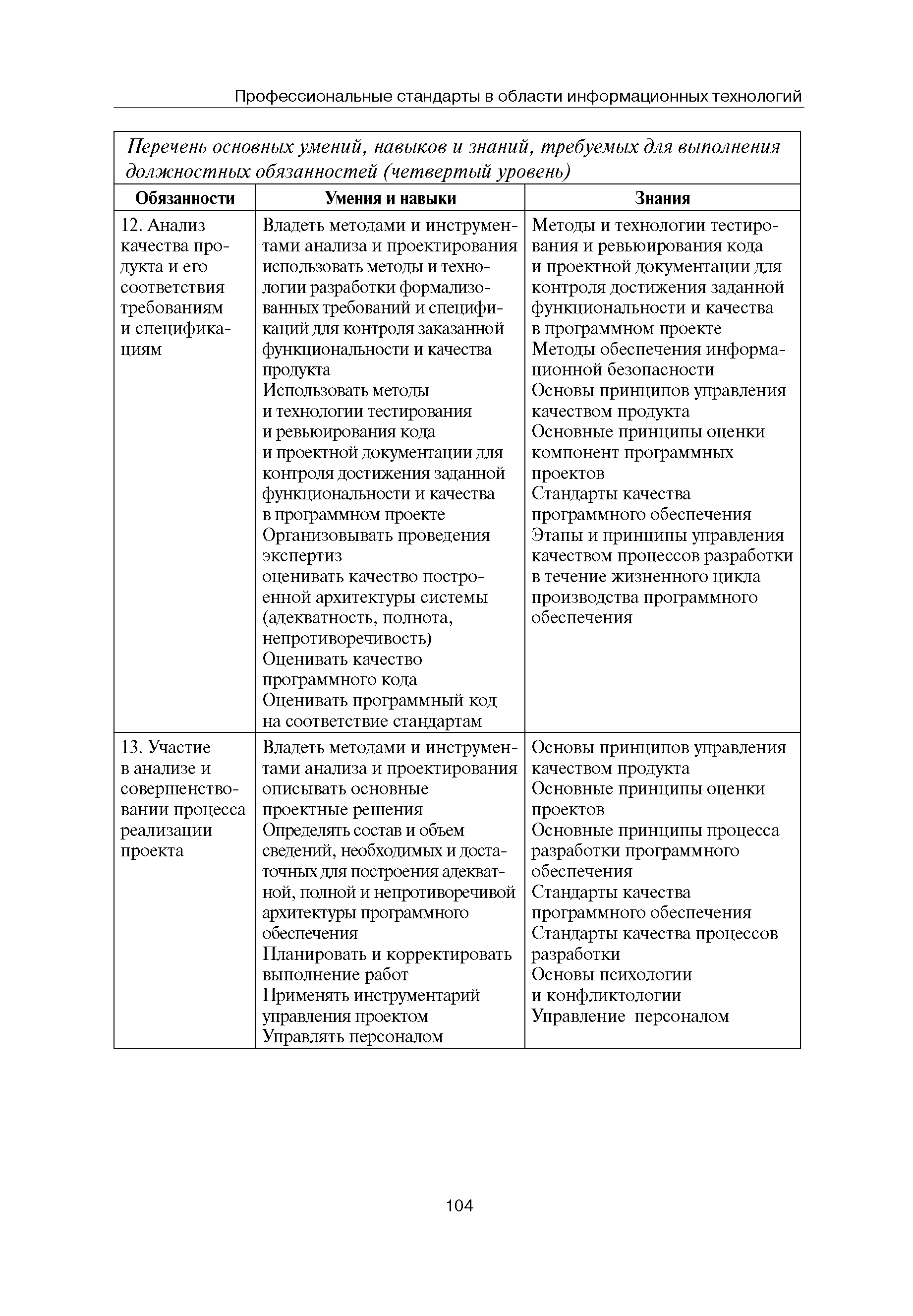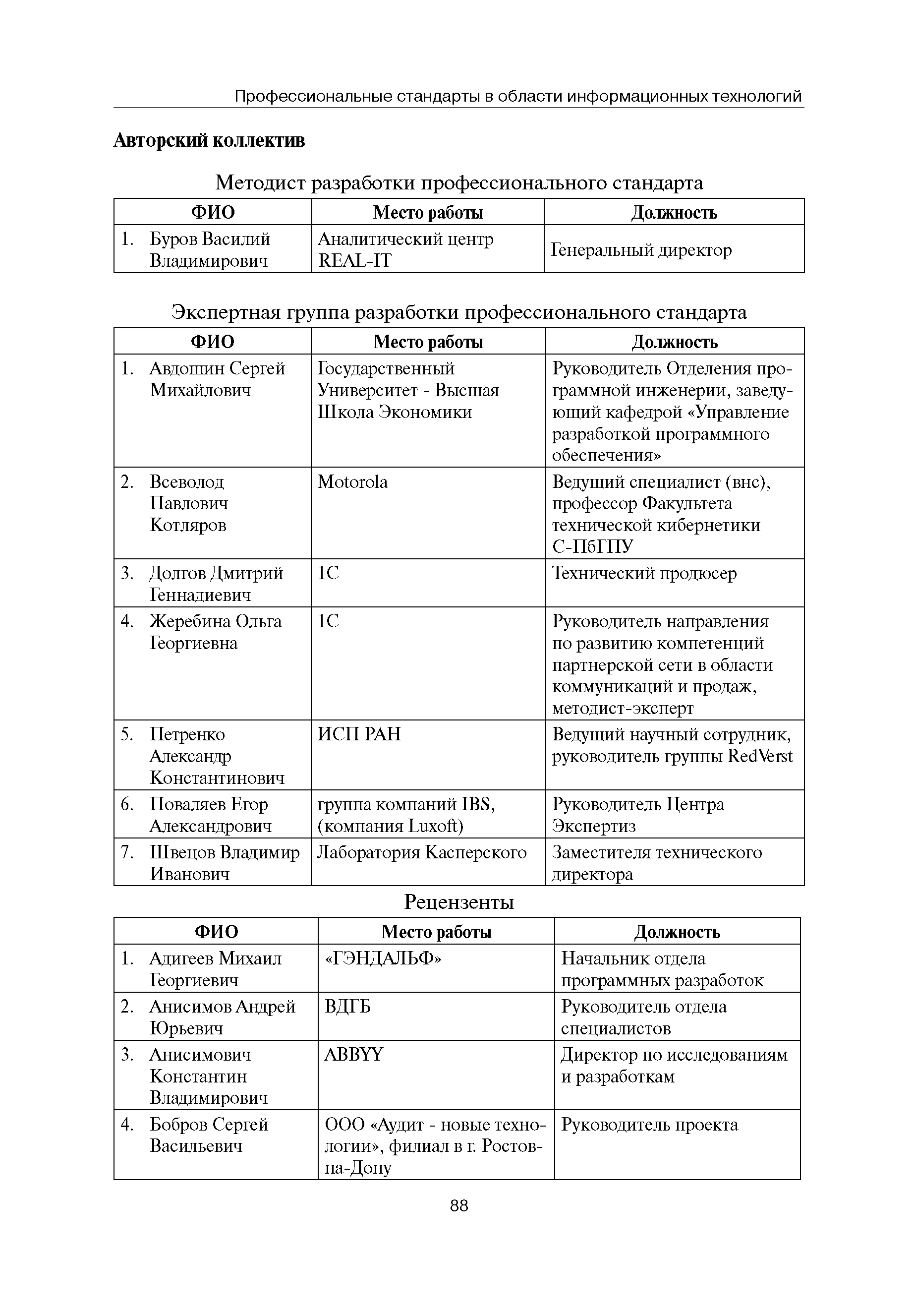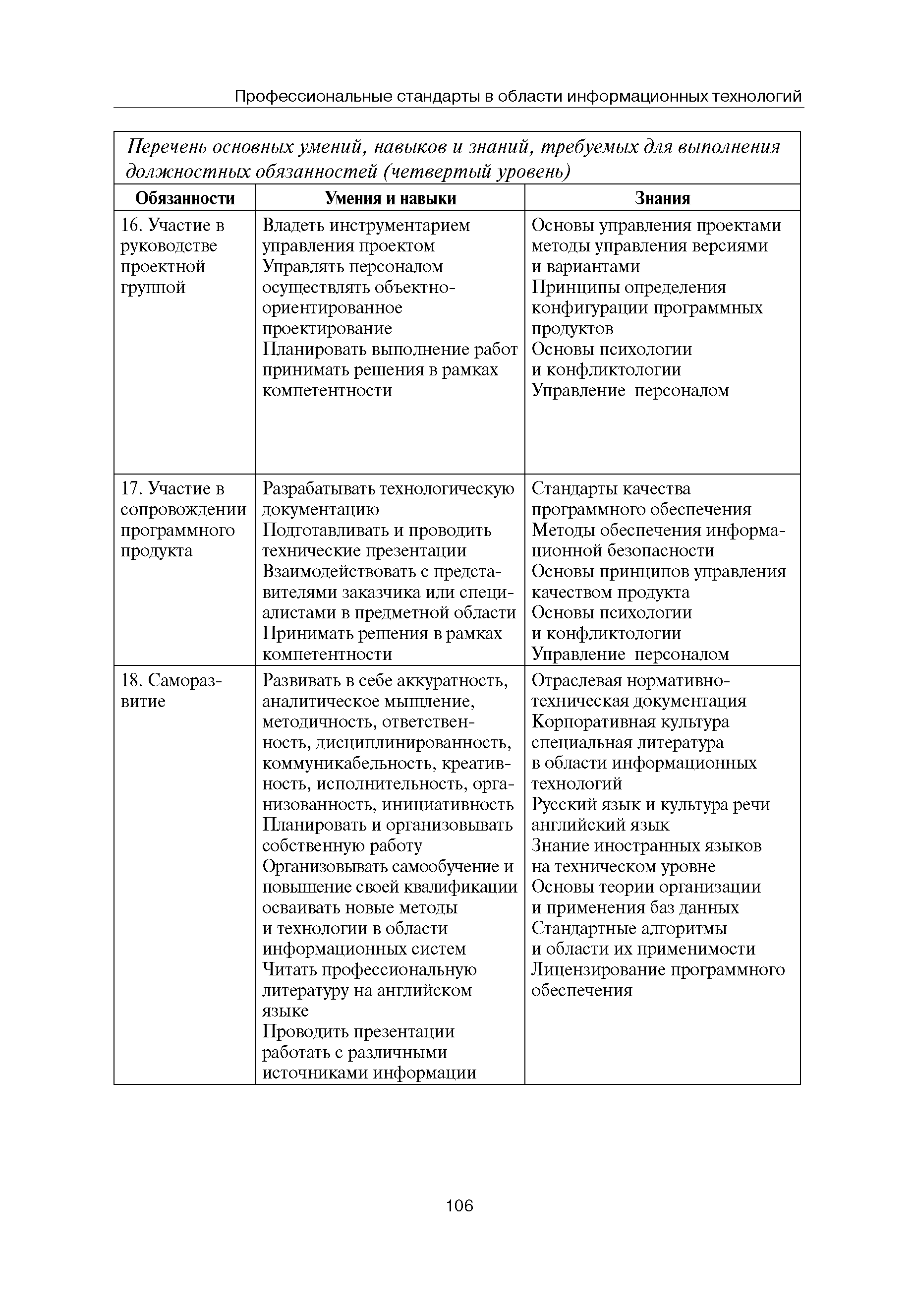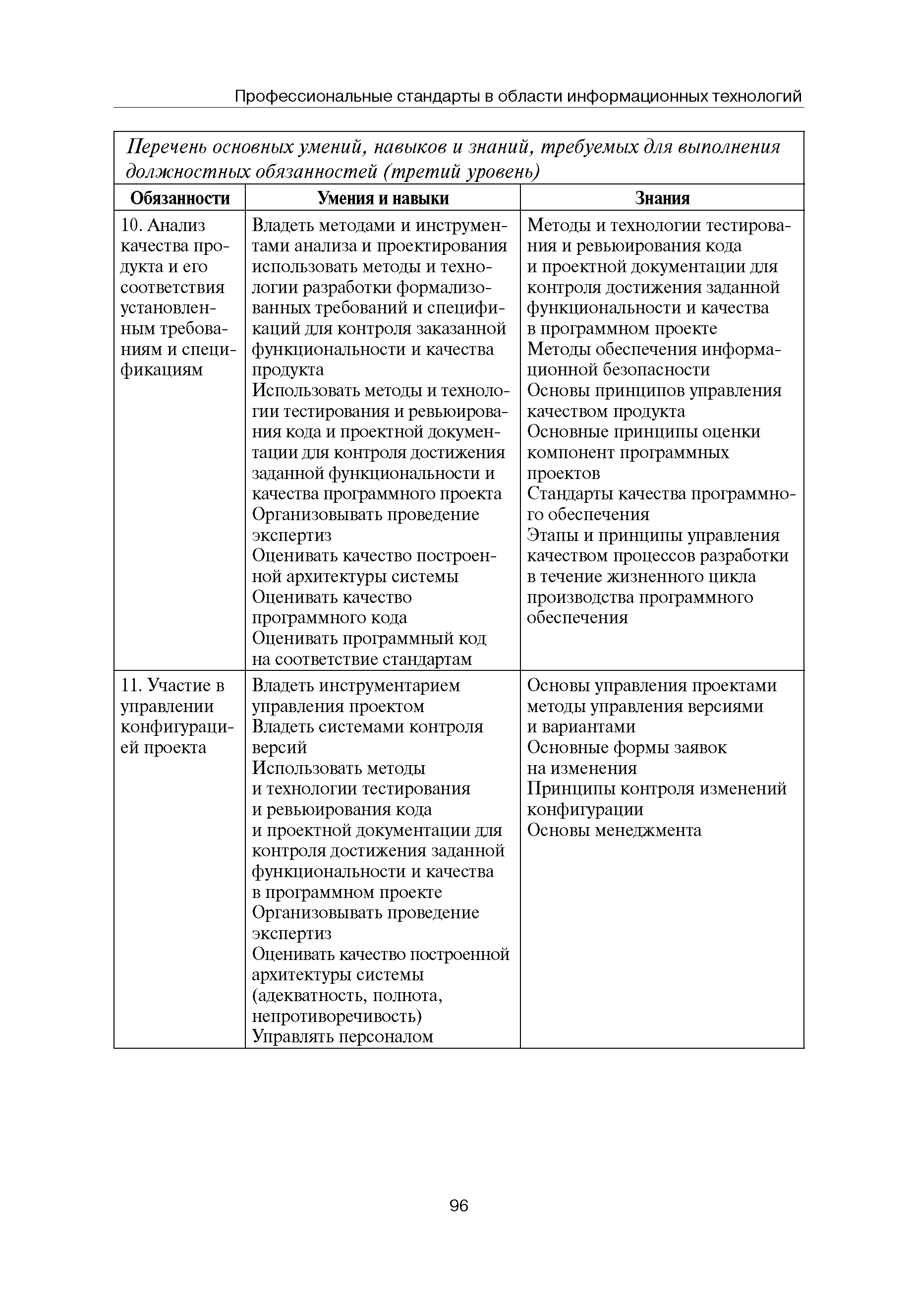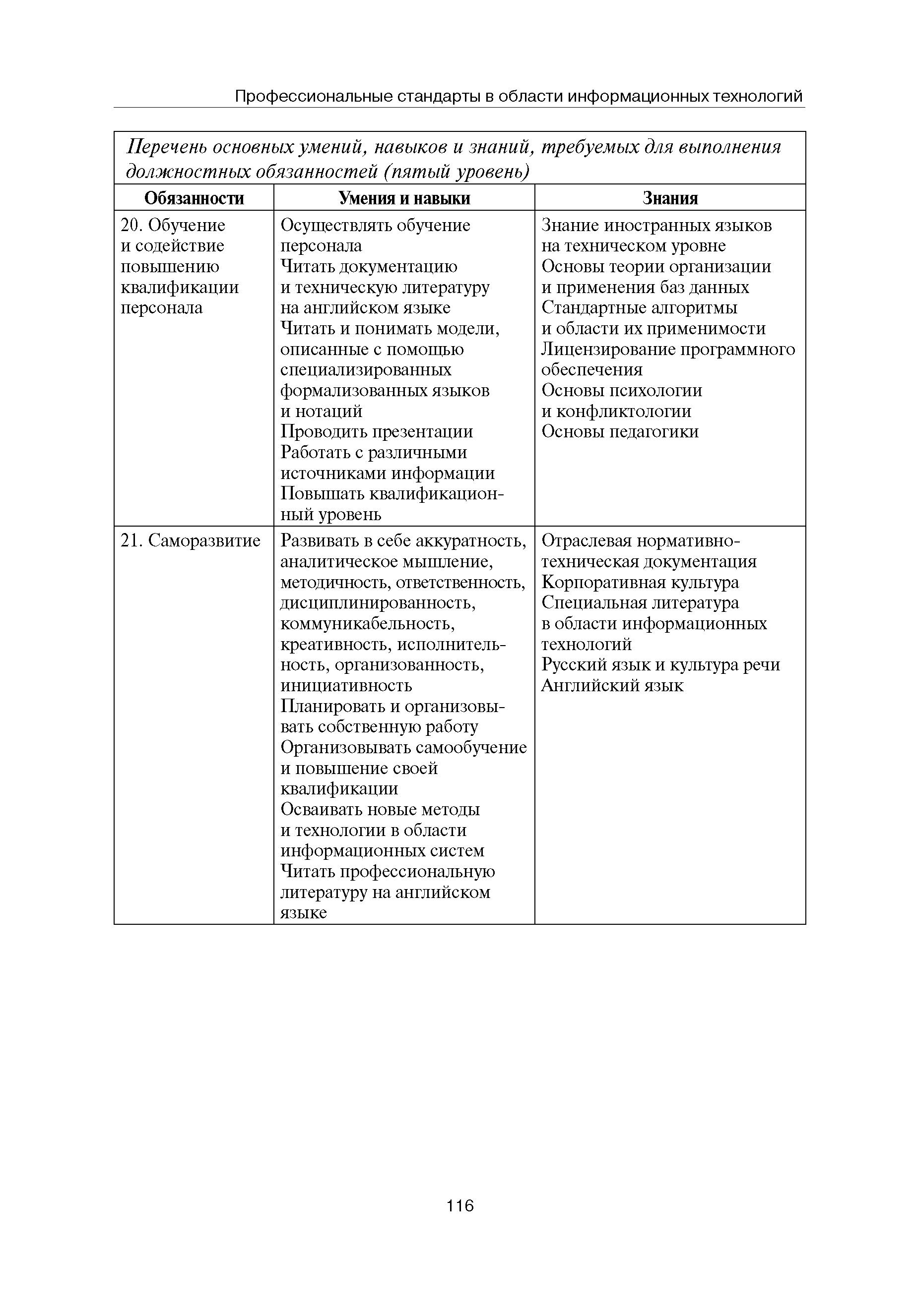 Квалификационные требования (профессиональный стандарт) в области информационных технологий "СИСТЕМНЫЙ АРХИТЕКТОР"| Статус: | действует | | Название рус.: | Квалификационные требования (профессиональный стандарт) в области информационных технологий "СИСТЕМНЫЙ АРХИТЕКТОР" | | Дата добавления в базу: | 01.09.2013 | | Дата актуализации: | 01.01.2021 | | Область применения: | Стандарт устанавливает требования к профессиональным компетенциям по квалификационным уровням. Рекомендован для применения в организациях всех форм собственности; для организаций крупного, среднего и малого бизнеса. Стандарт применяется в качестве нормативного документа, применяемого для подбора и расстановки кадров; планирования и нормирования труда; развития систем управления персоналом; для решения задач по профессиональной ориентации; для создания системы добровольной сертификации персонала и оценки уровня компетентности работников; для разработки образовательных стандартов и программ обучения в соответствии с требованиями работодателей; для проведения профессиональной подготовки, переподготовки и повышения квалификации персонала. | | Оглавление: | Авторский коллектив Область применения Указание сегмента сферы труда Профессиональный стандарт по профессии "Системный архитектор" Третий квалификационный уровень Перечень должностных обязанностей для третьего квалификационного уровня Перечень основных умений, навыков и знаний, требуемых для выполнения должностных обязанностей (3 уровень) Четвертый квалификационный уровень Перечень должностных обязанностей для четвертого квалификационного уровня Перечень основных умений, навыков и знаний, требуемых для выполнения должностных обязанностей (4 уровень) Пятый квалификационный уровень Перечень должностных обязанностей для пятого квалификационного уровня Перечень основных умений, навыков и знаний, требуемых для выполнения должностных обязанностей (5 уровень) Шестой квалификационный уровень Перечень должностных обязанностей для шестого квалификационного уровня Перечень основных умений, навыков и знаний, требуемых для выполнения должностных обязанностей (6 уровень) | | Разработан: | Аналитический центр REAL-IT Государственный университет - Высшая школа экономики Motorola ИСП РАН Группа компаний IBS Лаборатория Касперского 1С