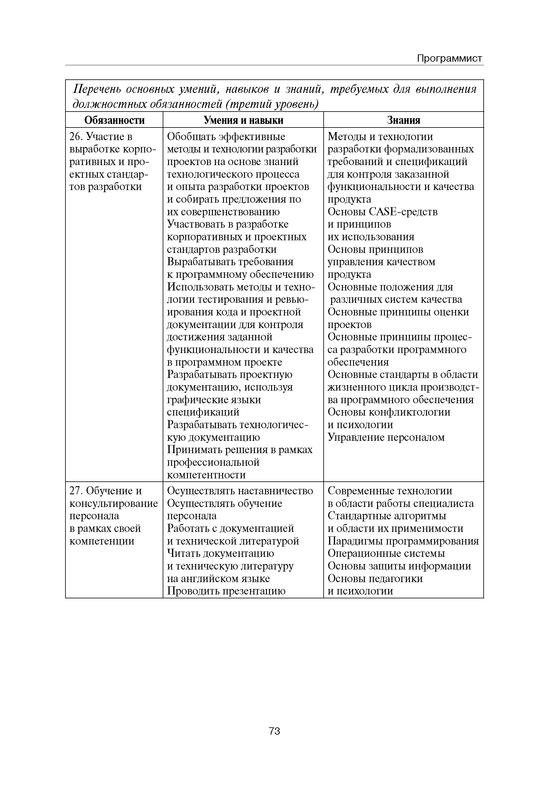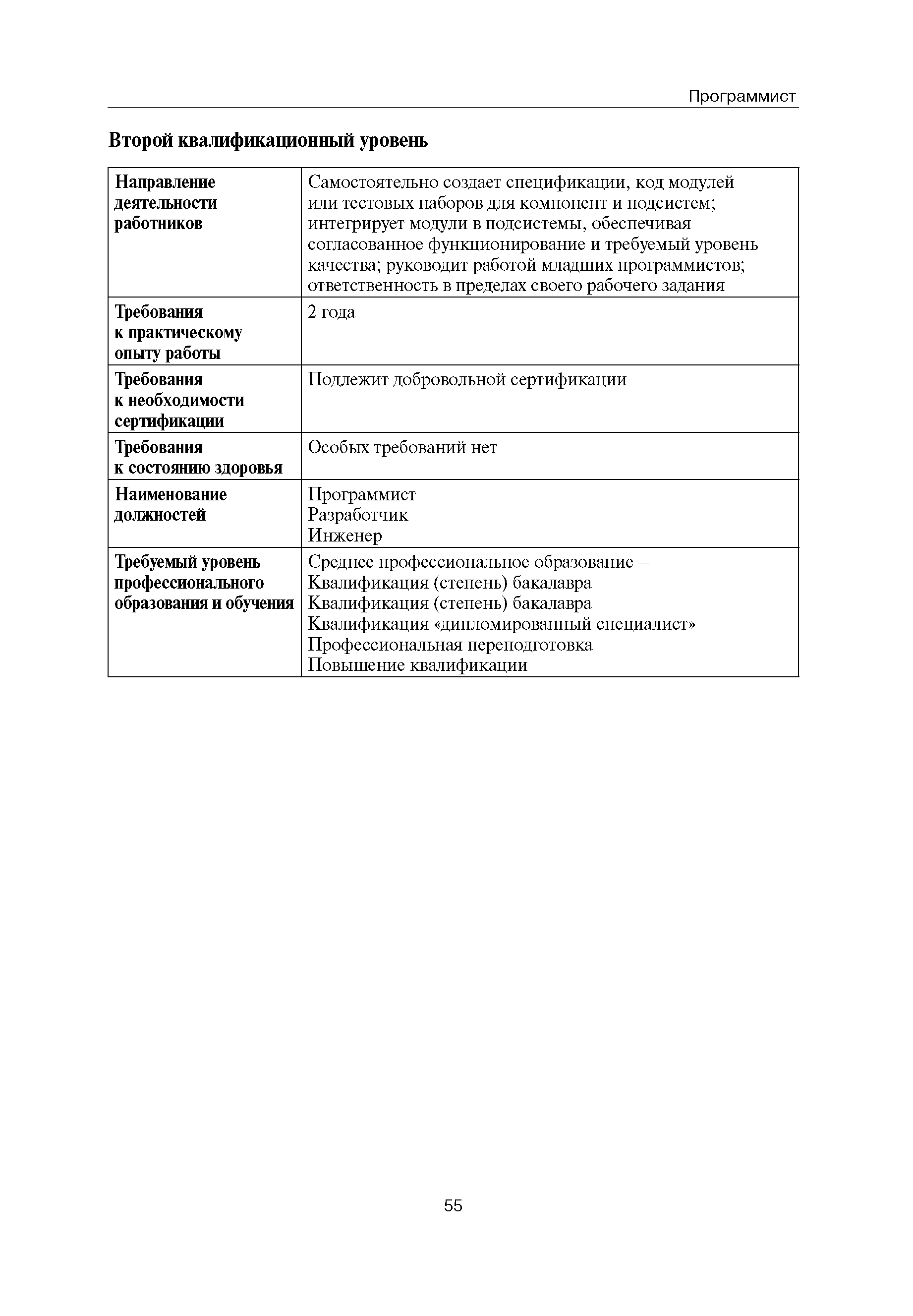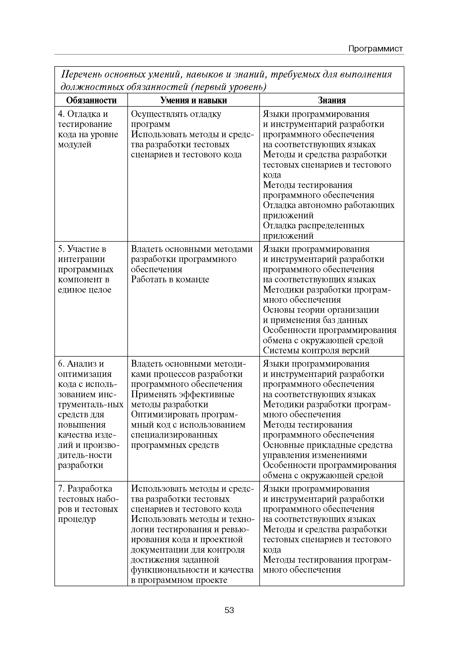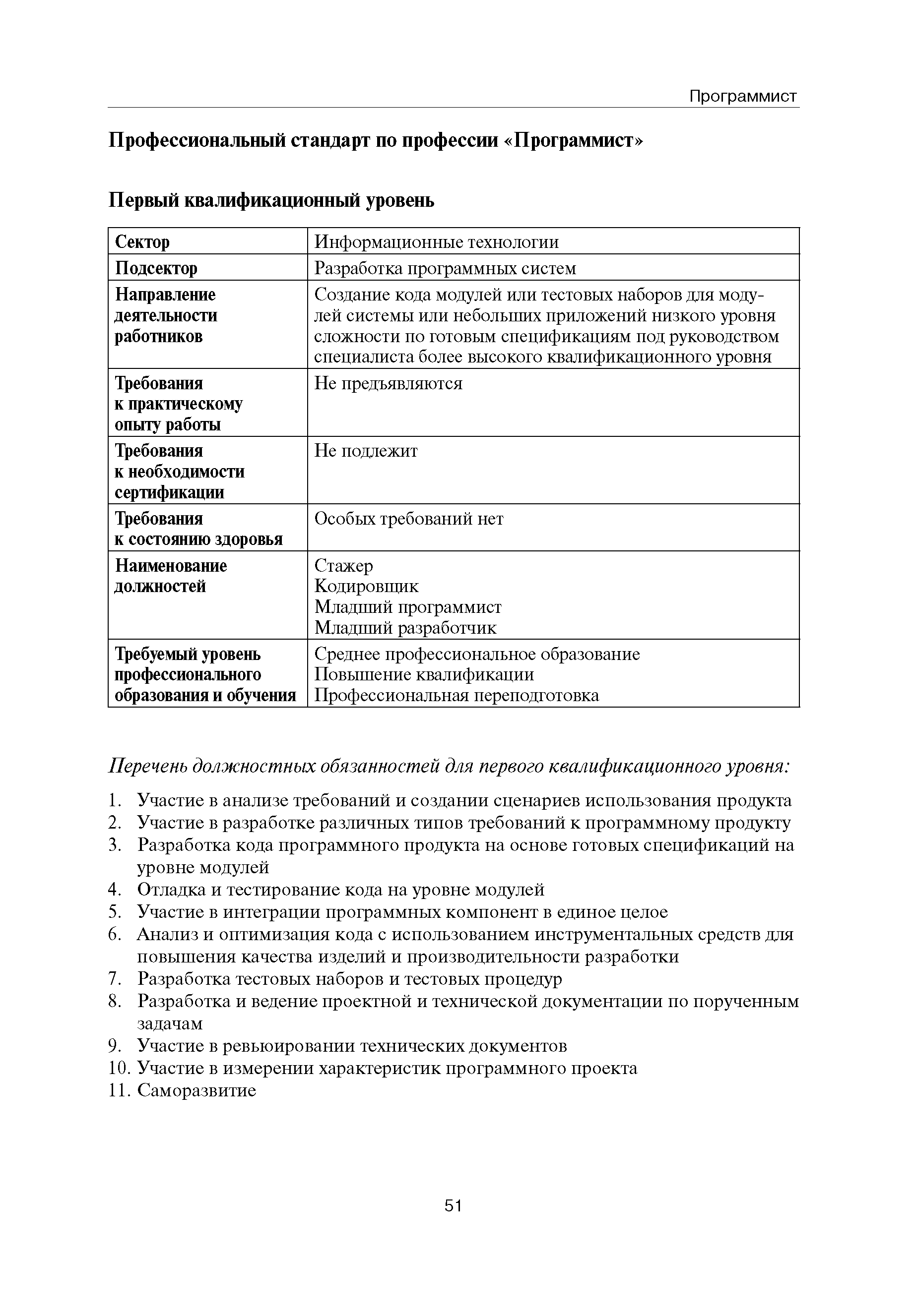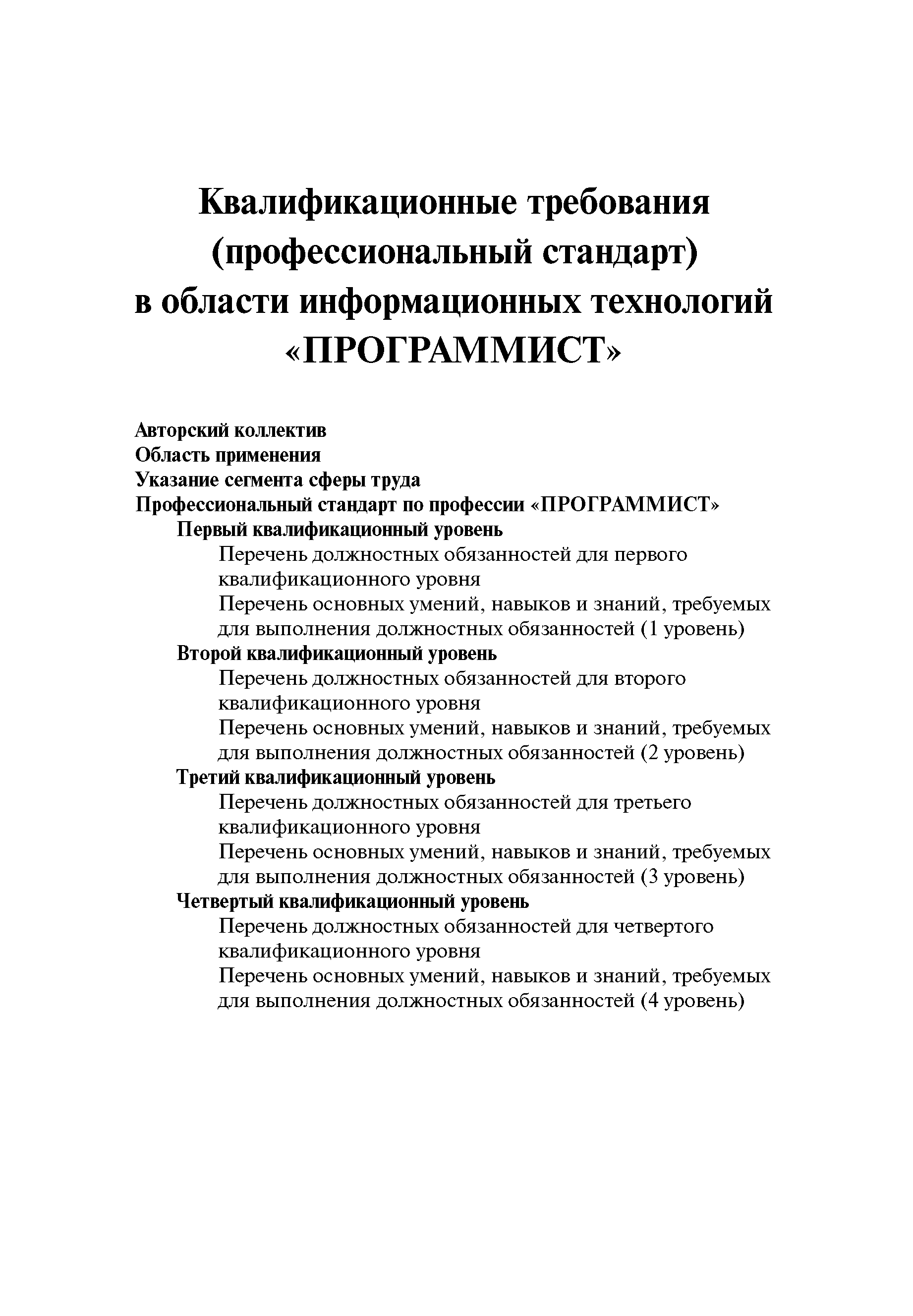 Квалификационные требования (профессиональный стандарт) в области информационных технологий "ПРОГРАММИСТ"| Статус: | действует | | Название рус.: | Квалификационные требования (профессиональный стандарт) в области информационных технологий "ПРОГРАММИСТ" | | Дата добавления в базу: | 01.09.2013 | | Дата актуализации: | 01.01.2021 | | Область применения: | Стандарт устанавливает требования к профессиональным компетенциям по квалификационным уровням. Рекомендован для применения в организациях всех форм собственности; для организаций крупного, среднего и малого бизнеса. Стандарт применяется в качестве нормативного документа, применяемого для подбора и расстановки кадров; планирования и нормирования труда; развития систем управления персоналом; для решения задач по профессиональной ориентации; для создания системы добровольной сертификации персонала и оценки уровня компетентности работников; для разработки образовательных стандартов и программ обучения в соответствии с требованиями работодателей; для проведения профессиональной подготовки, переподготовки и повышения квалификации персонала. | | Оглавление: | Авторский коллектив Область применения Указание сегмента сферы труда Профессиональный стандарт по профессии "ПРОГРАММИСТ" Первый квалификационный уровень Перечень должностных обязанностей для первого квалификационного уровня Перечень основных умений, навыков и знаний, требуемых для выполнения должностных обязанностей (1 уровень) Второй квалификационный уровень Перечень должностных обязанностей для второго квалификационного уровня Перечень основных умений, навыков и знаний, требуемых для выполнения должностных обязанностей (2 уровень) Третий квалификационный уровень Перечень должностных обязанностей для третьего квалификационного уровня Перечень основных умений, навыков и знаний, требуемых для выполнения должностных обязанностей (3 уровень) Четвертый квалификационный уровень Перечень должностных обязанностей для четвертого квалификационного уровня Перечень основных умений, навыков и знаний, требуемых для выполнения должностных обязанностей (4 уровень) | | Разработан: | Аналитический центр REAL-IT Государственный университет - Высшая школа экономики Motorola ИСП РАН Группа компаний IBS Лаборатория Касперского 1С