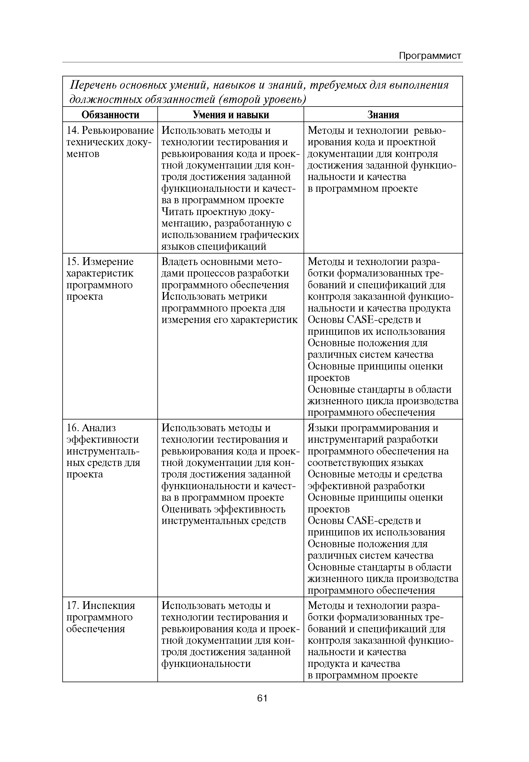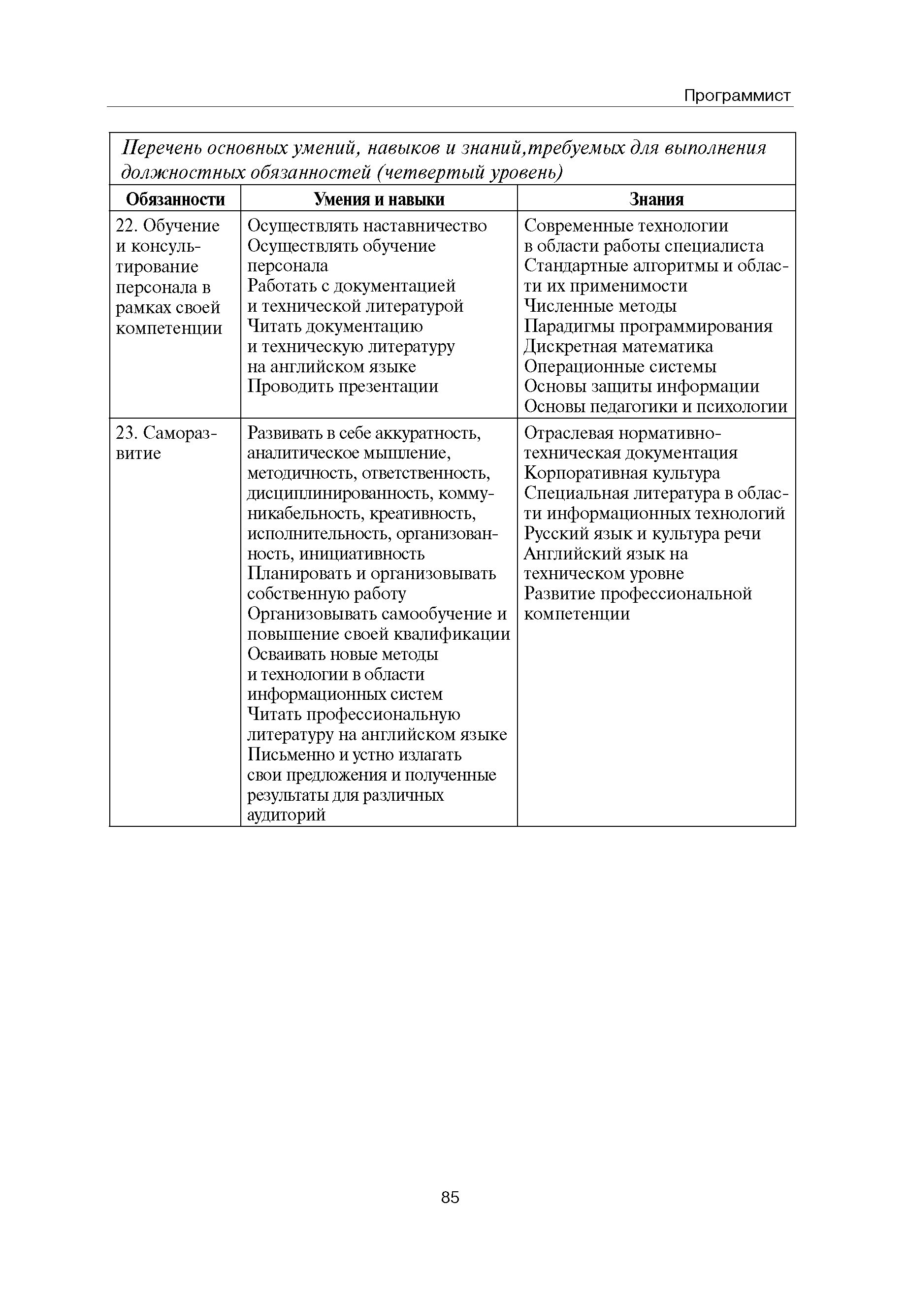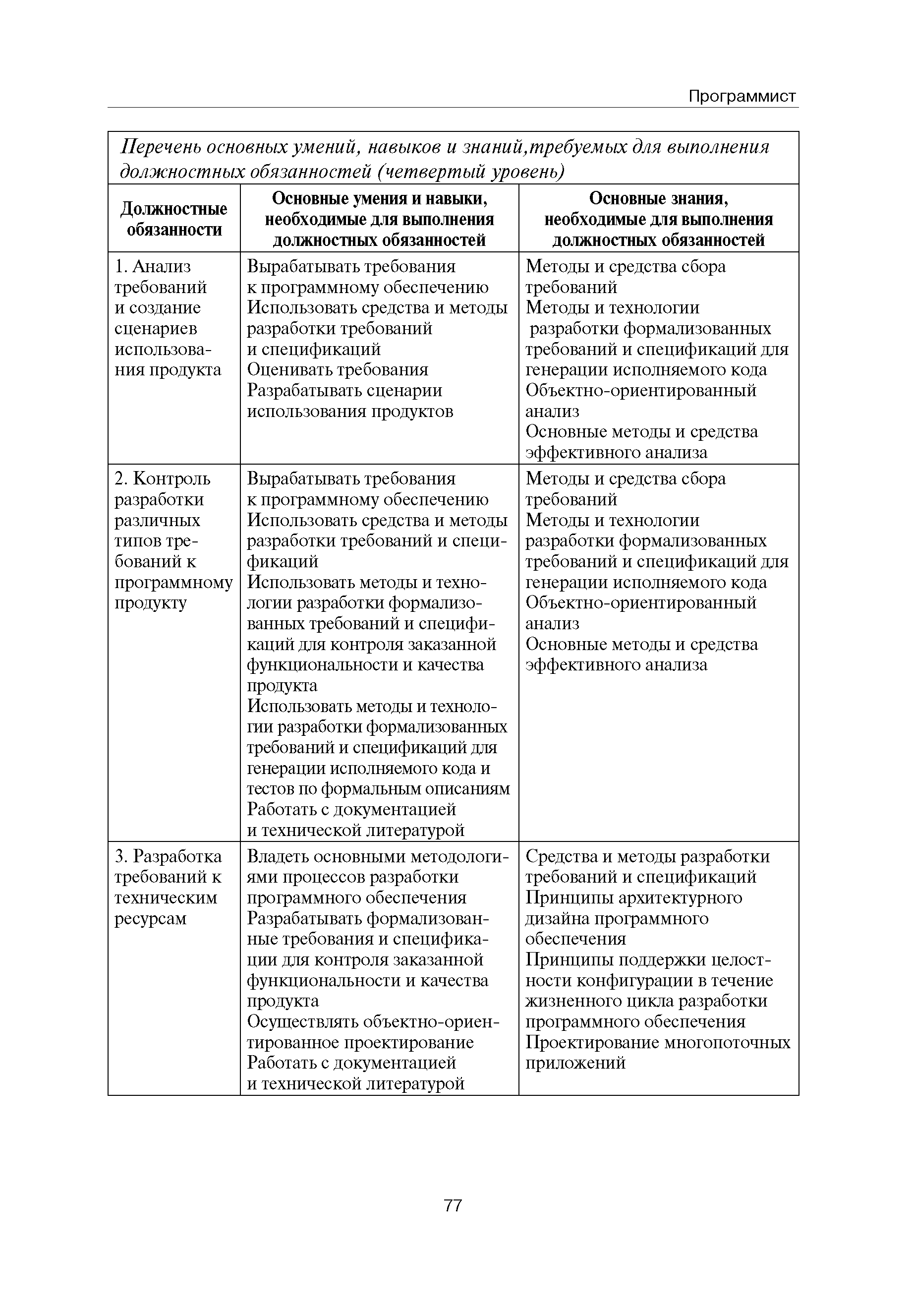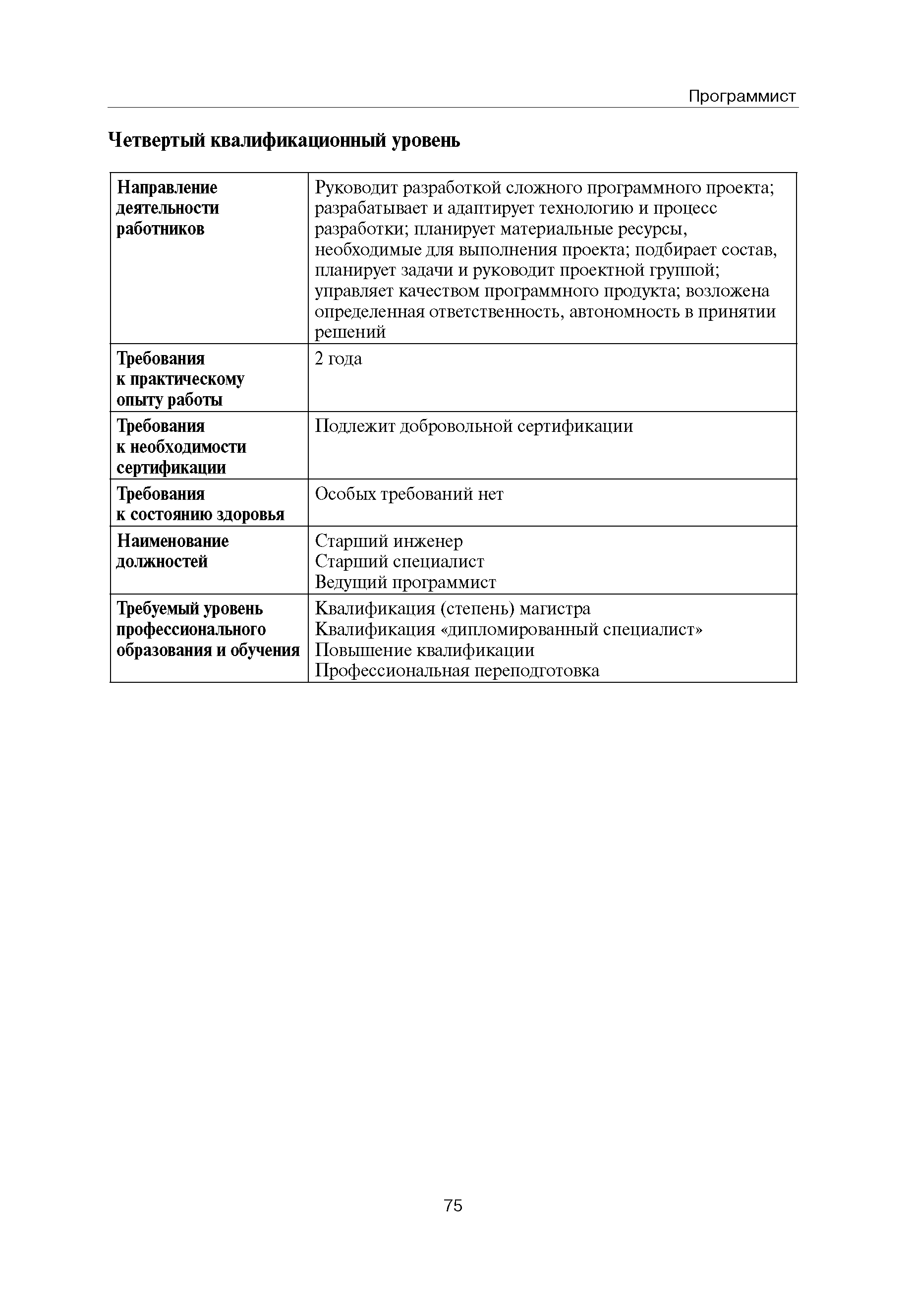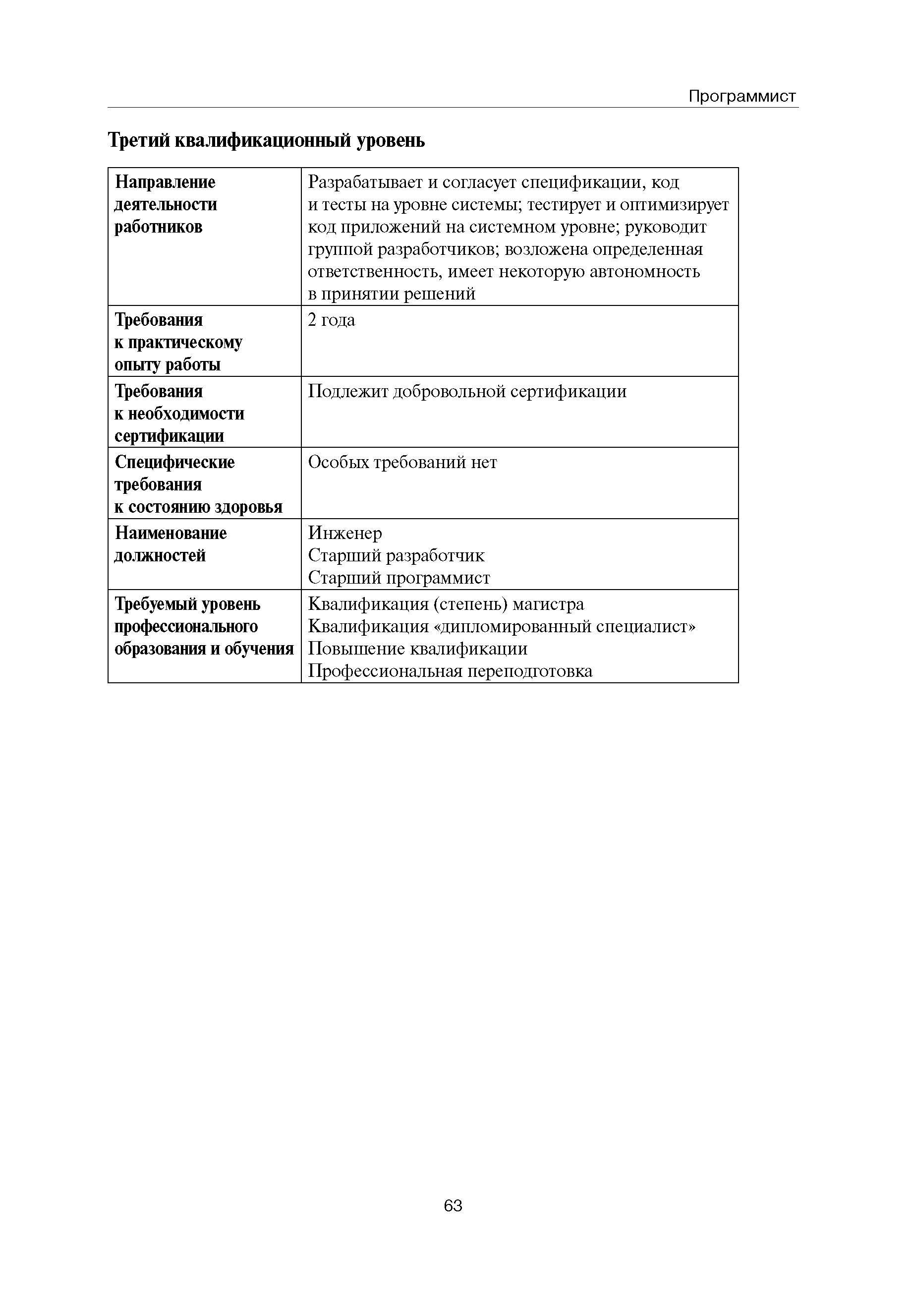 Квалификационные требования (профессиональный стандарт) в области информационных технологий "ПРОГРАММИСТ"| Статус: | действует | | Название рус.: | Квалификационные требования (профессиональный стандарт) в области информационных технологий "ПРОГРАММИСТ" | | Дата добавления в базу: | 01.09.2013 | | Дата актуализации: | 01.01.2021 | | Область применения: | Стандарт устанавливает требования к профессиональным компетенциям по квалификационным уровням. Рекомендован для применения в организациях всех форм собственности; для организаций крупного, среднего и малого бизнеса. Стандарт применяется в качестве нормативного документа, применяемого для подбора и расстановки кадров; планирования и нормирования труда; развития систем управления персоналом; для решения задач по профессиональной ориентации; для создания системы добровольной сертификации персонала и оценки уровня компетентности работников; для разработки образовательных стандартов и программ обучения в соответствии с требованиями работодателей; для проведения профессиональной подготовки, переподготовки и повышения квалификации персонала. | | Оглавление: | Авторский коллектив Область применения Указание сегмента сферы труда Профессиональный стандарт по профессии "ПРОГРАММИСТ" Первый квалификационный уровень Перечень должностных обязанностей для первого квалификационного уровня Перечень основных умений, навыков и знаний, требуемых для выполнения должностных обязанностей (1 уровень) Второй квалификационный уровень Перечень должностных обязанностей для второго квалификационного уровня Перечень основных умений, навыков и знаний, требуемых для выполнения должностных обязанностей (2 уровень) Третий квалификационный уровень Перечень должностных обязанностей для третьего квалификационного уровня Перечень основных умений, навыков и знаний, требуемых для выполнения должностных обязанностей (3 уровень) Четвертый квалификационный уровень Перечень должностных обязанностей для четвертого квалификационного уровня Перечень основных умений, навыков и знаний, требуемых для выполнения должностных обязанностей (4 уровень) | | Разработан: | Аналитический центр REAL-IT Государственный университет - Высшая школа экономики Motorola ИСП РАН Группа компаний IBS Лаборатория Касперского 1С