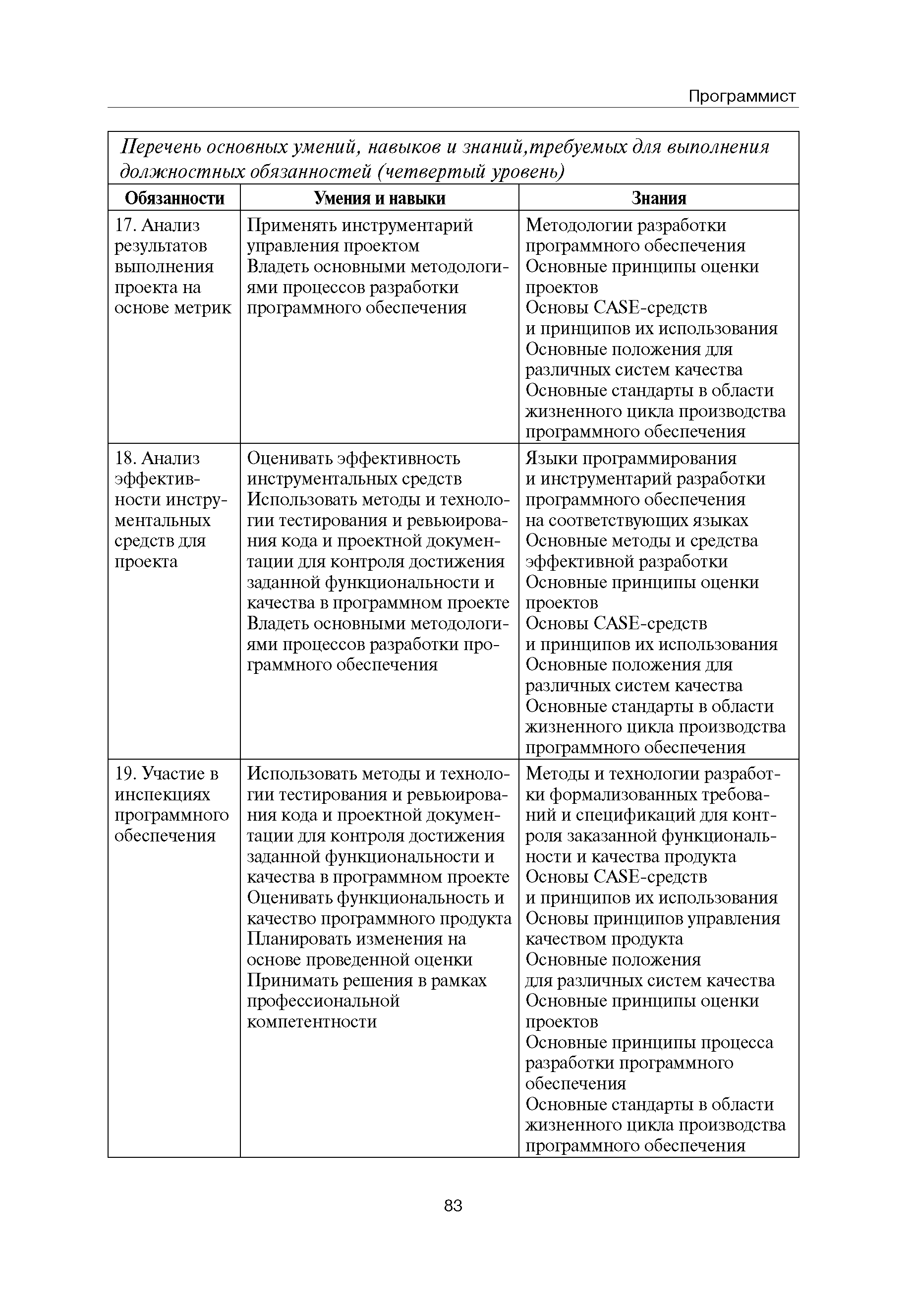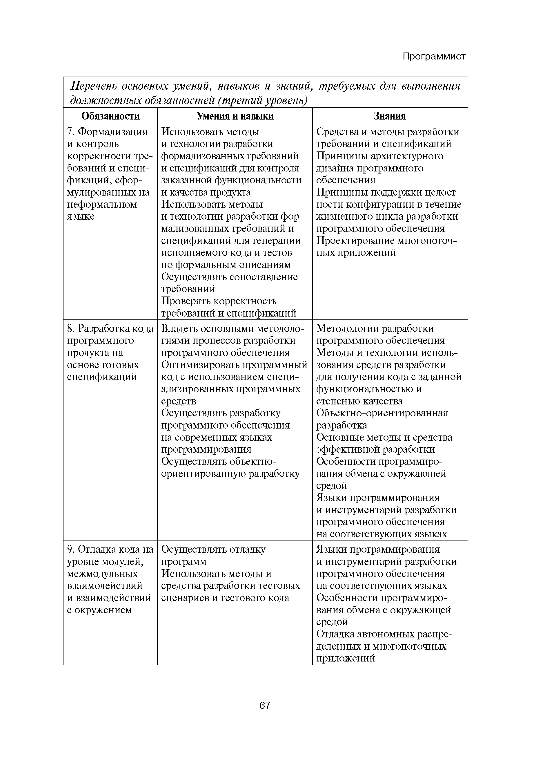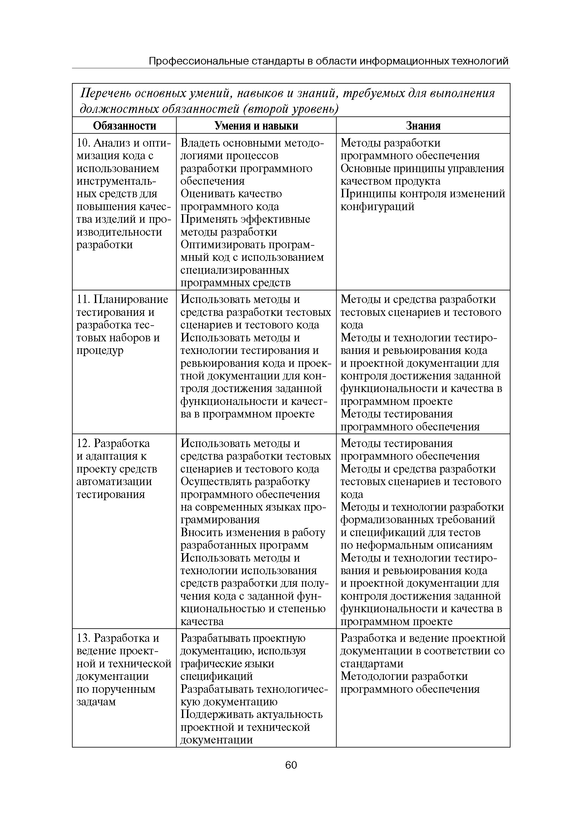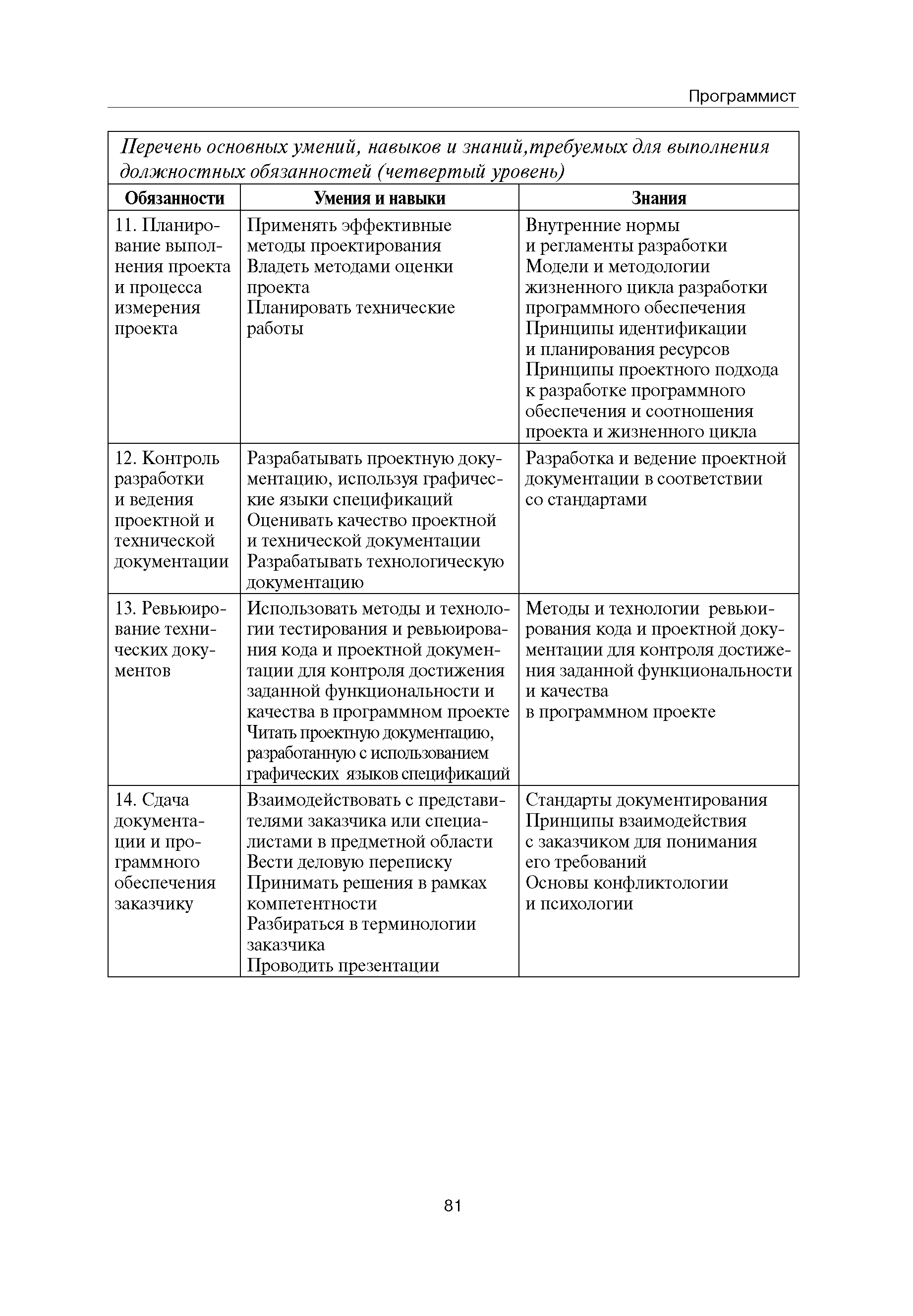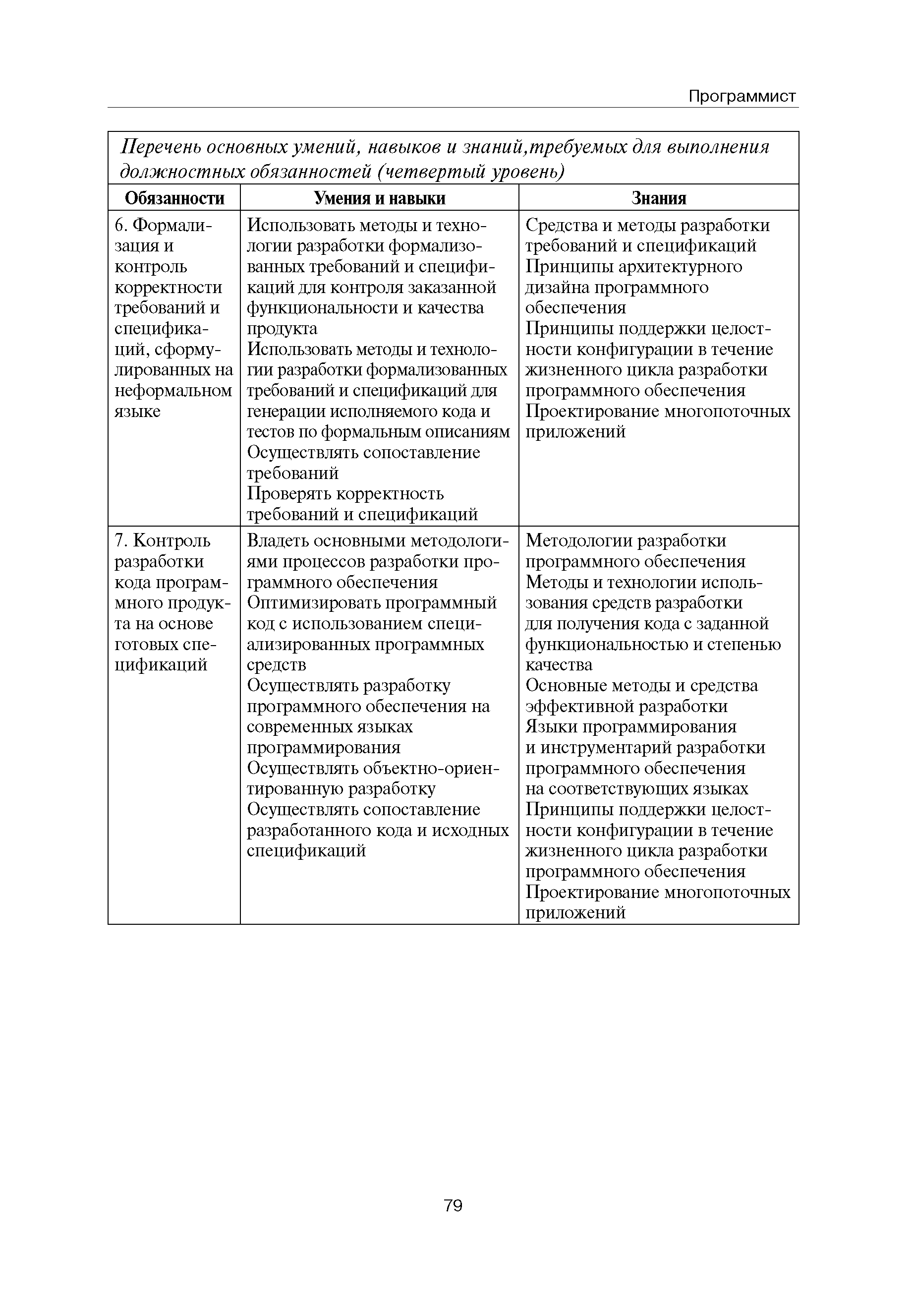 Квалификационные требования (профессиональный стандарт) в области информационных технологий "ПРОГРАММИСТ"| Статус: | действует | | Название рус.: | Квалификационные требования (профессиональный стандарт) в области информационных технологий "ПРОГРАММИСТ" | | Дата добавления в базу: | 01.09.2013 | | Дата актуализации: | 01.01.2021 | | Область применения: | Стандарт устанавливает требования к профессиональным компетенциям по квалификационным уровням. Рекомендован для применения в организациях всех форм собственности; для организаций крупного, среднего и малого бизнеса. Стандарт применяется в качестве нормативного документа, применяемого для подбора и расстановки кадров; планирования и нормирования труда; развития систем управления персоналом; для решения задач по профессиональной ориентации; для создания системы добровольной сертификации персонала и оценки уровня компетентности работников; для разработки образовательных стандартов и программ обучения в соответствии с требованиями работодателей; для проведения профессиональной подготовки, переподготовки и повышения квалификации персонала. | | Оглавление: | Авторский коллектив Область применения Указание сегмента сферы труда Профессиональный стандарт по профессии "ПРОГРАММИСТ" Первый квалификационный уровень Перечень должностных обязанностей для первого квалификационного уровня Перечень основных умений, навыков и знаний, требуемых для выполнения должностных обязанностей (1 уровень) Второй квалификационный уровень Перечень должностных обязанностей для второго квалификационного уровня Перечень основных умений, навыков и знаний, требуемых для выполнения должностных обязанностей (2 уровень) Третий квалификационный уровень Перечень должностных обязанностей для третьего квалификационного уровня Перечень основных умений, навыков и знаний, требуемых для выполнения должностных обязанностей (3 уровень) Четвертый квалификационный уровень Перечень должностных обязанностей для четвертого квалификационного уровня Перечень основных умений, навыков и знаний, требуемых для выполнения должностных обязанностей (4 уровень) | | Разработан: | Аналитический центр REAL-IT Государственный университет - Высшая школа экономики Motorola ИСП РАН Группа компаний IBS Лаборатория Касперского 1С