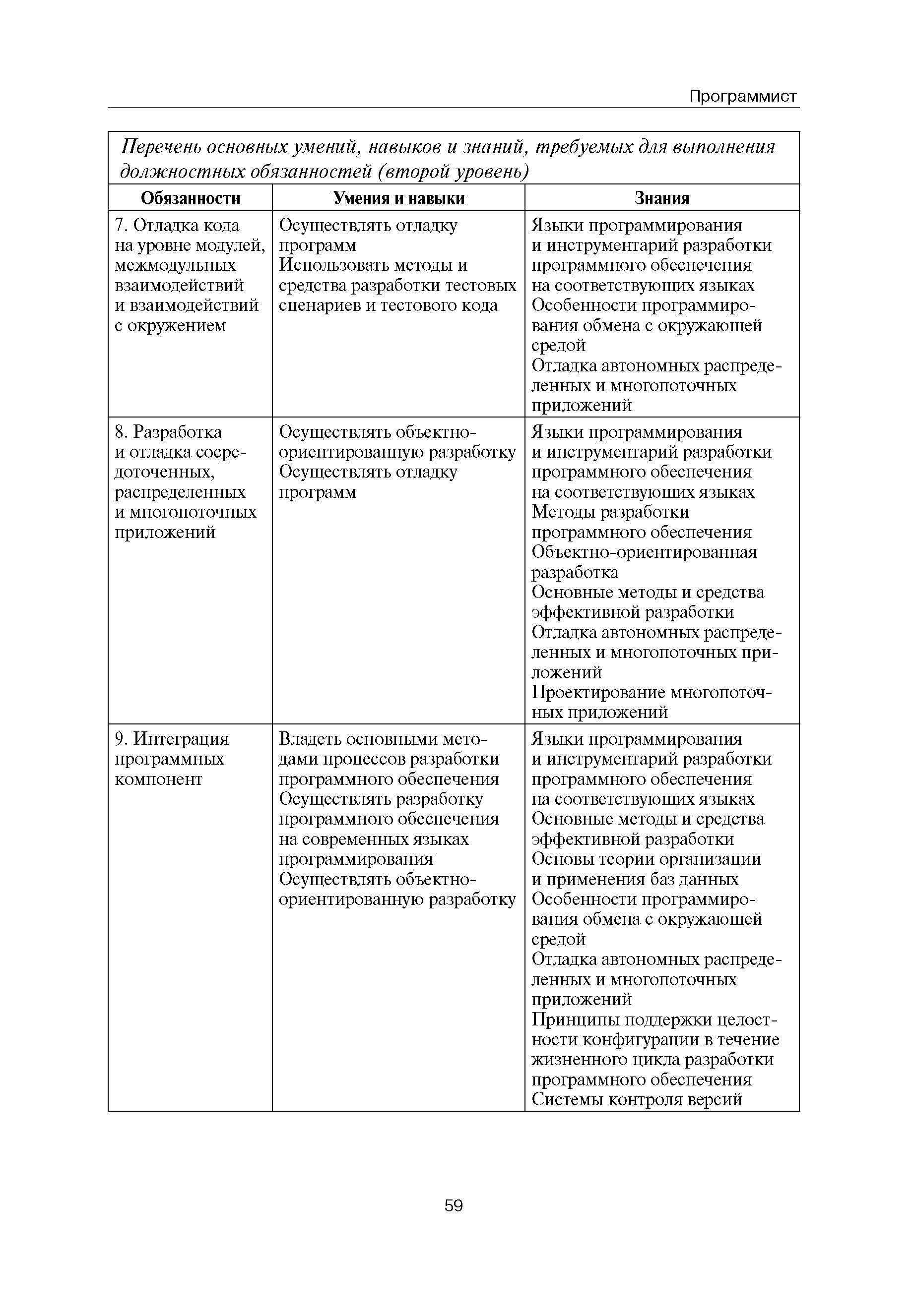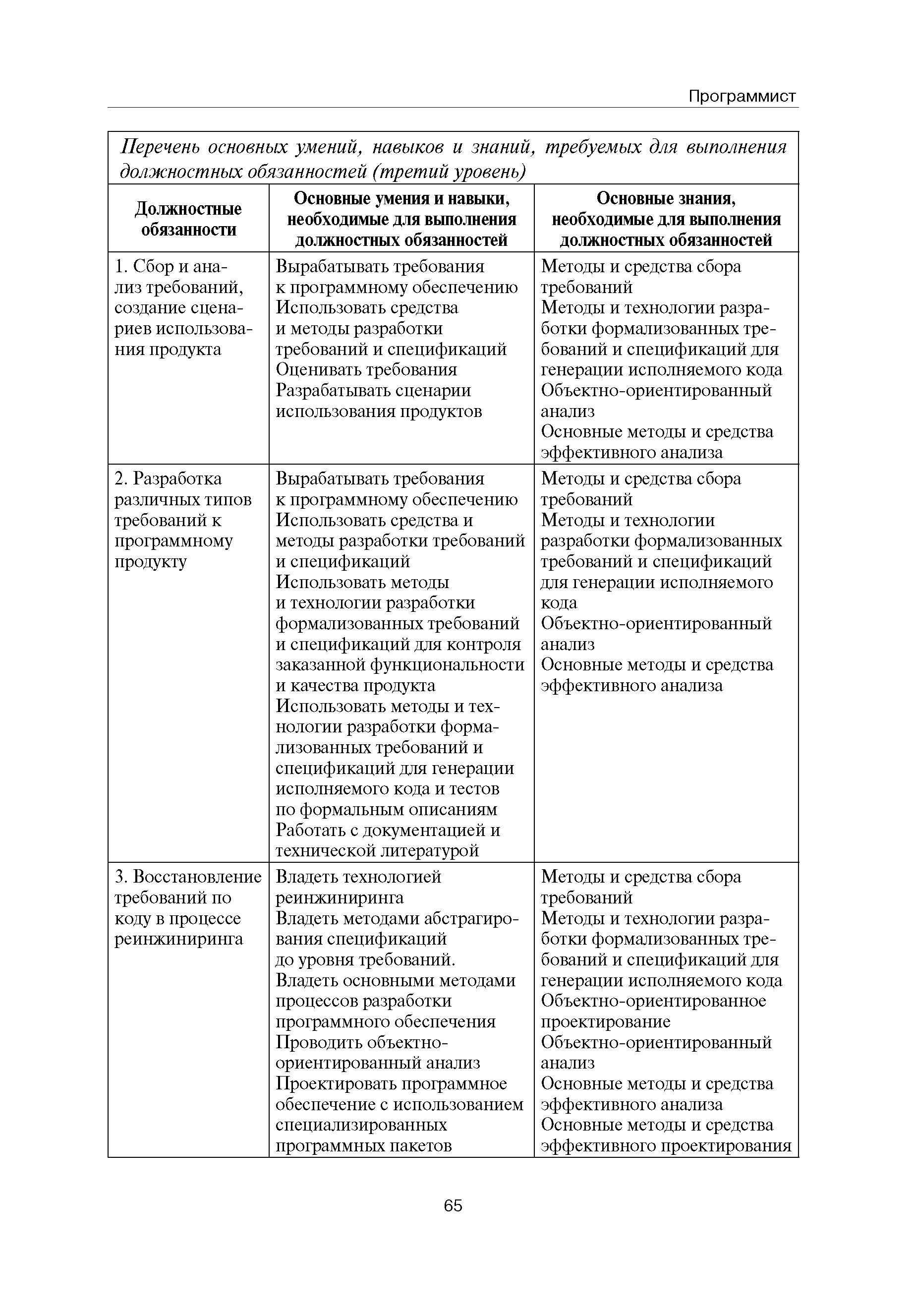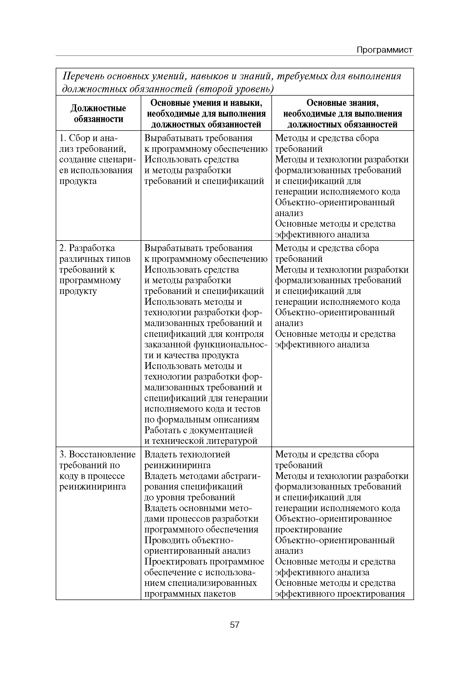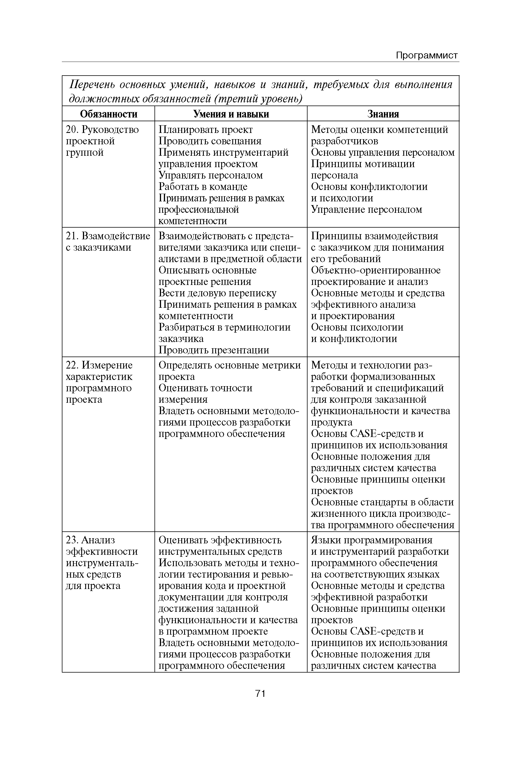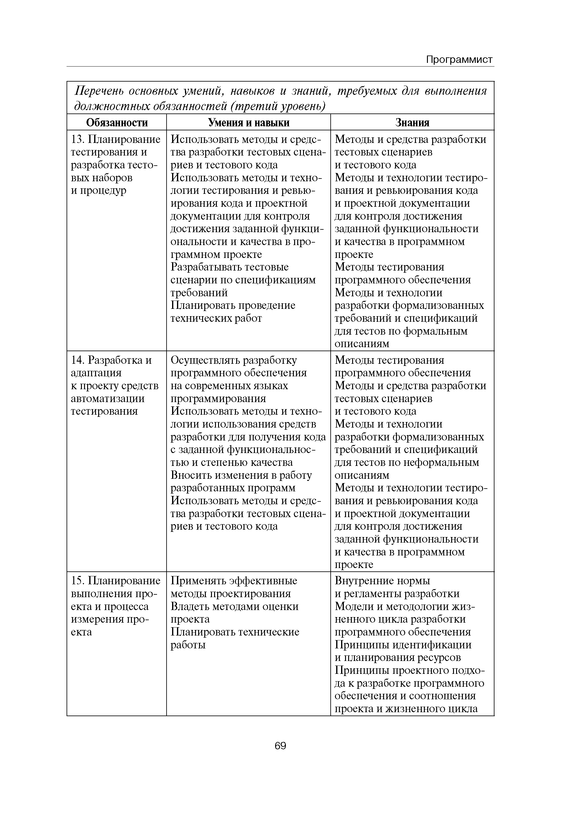 Квалификационные требования (профессиональный стандарт) в области информационных технологий "ПРОГРАММИСТ"| Статус: | действует | | Название рус.: | Квалификационные требования (профессиональный стандарт) в области информационных технологий "ПРОГРАММИСТ" | | Дата добавления в базу: | 01.09.2013 | | Дата актуализации: | 01.01.2021 | | Область применения: | Стандарт устанавливает требования к профессиональным компетенциям по квалификационным уровням. Рекомендован для применения в организациях всех форм собственности; для организаций крупного, среднего и малого бизнеса. Стандарт применяется в качестве нормативного документа, применяемого для подбора и расстановки кадров; планирования и нормирования труда; развития систем управления персоналом; для решения задач по профессиональной ориентации; для создания системы добровольной сертификации персонала и оценки уровня компетентности работников; для разработки образовательных стандартов и программ обучения в соответствии с требованиями работодателей; для проведения профессиональной подготовки, переподготовки и повышения квалификации персонала. | | Оглавление: | Авторский коллектив Область применения Указание сегмента сферы труда Профессиональный стандарт по профессии "ПРОГРАММИСТ" Первый квалификационный уровень Перечень должностных обязанностей для первого квалификационного уровня Перечень основных умений, навыков и знаний, требуемых для выполнения должностных обязанностей (1 уровень) Второй квалификационный уровень Перечень должностных обязанностей для второго квалификационного уровня Перечень основных умений, навыков и знаний, требуемых для выполнения должностных обязанностей (2 уровень) Третий квалификационный уровень Перечень должностных обязанностей для третьего квалификационного уровня Перечень основных умений, навыков и знаний, требуемых для выполнения должностных обязанностей (3 уровень) Четвертый квалификационный уровень Перечень должностных обязанностей для четвертого квалификационного уровня Перечень основных умений, навыков и знаний, требуемых для выполнения должностных обязанностей (4 уровень) | | Разработан: | Аналитический центр REAL-IT Государственный университет - Высшая школа экономики Motorola ИСП РАН Группа компаний IBS Лаборатория Касперского 1С