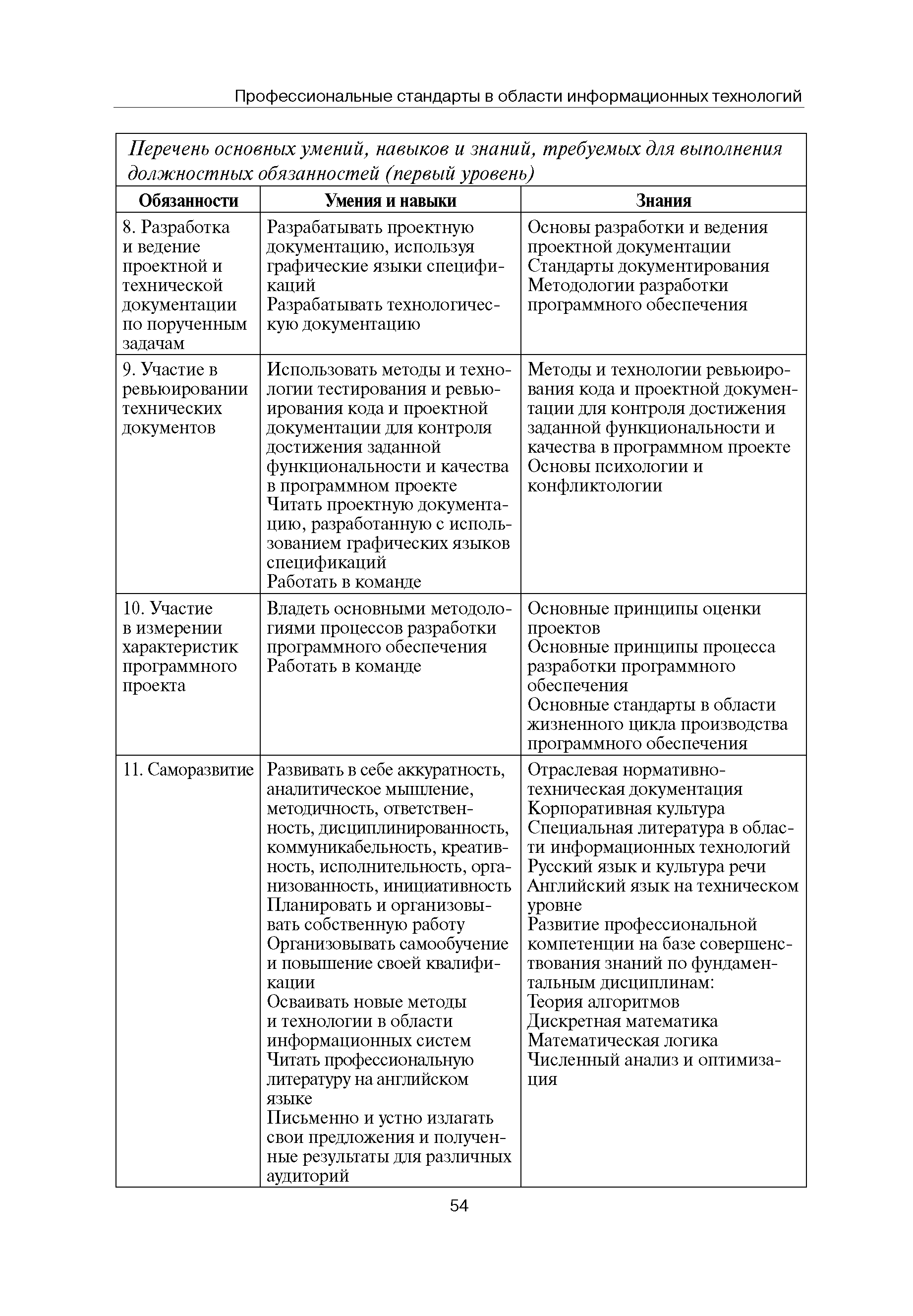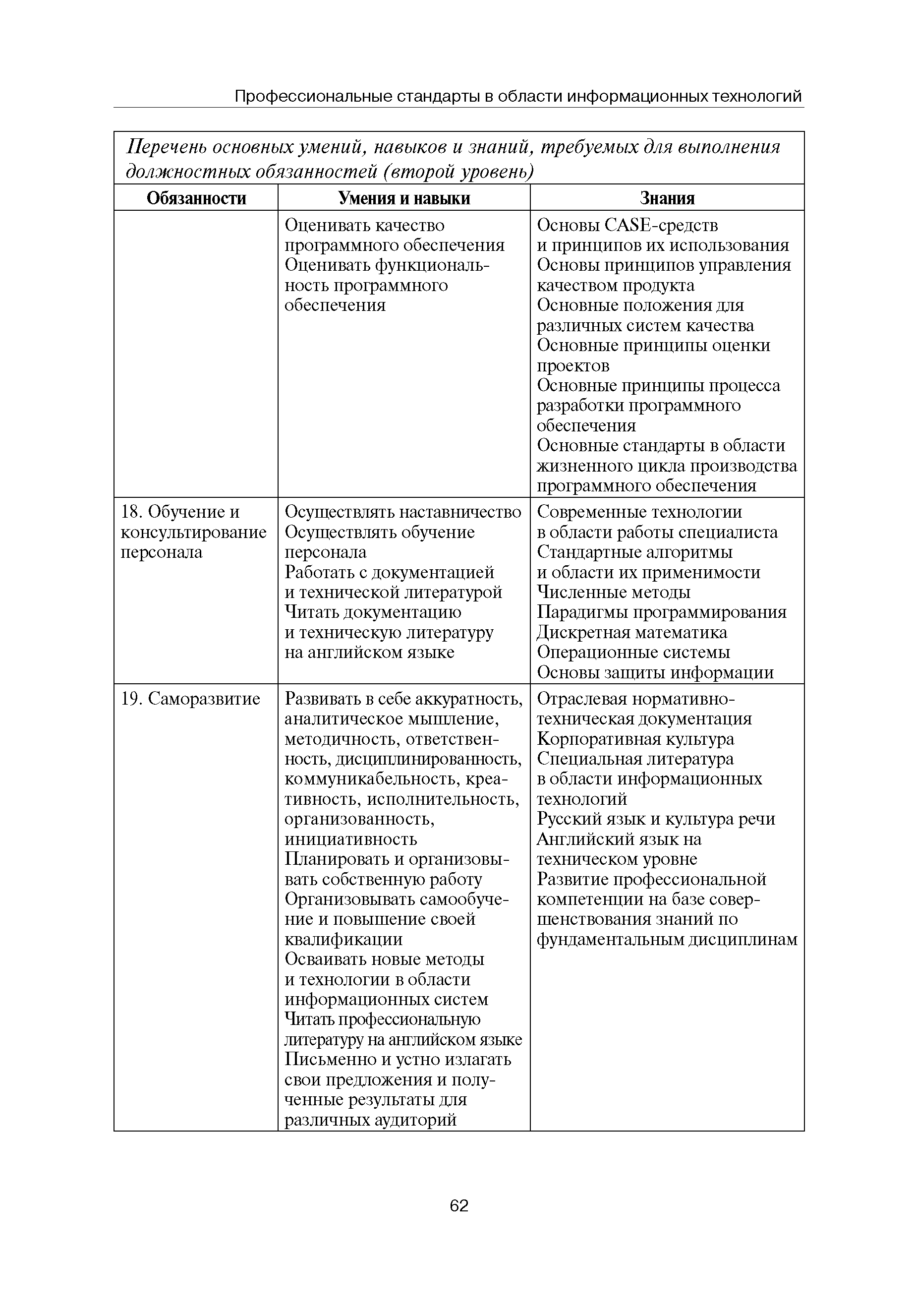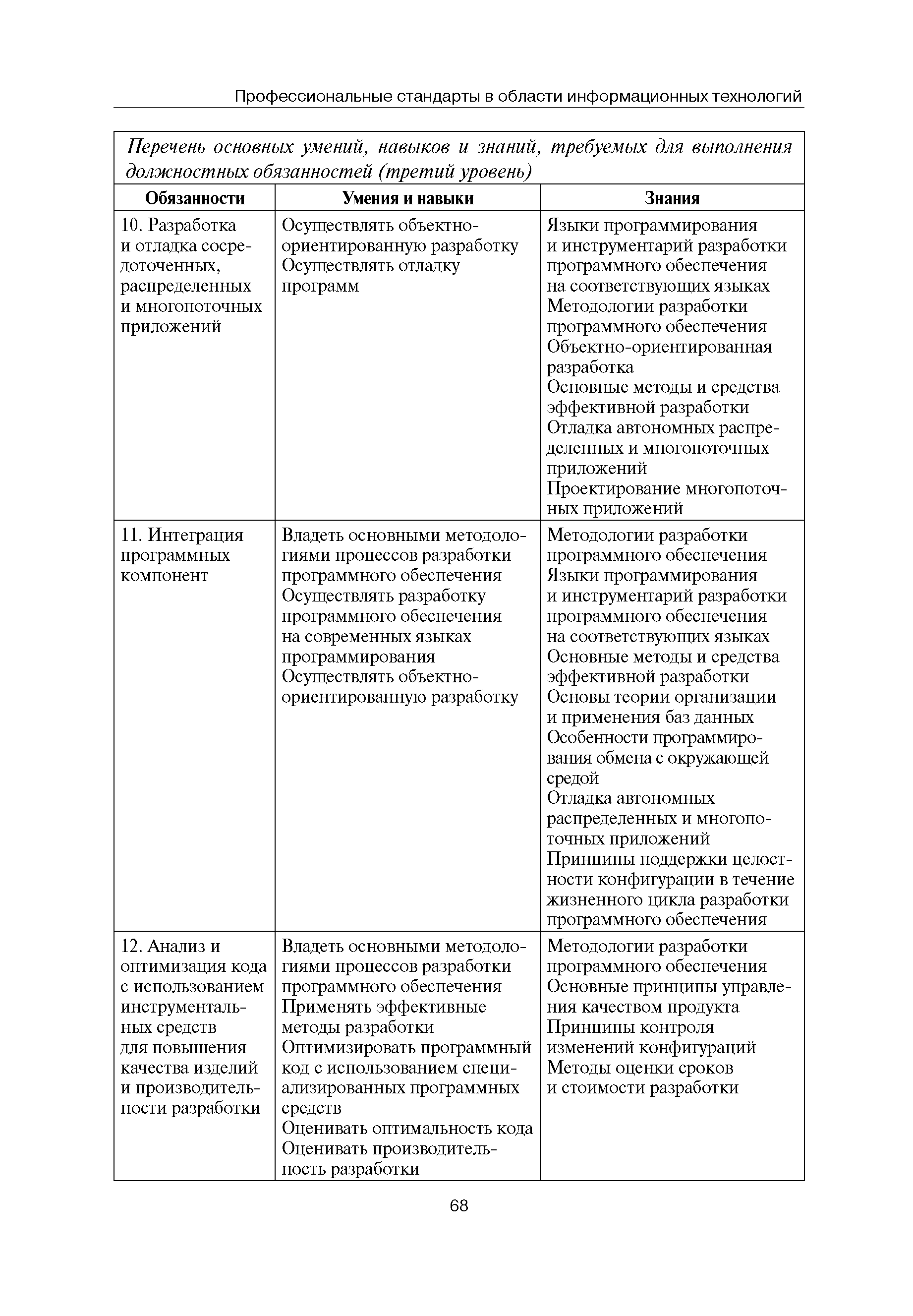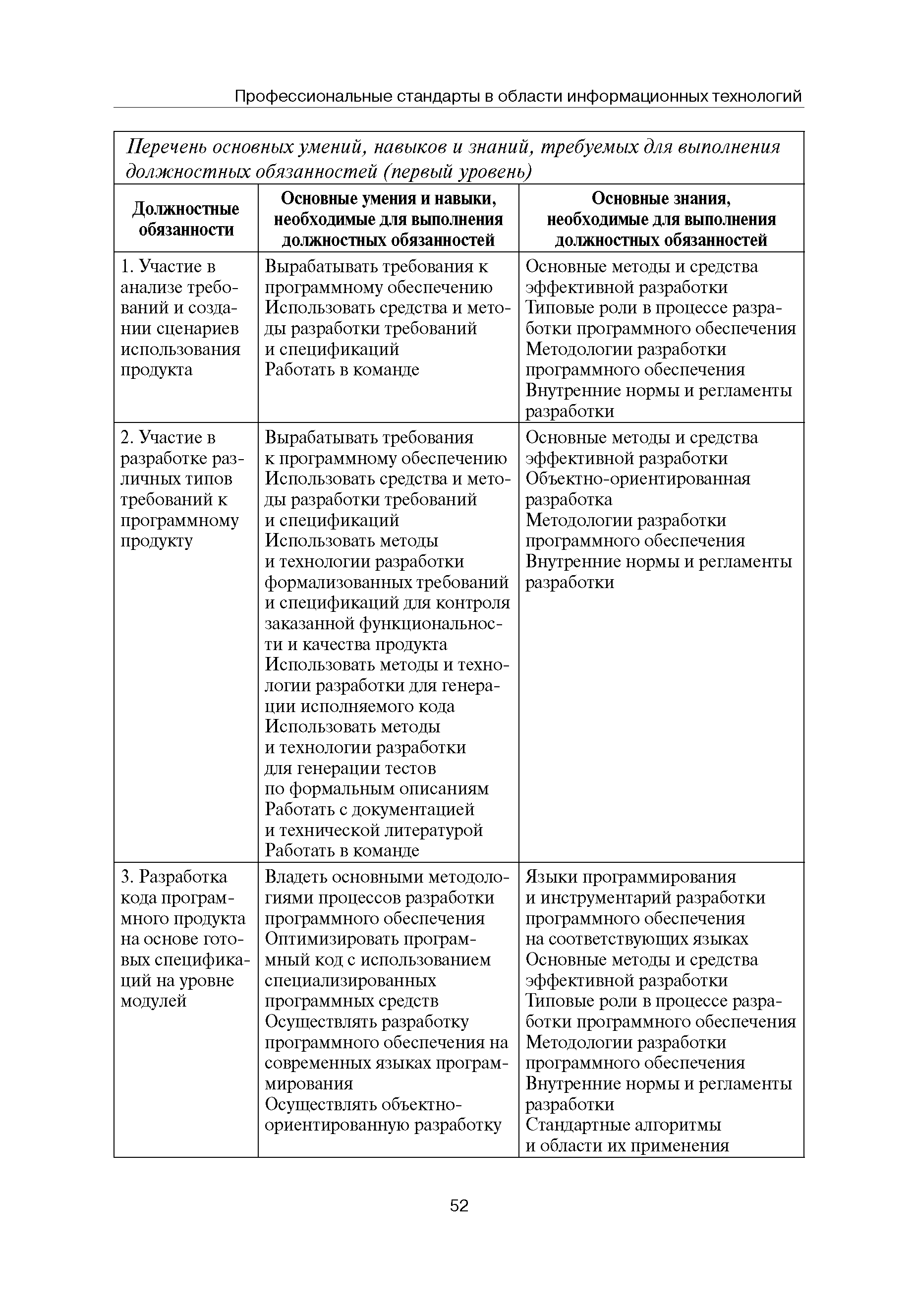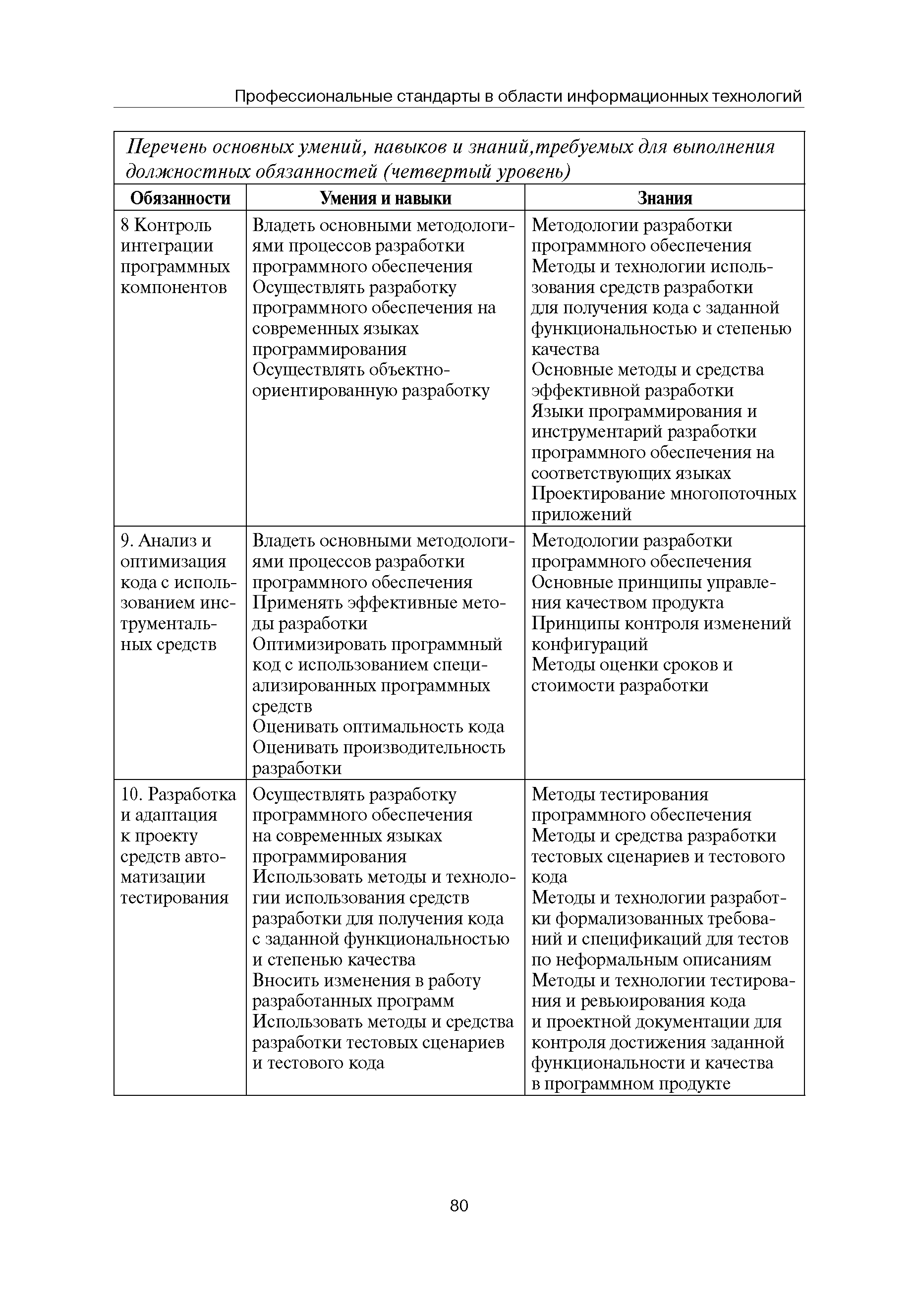 Квалификационные требования (профессиональный стандарт) в области информационных технологий "ПРОГРАММИСТ"| Статус: | действует | | Название рус.: | Квалификационные требования (профессиональный стандарт) в области информационных технологий "ПРОГРАММИСТ" | | Дата добавления в базу: | 01.09.2013 | | Дата актуализации: | 01.01.2021 | | Область применения: | Стандарт устанавливает требования к профессиональным компетенциям по квалификационным уровням. Рекомендован для применения в организациях всех форм собственности; для организаций крупного, среднего и малого бизнеса. Стандарт применяется в качестве нормативного документа, применяемого для подбора и расстановки кадров; планирования и нормирования труда; развития систем управления персоналом; для решения задач по профессиональной ориентации; для создания системы добровольной сертификации персонала и оценки уровня компетентности работников; для разработки образовательных стандартов и программ обучения в соответствии с требованиями работодателей; для проведения профессиональной подготовки, переподготовки и повышения квалификации персонала. | | Оглавление: | Авторский коллектив Область применения Указание сегмента сферы труда Профессиональный стандарт по профессии "ПРОГРАММИСТ" Первый квалификационный уровень Перечень должностных обязанностей для первого квалификационного уровня Перечень основных умений, навыков и знаний, требуемых для выполнения должностных обязанностей (1 уровень) Второй квалификационный уровень Перечень должностных обязанностей для второго квалификационного уровня Перечень основных умений, навыков и знаний, требуемых для выполнения должностных обязанностей (2 уровень) Третий квалификационный уровень Перечень должностных обязанностей для третьего квалификационного уровня Перечень основных умений, навыков и знаний, требуемых для выполнения должностных обязанностей (3 уровень) Четвертый квалификационный уровень Перечень должностных обязанностей для четвертого квалификационного уровня Перечень основных умений, навыков и знаний, требуемых для выполнения должностных обязанностей (4 уровень) | | Разработан: | Аналитический центр REAL-IT Государственный университет - Высшая школа экономики Motorola ИСП РАН Группа компаний IBS Лаборатория Касперского 1С