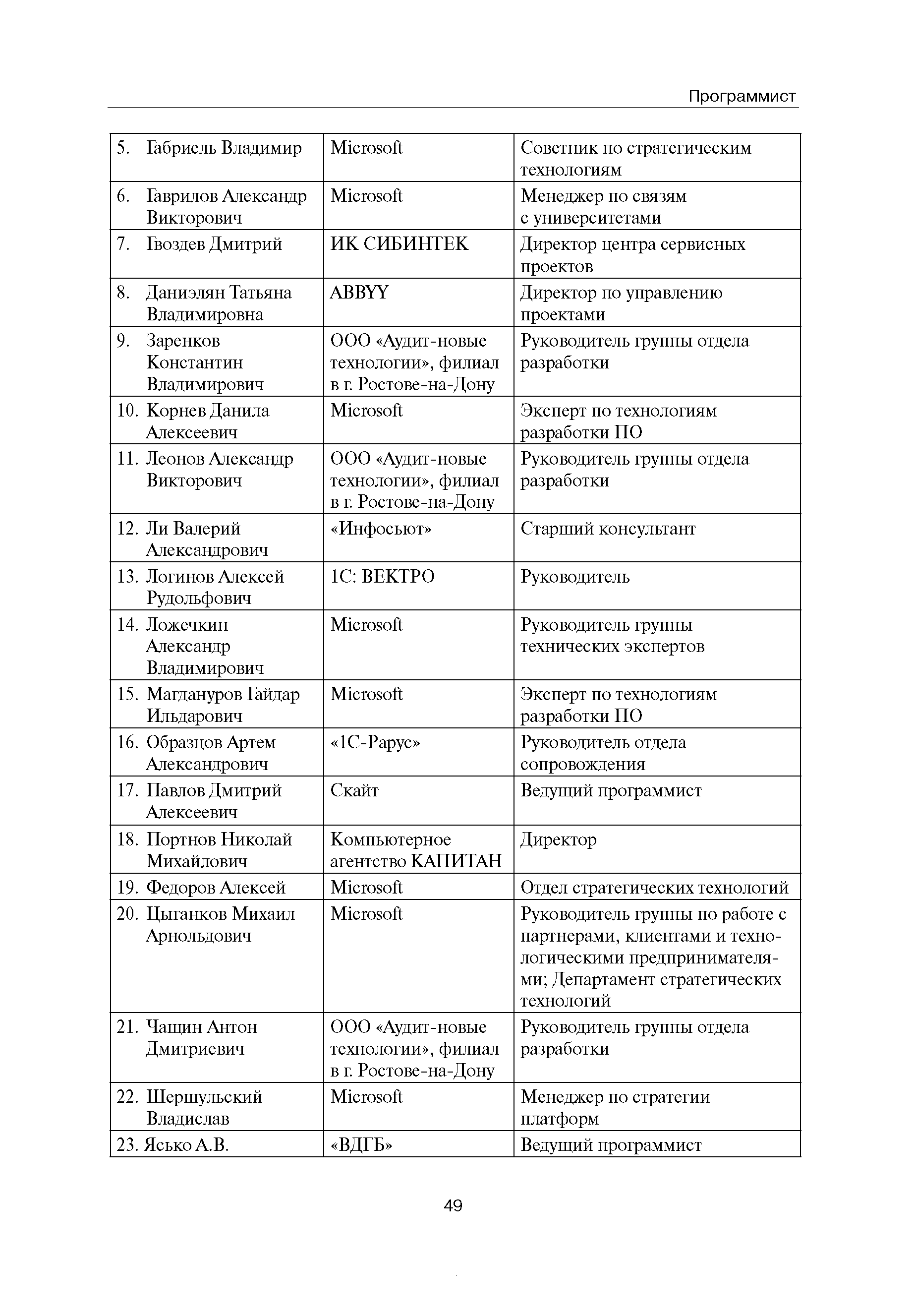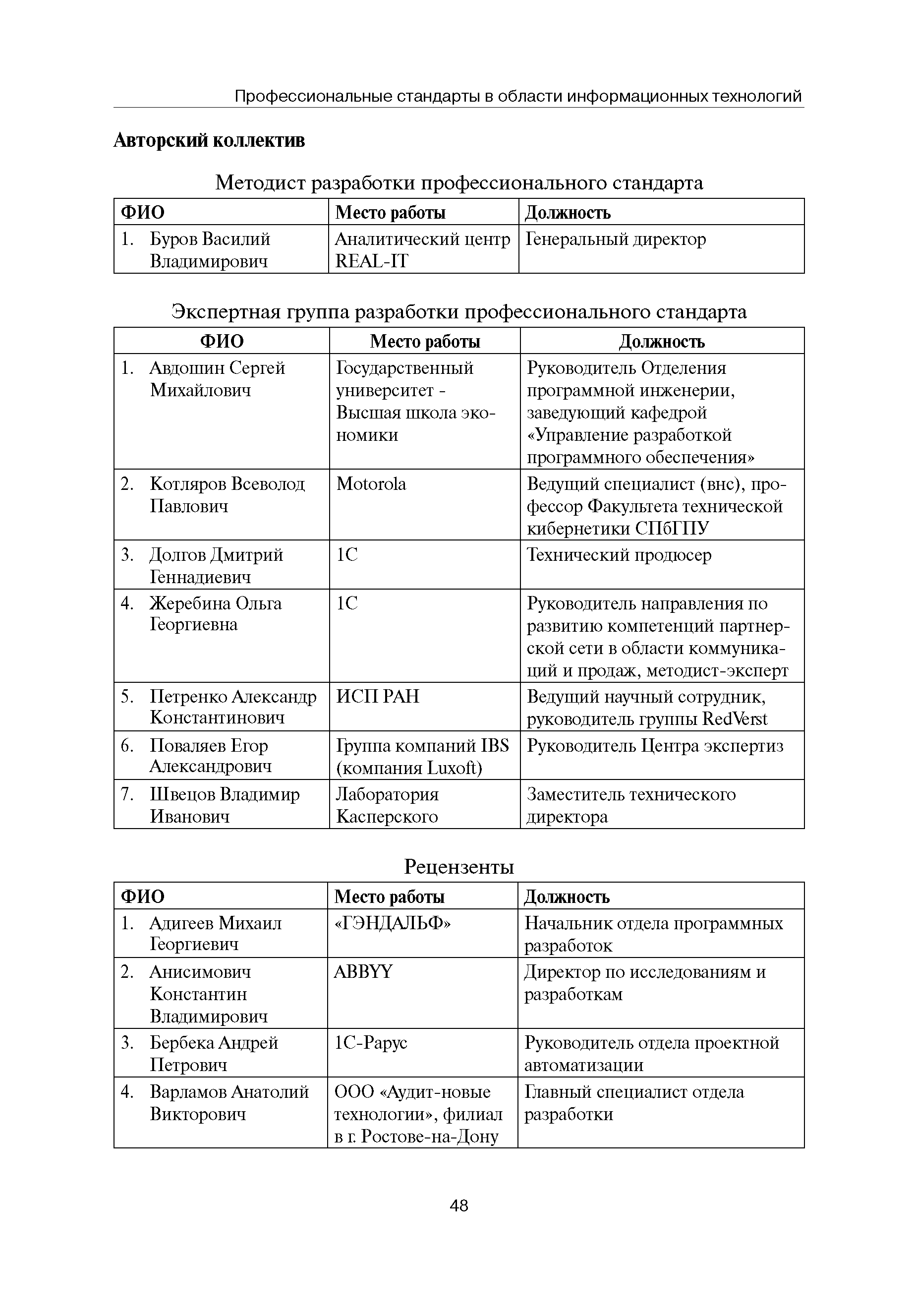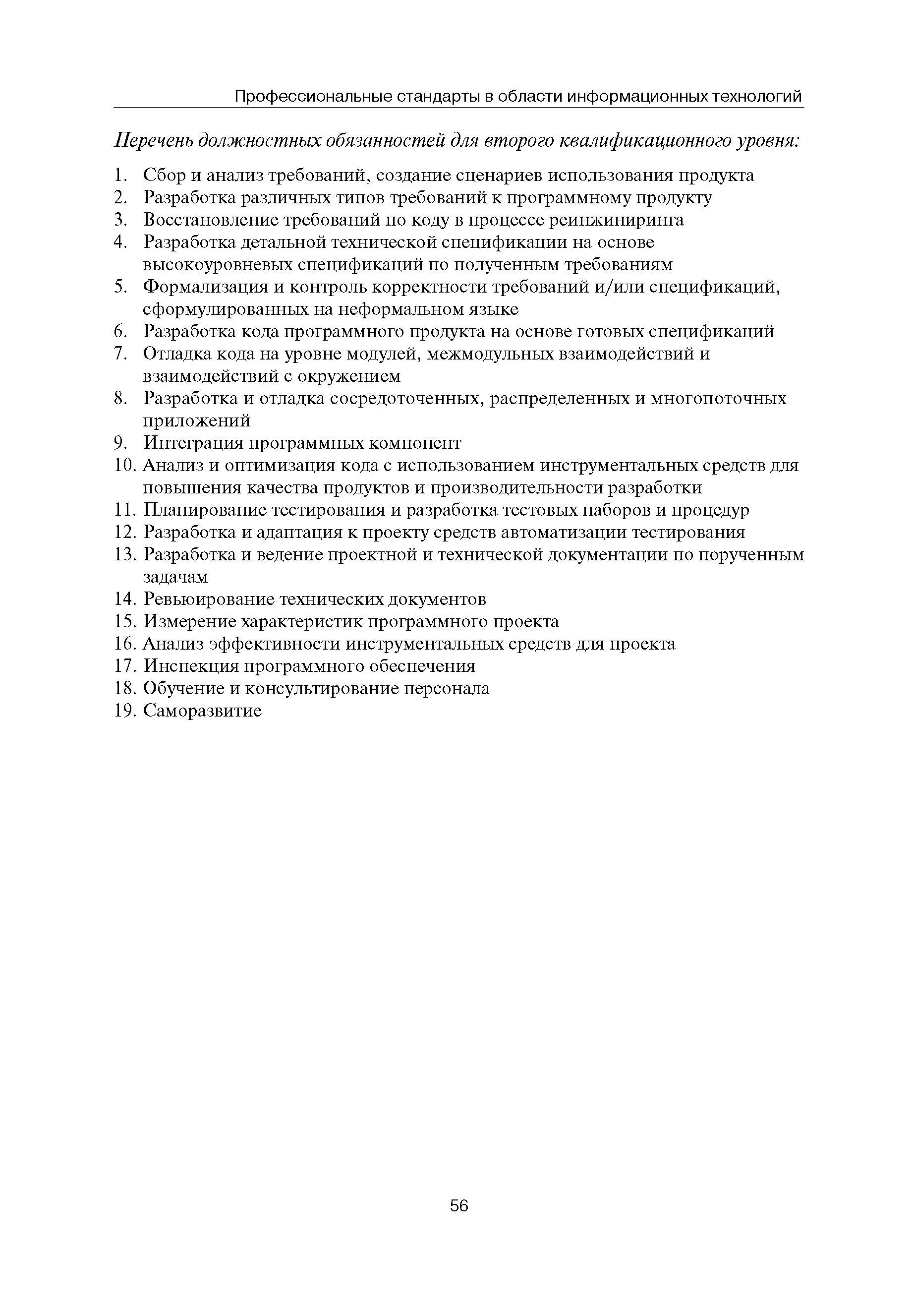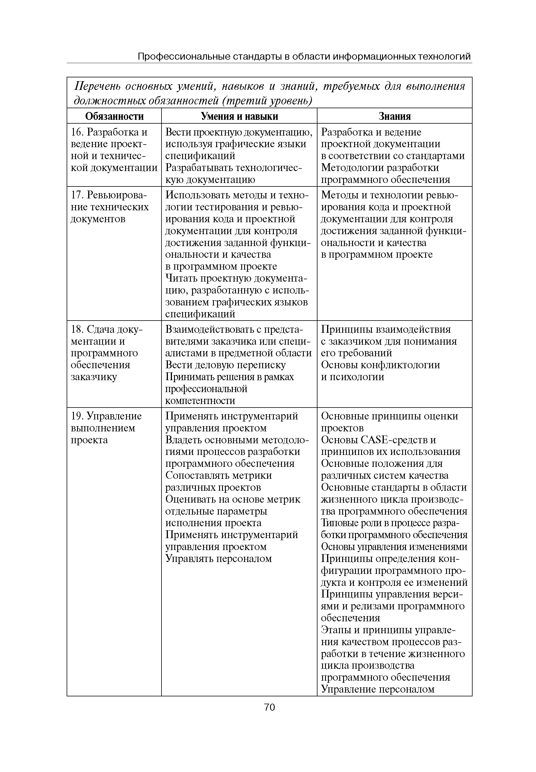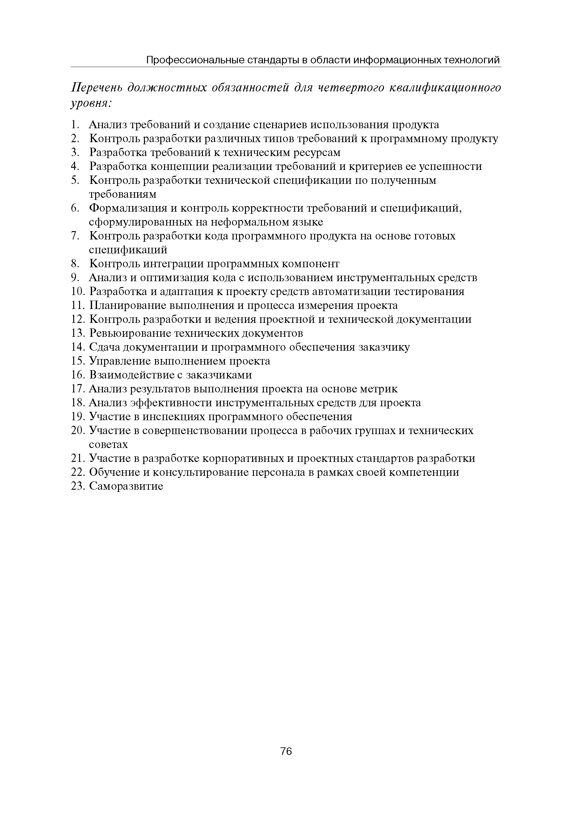 Квалификационные требования (профессиональный стандарт) в области информационных технологий "ПРОГРАММИСТ"| Статус: | действует | | Название рус.: | Квалификационные требования (профессиональный стандарт) в области информационных технологий "ПРОГРАММИСТ" | | Дата добавления в базу: | 01.09.2013 | | Дата актуализации: | 01.01.2021 | | Область применения: | Стандарт устанавливает требования к профессиональным компетенциям по квалификационным уровням. Рекомендован для применения в организациях всех форм собственности; для организаций крупного, среднего и малого бизнеса. Стандарт применяется в качестве нормативного документа, применяемого для подбора и расстановки кадров; планирования и нормирования труда; развития систем управления персоналом; для решения задач по профессиональной ориентации; для создания системы добровольной сертификации персонала и оценки уровня компетентности работников; для разработки образовательных стандартов и программ обучения в соответствии с требованиями работодателей; для проведения профессиональной подготовки, переподготовки и повышения квалификации персонала. | | Оглавление: | Авторский коллектив Область применения Указание сегмента сферы труда Профессиональный стандарт по профессии "ПРОГРАММИСТ" Первый квалификационный уровень Перечень должностных обязанностей для первого квалификационного уровня Перечень основных умений, навыков и знаний, требуемых для выполнения должностных обязанностей (1 уровень) Второй квалификационный уровень Перечень должностных обязанностей для второго квалификационного уровня Перечень основных умений, навыков и знаний, требуемых для выполнения должностных обязанностей (2 уровень) Третий квалификационный уровень Перечень должностных обязанностей для третьего квалификационного уровня Перечень основных умений, навыков и знаний, требуемых для выполнения должностных обязанностей (3 уровень) Четвертый квалификационный уровень Перечень должностных обязанностей для четвертого квалификационного уровня Перечень основных умений, навыков и знаний, требуемых для выполнения должностных обязанностей (4 уровень) | | Разработан: | Аналитический центр REAL-IT Государственный университет - Высшая школа экономики Motorola ИСП РАН Группа компаний IBS Лаборатория Касперского 1С