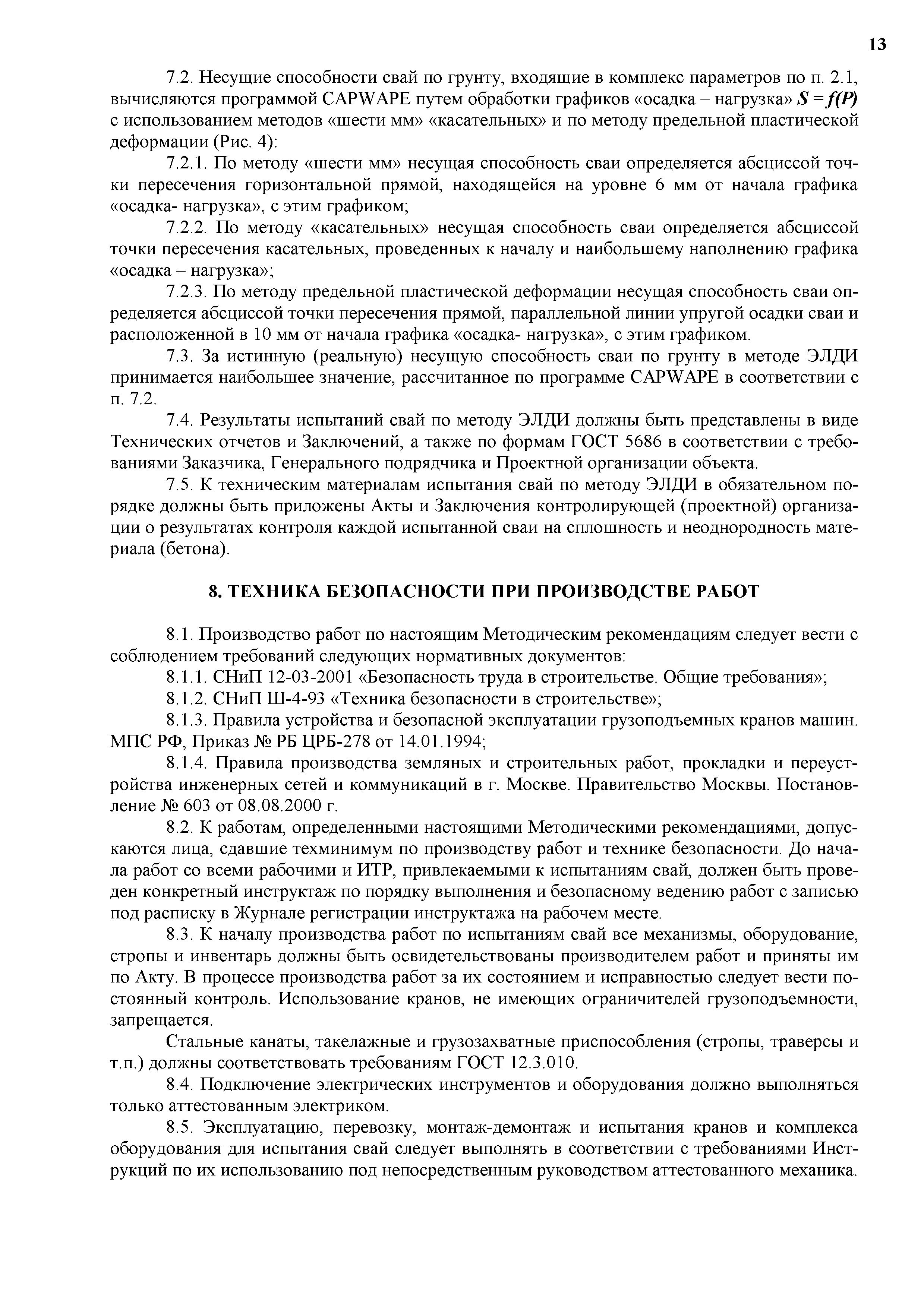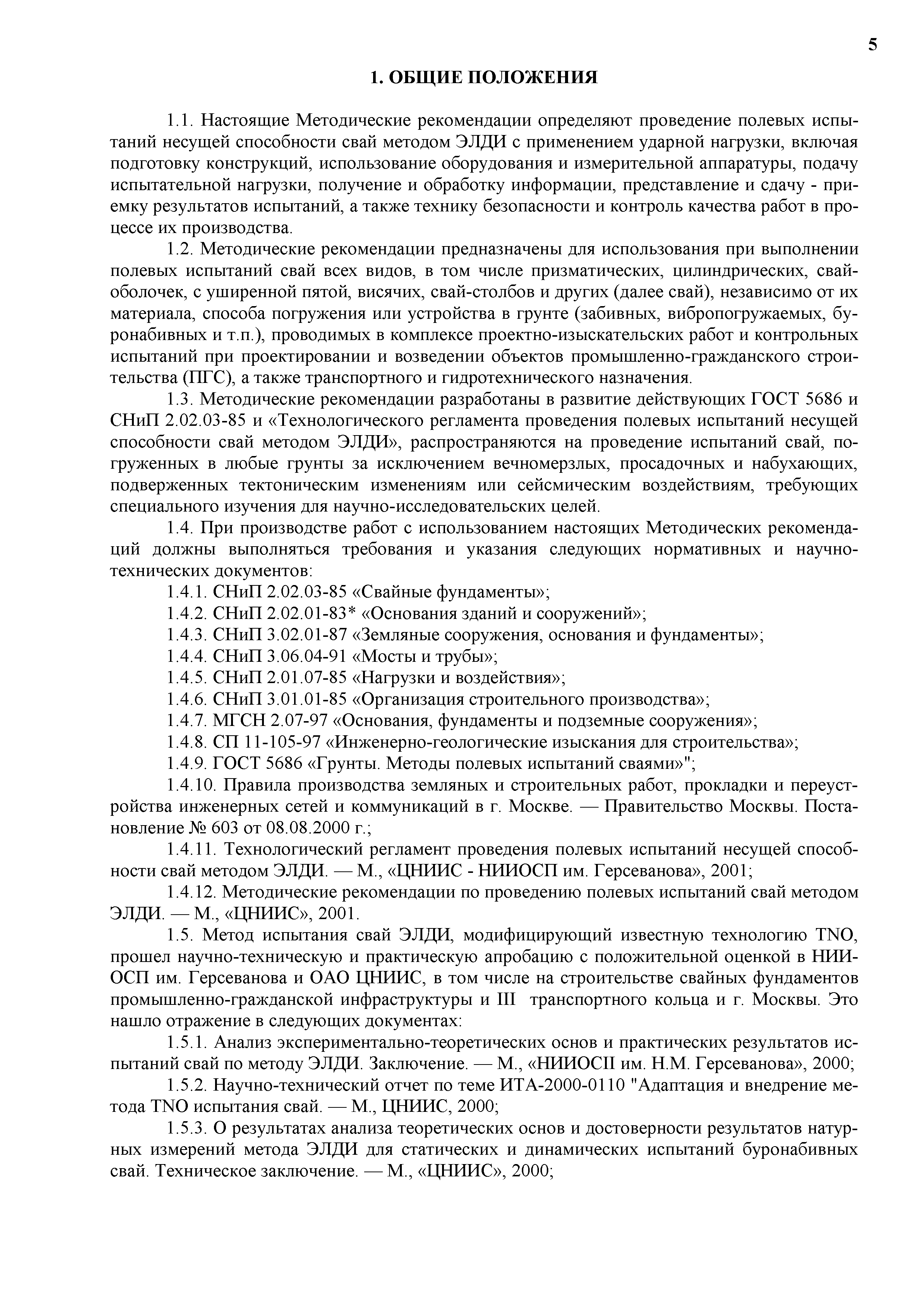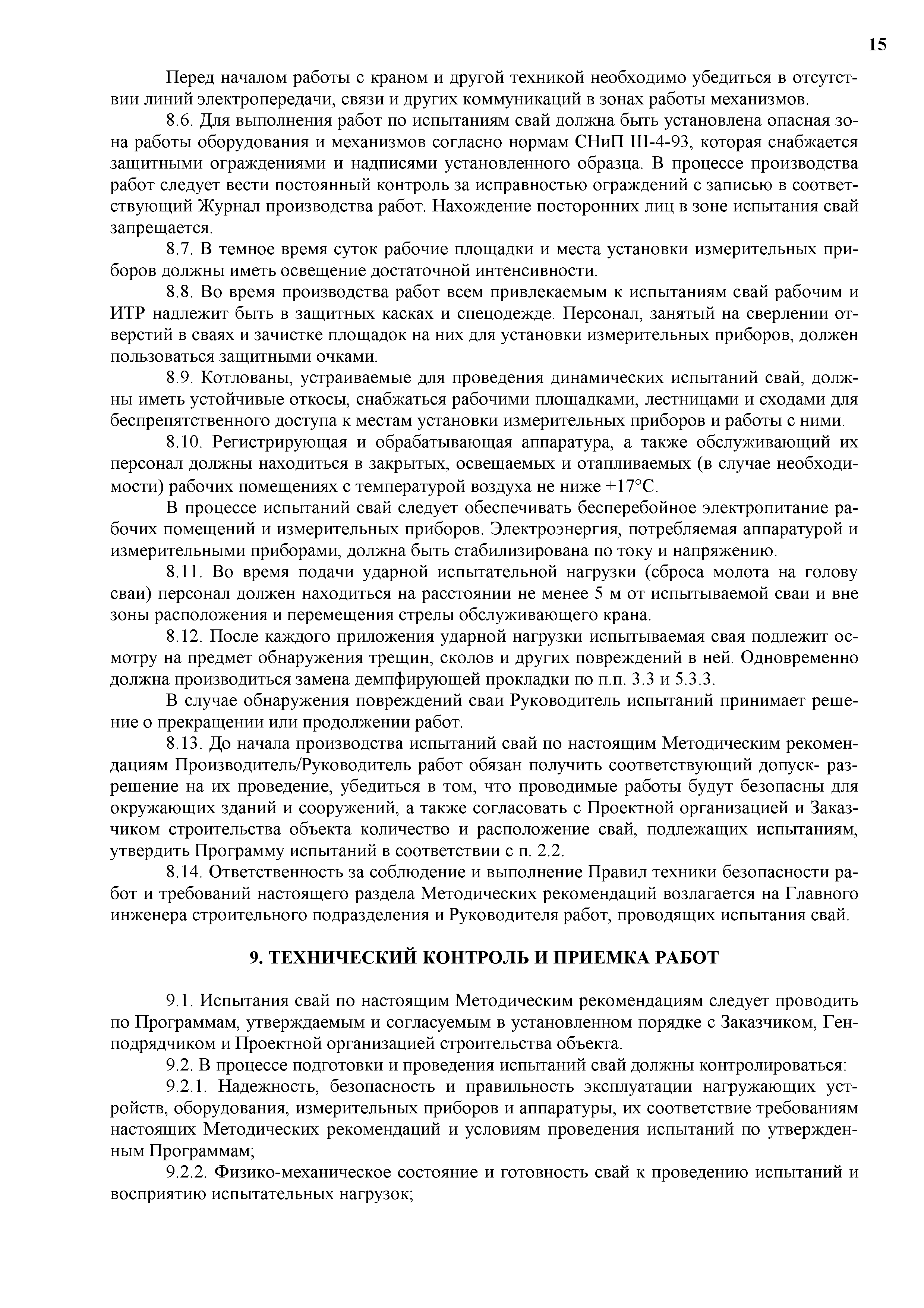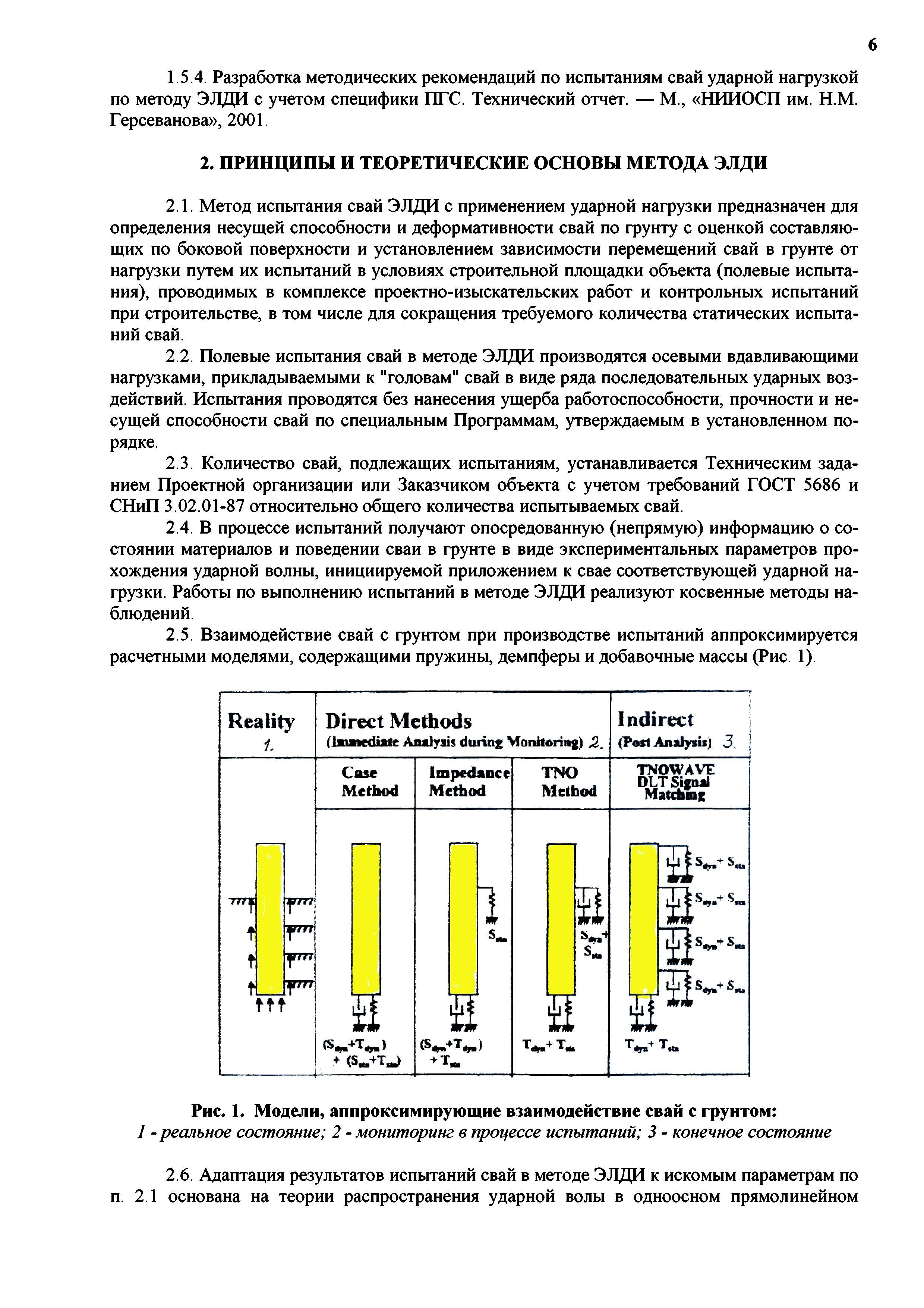 | Область применения: | Методические рекомендации определяют проведение полевых испытаний несущей способности свай методом ЭЛДИ с применением ударной нагрузки, включая подготовку конструкций, использование оборудования и измерительной аппаратуры, подачу испытательной нагрузки, получение и обработку информации, представление и сдачу-приемку результатов испытаний, а также технику безопасности и контроль качества работ в процессе производства. Методические рекомендации предназначены для использования при выполнении полевых испытаний свай всех видов, в том числе призматических, цилиндрических, свай-оболочек, с уширенной пятой, висячих, свай-столбов и других, независимо от их материала, способа погружения или устройства в грунте (забивных, вибропогружаемых, буронабивных и т.п.), проводимых в комплексе проектно-изыскательских работ и контрольных испытаний при проектировании и возведении объектов промышленно-гражданского строительства, а также транспортного и гидротехнического назначения |