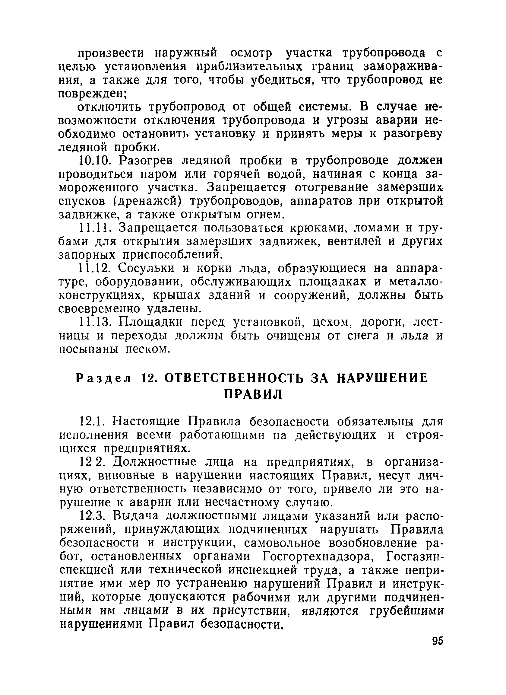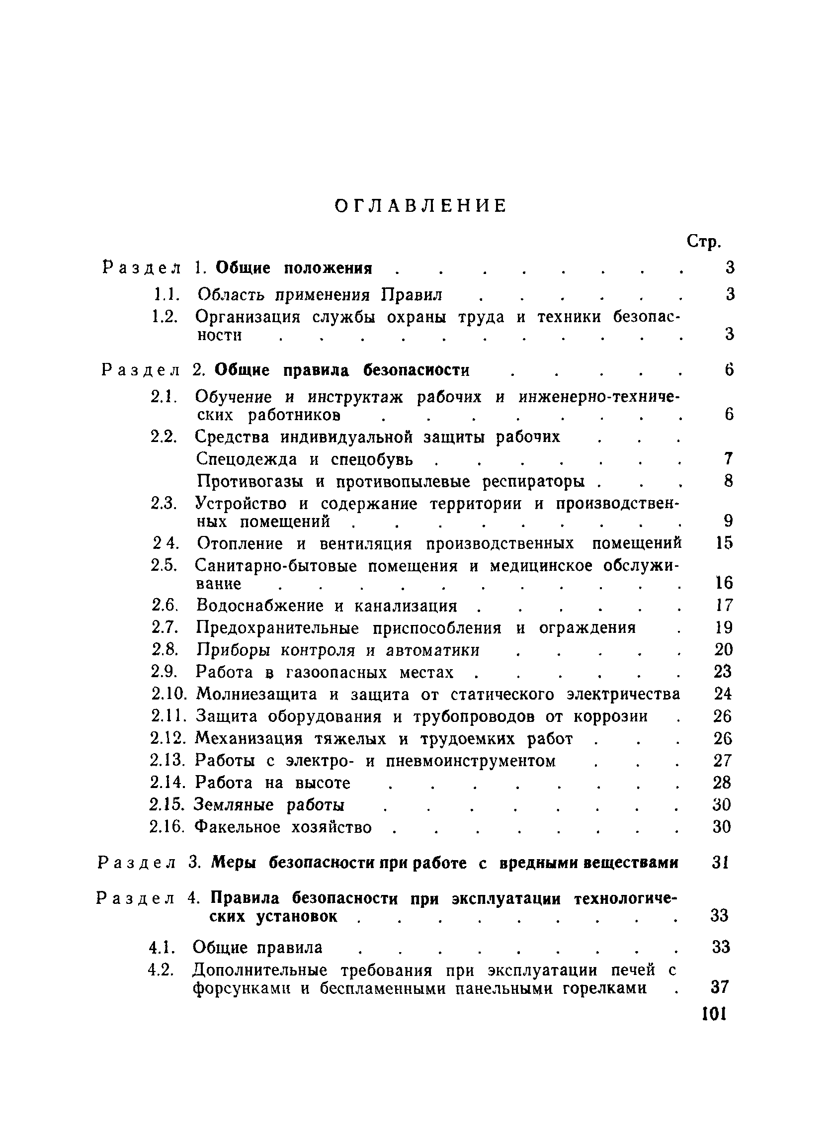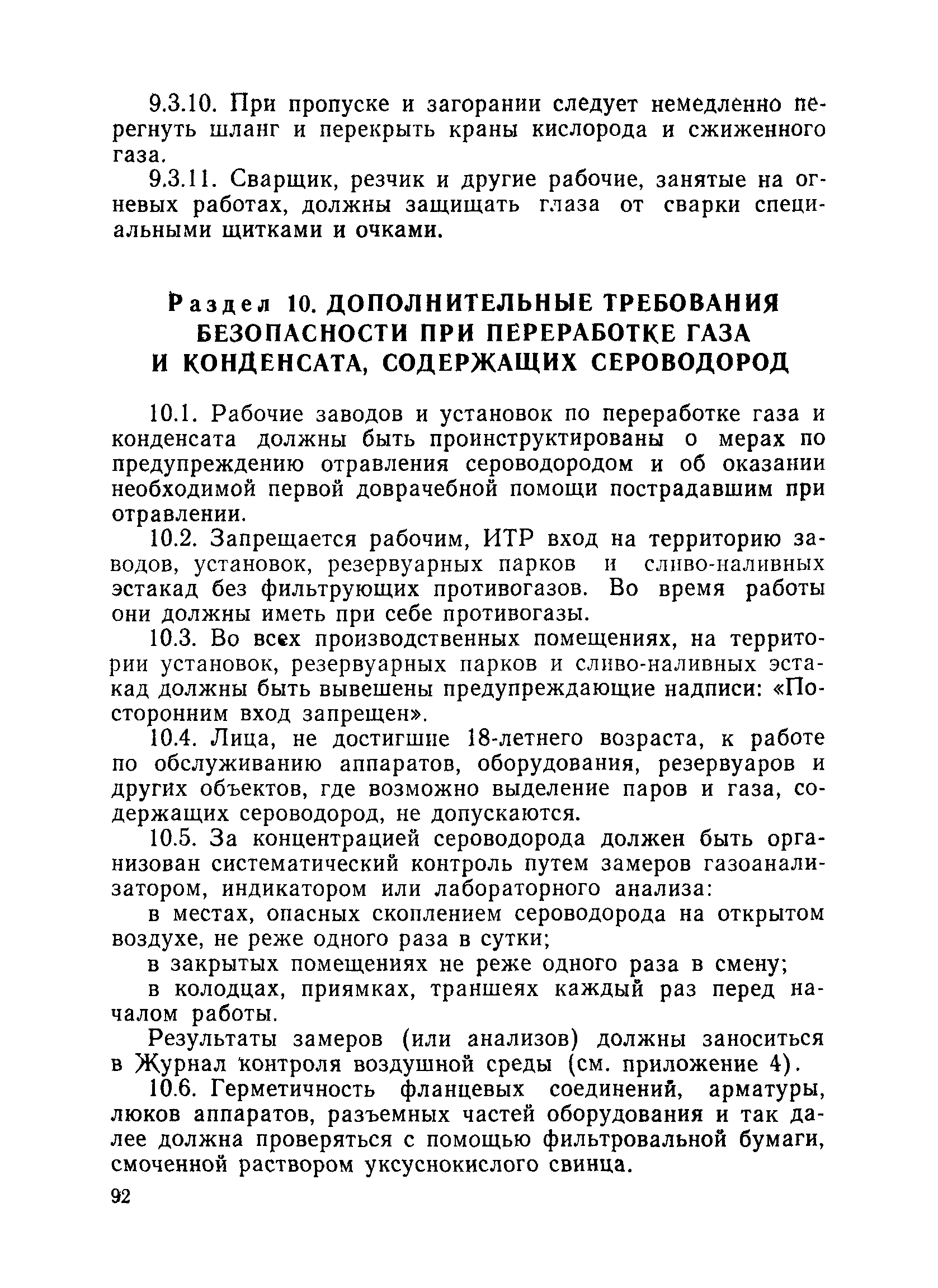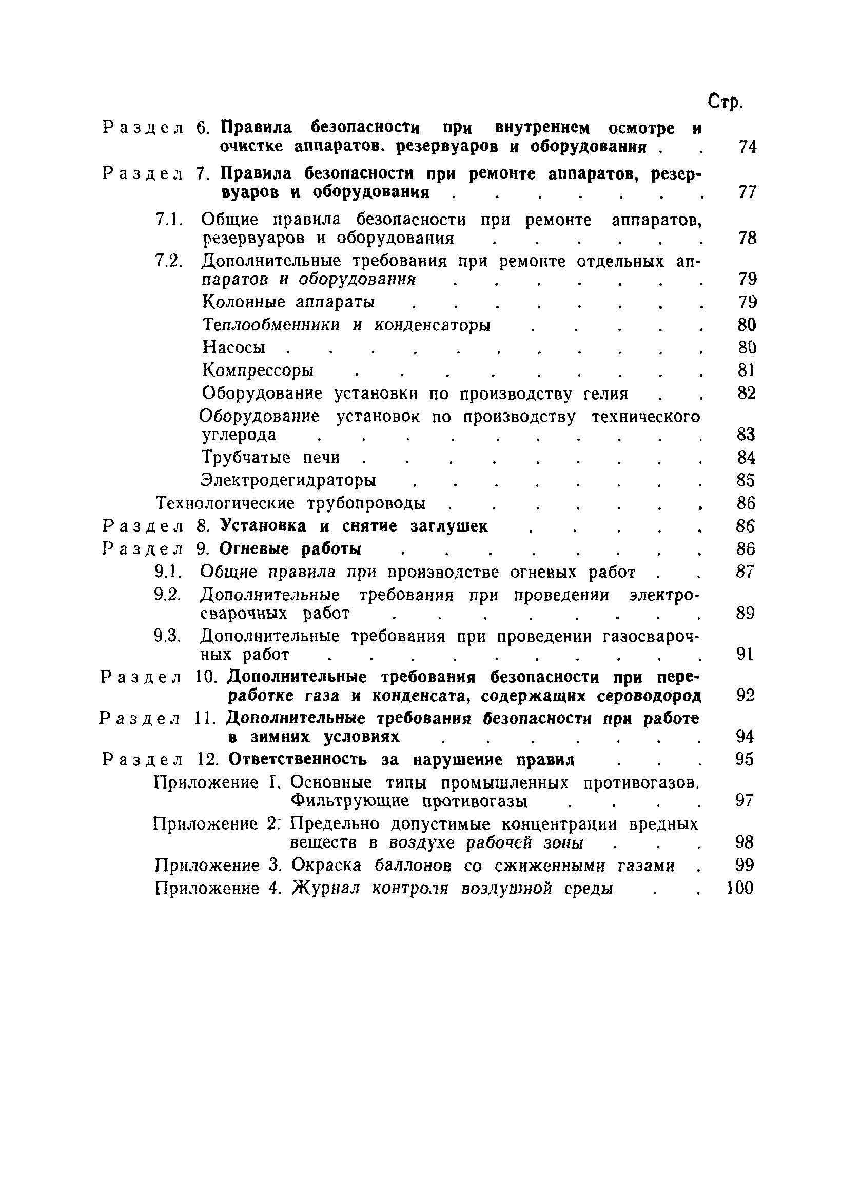 | Оглавление: | Раздел 1. Общие положения Раздел 2. Общие правила безопасности Раздел 3. Меры безопасности при работе с вредными веществами Раздел 4. Правила безопасности при эксплуатации технологических установок Раздел 5. Правила безопасности при эксплуатации вспомогательных устройств и сооружений Раздел 6. Правила безопасности при внутреннем осмотре и очистке аппаратов, резервуаров и оборудования Раздел 7. Правила безопасности при ремонте аппаратов, резервуаров и оборудования Раздел 8. Установка и снятие заглушек Раздел 9. Огневые работы Раздел 10. Дополнительные требования безопасности при переработке газа и конденсата, содержащих сероводород Раздел 11. Дополнительные требования безопасности при работе в зимних условиях Раздел 12. Ответственность за нарушение правил Приложения |