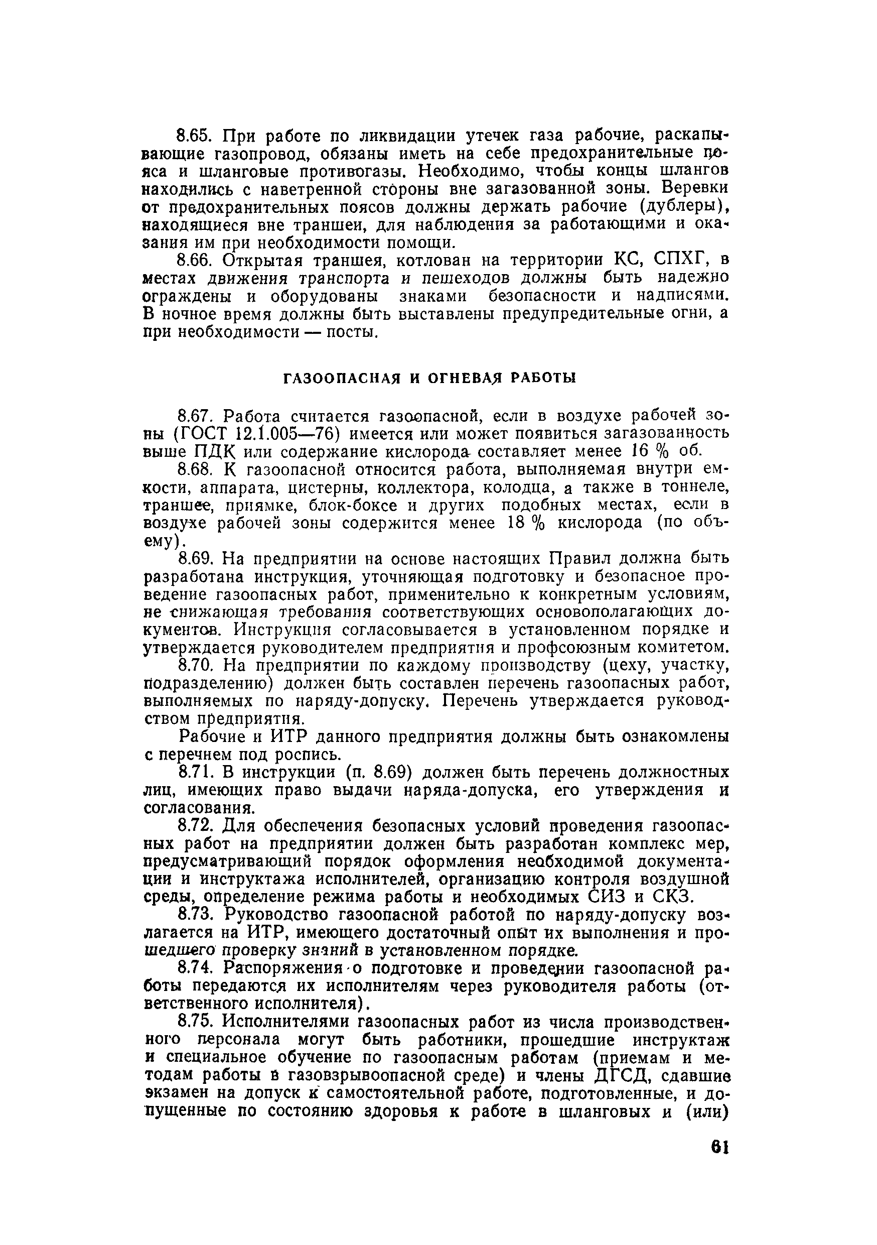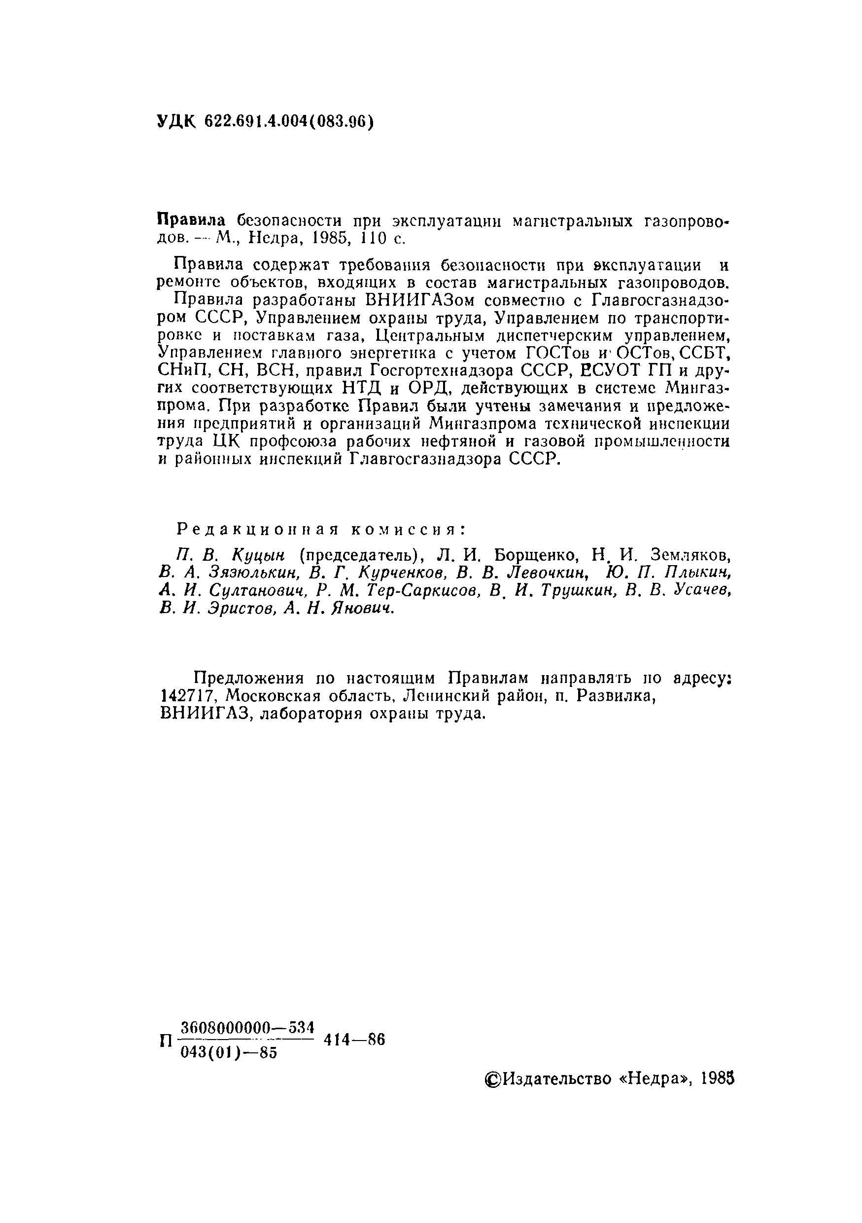 | Область применения: | Требования Правил обязательны для предприятий и организаций, а также их подразделений Мингазпрома, деятельность которых связана с магистральной транспортировкой и подземным хранением природного газа, а также научно-исследовательских, проектно-конструкторских и других организаций, выполняющих работы для магистральных газопроводов. |