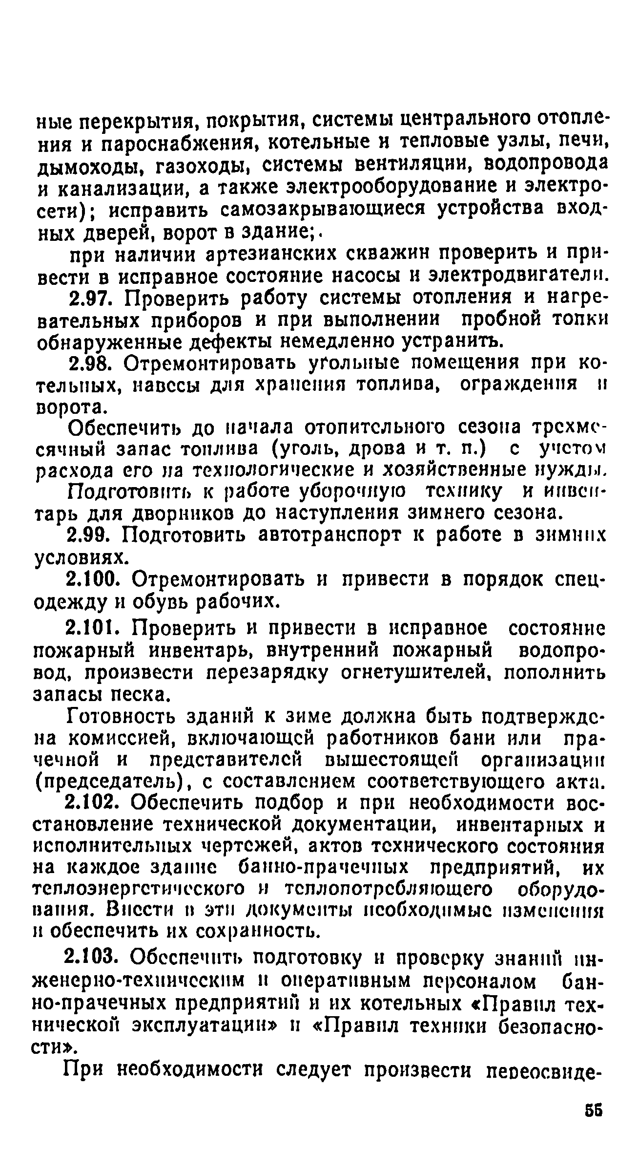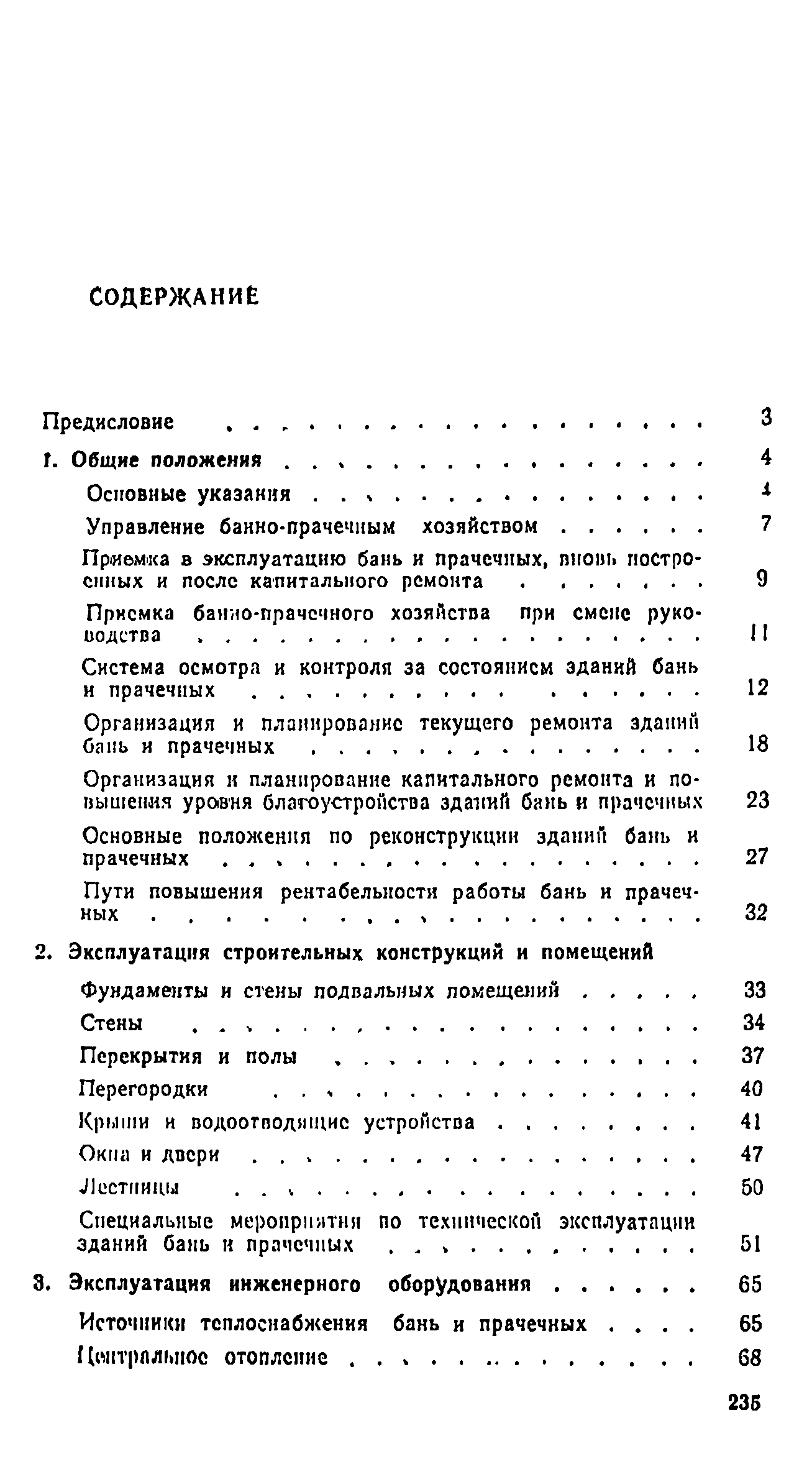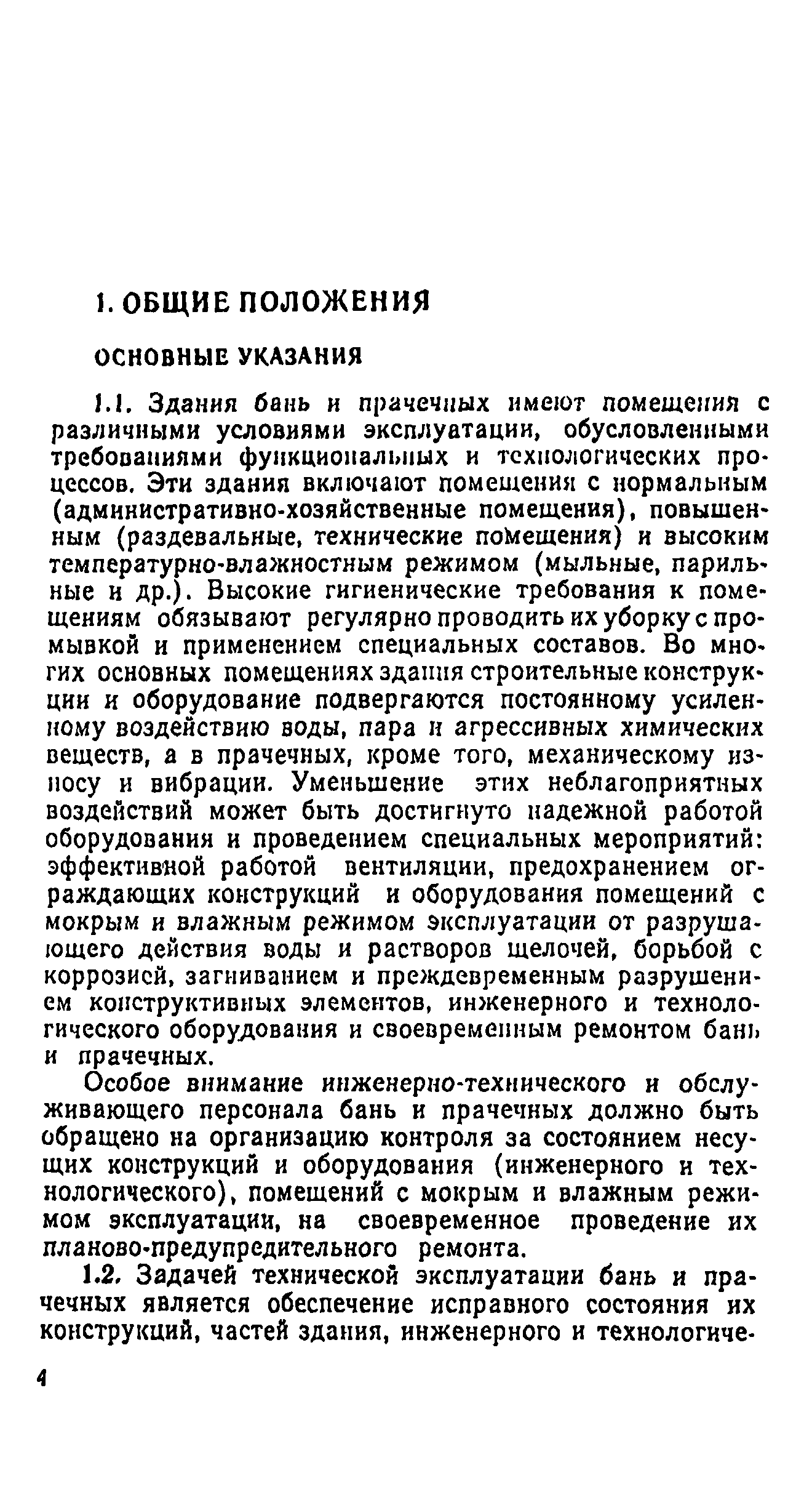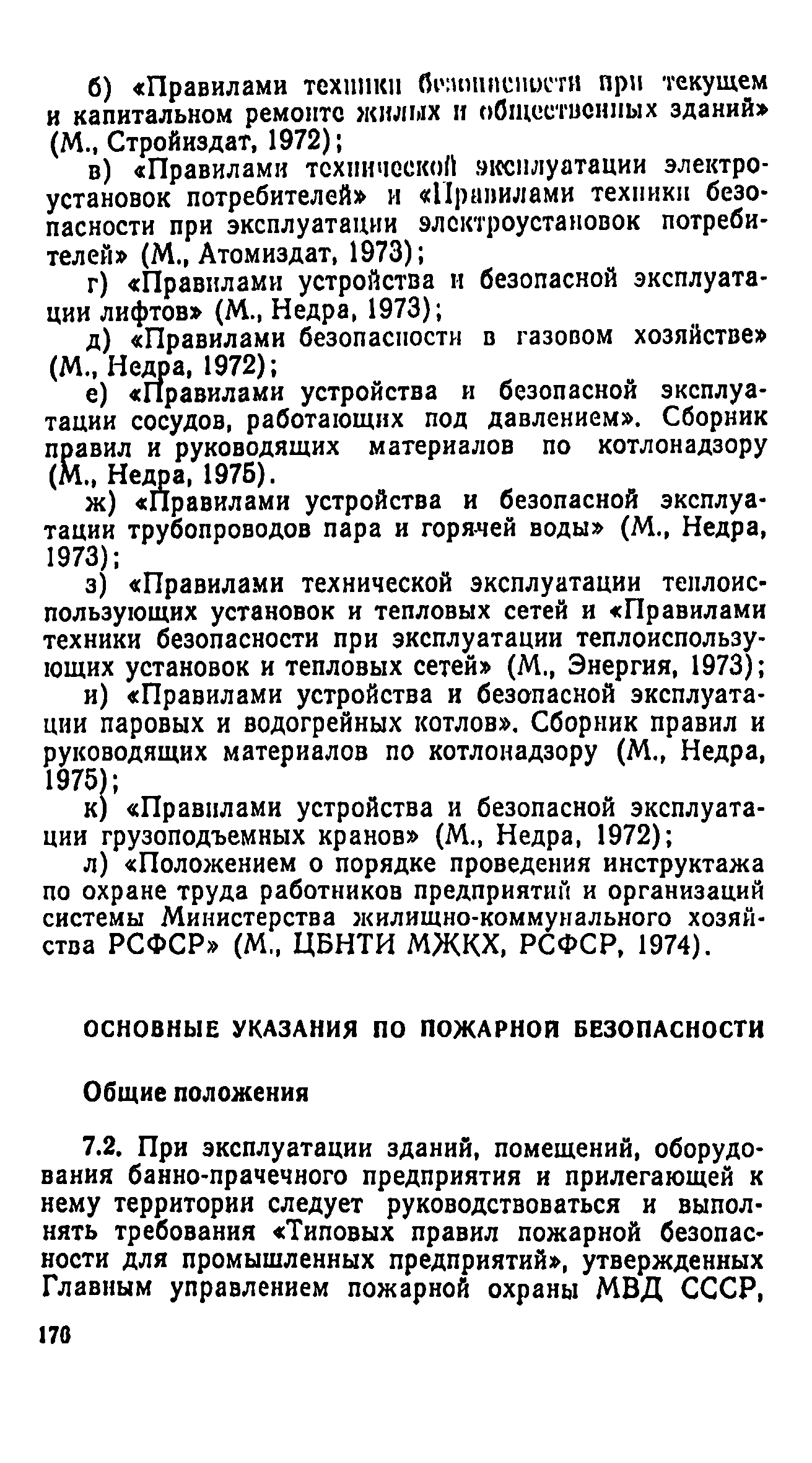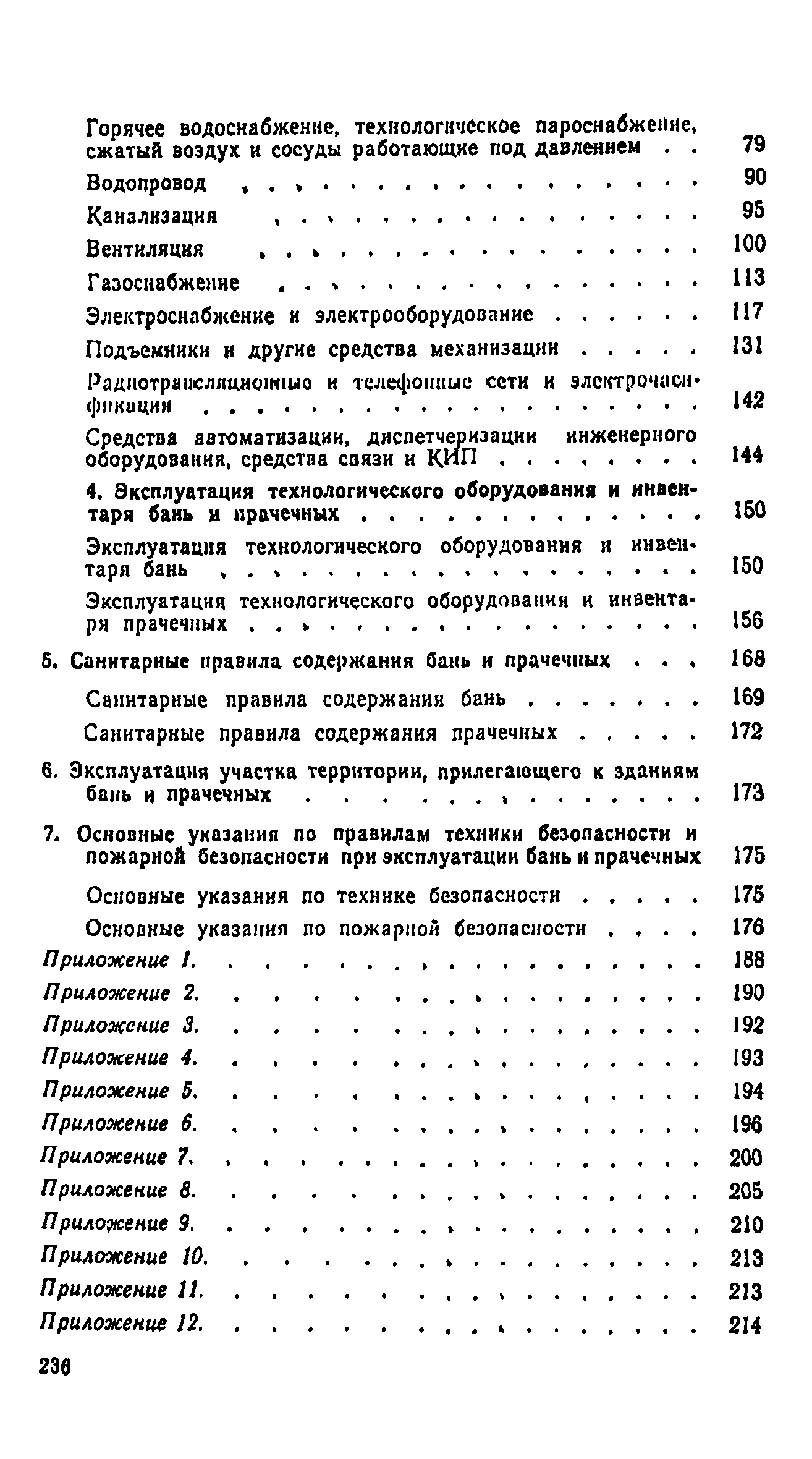 | Оглавление: | Предисловие 1. Общие положения Основные указания Управление банно-прачечным хозяйством Приемка в эксплуатацию бань и прачечных, вновь построенных и после капитального ремонта Приемка банно-прачечного хозяйства при смене руководства Система осмотра и контроля за состоянием зданий бань и прачечных Организация и планирование текущего ремонта зданий бань и прачечных Организация и планирование капитального ремонта и повышения уровня благоустройства зданий бань и прачечных Основные положения по реконструкции зданий бань и прачечных Пути повышения рентабельности бань и прачечных 2. Эксплуатация строительных конструкций и помещений Фундаменты и стены подвальных помещений Стены Перекрытия и полы Перегородки Крыши и водоотводящие устройства Окна и двери Лестницы Специальные мероприятия по технической эксплуатации зданий бань и прачечных 3. Эксплуатация инженерного оборудования Источники теплоснабжения бань и прачечных Центральное отопление Горячее водоснабжение, технологическое пароснабжение, сжатый воздух и сосуды работающие под давлением Водопровод Канализация Вентиляция Газоснабжение Электроснабжение и электрооборудование Подъемники и другие средства механизации Радиотрансляционные и телефонные сети и электрочасификация Средства автоматизации, диспетчеризации инженерного оборудования, средства связи и КИП 4. Эксплуатация технологического оборудования и инвентаря бань и прачечных Эксплуатация технологического оборудования и инвентаря бань Эксплуатация технологического оборудования и инвентаря прачечных 5. Санитарные правила содержания бань и прачечных Санитарные правила содержания бань Санитарные правила содержания прачечных 6. Эксплуатация участка территории, прилегающего к зданиям бань и прачечных 7. Основные указания по правилам техники безопасности и пожарной безопасности при эксплуатации бант и прачечных Основные указания по технике безопасности Основные указания по пожарной безопасности Приложение 1 Приложение 2 Приложение 3 Приложение 4 Приложение 5 Приложение 6 Приложение 7 Приложение 8 Приложение 9 Приложение 10 Приложение 11 Приложение 12 Приложение 13 Приложени 14 Приложение 15 |