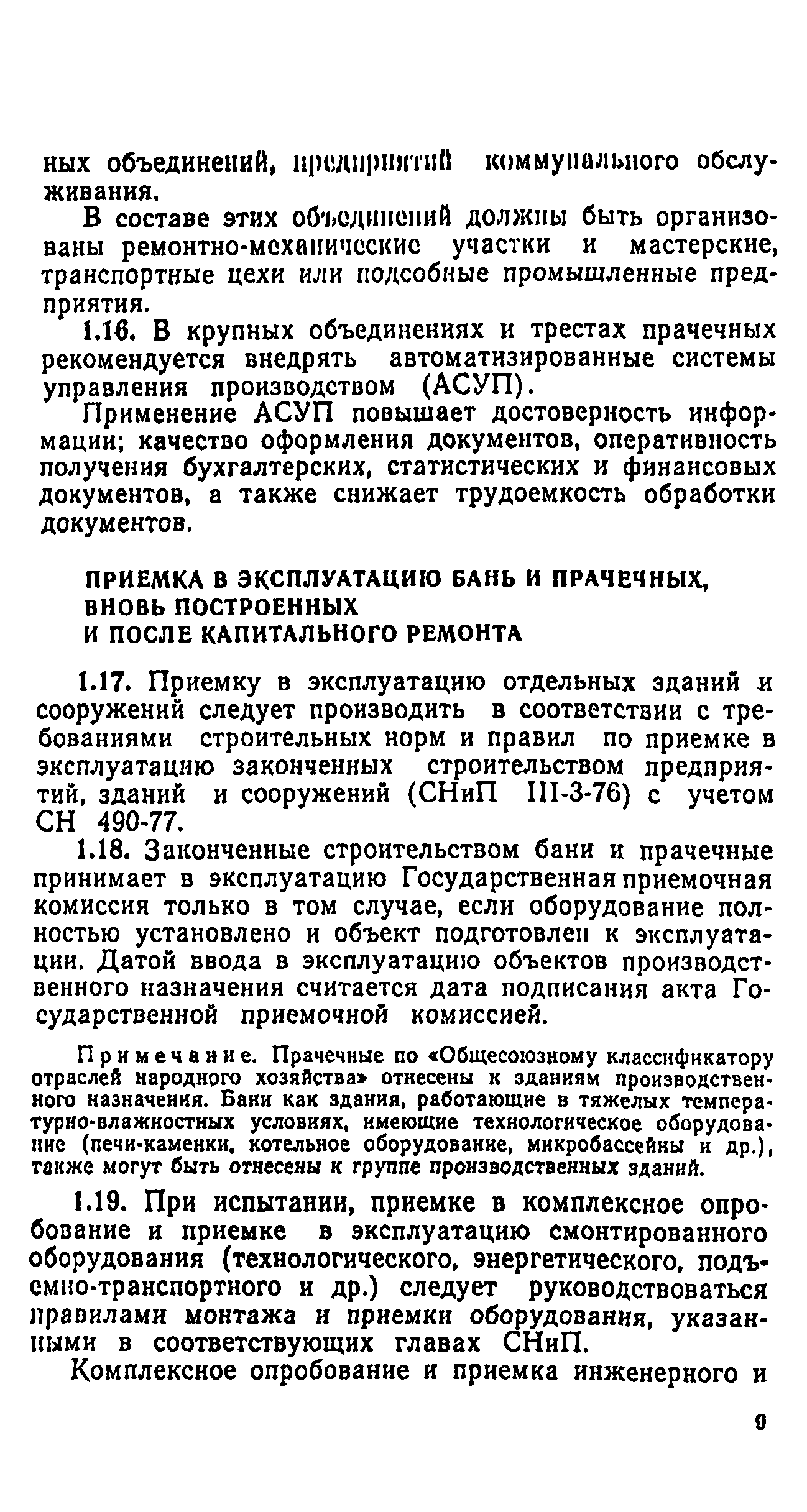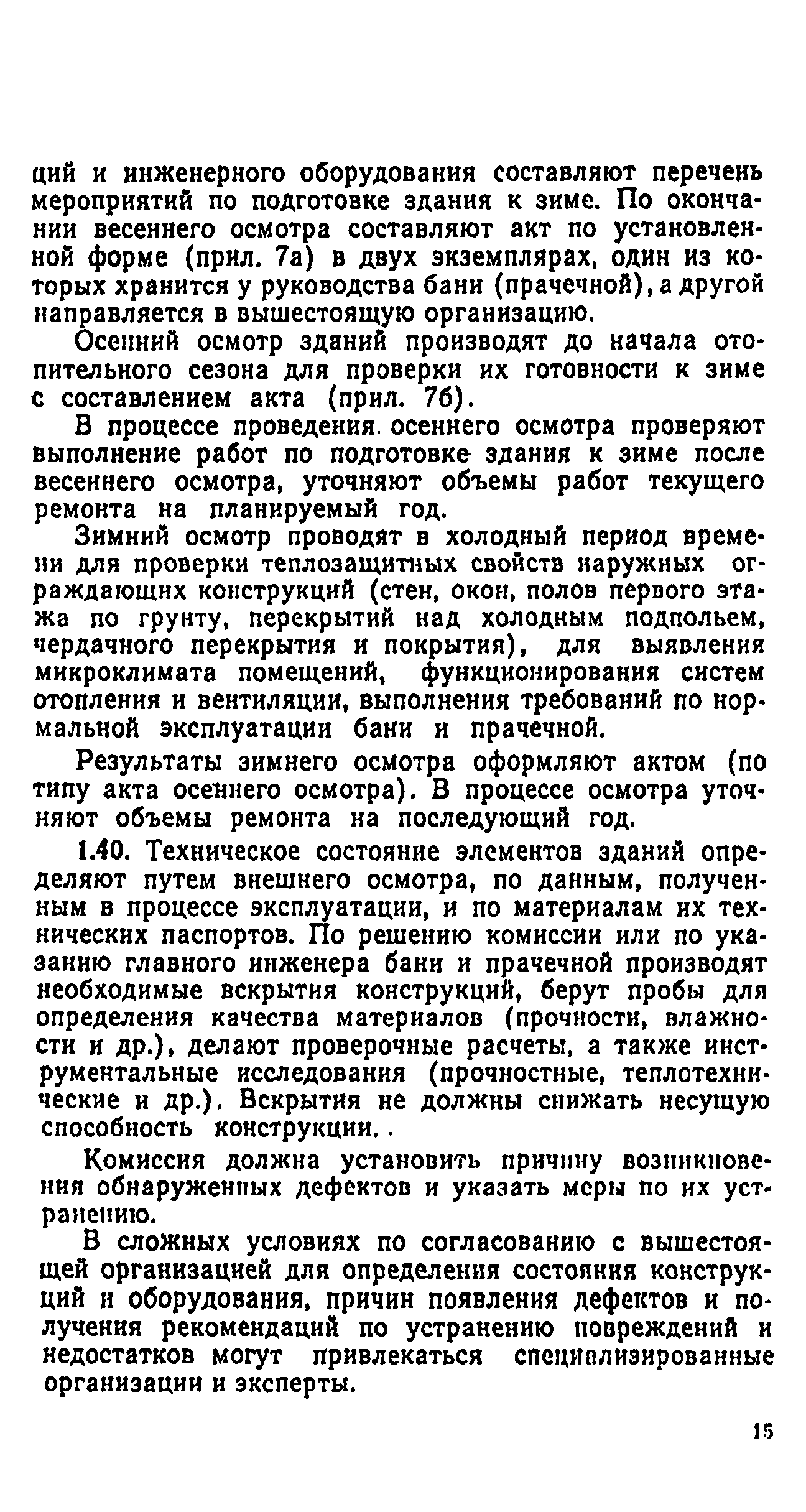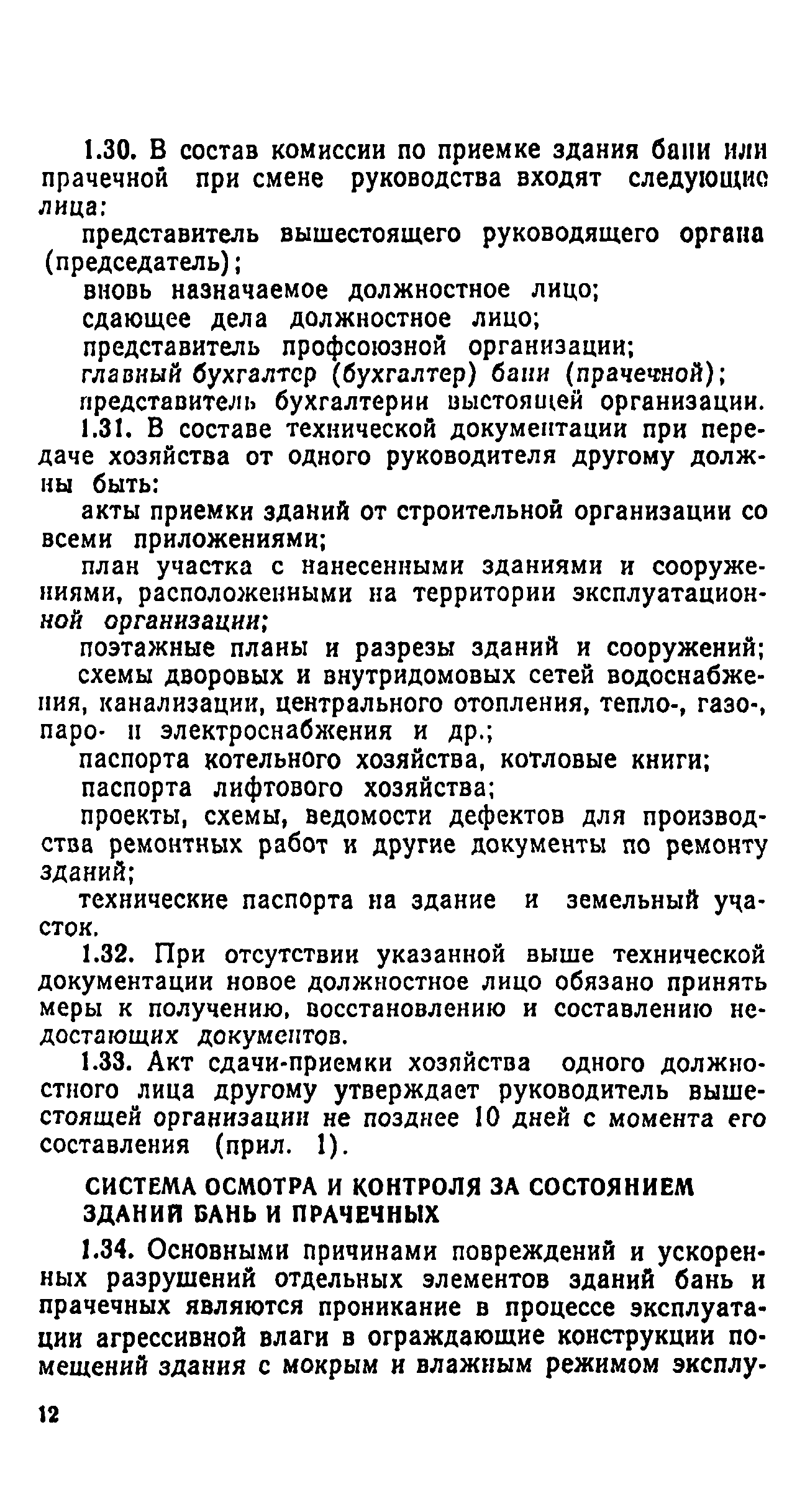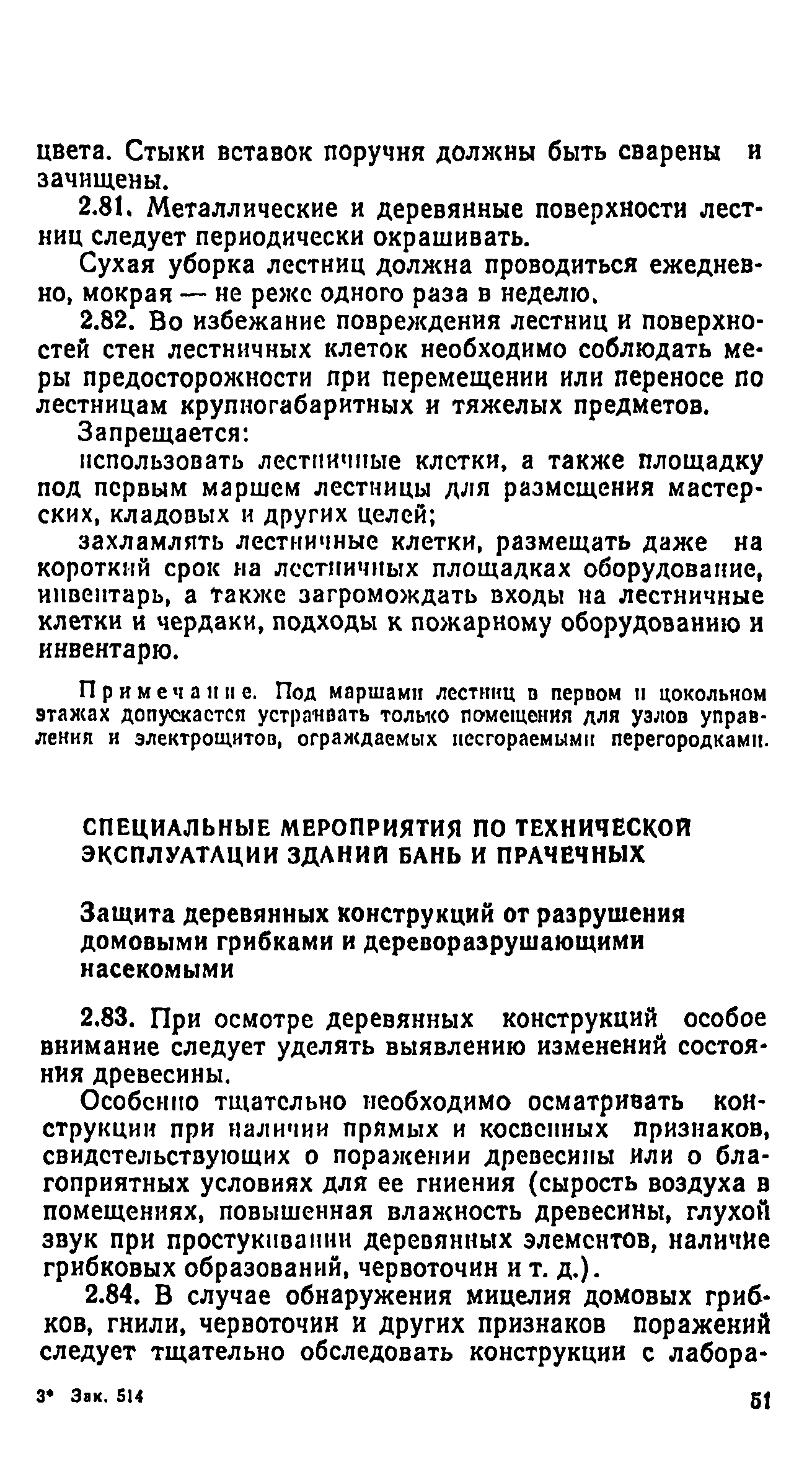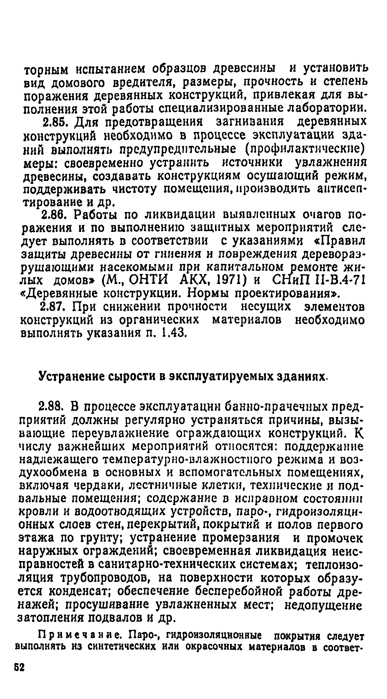 | Оглавление: | Предисловие 1. Общие положения Основные указания Управление банно-прачечным хозяйством Приемка в эксплуатацию бань и прачечных, вновь построенных и после капитального ремонта Приемка банно-прачечного хозяйства при смене руководства Система осмотра и контроля за состоянием зданий бань и прачечных Организация и планирование текущего ремонта зданий бань и прачечных Организация и планирование капитального ремонта и повышения уровня благоустройства зданий бань и прачечных Основные положения по реконструкции зданий бань и прачечных Пути повышения рентабельности бань и прачечных 2. Эксплуатация строительных конструкций и помещений Фундаменты и стены подвальных помещений Стены Перекрытия и полы Перегородки Крыши и водоотводящие устройства Окна и двери Лестницы Специальные мероприятия по технической эксплуатации зданий бань и прачечных 3. Эксплуатация инженерного оборудования Источники теплоснабжения бань и прачечных Центральное отопление Горячее водоснабжение, технологическое пароснабжение, сжатый воздух и сосуды работающие под давлением Водопровод Канализация Вентиляция Газоснабжение Электроснабжение и электрооборудование Подъемники и другие средства механизации Радиотрансляционные и телефонные сети и электрочасификация Средства автоматизации, диспетчеризации инженерного оборудования, средства связи и КИП 4. Эксплуатация технологического оборудования и инвентаря бань и прачечных Эксплуатация технологического оборудования и инвентаря бань Эксплуатация технологического оборудования и инвентаря прачечных 5. Санитарные правила содержания бань и прачечных Санитарные правила содержания бань Санитарные правила содержания прачечных 6. Эксплуатация участка территории, прилегающего к зданиям бань и прачечных 7. Основные указания по правилам техники безопасности и пожарной безопасности при эксплуатации бант и прачечных Основные указания по технике безопасности Основные указания по пожарной безопасности Приложение 1 Приложение 2 Приложение 3 Приложение 4 Приложение 5 Приложение 6 Приложение 7 Приложение 8 Приложение 9 Приложение 10 Приложение 11 Приложение 12 Приложение 13 Приложени 14 Приложение 15 |