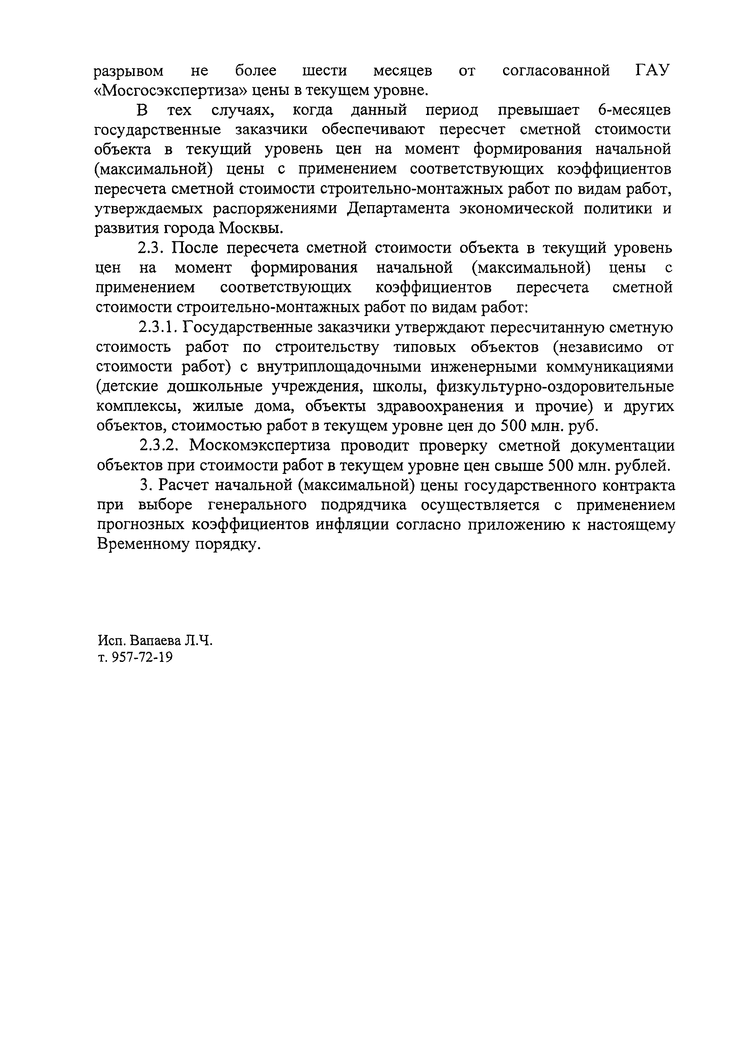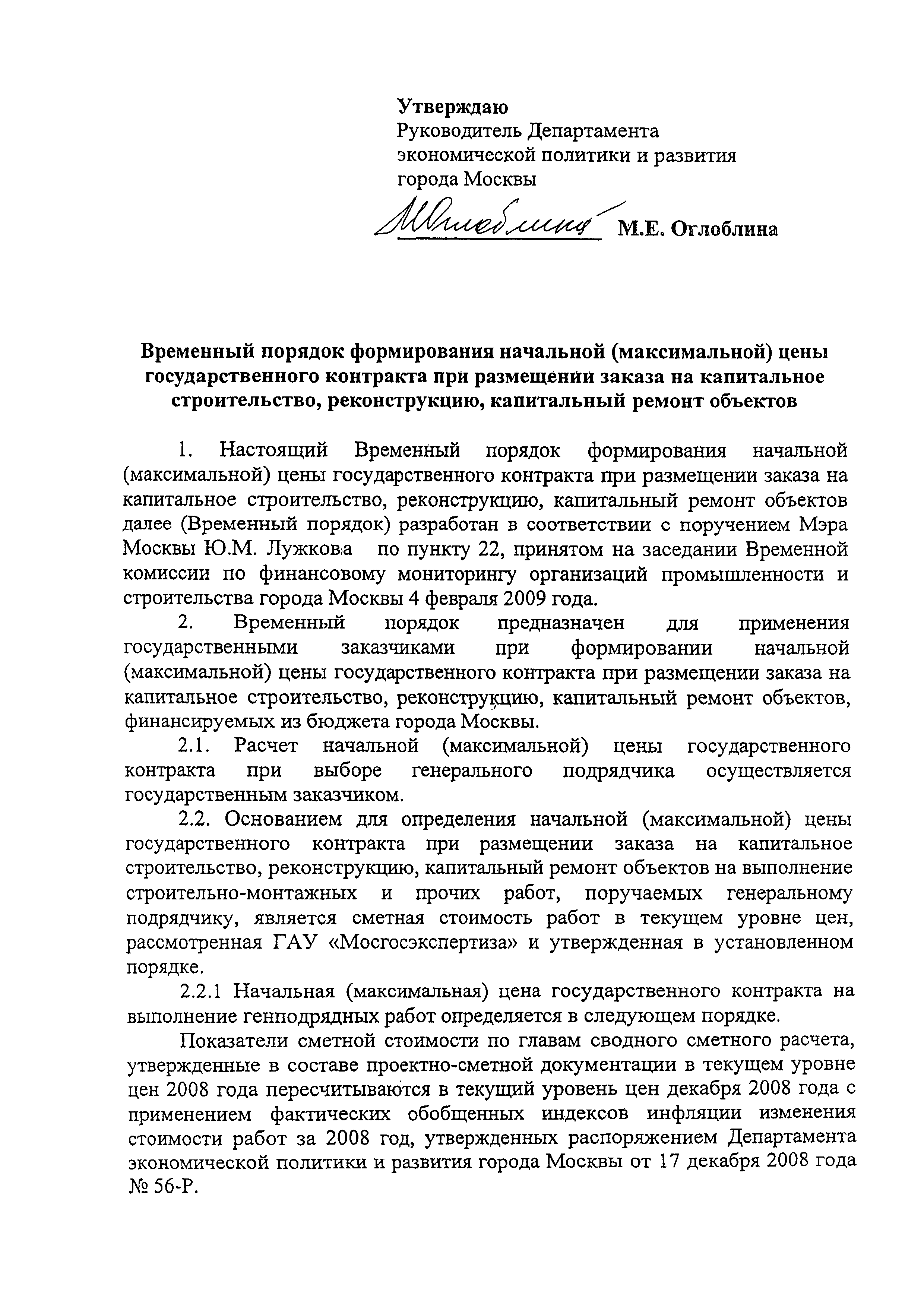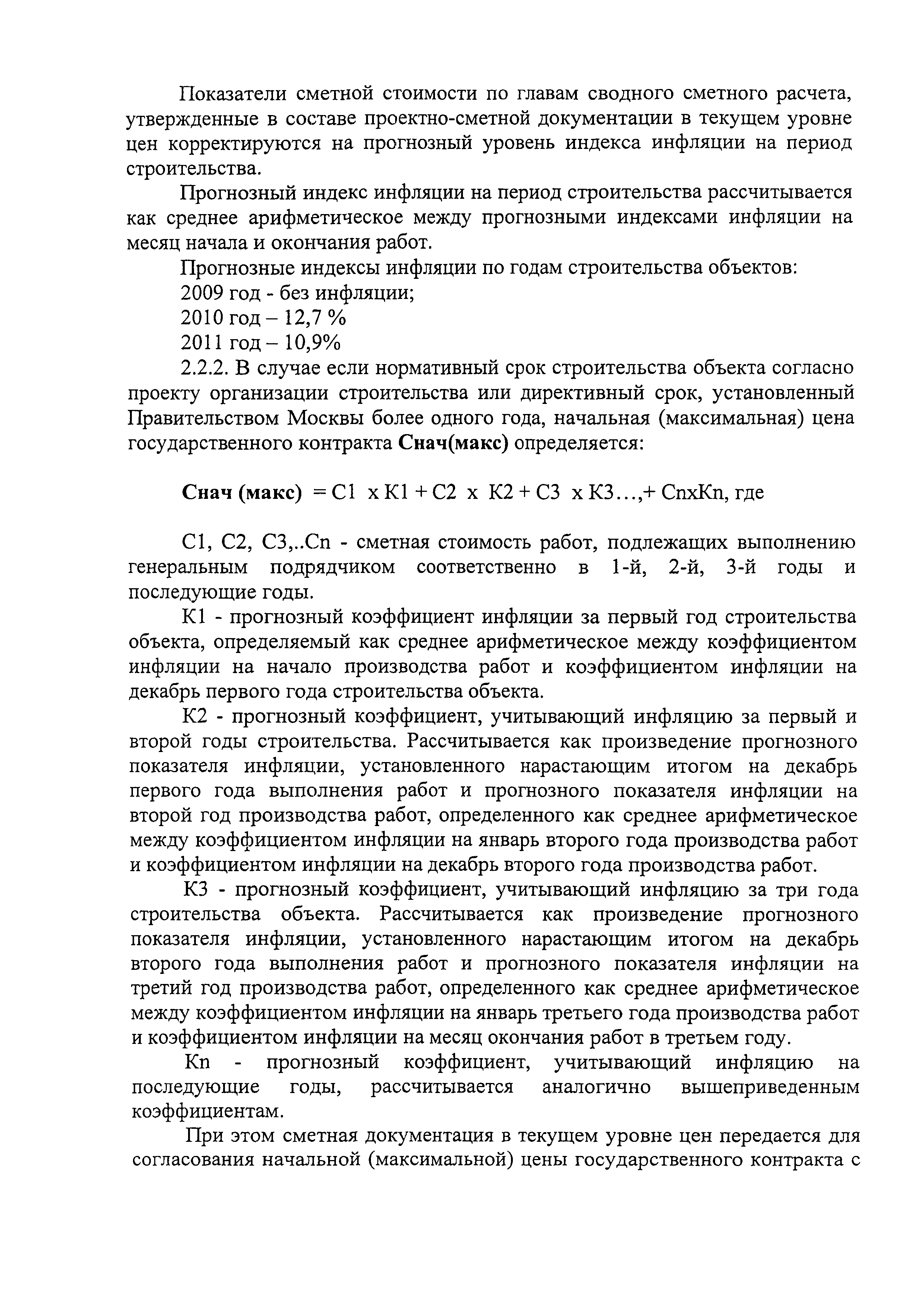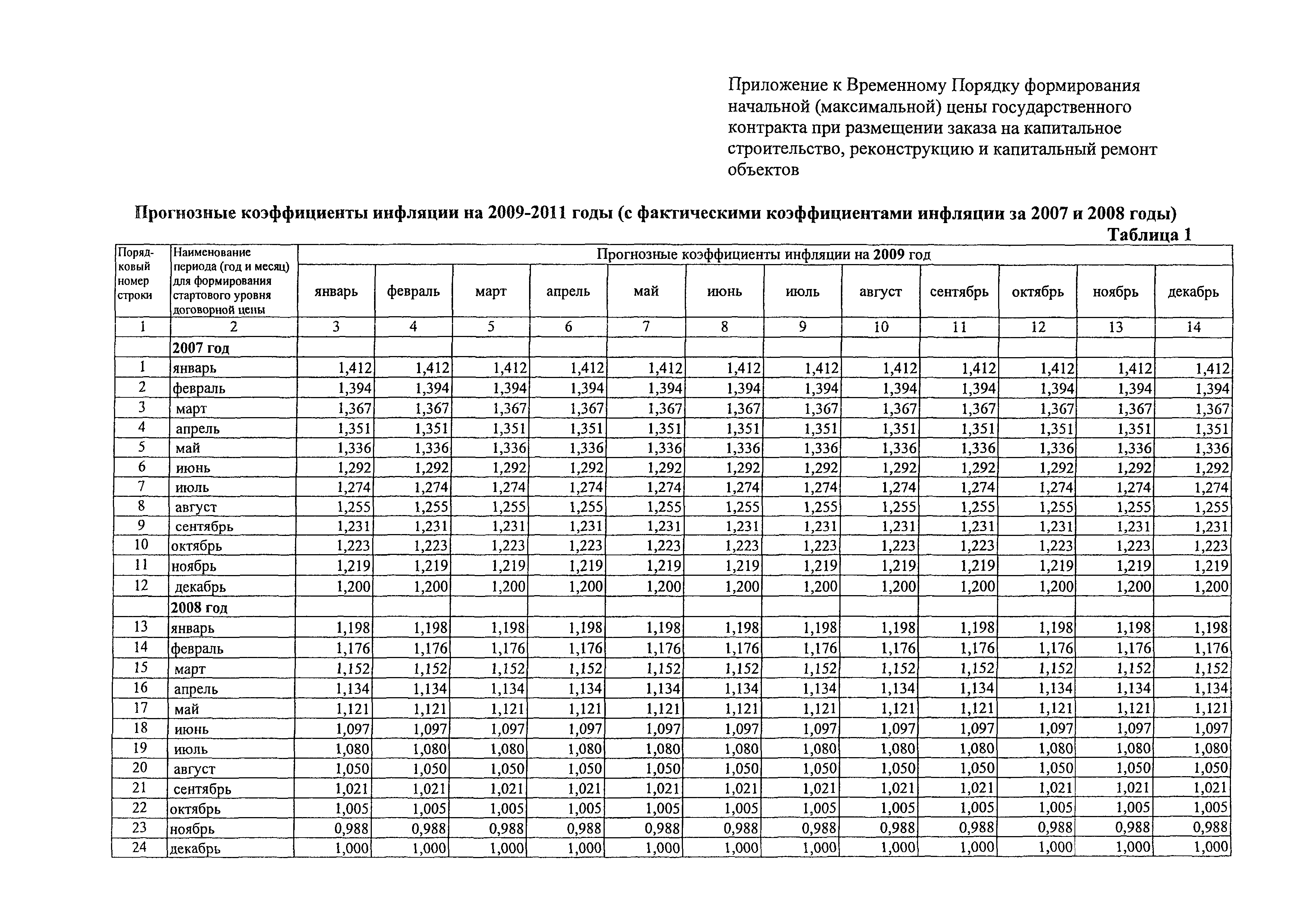 Временный порядок формирования начальной (максимальной) цены государственного контракта при размещении заказа на капитальное строительство, реконструкцию, капитальный ремонт объектов| Статус: | действует | | Название рус.: | Временный порядок формирования начальной (максимальной) цены государственного контракта при размещении заказа на капитальное строительство, реконструкцию, капитальный ремонт объектов | | Дата добавления в базу: | 01.09.2013 | | Дата актуализации: | 01.01.2021 | | Область применения: | Временный порядок предназначен для применения государственными заказчиками при формирования начальной (максимальной) цены государственного контракта при размещении заказа на капитальное строительство, реконструкцию, капитальный ремонт объектов, финансируемых из бюджета города Москвы | | Оглавление: | Приложение Прогнозные коэффициенты инфляции на 2009-2011 годы (с фактическими коэффициентами инфляции за 2007 и 2008 годы) Таблица 1 Прогнозные коэффициенты инфляции на 2009 год Таблица 2 Прогнозные коэффициенты инфляции на 2010 год Таблица 3 Прогнозные коэффициенты инфляции на 2011 год | | Утверждён: | 16.02.2009 Департамент экономической политики и развития города Москвы (City of Moscow Department of Economic Policy and Development ДПР/9-3/3-121)