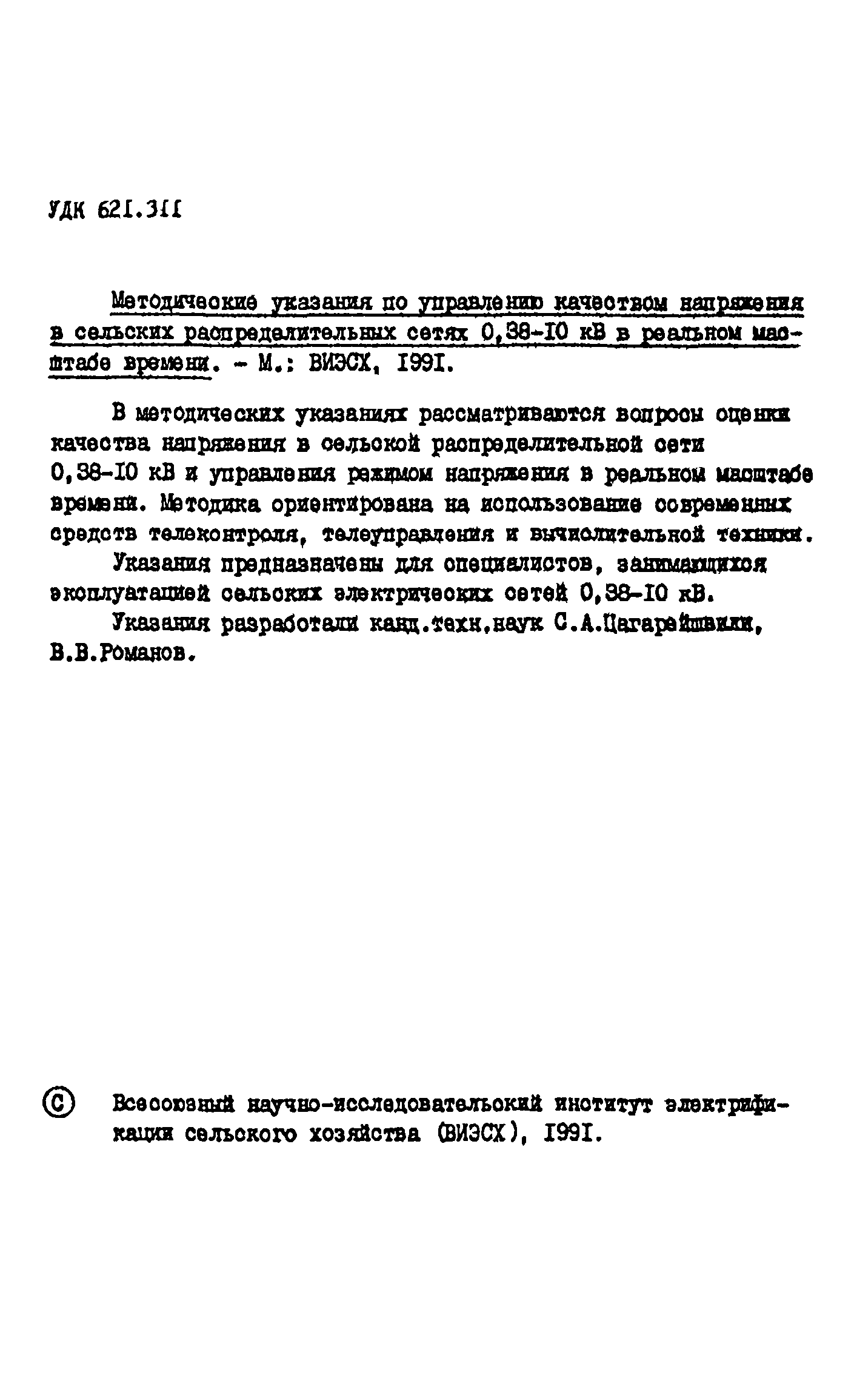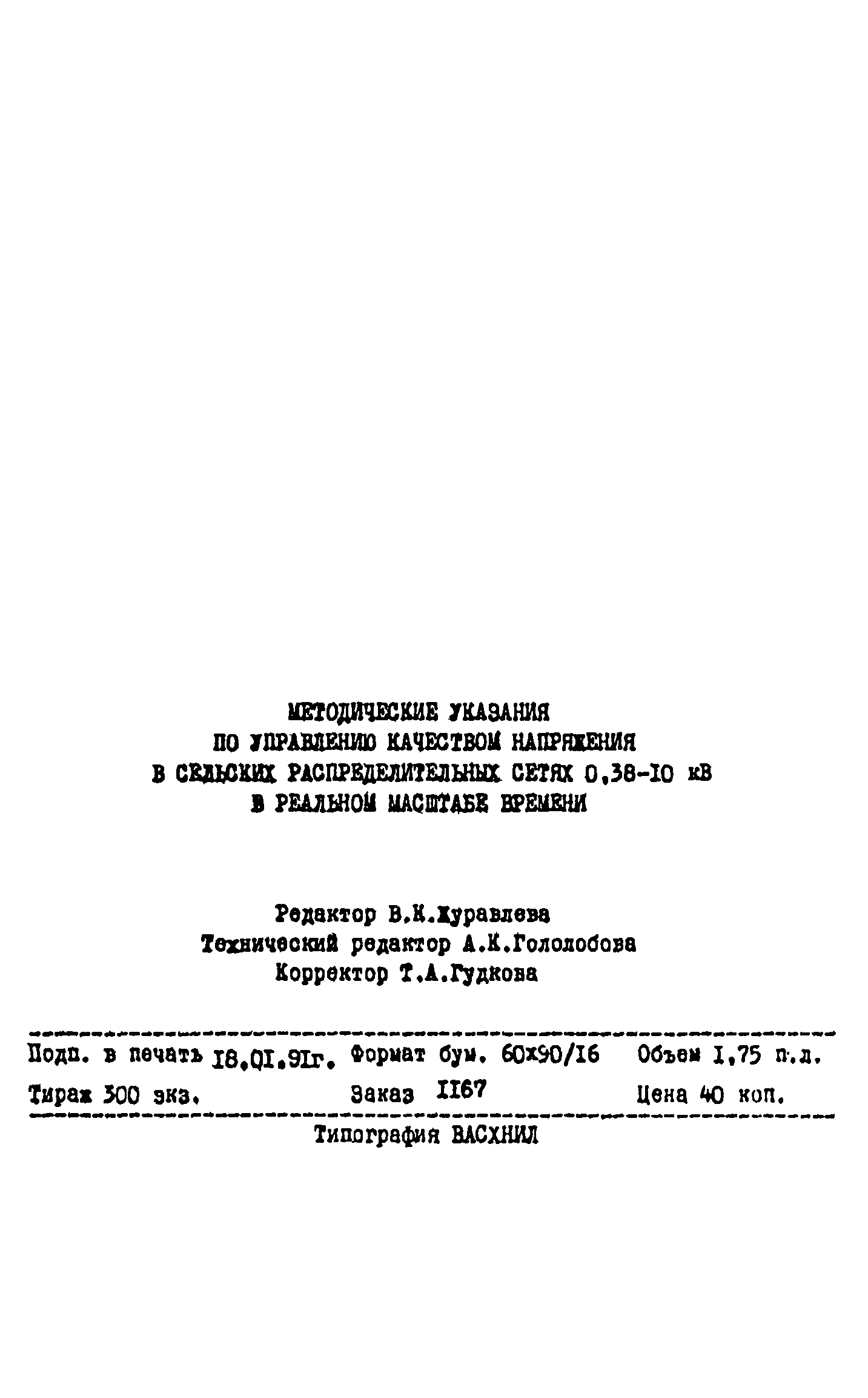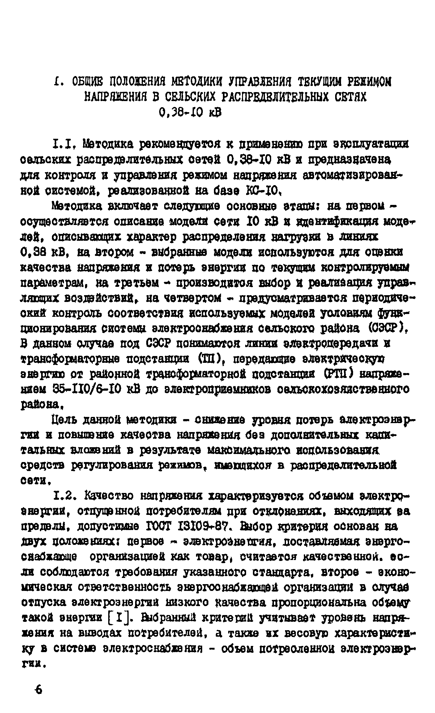 Методические указания по управлению качеством напряжения в сельских распределительных сетях 0,38 - 10 кВ в реальном масштабе времени| Статус: | действует | | Название рус.: | Методические указания по управлению качеством напряжения в сельских распределительных сетях 0,38 - 10 кВ в реальном масштабе времени | | Дата добавления в базу: | 01.09.2013 | | Дата актуализации: | 01.01.2021 | | Область применения: | В методических указаниях рассматриваются вопросы оценки качества напряжения в сельской распределительной сети 0,38 - 10 кВ и управления режимом напряжения в реальном масштабе времени. Методика ориентирована на использование современных средств телеконтроля, телеуправления и вычислительной техники. Указания предназначены для специалистов, занимающихся эксплуатацией сельских электрических сетей 0,38 - 10 кВ. | | Оглавление: | Введение I. Общие положения методики управления текущим режимом напряжения в сельских распределительных сетях 0,38 - 10 кВ 2. Модель объекта управления 3. Идентификация линий электропередачи низкого напряжения 4. Оценка качества текущего режима распределительной сети 5. Алгоритм выбора управляющих воздействий на режим напряжения распределительной сети 6. Выбор регулировочных ответвлений ПБВ трансформаторов ТП 6 - 10/0,4 кВ 7. Корректировка моделей при изменении условий функционирования действующей электрической распределительной сети Список литературы | | Разработан: | ВИЭСХ