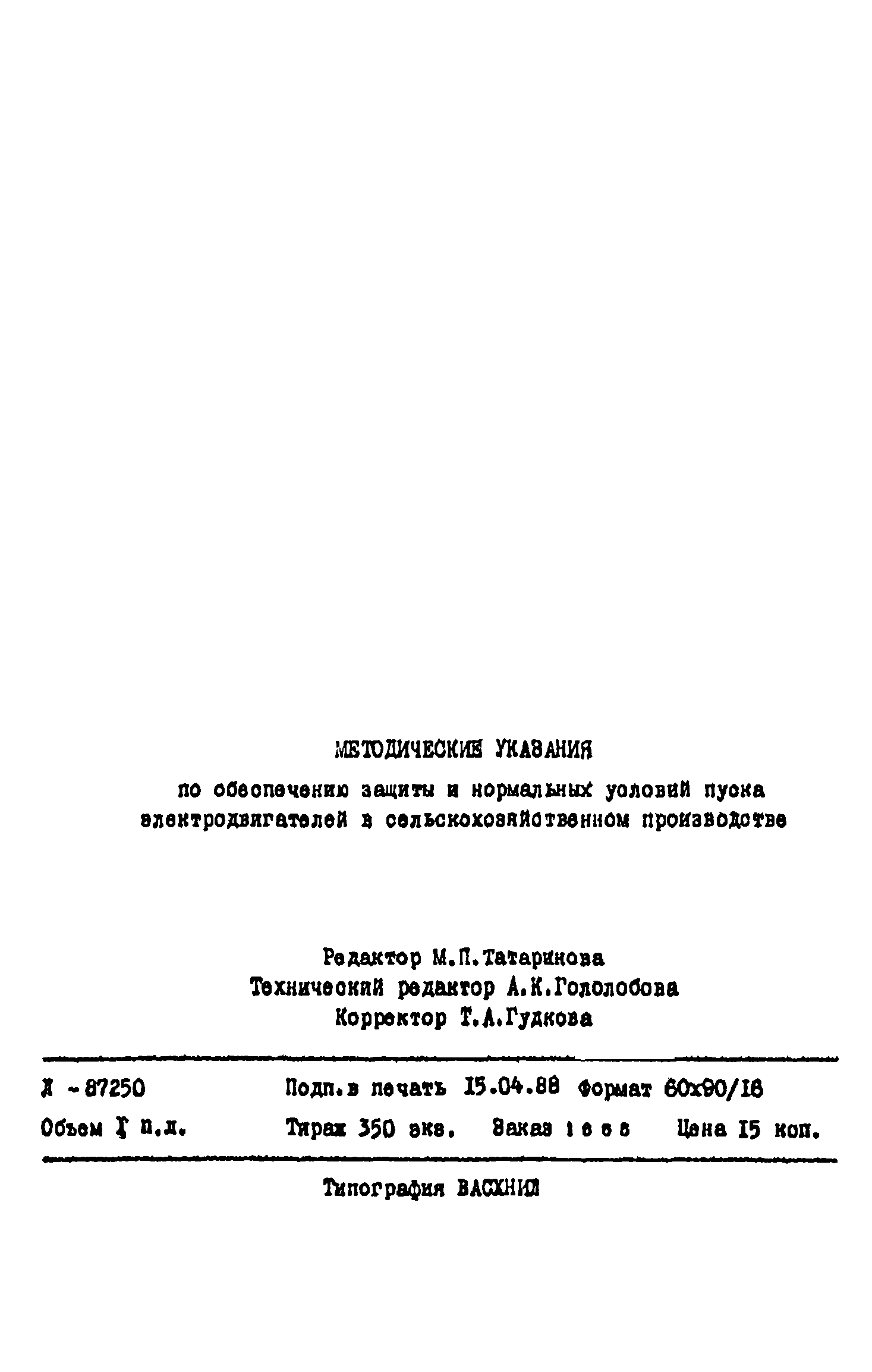 | Название рус.: | Методические указания по обеспечению защиты и нормальных условий пуска электродвигателей в сельскохозяйственном производстве |
