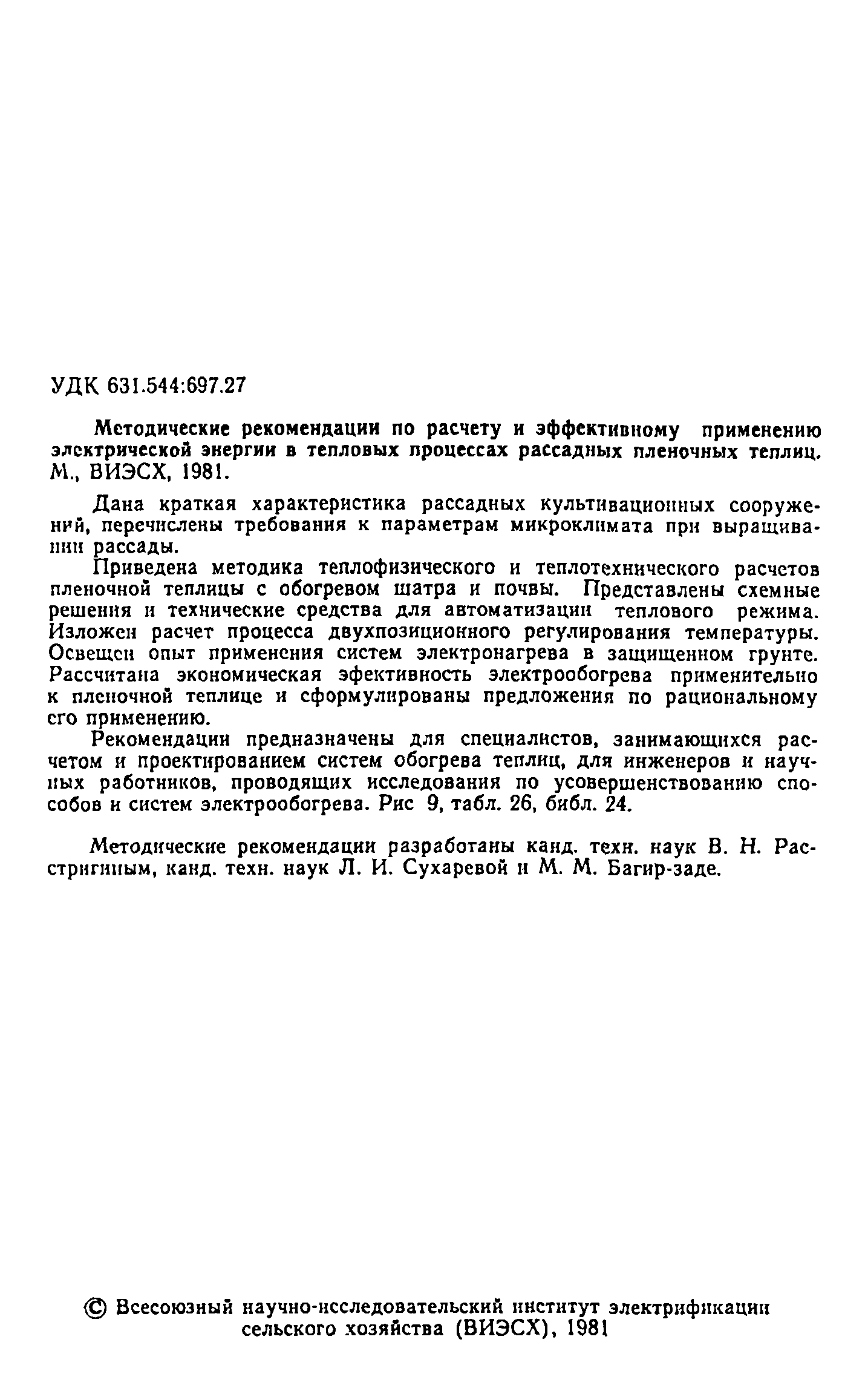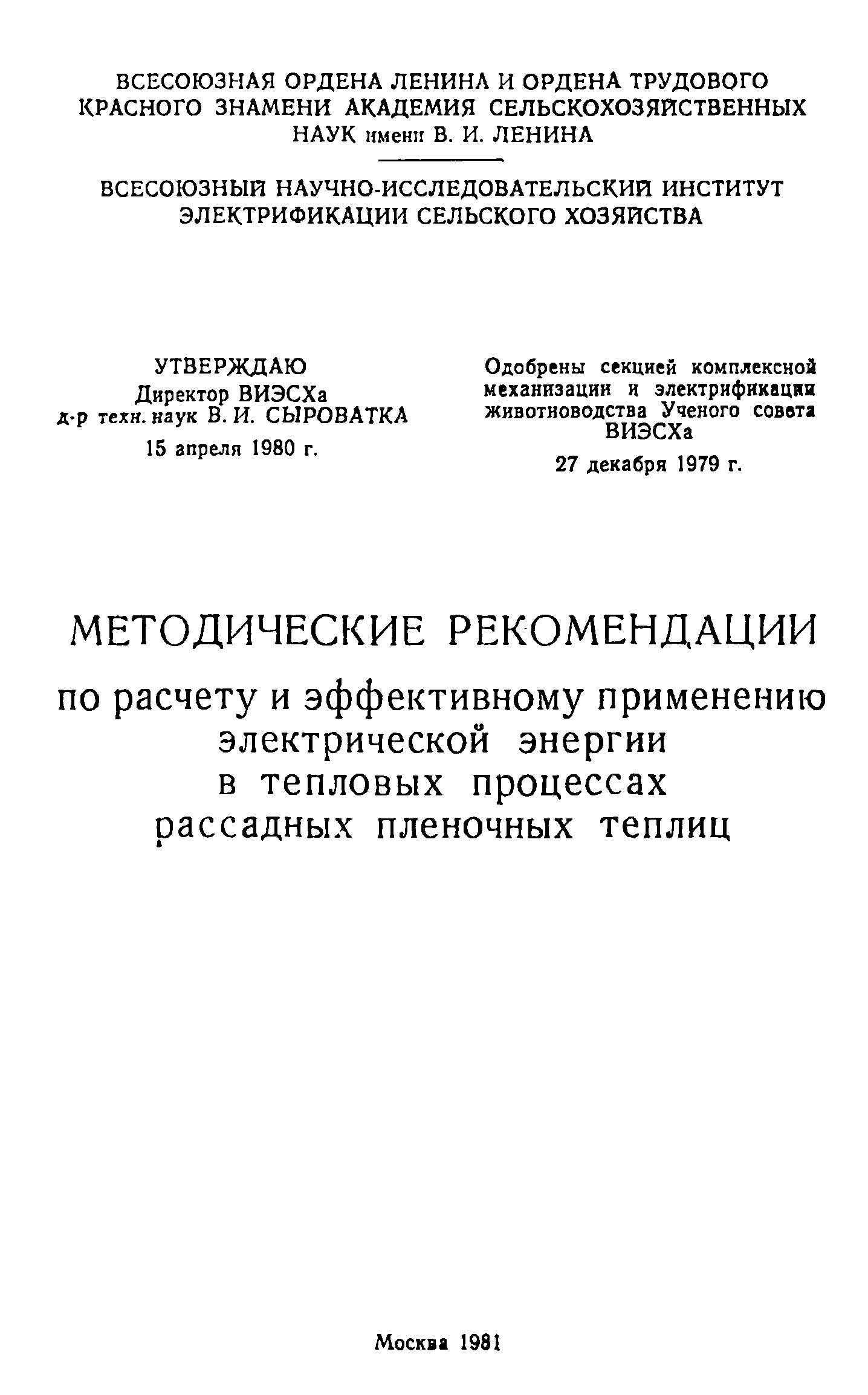 | Название рус.: | Методические рекомендации по расчету и эффективному применению электрической энергии в тепловых процессах рассадных пленочных теплиц |