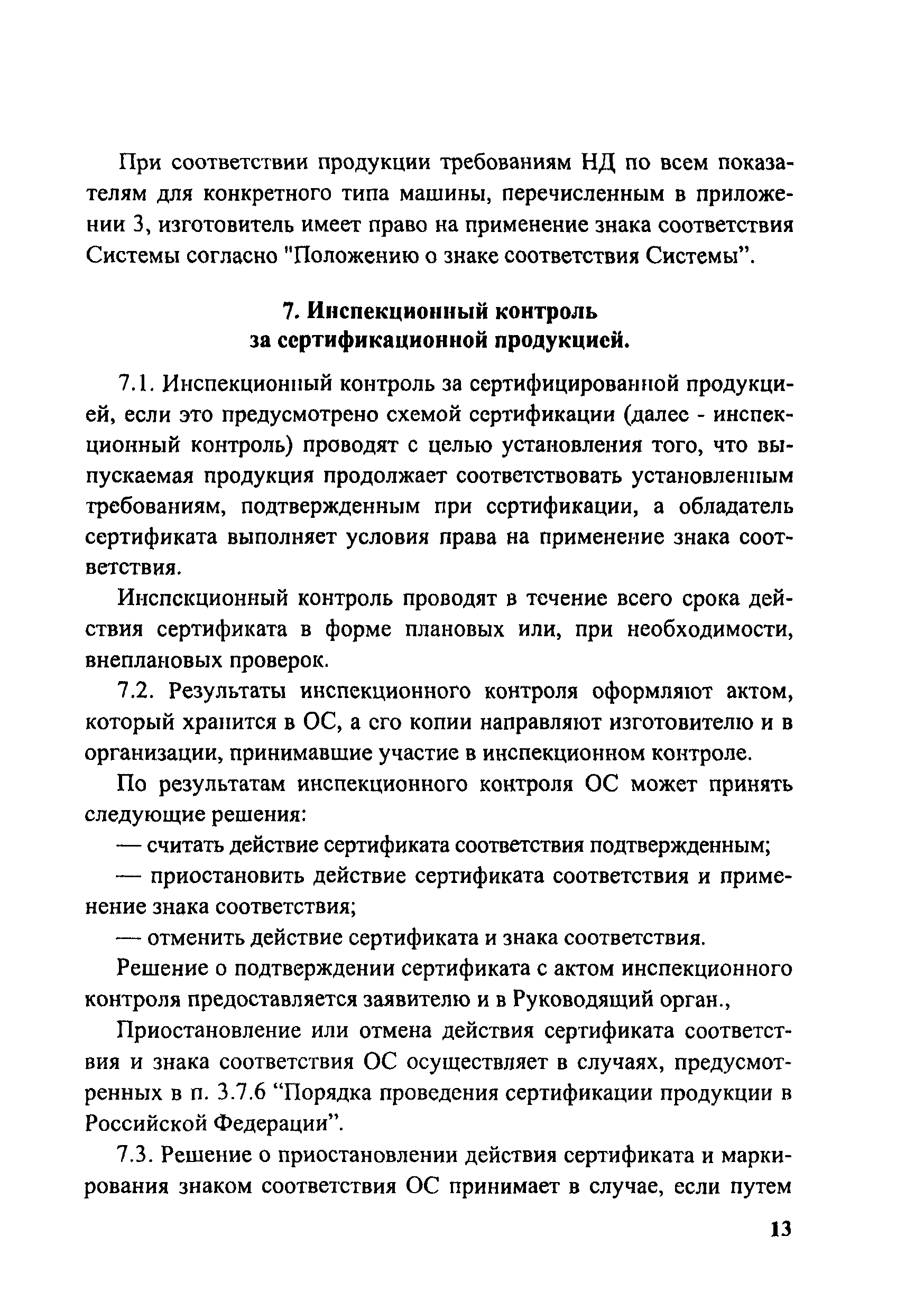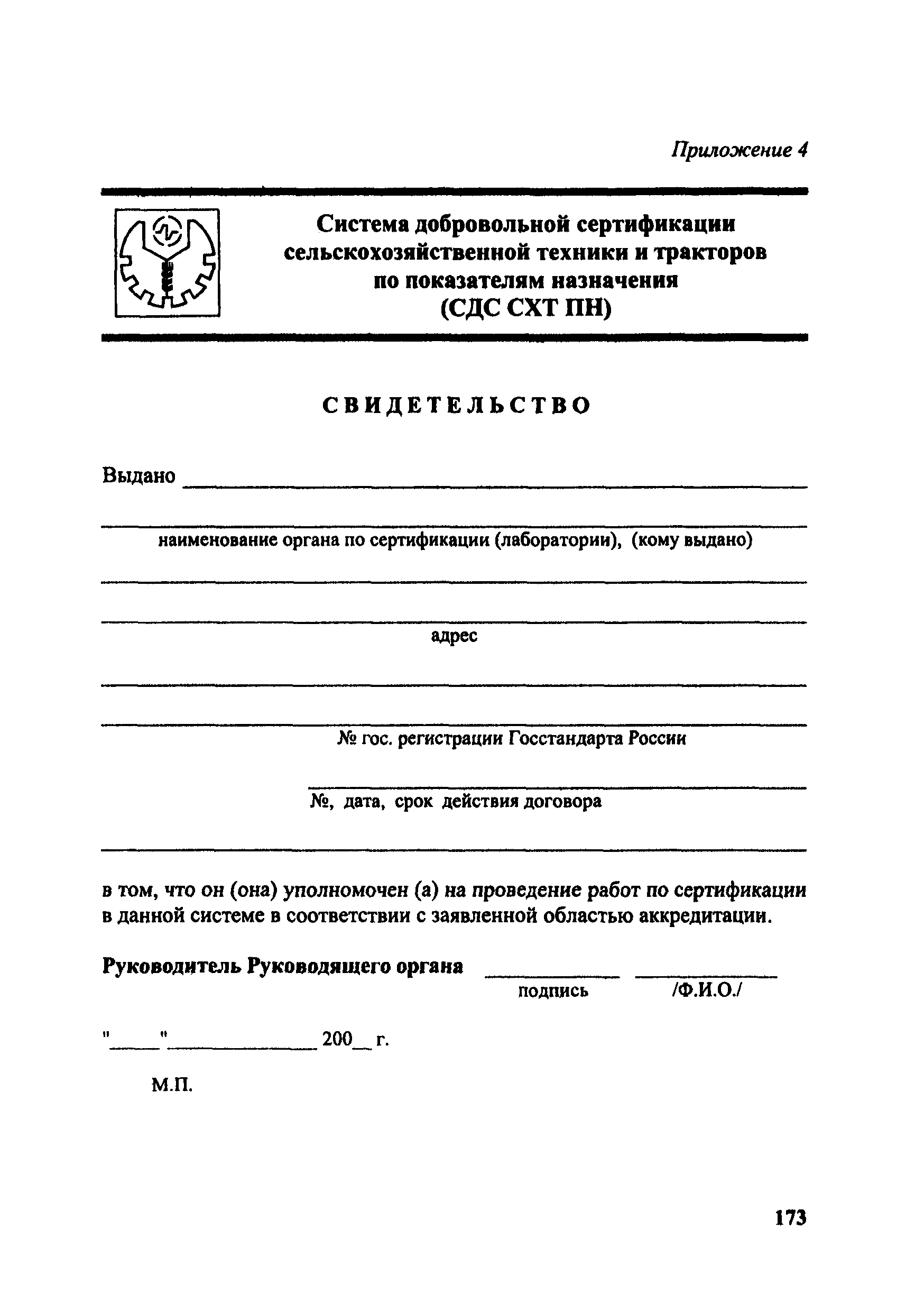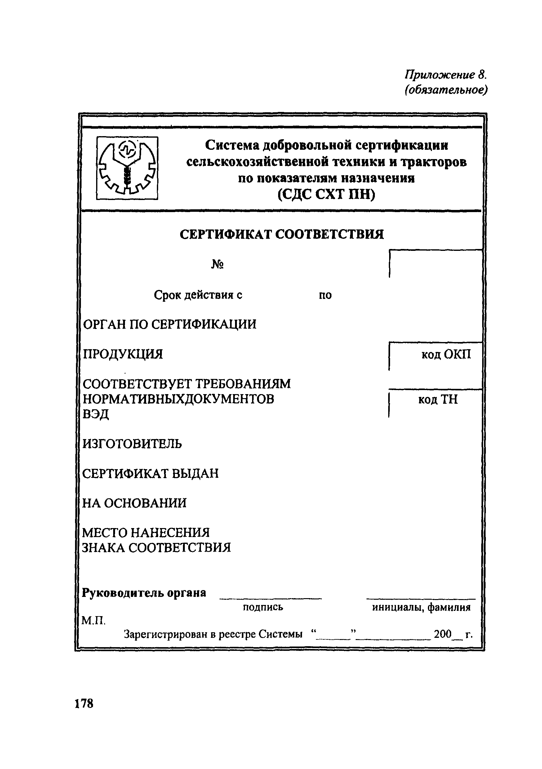 Положение о добровольной сертификации сельскохозяйственной техники и тракторов по показателям назначения (СДС СХТ ПН)| Статус: | действует | | Название рус.: | Положение о добровольной сертификации сельскохозяйственной техники и тракторов по показателям назначения (СДС СХТ ПН) | | Дата добавления в базу: | 01.09.2013 | | Дата актуализации: | 01.01.2021 | | Дата введения: | 01.01.2002 | | Область применения: | Система распространяется на сельскохозяйственные тракторы, машины для растениеводства, животноводства, птицеводства, кормопроизводства, лесного хозяйства, возделывания растений в закрытом грунте, транспортные средства и средства малой механизации сельскохозяйственного назначения. | | Оглавление: | 1. Общие положения 2. Цель сертификации 3. Термины и определения 4. Область распространения Системы 5. Организационная структура, состав участников Системы и их функции 6. Порядок проведения сертификации 7. Инспекционный контроль за сертифицированной продукцией 8. Рассмотрение апелляций 9. Оплата работ по сертификации 10. Взаимодействие СДС СХТ ПН с организациями Приложение 1. Область распространения (объекты сертификации) Системы добровольной сертификации тракторов и сельскохозяйственной техники по показателям назначения Приложение 2. Перечень научно-технической документации (ГОСТы, ОСТы, РТМ, РД, СТП) Приложение 3. Перечень основных показателей сельскохозяйственной техники, определяемых по типам машин при добровольной сертификации Приложение 4. Свидетельство Приложение 5. Заявка на проведение сертификации продукции в Системе добровольной сертификации Приложение 6. Решение по заявке на проведение добровольной сертификации Приложение 7. Решение о невыдаче сертификата соответствия Приложение 8. Сертификат соответствия Приложение 9. Перечень организаций, взаимодействующих с СДС СХТ ПН Министерства сельского хозяйства Российской Федерации | | Разработан: | Департамент технической политики Минсельхоза России ГИЦ Минсельхоза России