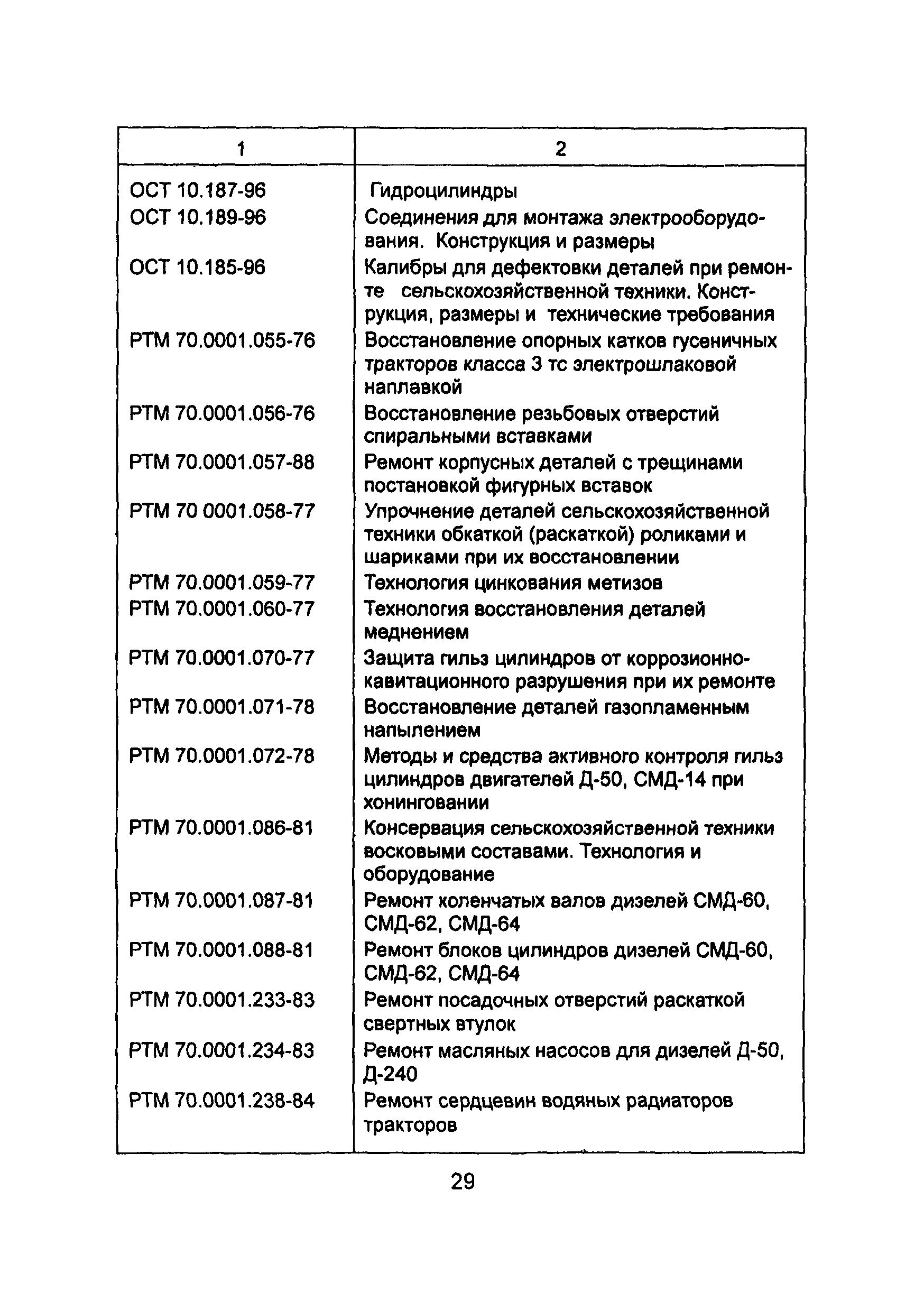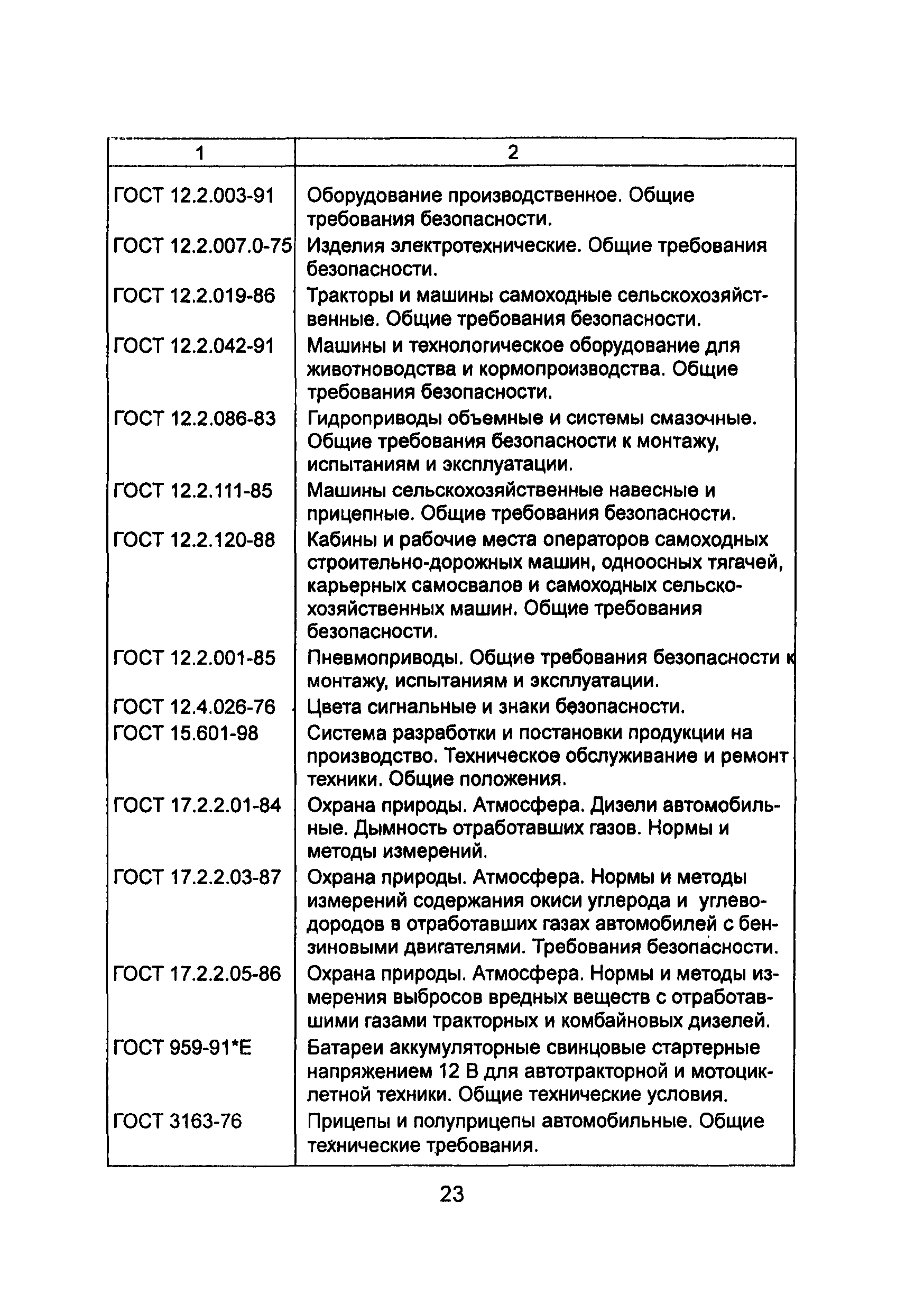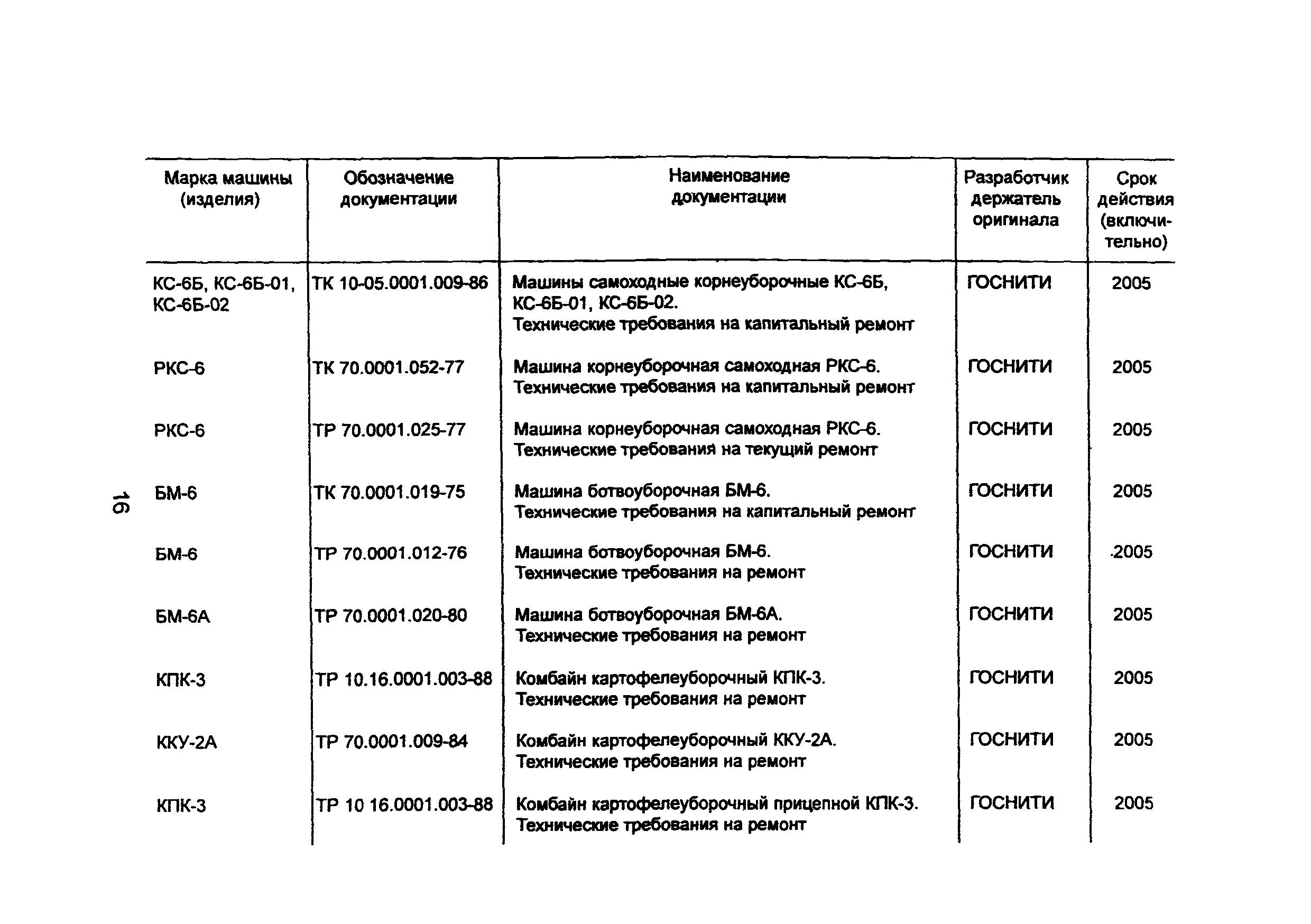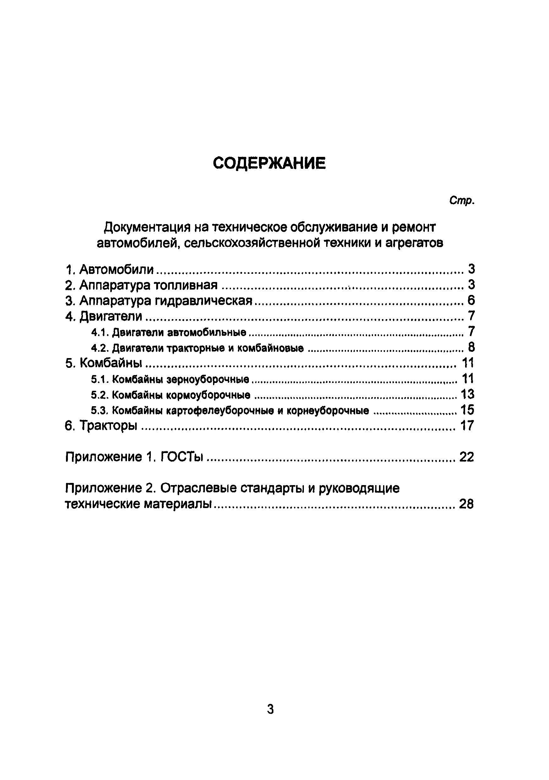 Указатель обязательной нормативно-технической документации, действующей в системе технического сервиса агропромышленного комплекса| Статус: | действует | | Название рус.: | Указатель обязательной нормативно-технической документации, действующей в системе технического сервиса агропромышленного комплекса | | Дата добавления в базу: | 01.09.2013 | | Дата актуализации: | 01.01.2021 | | Область применения: | Указатель предназначен для предприятий, производящих техническое обслуживание и ремонт автомобилей, сельскохозяйственной техники и агрегатов. | | Оглавление: | Документация на техническое обслуживание и ремонт автомобилей, сельскохозяйственной техники и агрегатов 1. Автомобили 2. Аппаратура топливная 3. Аппаратура гидравлическая 4. Двигатели 4.1. Двигатели автомобильные 4.2. Двигатели тракторные и комбайновые 5. Комбайны 5.1. Комбайны зерноуборочные 5.2. Комбайны кормоуборочные 5.3. Комбайны картофелеуборочные и корнеуборочные 6. Тракторы Приложение 1. ГОСТы Приложение 2. Отраслевые стандарты и руководящие технические материалы | | Разработан: | ГОСНИТИ Российская академия сельскохозяйственных наук