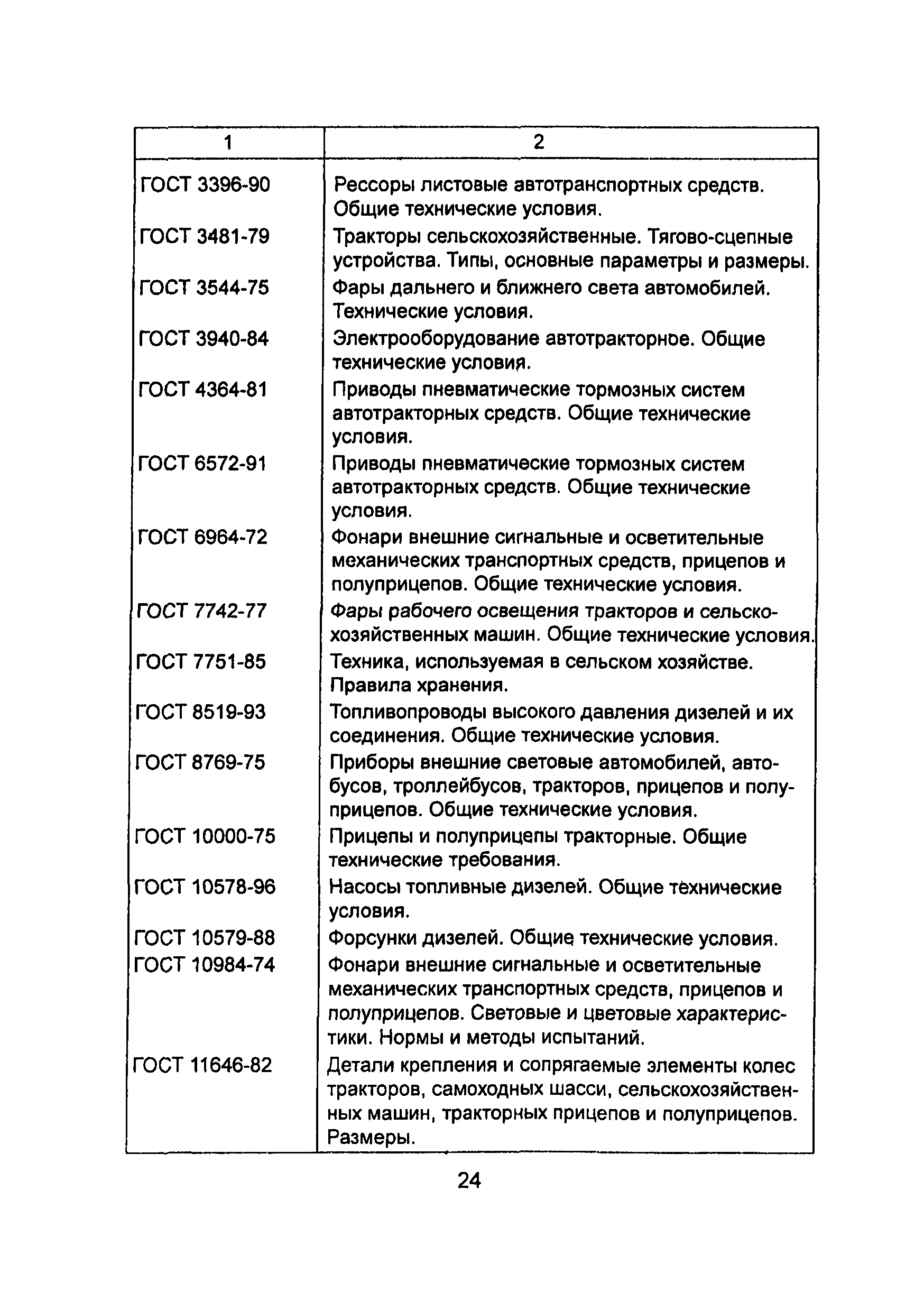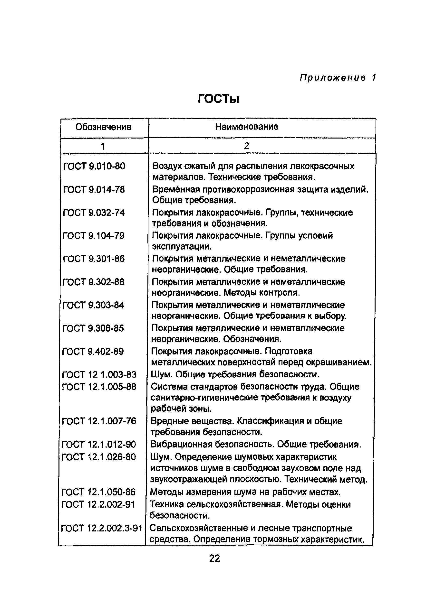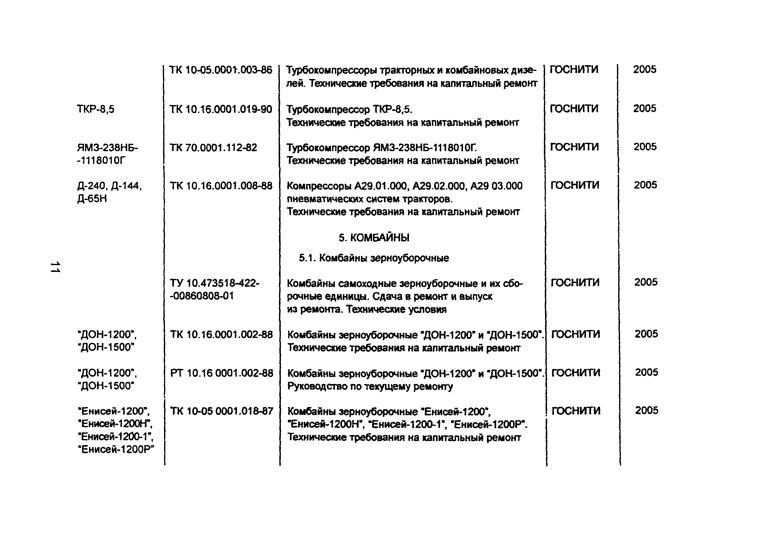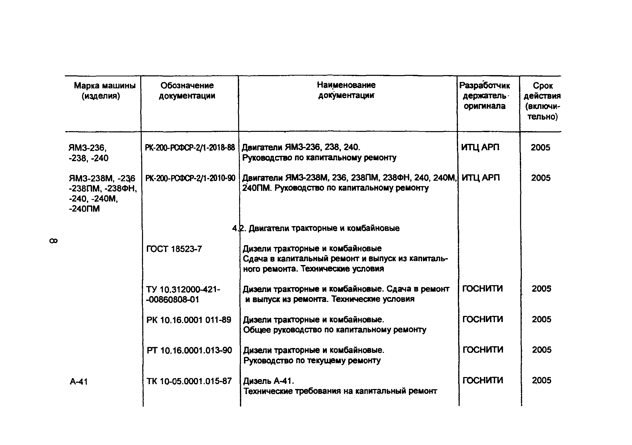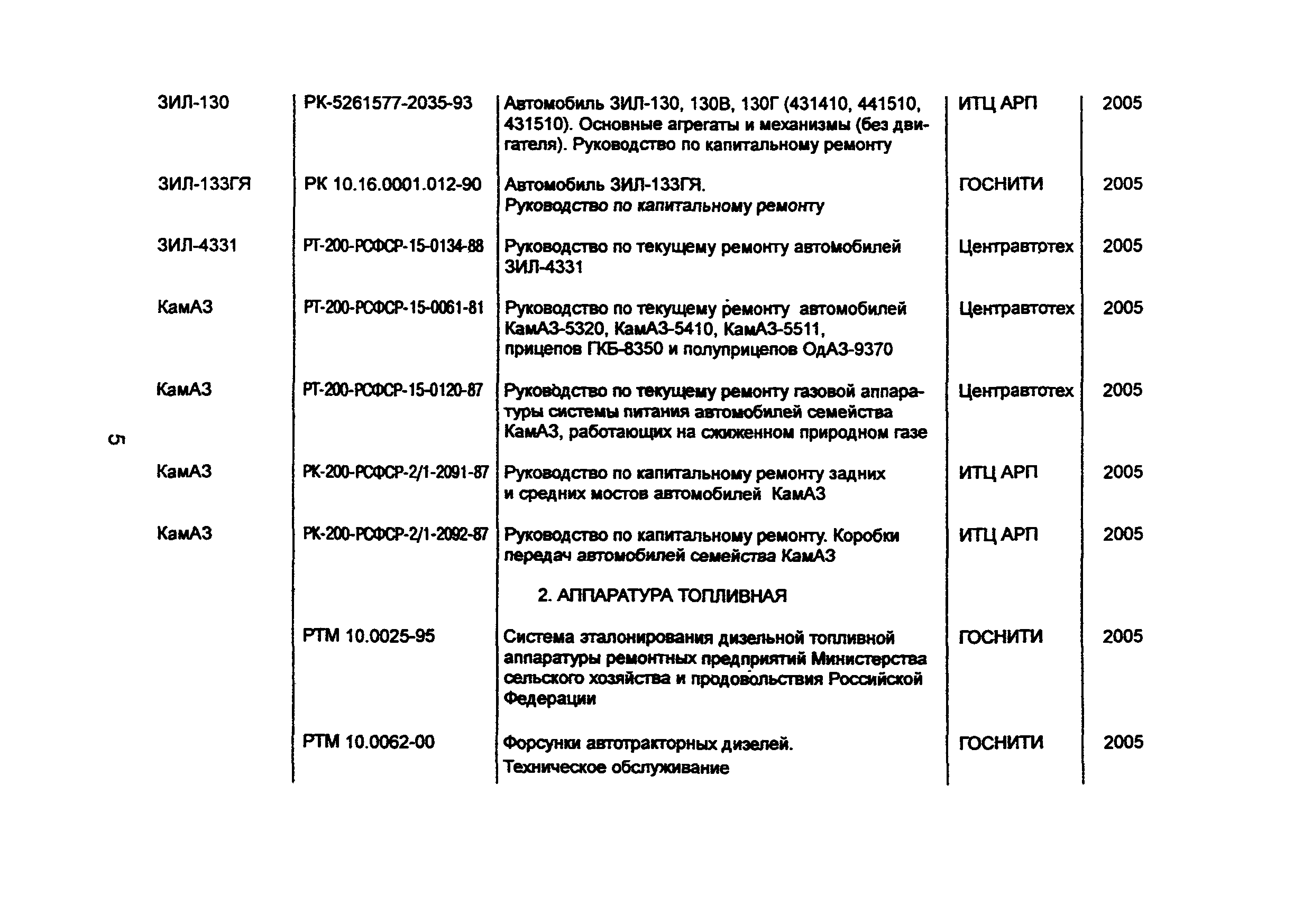Указатель обязательной нормативно-технической документации, действующей в системе технического сервиса агропромышленного комплекса| Статус: | действует | | Название рус.: | Указатель обязательной нормативно-технической документации, действующей в системе технического сервиса агропромышленного комплекса | | Дата добавления в базу: | 01.09.2013 | | Дата актуализации: | 01.01.2021 | | Область применения: | Указатель предназначен для предприятий, производящих техническое обслуживание и ремонт автомобилей, сельскохозяйственной техники и агрегатов. | | Оглавление: | Документация на техническое обслуживание и ремонт автомобилей, сельскохозяйственной техники и агрегатов 1. Автомобили 2. Аппаратура топливная 3. Аппаратура гидравлическая 4. Двигатели 4.1. Двигатели автомобильные 4.2. Двигатели тракторные и комбайновые 5. Комбайны 5.1. Комбайны зерноуборочные 5.2. Комбайны кормоуборочные 5.3. Комбайны картофелеуборочные и корнеуборочные 6. Тракторы Приложение 1. ГОСТы Приложение 2. Отраслевые стандарты и руководящие технические материалы | | Разработан: | ГОСНИТИ Российская академия сельскохозяйственных наук