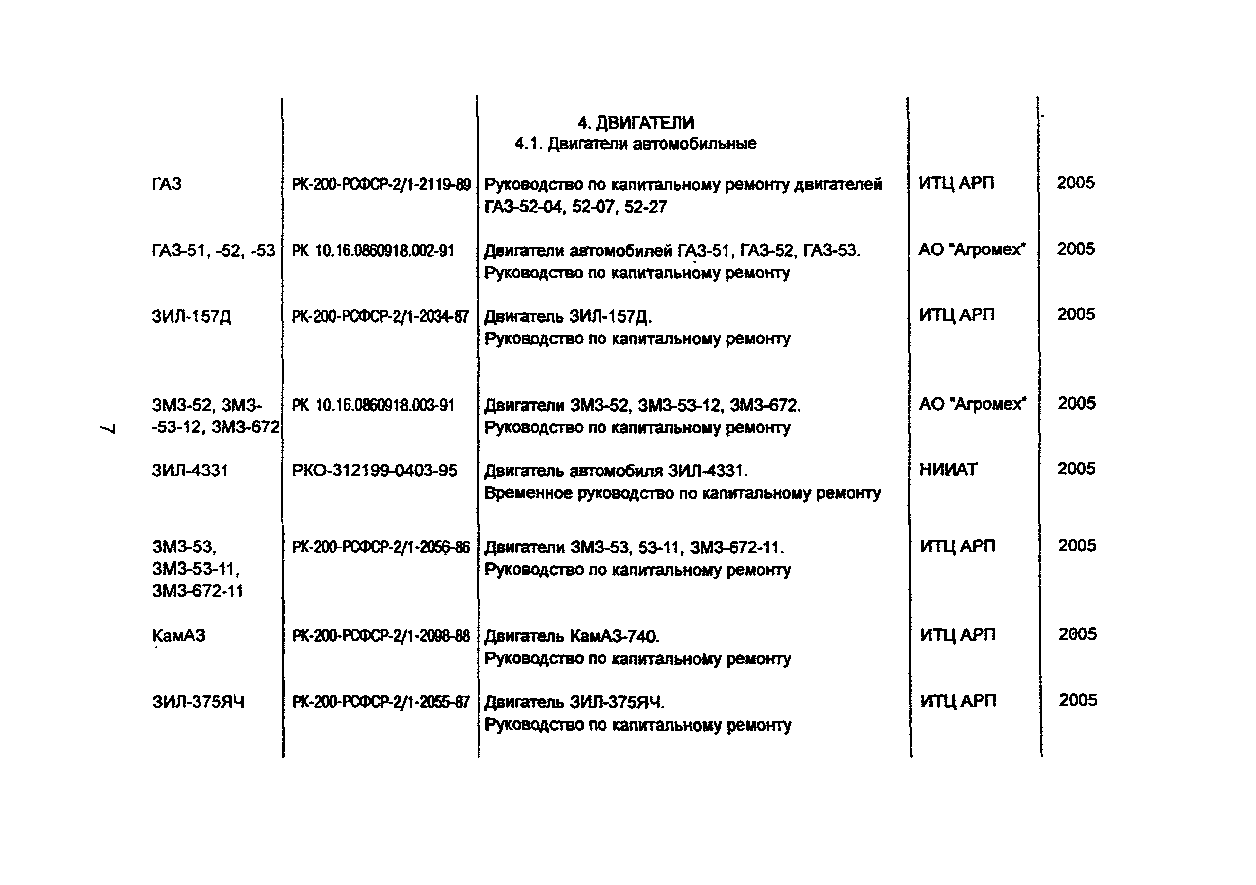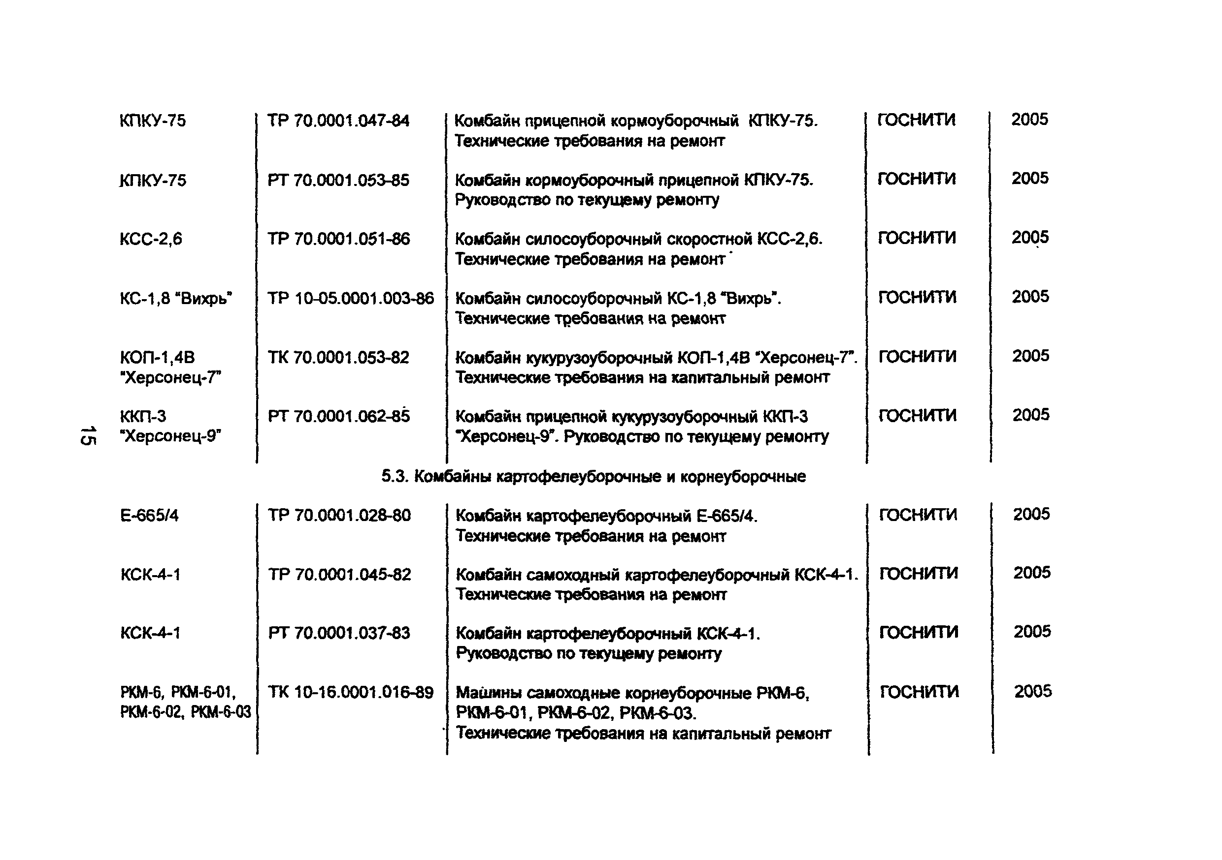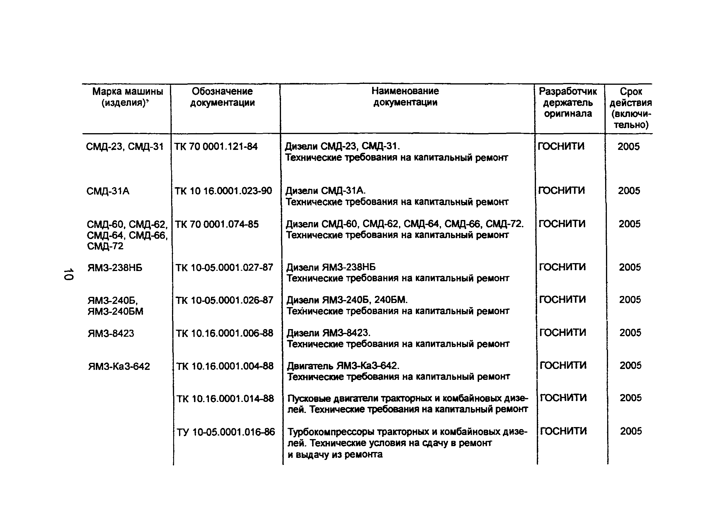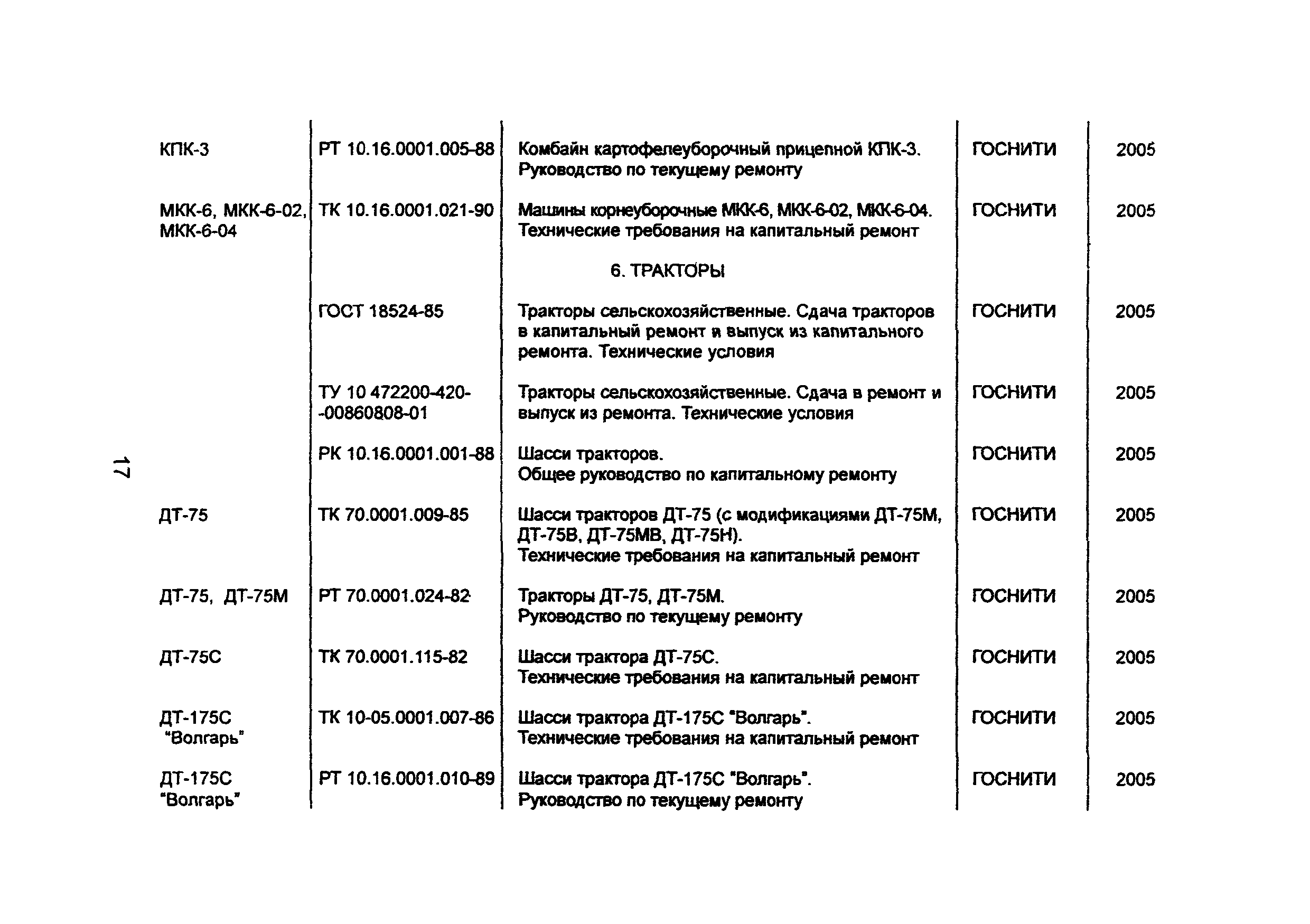 Указатель обязательной нормативно-технической документации, действующей в системе технического сервиса агропромышленного комплекса| Статус: | действует | | Название рус.: | Указатель обязательной нормативно-технической документации, действующей в системе технического сервиса агропромышленного комплекса | | Дата добавления в базу: | 01.09.2013 | | Дата актуализации: | 01.01.2021 | | Область применения: | Указатель предназначен для предприятий, производящих техническое обслуживание и ремонт автомобилей, сельскохозяйственной техники и агрегатов. | | Оглавление: | Документация на техническое обслуживание и ремонт автомобилей, сельскохозяйственной техники и агрегатов 1. Автомобили 2. Аппаратура топливная 3. Аппаратура гидравлическая 4. Двигатели 4.1. Двигатели автомобильные 4.2. Двигатели тракторные и комбайновые 5. Комбайны 5.1. Комбайны зерноуборочные 5.2. Комбайны кормоуборочные 5.3. Комбайны картофелеуборочные и корнеуборочные 6. Тракторы Приложение 1. ГОСТы Приложение 2. Отраслевые стандарты и руководящие технические материалы | | Разработан: | ГОСНИТИ Российская академия сельскохозяйственных наук