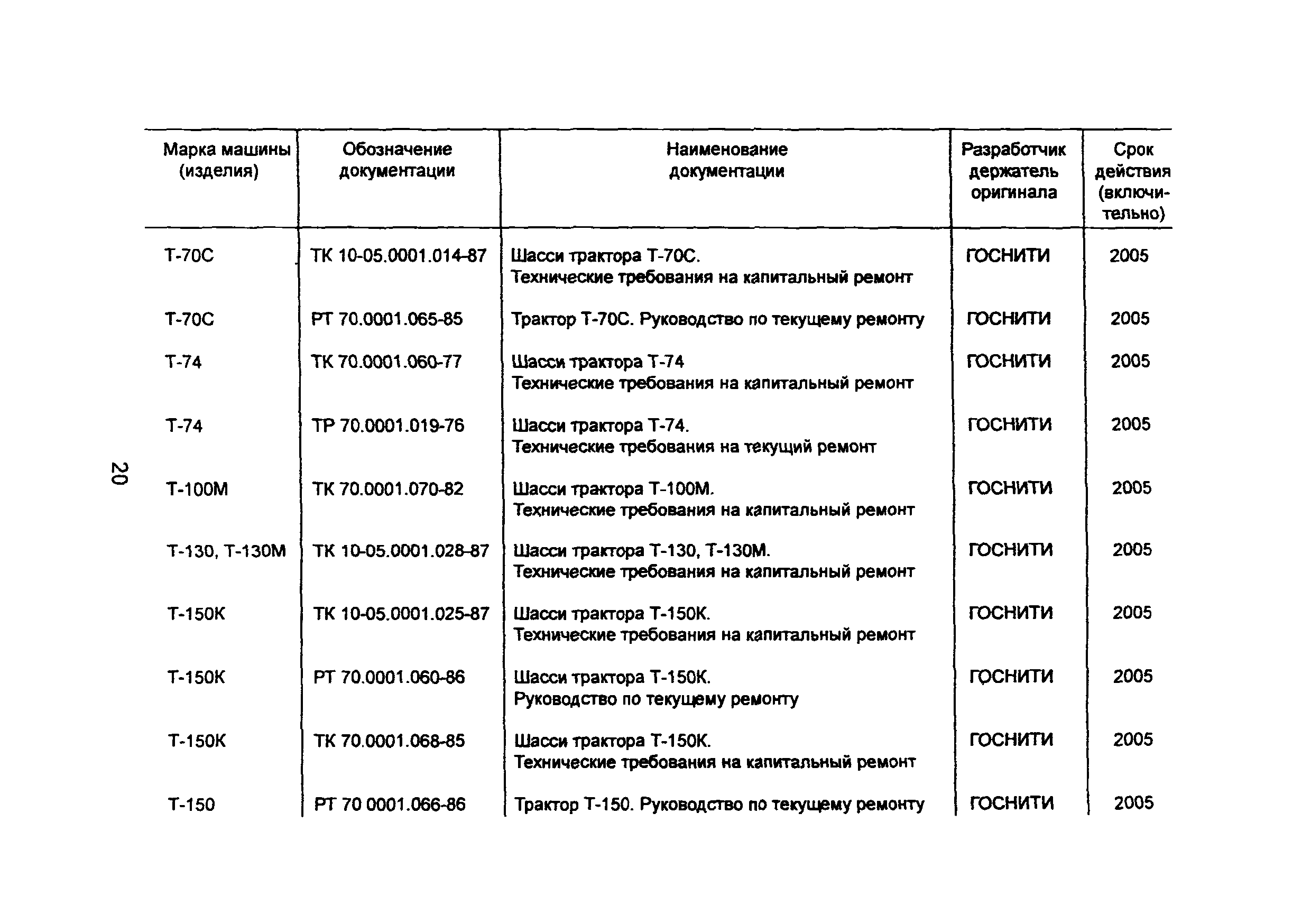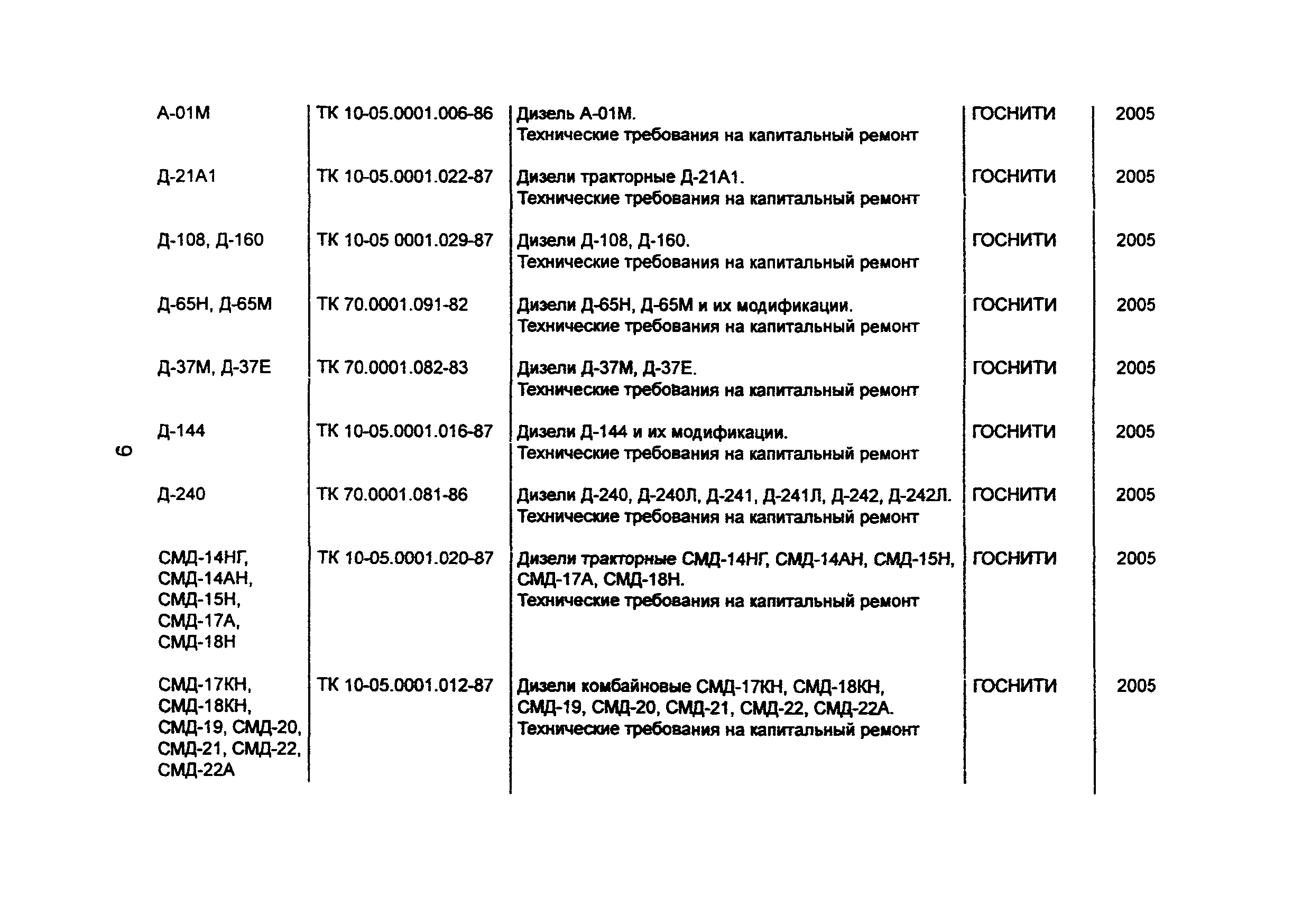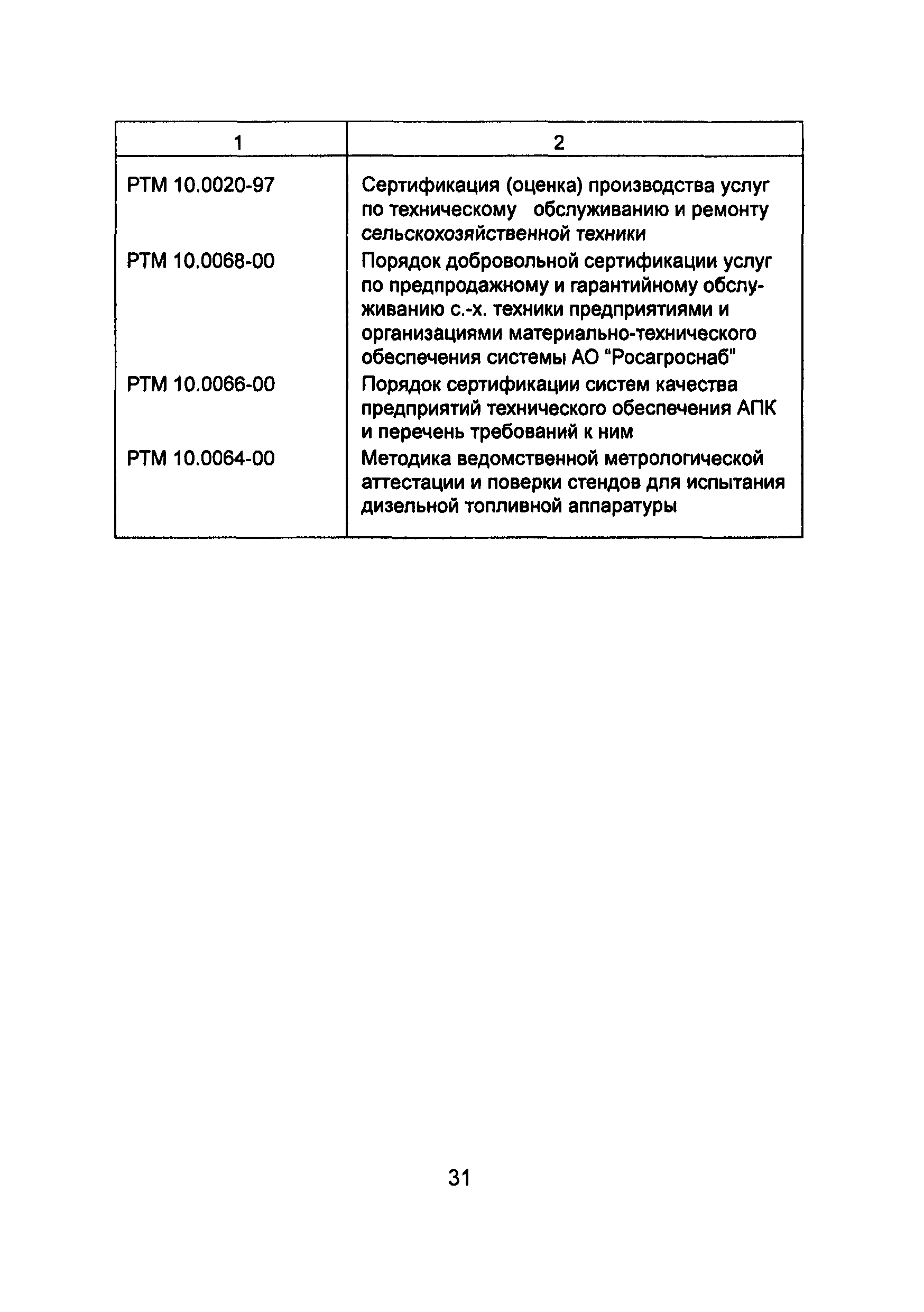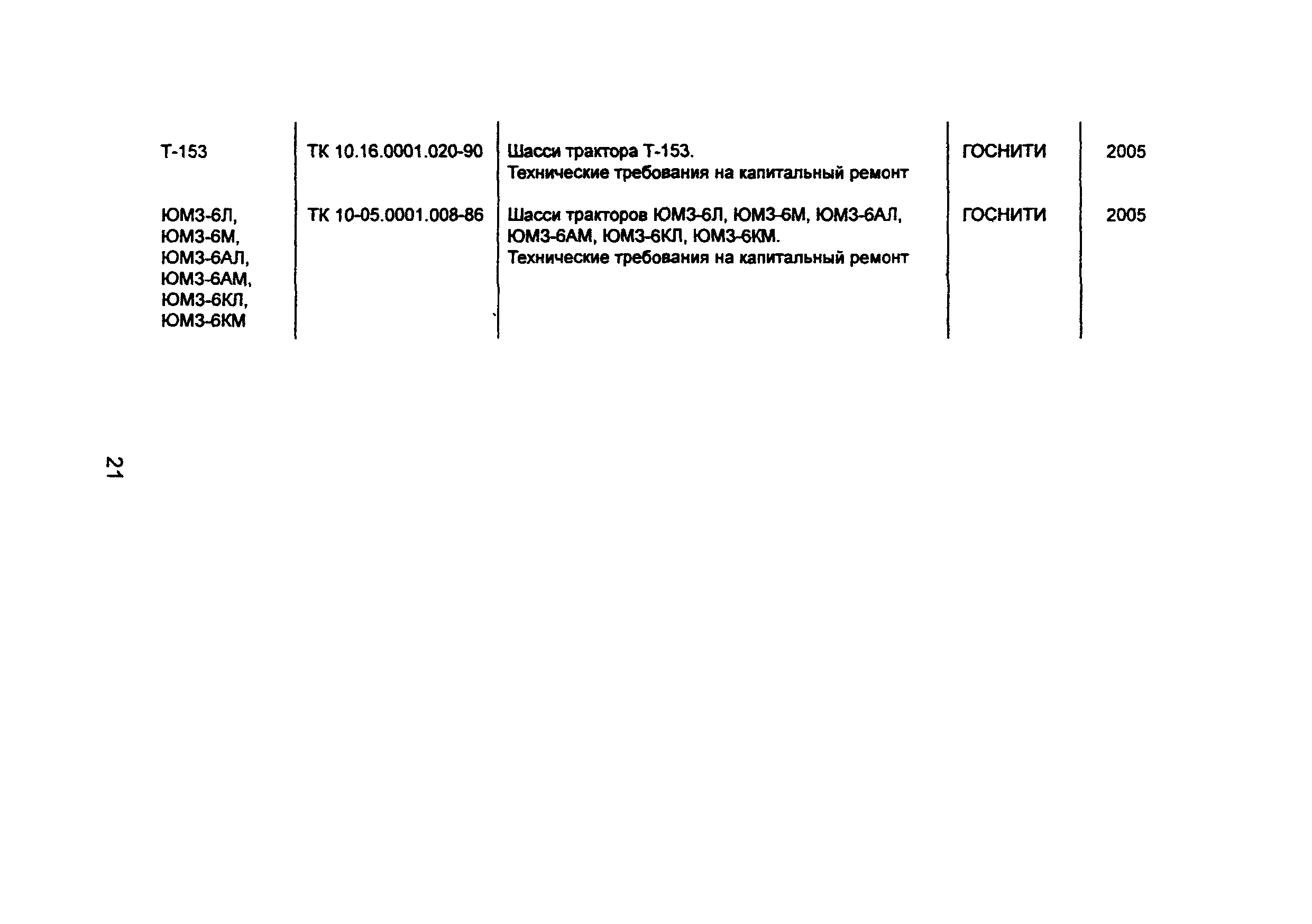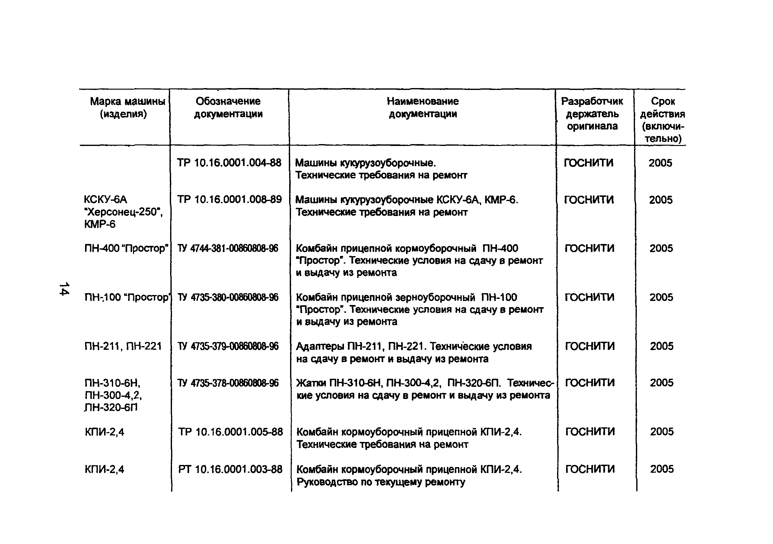 Указатель обязательной нормативно-технической документации, действующей в системе технического сервиса агропромышленного комплекса| Статус: | действует | | Название рус.: | Указатель обязательной нормативно-технической документации, действующей в системе технического сервиса агропромышленного комплекса | | Дата добавления в базу: | 01.09.2013 | | Дата актуализации: | 01.01.2021 | | Область применения: | Указатель предназначен для предприятий, производящих техническое обслуживание и ремонт автомобилей, сельскохозяйственной техники и агрегатов. | | Оглавление: | Документация на техническое обслуживание и ремонт автомобилей, сельскохозяйственной техники и агрегатов 1. Автомобили 2. Аппаратура топливная 3. Аппаратура гидравлическая 4. Двигатели 4.1. Двигатели автомобильные 4.2. Двигатели тракторные и комбайновые 5. Комбайны 5.1. Комбайны зерноуборочные 5.2. Комбайны кормоуборочные 5.3. Комбайны картофелеуборочные и корнеуборочные 6. Тракторы Приложение 1. ГОСТы Приложение 2. Отраслевые стандарты и руководящие технические материалы | | Разработан: | ГОСНИТИ Российская академия сельскохозяйственных наук