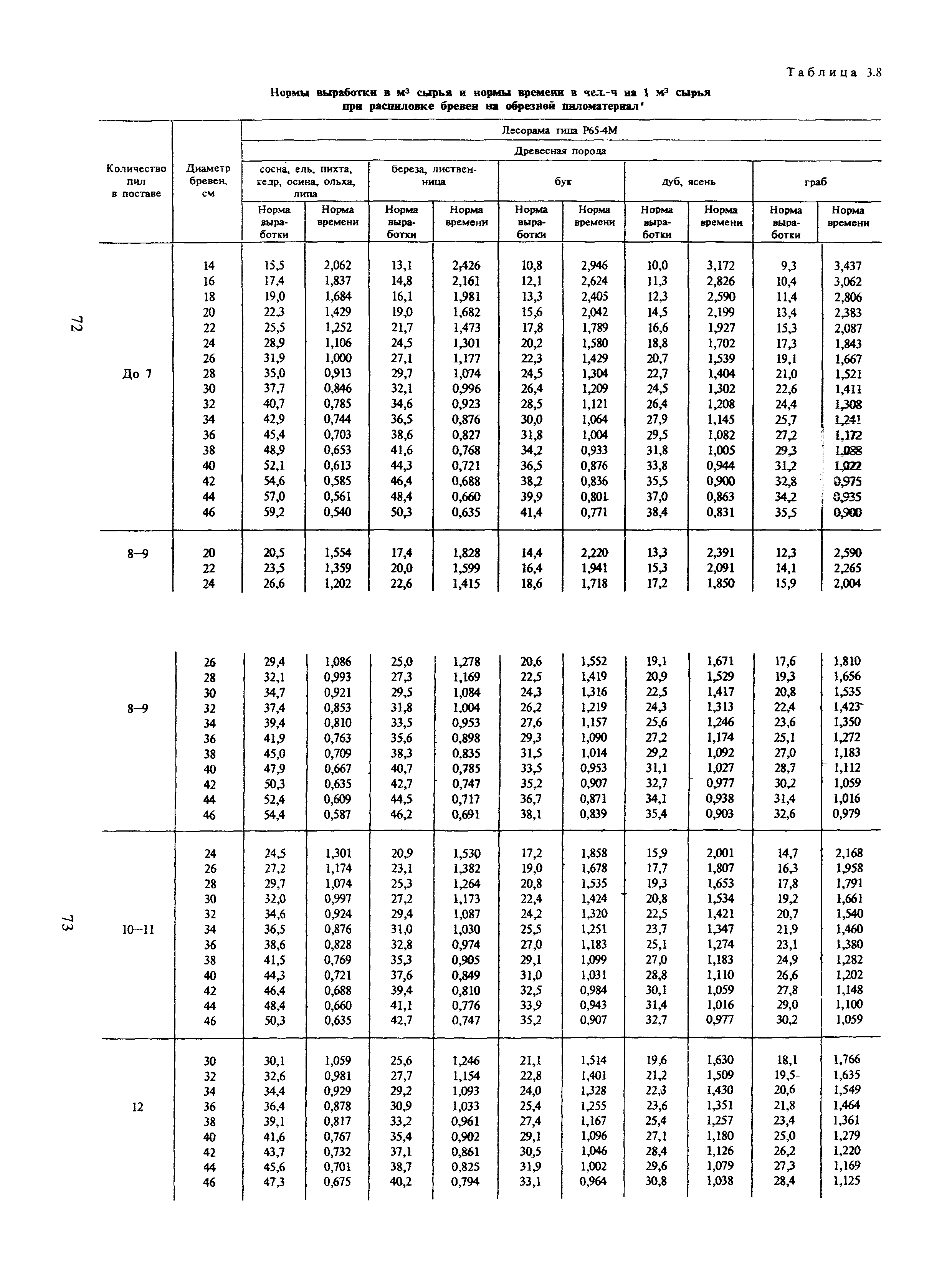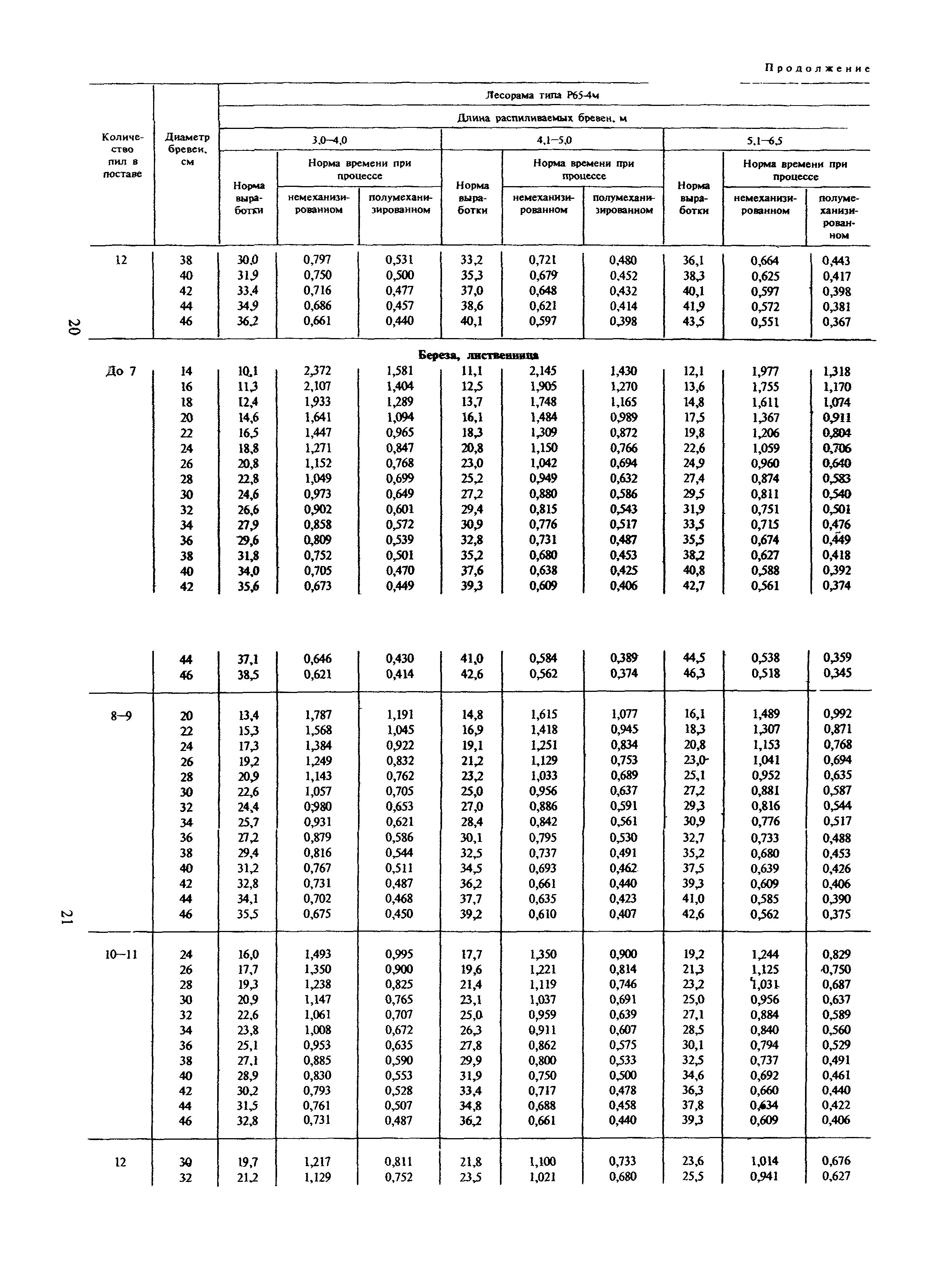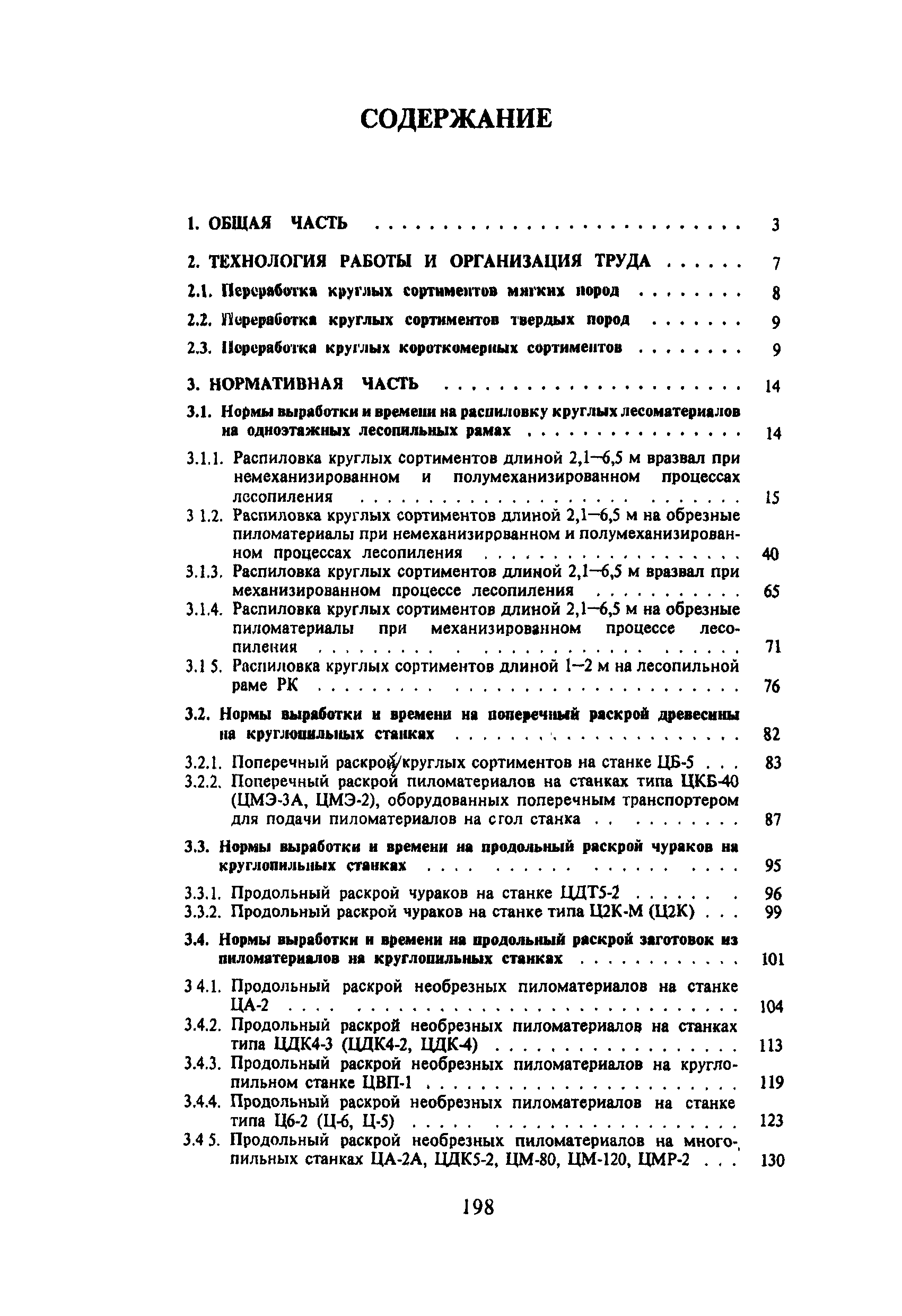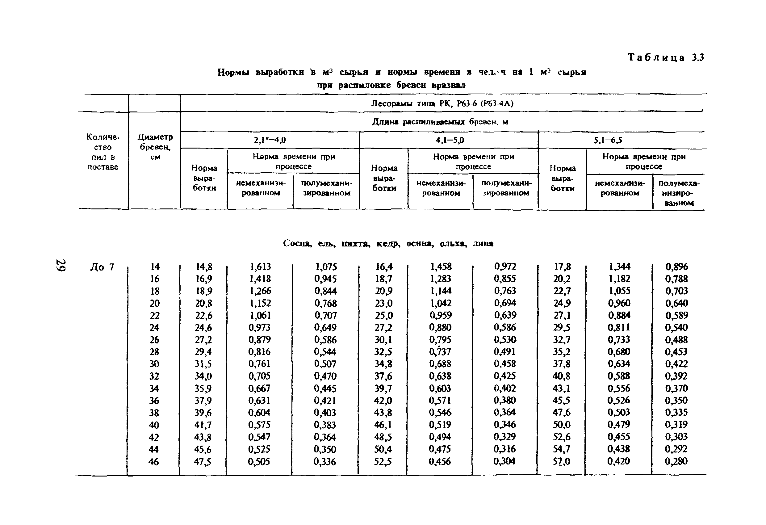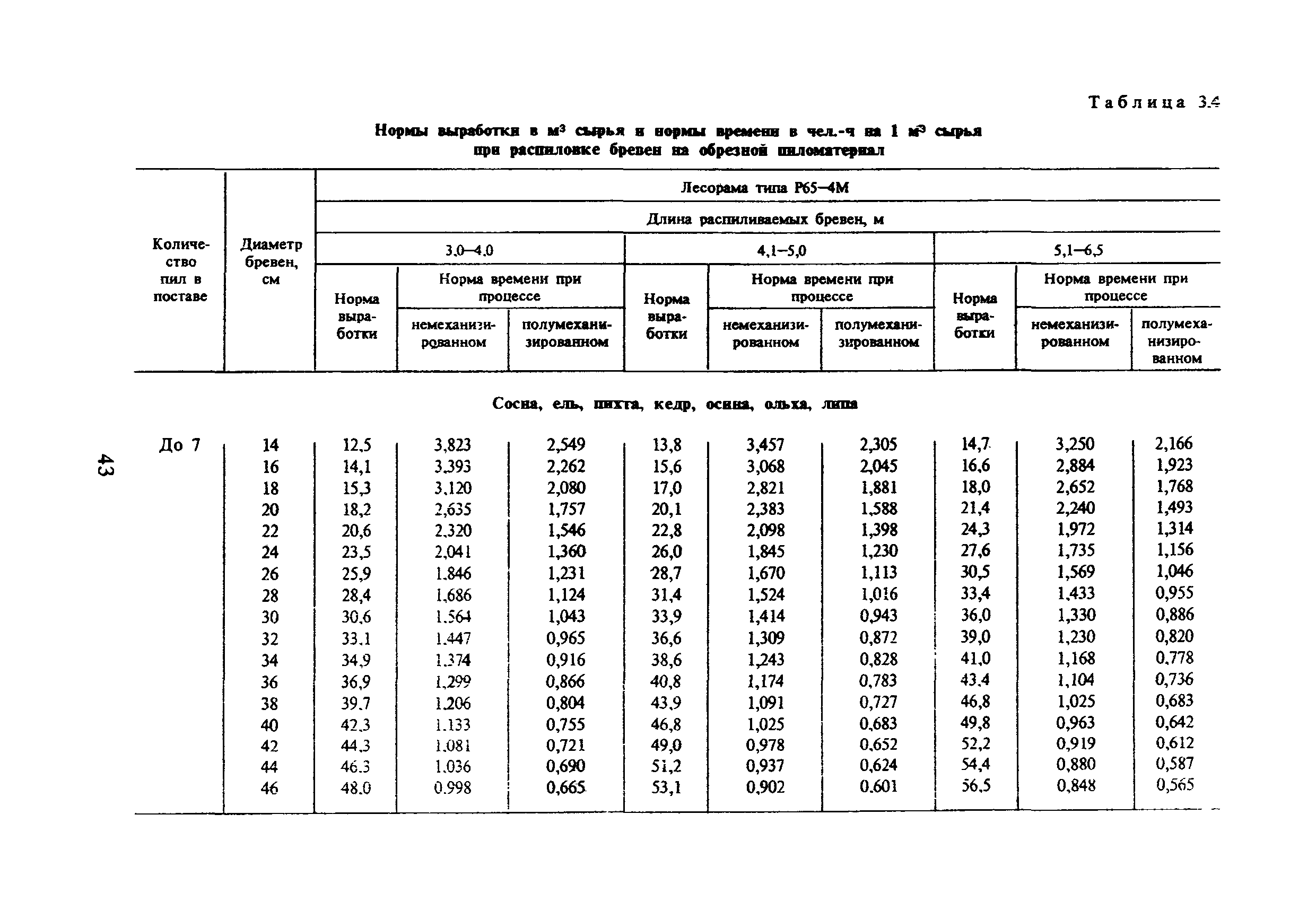 Типовые нормы выработки и времени на лесопильные работы (Работы, выполняемые на одноэтажных лесопильных рамах и круглопильных станках)| Статус: | справочные материалы, мп, тпр | | Название рус.: | Типовые нормы выработки и времени на лесопильные работы (Работы, выполняемые на одноэтажных лесопильных рамах и круглопильных станках) | | Дата добавления в базу: | 01.10.2014 | | Дата актуализации: | 01.01.2021 | | Область применения: | Типовые нормы предназначены для нормирования труда рабочих, выполняющих работы на лесопильных и тарных рамах, круглопильных станках, а также работы по перемещению, увязке и укладке сырья и изделий деревообработки, на всех предприятиях независимо от их ведомственной подчиненности | | Оглавление: | 1. Общая часть 2. Технология работы и организация труда 2.1. Переработка круглых сортиментов мягких пород 2.2. Переработка круглых сортиментов твердых пород 2.3. Переработка круглых короткомерных сортиментов 3. Нормативная часть 3.1. Нормы выработки и времени на распиловку круглых лесоматериалов на одноэтажных лесопильных рамах 3.1.1. Распиловка круглых сортиментов длиной 2,1 - 6,5 м вразвал при немеханизированном и полумеханизированном процессах лесопиления 3.1.2. Распиловка круглых сортиментов длиной 2,1 - 6,5 м на обрезные пиломатериалы при немеханизированном и полумеханизированном процессах лесопиления 3.1.3. Распиловка круглых сортиментов длиной 2,1 - 6,5 м вразвал при механизированном процессе лесопиления 3.1.4. Распиловка круглых сортиментов длиной 2,1 - 6,5 м на обрезные пиломатериалы при механизированном процессе лесопиления 3.1.5. Распиловка круглых сортиментов длиной 1 - 2 м на лесопильной раме РК 3.2. Нормы выработки и времени на поперечный раскрой древесины на круглопильных станках 3.2.1. Поперечный раскрой/круглых сортиментов на станке ЦБ-5 3.2.2. Поперечный раскрой пиломатериалов на станках типа ЦКБ-40 (ЦМЭ-3А, ЦМЭ-2), оборудованных поперечным транспортером для подачи пиломатериалов на стол станка 3.3. Нормы выработки и времени на продольный раскрой чураков на круглопильных станках 3.3.1. Продольный раскрой чураков на станке ЦДТ5-2 3.3.2. Продольный раскрой чураков на станке типа Ц2К- (Ц2К) 3.4. Нормы выработки и времени на продольный раскрой заготовок из пиломатериалов на круглопильных станках 3.4.1. Продольный раскрой необрезных пиломатериалов на станке ЦА-2 3.4.2. Продольный раскрой необрезных пиломатериалов на станках типа ЦДК4-3 (ЦДК4-2, ЦДК-4) 3.4.3. Продольный раскрой необрезных пиломатериалов на круглопильном станке ЦВП-1 3.4.4. Продольный раскрой необрезных пиломатериалов на станке типа Ц6-2 (Ц-6, Ц-5) 3.4 5. Продольный раскрой необрезных пиломатериалов на многопильных станках ЦА-2А, ЦДК5-2, ЦМ-80, ЦМ-120, ЦМР-2 3.5. Нормы выработки и времени на продольную распиловку пиломатериалов на тарной раме 3.5.1. Продольная распиловка пиломатериалов на тарных рамах РТ-2, РТ-36 3.6. Нормы выработки и времени на торцовку и поперечный раскрой заготовок кратной длины на детали на круглопильных станках 3.6.1. Пакетная торцовка деталей с одного конца на станке типа ЦПА-40 (ЦПА-2) 3.6.2. Групповой раскрой заготовок кратной длины на детали на станке ЦПА-40 3.6.3. Индивидуальный раскрой заготовок кратной длины на детали на станке Ц6-2 3.7. Нормы выработки на вспомогательные работы 3.7.1. Подача сырья в лесопильный цех вагонетками УЖД при погрузке мостовым краном 3.7.2. Подача сырья в лесопильный цех и вывозка п