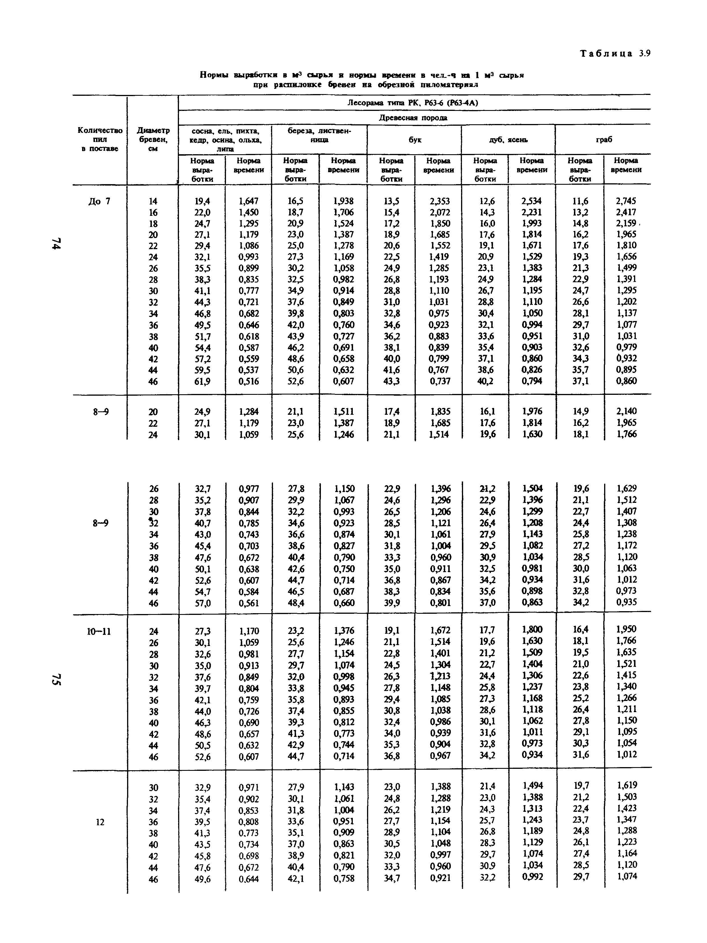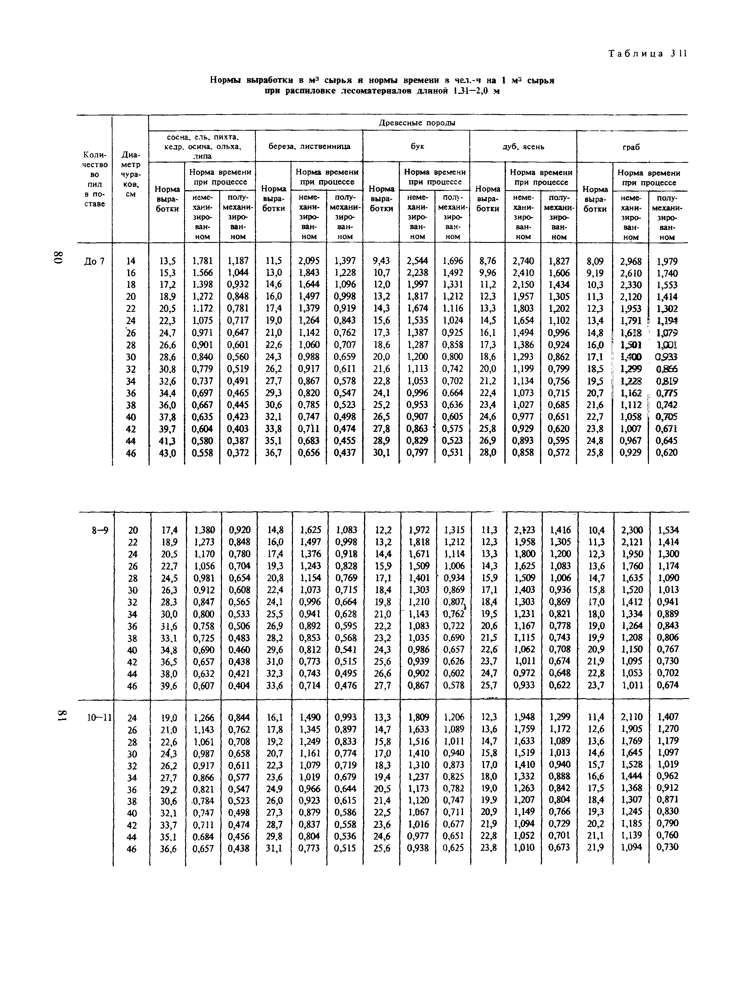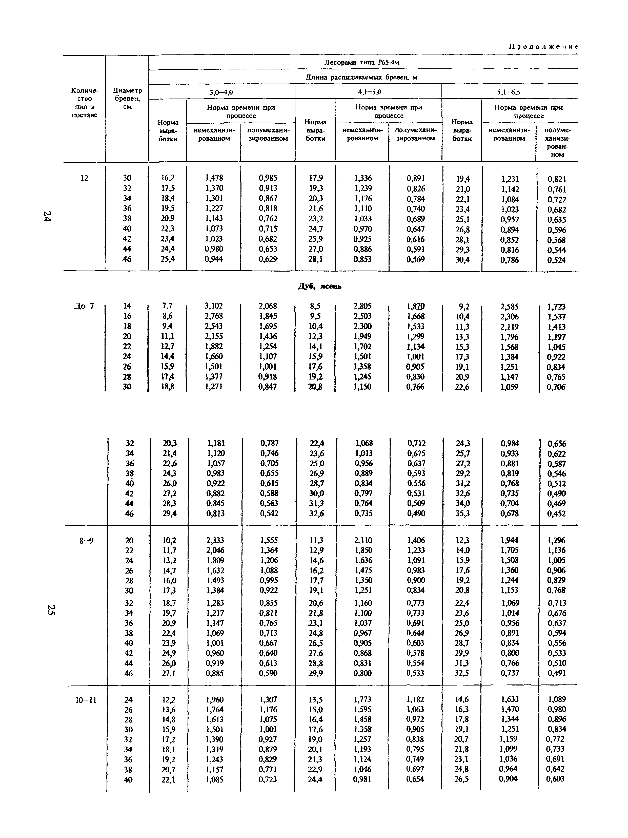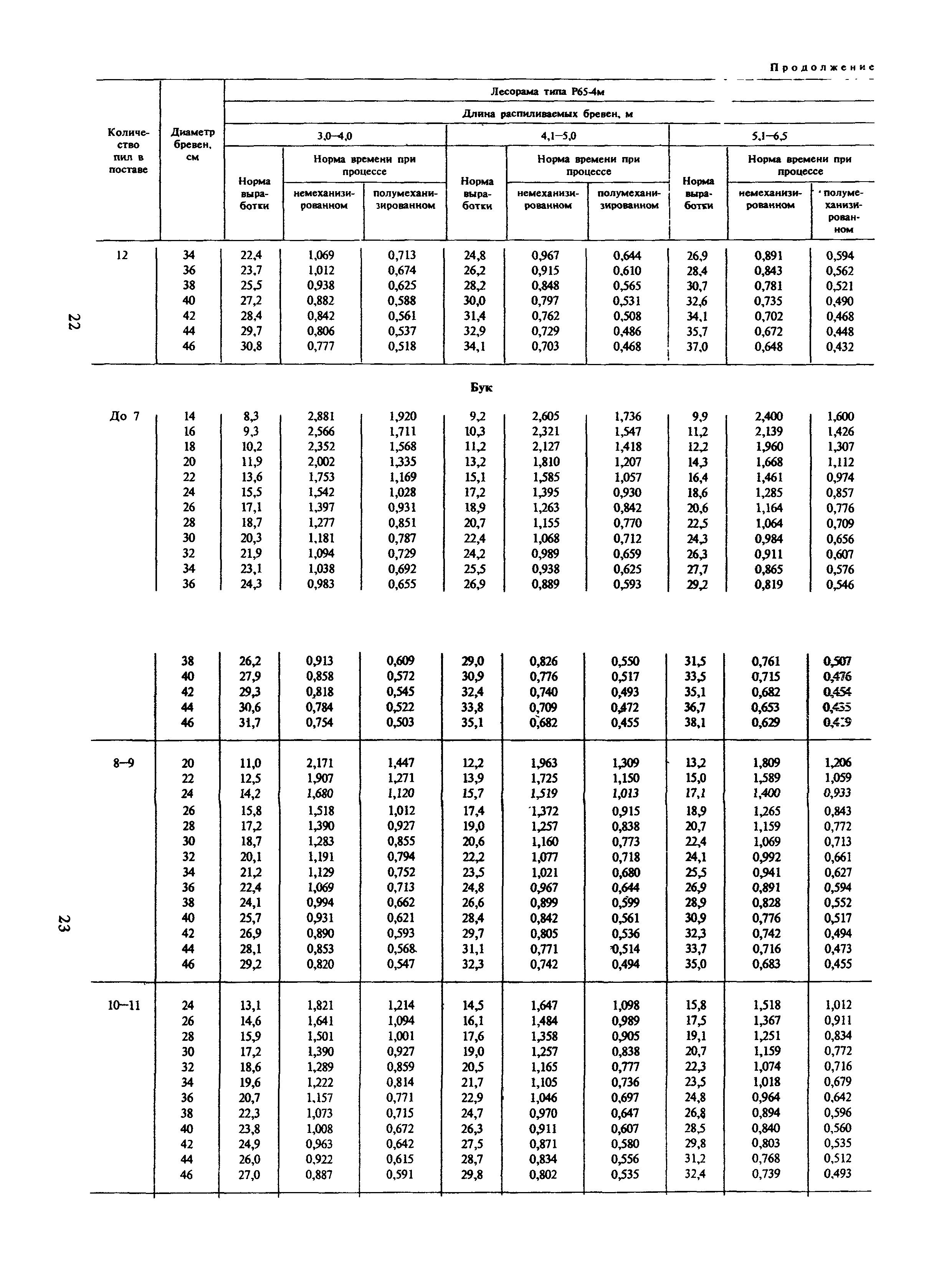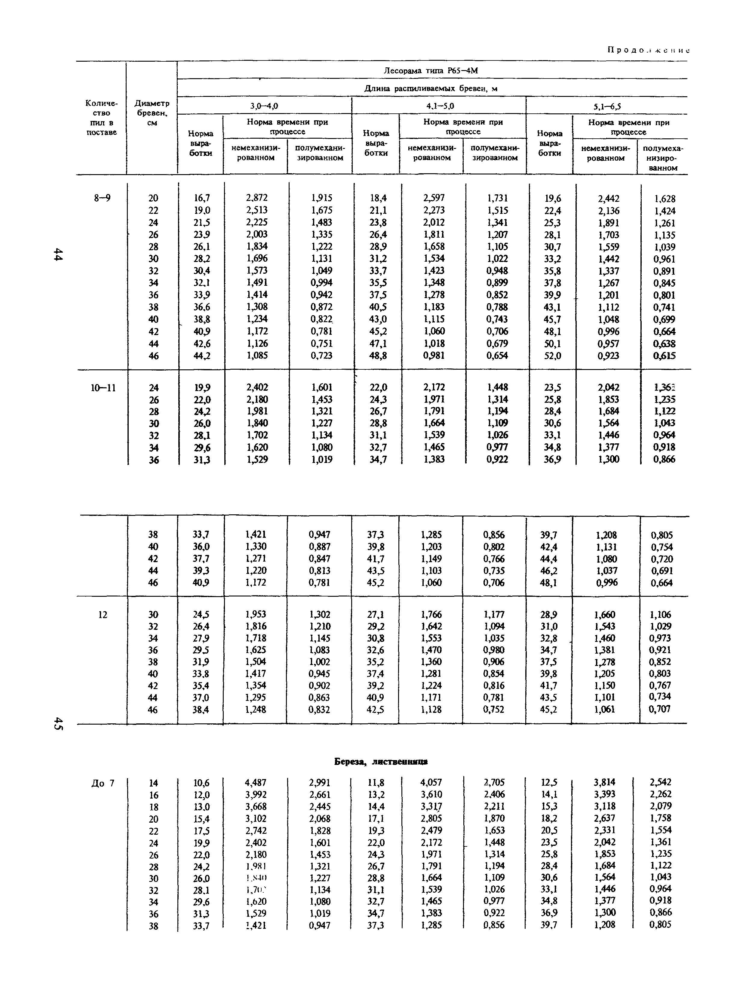 Типовые нормы выработки и времени на лесопильные работы (Работы, выполняемые на одноэтажных лесопильных рамах и круглопильных станках)| Статус: | справочные материалы, мп, тпр | | Название рус.: | Типовые нормы выработки и времени на лесопильные работы (Работы, выполняемые на одноэтажных лесопильных рамах и круглопильных станках) | | Дата добавления в базу: | 01.10.2014 | | Дата актуализации: | 01.01.2021 | | Область применения: | Типовые нормы предназначены для нормирования труда рабочих, выполняющих работы на лесопильных и тарных рамах, круглопильных станках, а также работы по перемещению, увязке и укладке сырья и изделий деревообработки, на всех предприятиях независимо от их ведомственной подчиненности | | Оглавление: | 1. Общая часть 2. Технология работы и организация труда 2.1. Переработка круглых сортиментов мягких пород 2.2. Переработка круглых сортиментов твердых пород 2.3. Переработка круглых короткомерных сортиментов 3. Нормативная часть 3.1. Нормы выработки и времени на распиловку круглых лесоматериалов на одноэтажных лесопильных рамах 3.1.1. Распиловка круглых сортиментов длиной 2,1 - 6,5 м вразвал при немеханизированном и полумеханизированном процессах лесопиления 3.1.2. Распиловка круглых сортиментов длиной 2,1 - 6,5 м на обрезные пиломатериалы при немеханизированном и полумеханизированном процессах лесопиления 3.1.3. Распиловка круглых сортиментов длиной 2,1 - 6,5 м вразвал при механизированном процессе лесопиления 3.1.4. Распиловка круглых сортиментов длиной 2,1 - 6,5 м на обрезные пиломатериалы при механизированном процессе лесопиления 3.1.5. Распиловка круглых сортиментов длиной 1 - 2 м на лесопильной раме РК 3.2. Нормы выработки и времени на поперечный раскрой древесины на круглопильных станках 3.2.1. Поперечный раскрой/круглых сортиментов на станке ЦБ-5 3.2.2. Поперечный раскрой пиломатериалов на станках типа ЦКБ-40 (ЦМЭ-3А, ЦМЭ-2), оборудованных поперечным транспортером для подачи пиломатериалов на стол станка 3.3. Нормы выработки и времени на продольный раскрой чураков на круглопильных станках 3.3.1. Продольный раскрой чураков на станке ЦДТ5-2 3.3.2. Продольный раскрой чураков на станке типа Ц2К- (Ц2К) 3.4. Нормы выработки и времени на продольный раскрой заготовок из пиломатериалов на круглопильных станках 3.4.1. Продольный раскрой необрезных пиломатериалов на станке ЦА-2 3.4.2. Продольный раскрой необрезных пиломатериалов на станках типа ЦДК4-3 (ЦДК4-2, ЦДК-4) 3.4.3. Продольный раскрой необрезных пиломатериалов на круглопильном станке ЦВП-1 3.4.4. Продольный раскрой необрезных пиломатериалов на станке типа Ц6-2 (Ц-6, Ц-5) 3.4 5. Продольный раскрой необрезных пиломатериалов на многопильных станках ЦА-2А, ЦДК5-2, ЦМ-80, ЦМ-120, ЦМР-2 3.5. Нормы выработки и времени на продольную распиловку пиломатериалов на тарной раме 3.5.1. Продольная распиловка пиломатериалов на тарных рамах РТ-2, РТ-36 3.6. Нормы выработки и времени на торцовку и поперечный раскрой заготовок кратной длины на детали на круглопильных станках 3.6.1. Пакетная торцовка деталей с одного конца на станке типа ЦПА-40 (ЦПА-2) 3.6.2. Групповой раскрой заготовок кратной длины на детали на станке ЦПА-40 3.6.3. Индивидуальный раскрой заготовок кратной длины на детали на станке Ц6-2 3.7. Нормы выработки на вспомогательные работы 3.7.1. Подача сырья в лесопильный цех вагонетками УЖД при погрузке мостовым краном 3.7.2. Подача сырья в лесопильный цех и вывозка п