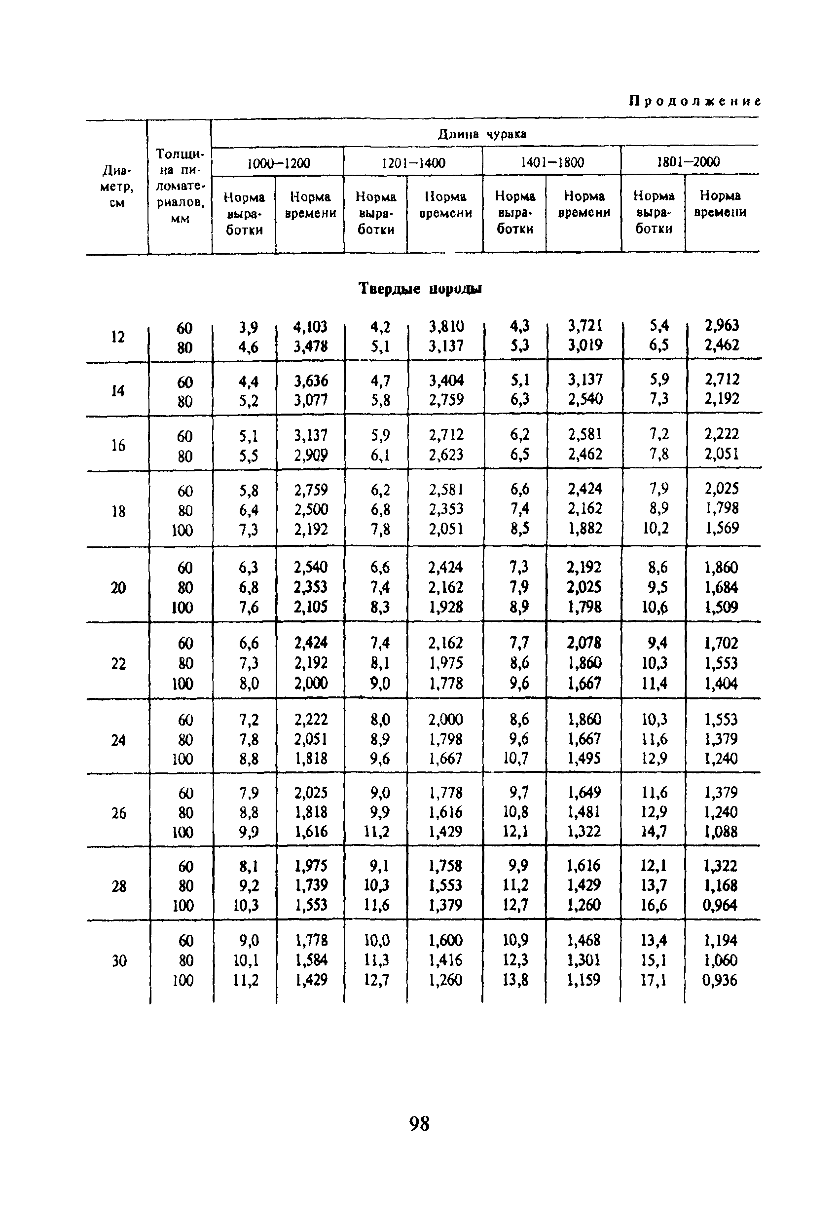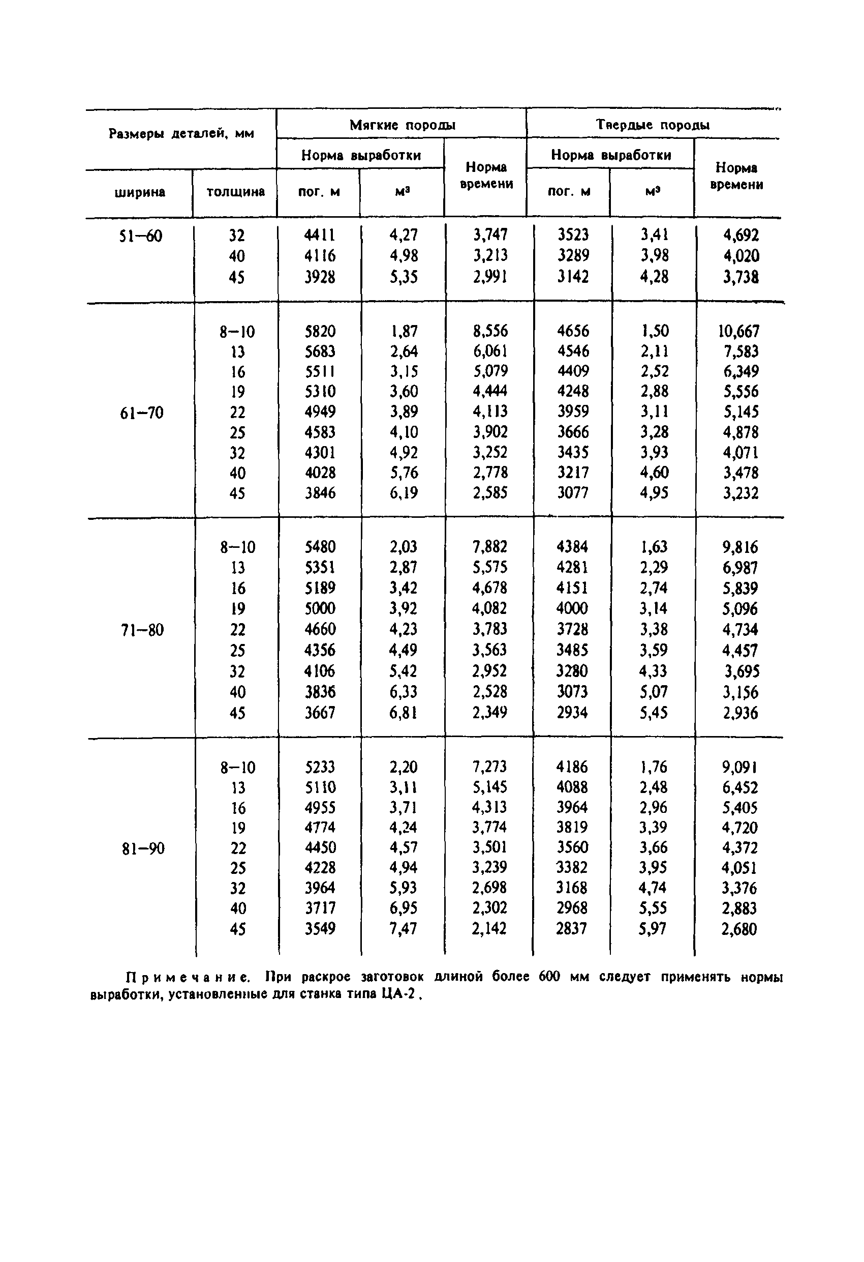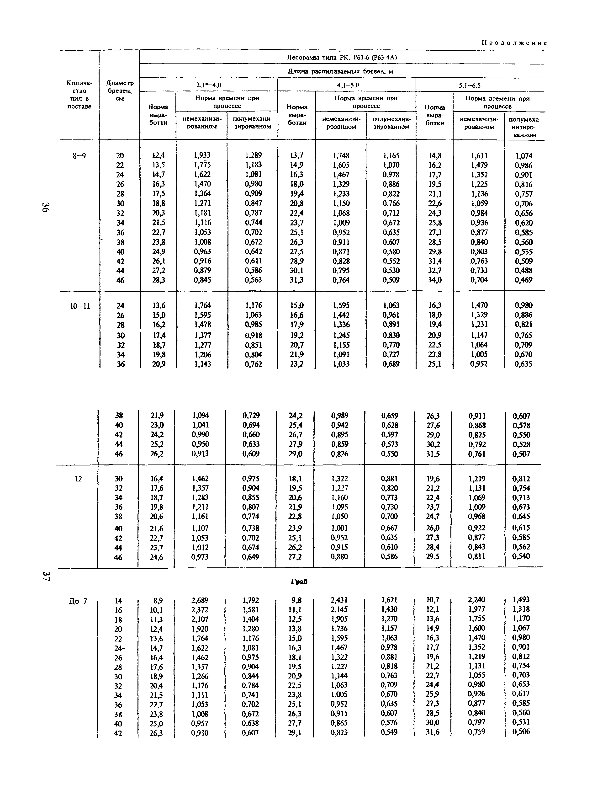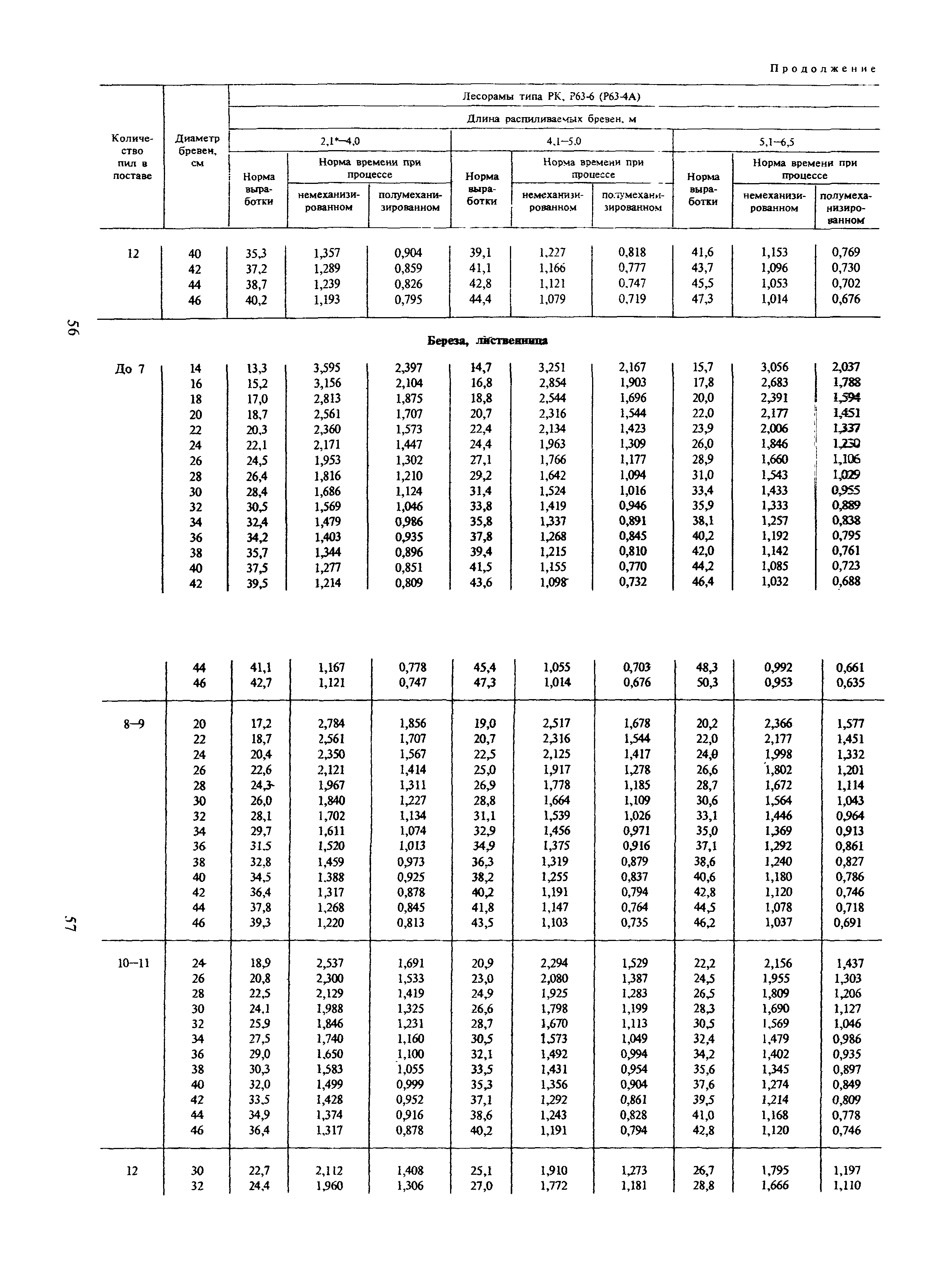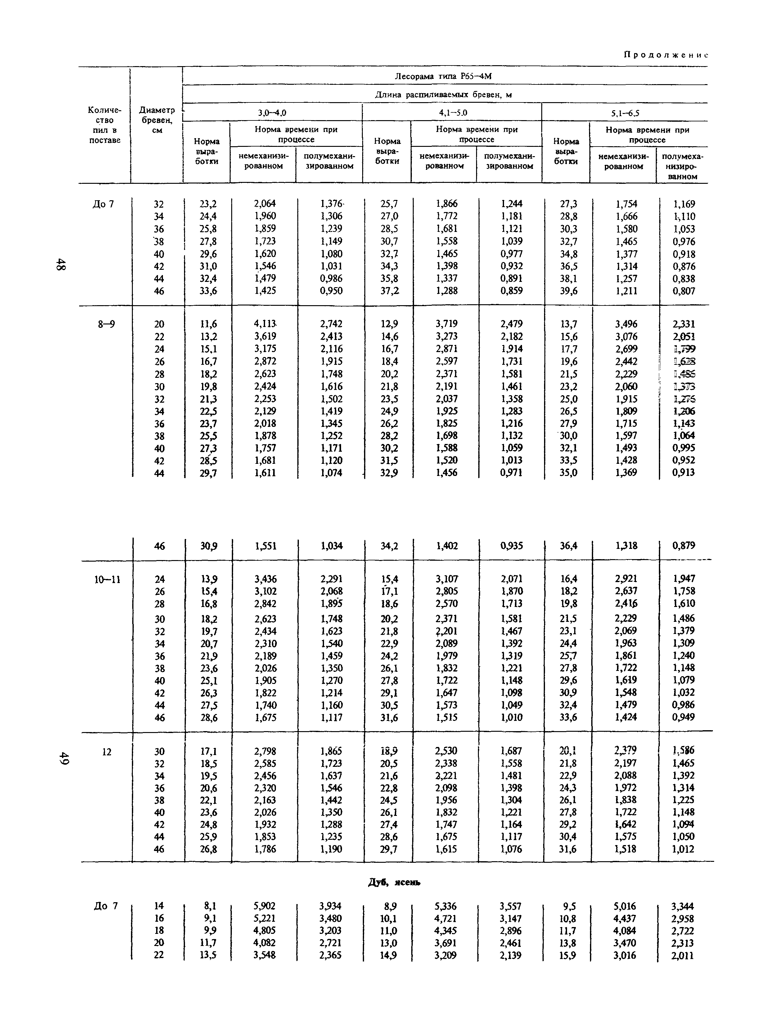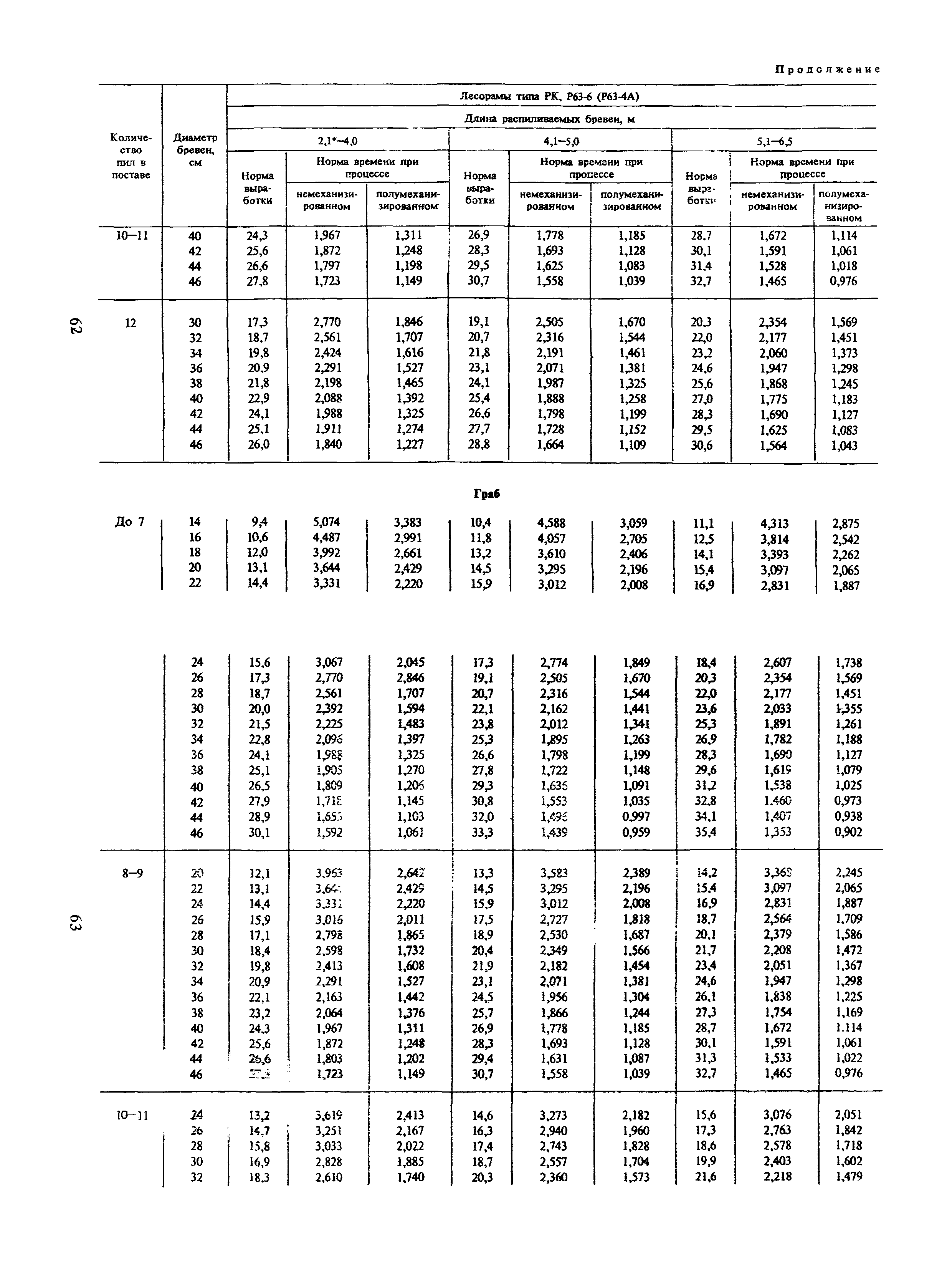 Типовые нормы выработки и времени на лесопильные работы (Работы, выполняемые на одноэтажных лесопильных рамах и круглопильных станках)| Статус: | справочные материалы, мп, тпр | | Название рус.: | Типовые нормы выработки и времени на лесопильные работы (Работы, выполняемые на одноэтажных лесопильных рамах и круглопильных станках) | | Дата добавления в базу: | 01.10.2014 | | Дата актуализации: | 01.01.2021 | | Область применения: | Типовые нормы предназначены для нормирования труда рабочих, выполняющих работы на лесопильных и тарных рамах, круглопильных станках, а также работы по перемещению, увязке и укладке сырья и изделий деревообработки, на всех предприятиях независимо от их ведомственной подчиненности | | Оглавление: | 1. Общая часть 2. Технология работы и организация труда 2.1. Переработка круглых сортиментов мягких пород 2.2. Переработка круглых сортиментов твердых пород 2.3. Переработка круглых короткомерных сортиментов 3. Нормативная часть 3.1. Нормы выработки и времени на распиловку круглых лесоматериалов на одноэтажных лесопильных рамах 3.1.1. Распиловка круглых сортиментов длиной 2,1 - 6,5 м вразвал при немеханизированном и полумеханизированном процессах лесопиления 3.1.2. Распиловка круглых сортиментов длиной 2,1 - 6,5 м на обрезные пиломатериалы при немеханизированном и полумеханизированном процессах лесопиления 3.1.3. Распиловка круглых сортиментов длиной 2,1 - 6,5 м вразвал при механизированном процессе лесопиления 3.1.4. Распиловка круглых сортиментов длиной 2,1 - 6,5 м на обрезные пиломатериалы при механизированном процессе лесопиления 3.1.5. Распиловка круглых сортиментов длиной 1 - 2 м на лесопильной раме РК 3.2. Нормы выработки и времени на поперечный раскрой древесины на круглопильных станках 3.2.1. Поперечный раскрой/круглых сортиментов на станке ЦБ-5 3.2.2. Поперечный раскрой пиломатериалов на станках типа ЦКБ-40 (ЦМЭ-3А, ЦМЭ-2), оборудованных поперечным транспортером для подачи пиломатериалов на стол станка 3.3. Нормы выработки и времени на продольный раскрой чураков на круглопильных станках 3.3.1. Продольный раскрой чураков на станке ЦДТ5-2 3.3.2. Продольный раскрой чураков на станке типа Ц2К- (Ц2К) 3.4. Нормы выработки и времени на продольный раскрой заготовок из пиломатериалов на круглопильных станках 3.4.1. Продольный раскрой необрезных пиломатериалов на станке ЦА-2 3.4.2. Продольный раскрой необрезных пиломатериалов на станках типа ЦДК4-3 (ЦДК4-2, ЦДК-4) 3.4.3. Продольный раскрой необрезных пиломатериалов на круглопильном станке ЦВП-1 3.4.4. Продольный раскрой необрезных пиломатериалов на станке типа Ц6-2 (Ц-6, Ц-5) 3.4 5. Продольный раскрой необрезных пиломатериалов на многопильных станках ЦА-2А, ЦДК5-2, ЦМ-80, ЦМ-120, ЦМР-2 3.5. Нормы выработки и времени на продольную распиловку пиломатериалов на тарной раме 3.5.1. Продольная распиловка пиломатериалов на тарных рамах РТ-2, РТ-36 3.6. Нормы выработки и времени на торцовку и поперечный раскрой заготовок кратной длины на детали на круглопильных станках 3.6.1. Пакетная торцовка деталей с одного конца на станке типа ЦПА-40 (ЦПА-2) 3.6.2. Групповой раскрой заготовок кратной длины на детали на станке ЦПА-40 3.6.3. Индивидуальный раскрой заготовок кратной длины на детали на станке Ц6-2 3.7. Нормы выработки на вспомогательные работы 3.7.1. Подача сырья в лесопильный цех вагонетками УЖД при погрузке мостовым краном 3.7.2. Подача сырья в лесопильный цех и вывозка п