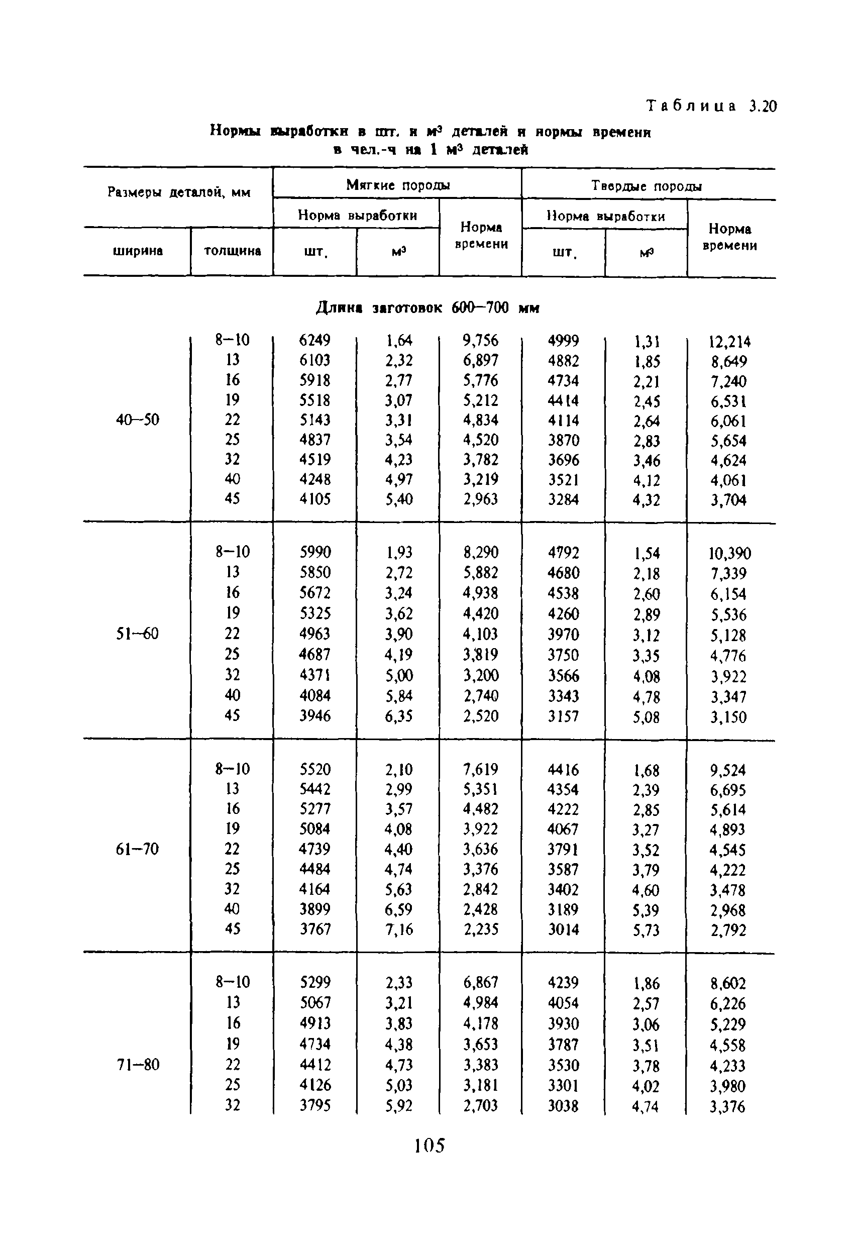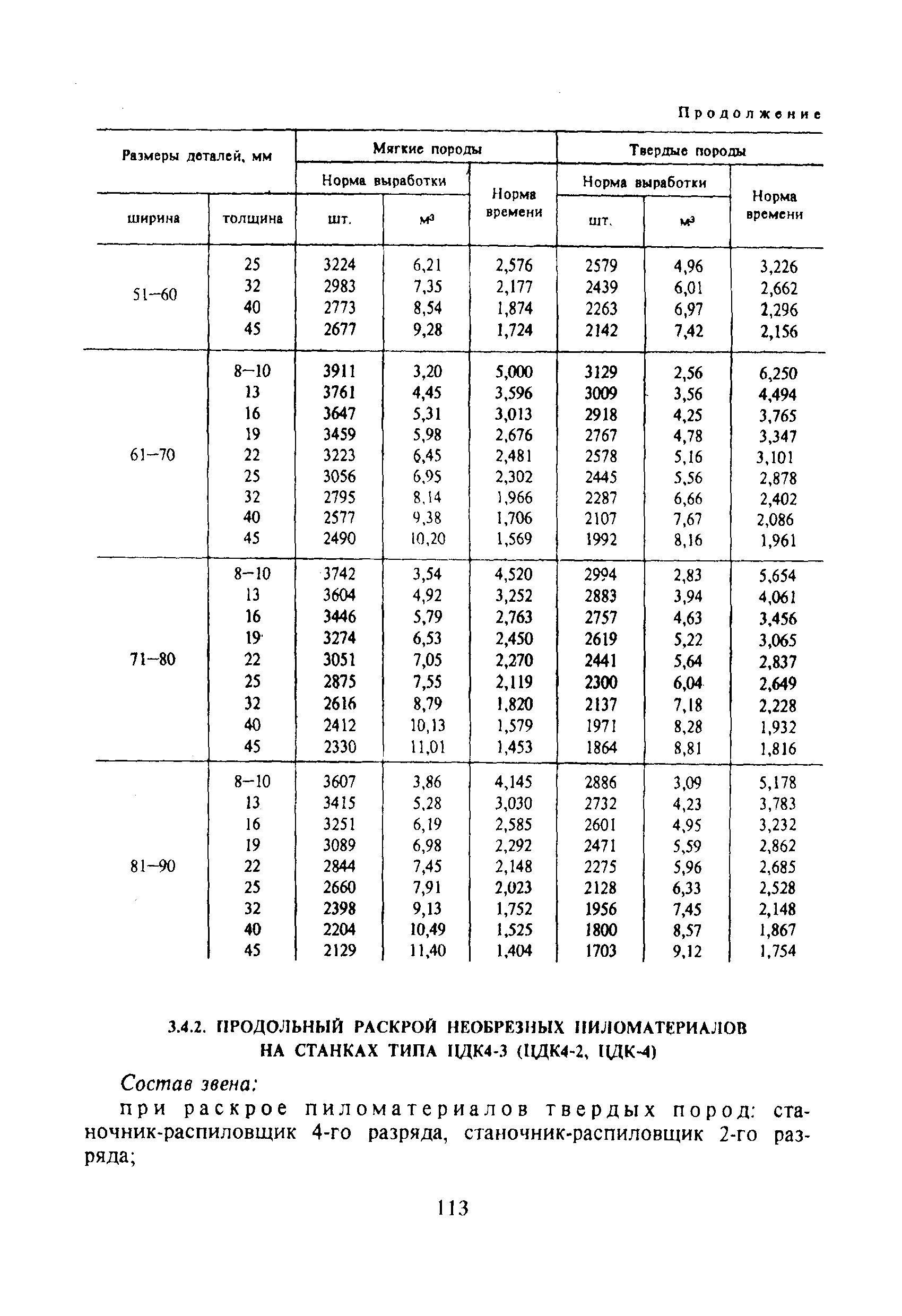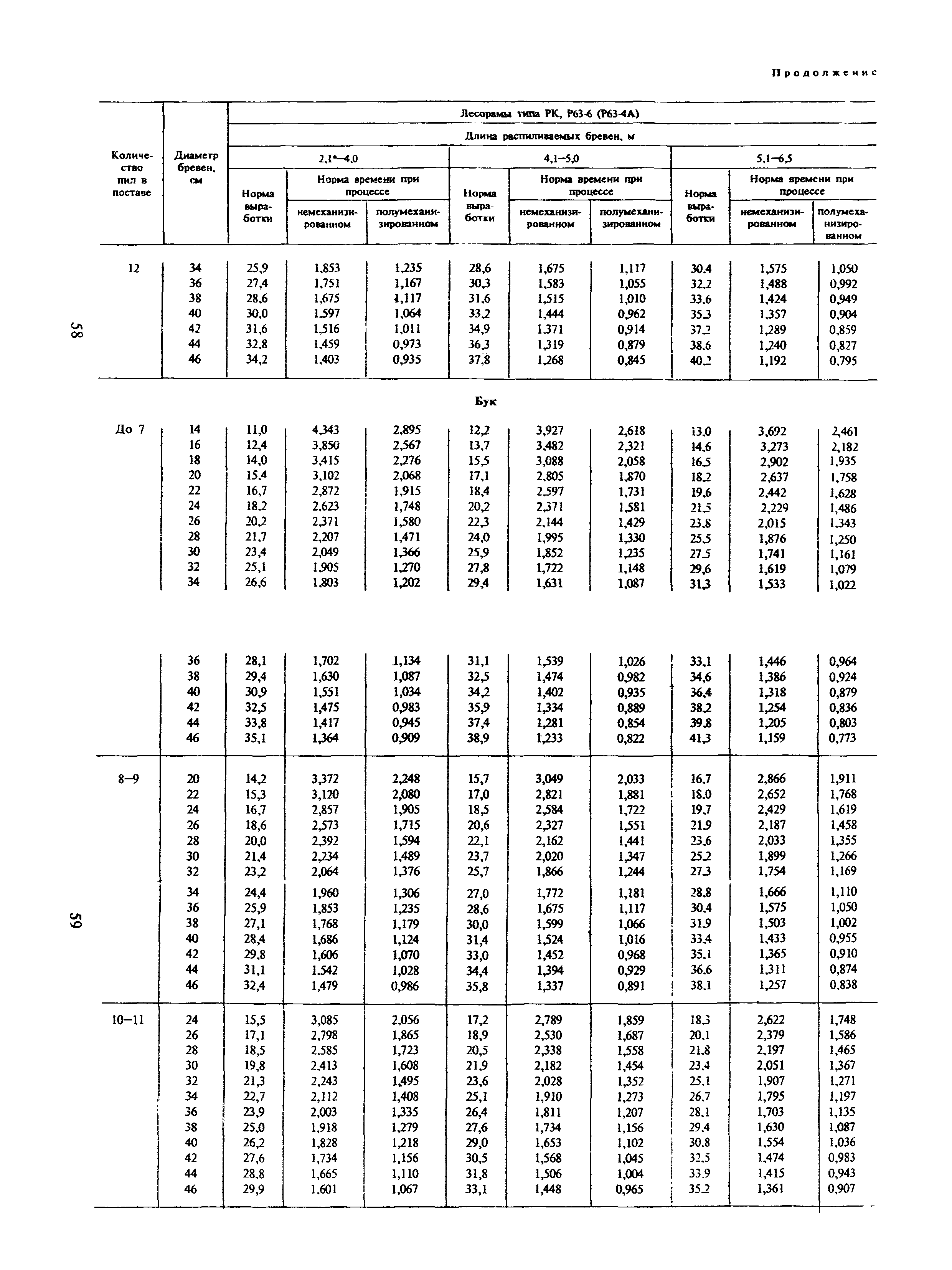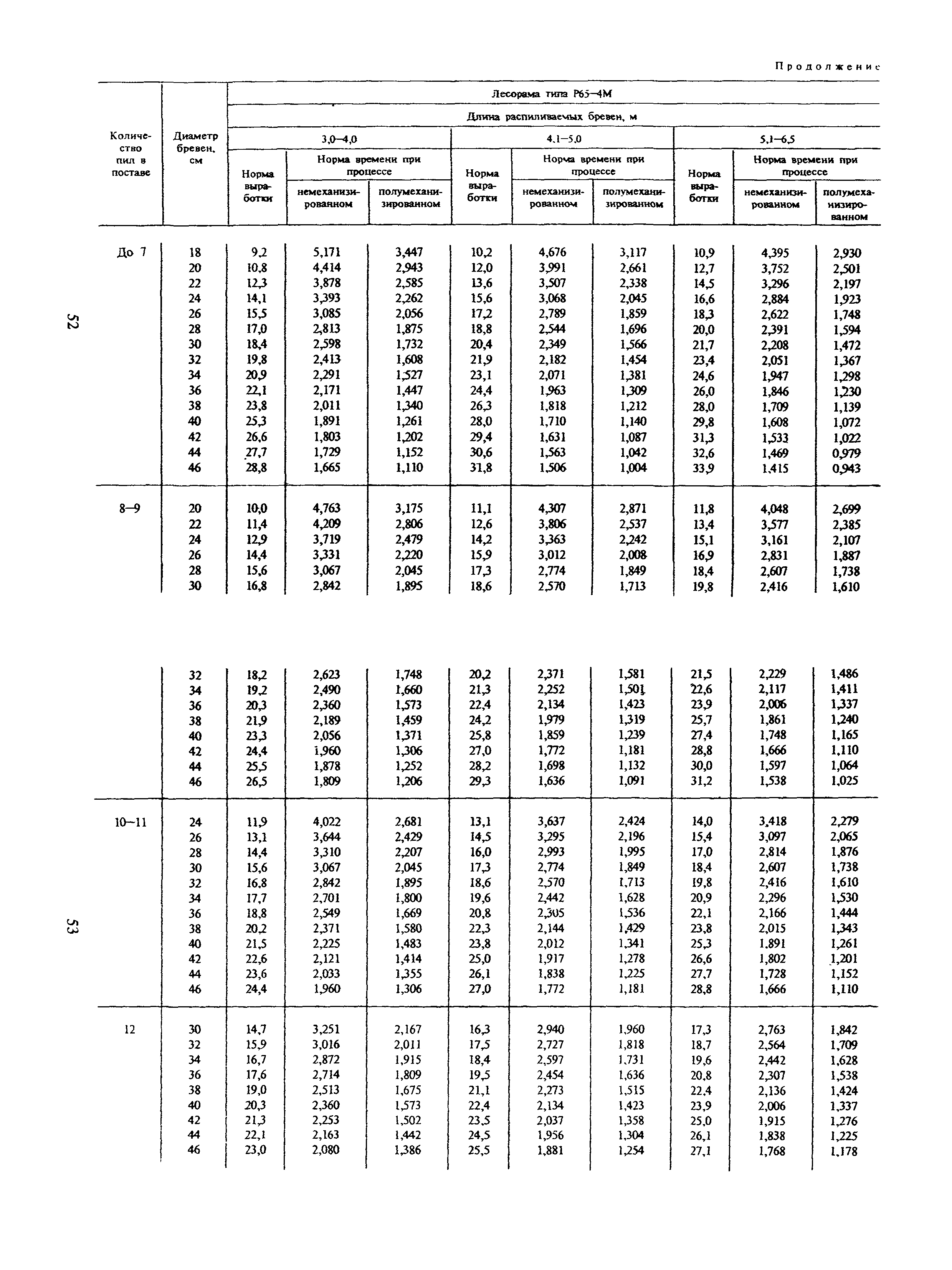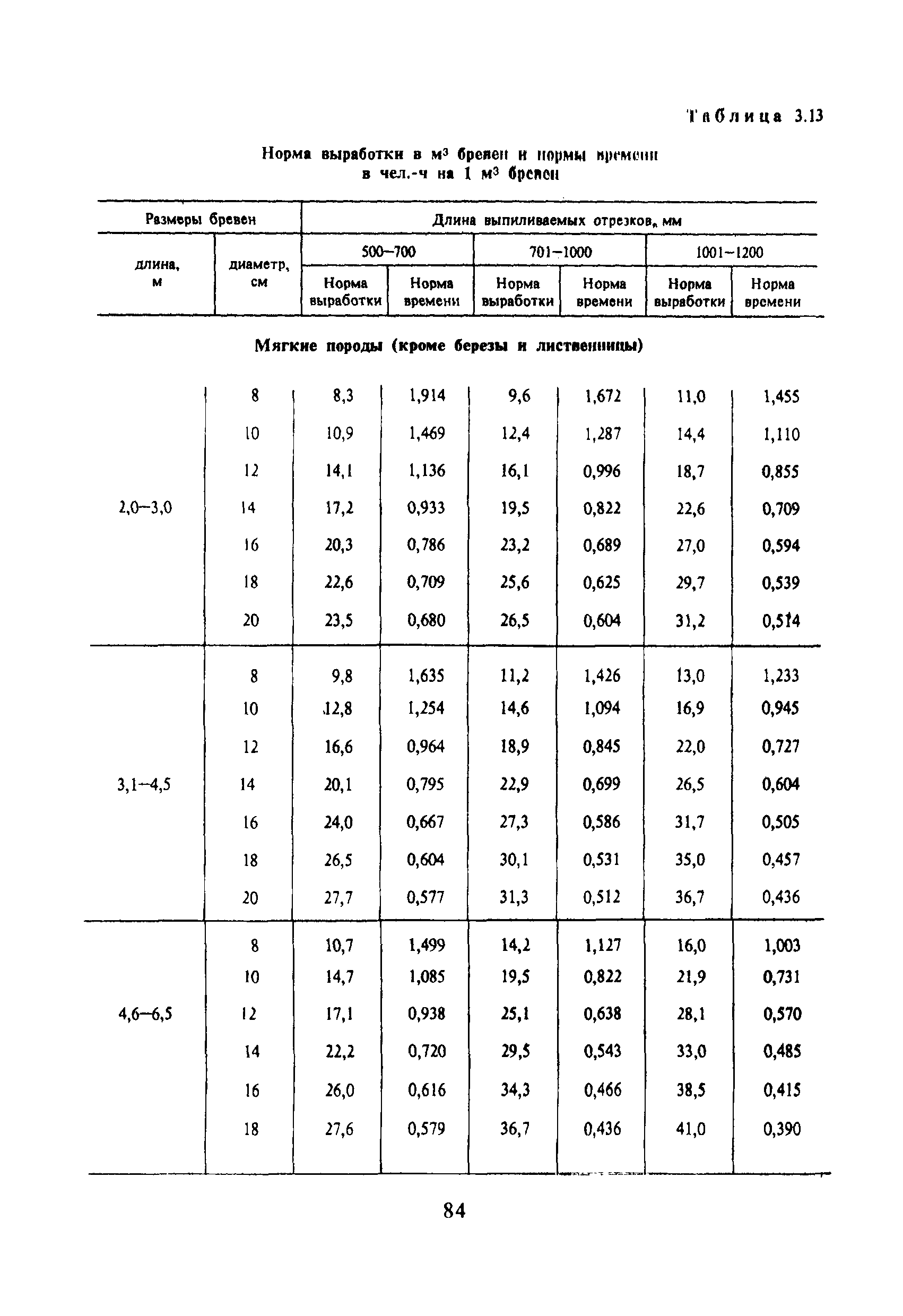 Типовые нормы выработки и времени на лесопильные работы (Работы, выполняемые на одноэтажных лесопильных рамах и круглопильных станках)| Статус: | справочные материалы, мп, тпр | | Название рус.: | Типовые нормы выработки и времени на лесопильные работы (Работы, выполняемые на одноэтажных лесопильных рамах и круглопильных станках) | | Дата добавления в базу: | 01.10.2014 | | Дата актуализации: | 01.01.2021 | | Область применения: | Типовые нормы предназначены для нормирования труда рабочих, выполняющих работы на лесопильных и тарных рамах, круглопильных станках, а также работы по перемещению, увязке и укладке сырья и изделий деревообработки, на всех предприятиях независимо от их ведомственной подчиненности | | Оглавление: | 1. Общая часть 2. Технология работы и организация труда 2.1. Переработка круглых сортиментов мягких пород 2.2. Переработка круглых сортиментов твердых пород 2.3. Переработка круглых короткомерных сортиментов 3. Нормативная часть 3.1. Нормы выработки и времени на распиловку круглых лесоматериалов на одноэтажных лесопильных рамах 3.1.1. Распиловка круглых сортиментов длиной 2,1 - 6,5 м вразвал при немеханизированном и полумеханизированном процессах лесопиления 3.1.2. Распиловка круглых сортиментов длиной 2,1 - 6,5 м на обрезные пиломатериалы при немеханизированном и полумеханизированном процессах лесопиления 3.1.3. Распиловка круглых сортиментов длиной 2,1 - 6,5 м вразвал при механизированном процессе лесопиления 3.1.4. Распиловка круглых сортиментов длиной 2,1 - 6,5 м на обрезные пиломатериалы при механизированном процессе лесопиления 3.1.5. Распиловка круглых сортиментов длиной 1 - 2 м на лесопильной раме РК 3.2. Нормы выработки и времени на поперечный раскрой древесины на круглопильных станках 3.2.1. Поперечный раскрой/круглых сортиментов на станке ЦБ-5 3.2.2. Поперечный раскрой пиломатериалов на станках типа ЦКБ-40 (ЦМЭ-3А, ЦМЭ-2), оборудованных поперечным транспортером для подачи пиломатериалов на стол станка 3.3. Нормы выработки и времени на продольный раскрой чураков на круглопильных станках 3.3.1. Продольный раскрой чураков на станке ЦДТ5-2 3.3.2. Продольный раскрой чураков на станке типа Ц2К- (Ц2К) 3.4. Нормы выработки и времени на продольный раскрой заготовок из пиломатериалов на круглопильных станках 3.4.1. Продольный раскрой необрезных пиломатериалов на станке ЦА-2 3.4.2. Продольный раскрой необрезных пиломатериалов на станках типа ЦДК4-3 (ЦДК4-2, ЦДК-4) 3.4.3. Продольный раскрой необрезных пиломатериалов на круглопильном станке ЦВП-1 3.4.4. Продольный раскрой необрезных пиломатериалов на станке типа Ц6-2 (Ц-6, Ц-5) 3.4 5. Продольный раскрой необрезных пиломатериалов на многопильных станках ЦА-2А, ЦДК5-2, ЦМ-80, ЦМ-120, ЦМР-2 3.5. Нормы выработки и времени на продольную распиловку пиломатериалов на тарной раме 3.5.1. Продольная распиловка пиломатериалов на тарных рамах РТ-2, РТ-36 3.6. Нормы выработки и времени на торцовку и поперечный раскрой заготовок кратной длины на детали на круглопильных станках 3.6.1. Пакетная торцовка деталей с одного конца на станке типа ЦПА-40 (ЦПА-2) 3.6.2. Групповой раскрой заготовок кратной длины на детали на станке ЦПА-40 3.6.3. Индивидуальный раскрой заготовок кратной длины на детали на станке Ц6-2 3.7. Нормы выработки на вспомогательные работы 3.7.1. Подача сырья в лесопильный цех вагонетками УЖД при погрузке мостовым краном 3.7.2. Подача сырья в лесопильный цех и вывозка п