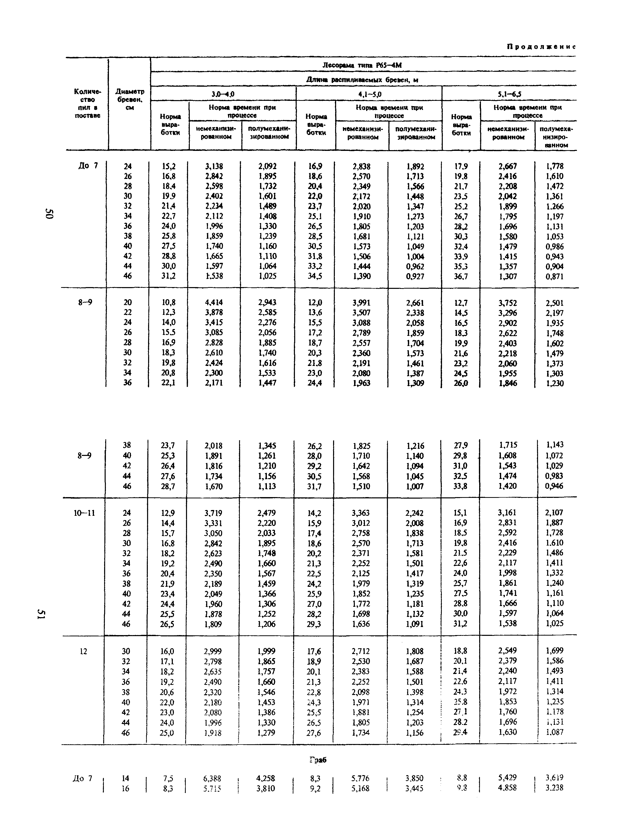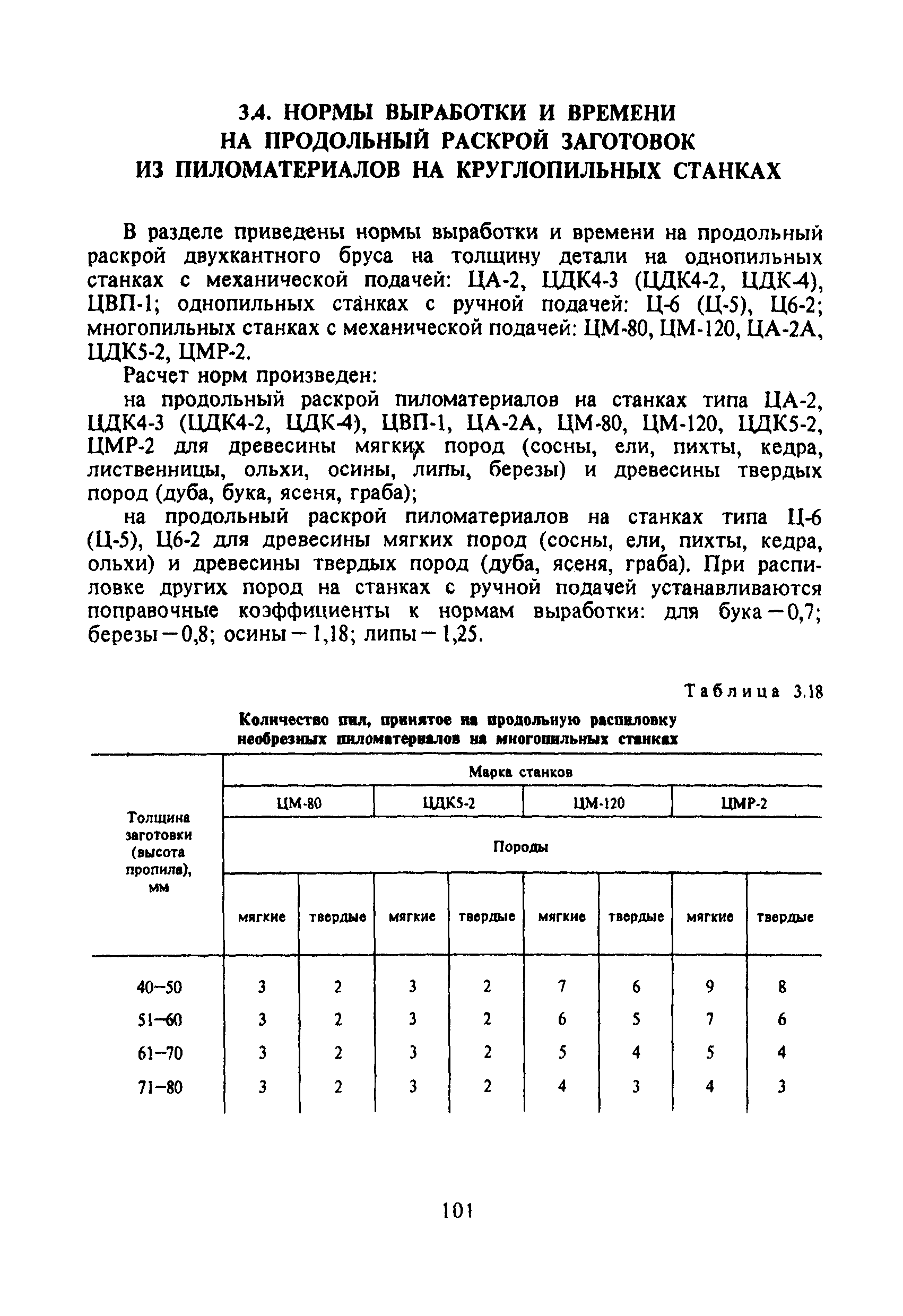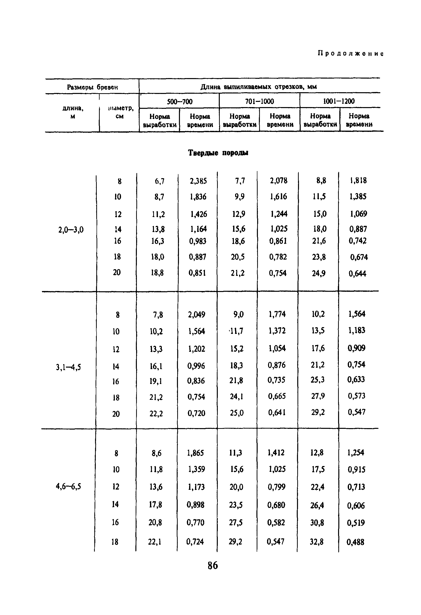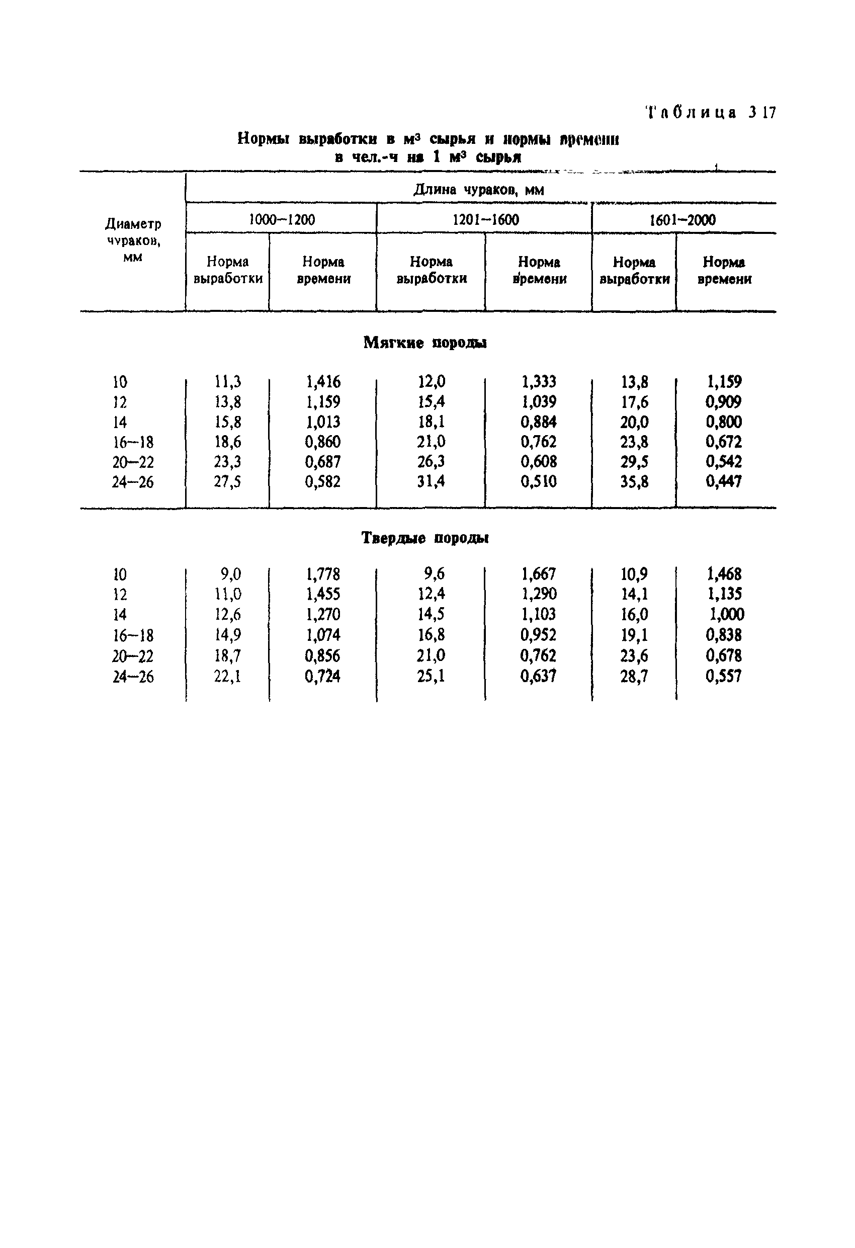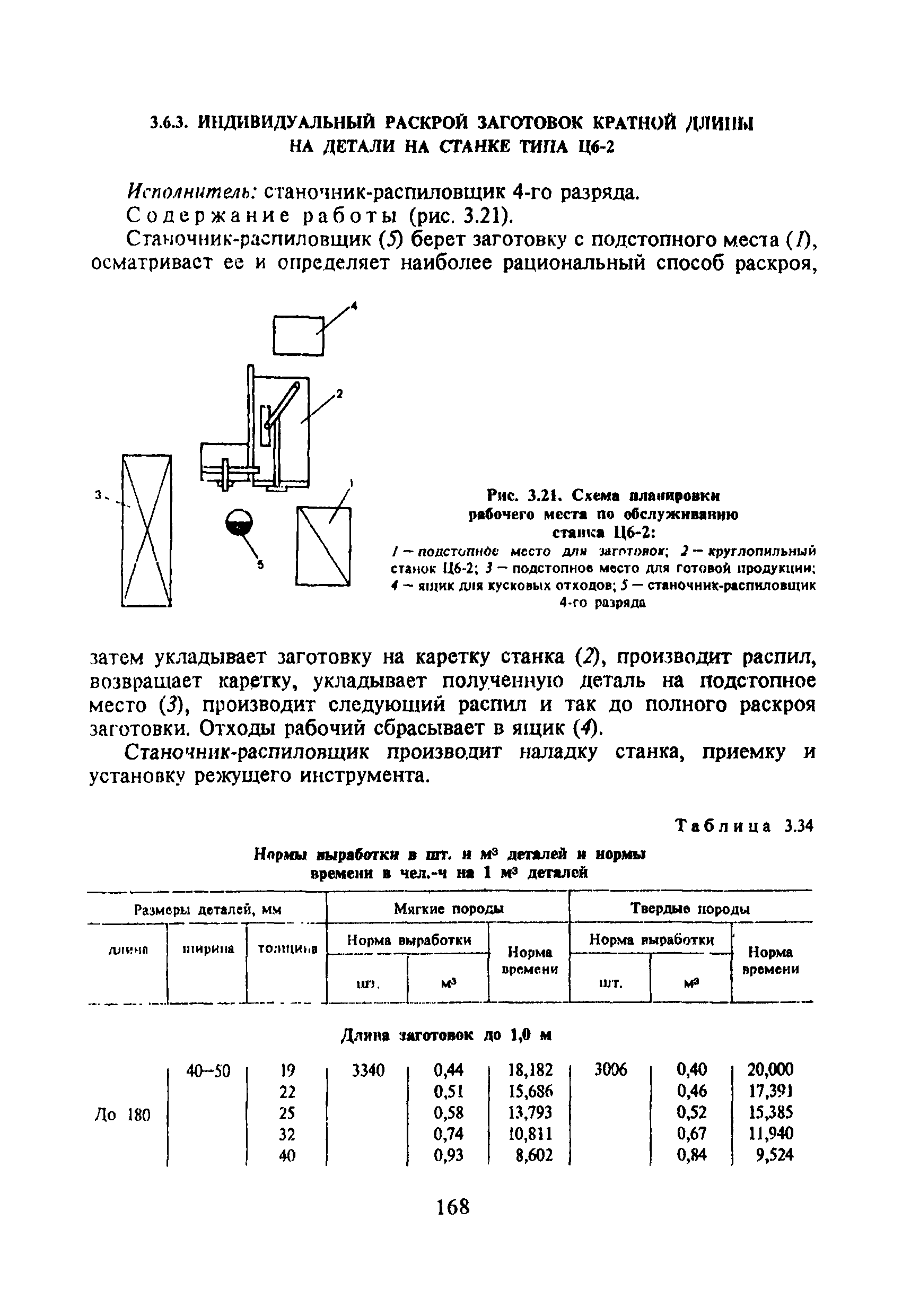 Типовые нормы выработки и времени на лесопильные работы (Работы, выполняемые на одноэтажных лесопильных рамах и круглопильных станках)| Статус: | справочные материалы, мп, тпр | | Название рус.: | Типовые нормы выработки и времени на лесопильные работы (Работы, выполняемые на одноэтажных лесопильных рамах и круглопильных станках) | | Дата добавления в базу: | 01.10.2014 | | Дата актуализации: | 01.01.2021 | | Область применения: | Типовые нормы предназначены для нормирования труда рабочих, выполняющих работы на лесопильных и тарных рамах, круглопильных станках, а также работы по перемещению, увязке и укладке сырья и изделий деревообработки, на всех предприятиях независимо от их ведомственной подчиненности | | Оглавление: | 1. Общая часть 2. Технология работы и организация труда 2.1. Переработка круглых сортиментов мягких пород 2.2. Переработка круглых сортиментов твердых пород 2.3. Переработка круглых короткомерных сортиментов 3. Нормативная часть 3.1. Нормы выработки и времени на распиловку круглых лесоматериалов на одноэтажных лесопильных рамах 3.1.1. Распиловка круглых сортиментов длиной 2,1 - 6,5 м вразвал при немеханизированном и полумеханизированном процессах лесопиления 3.1.2. Распиловка круглых сортиментов длиной 2,1 - 6,5 м на обрезные пиломатериалы при немеханизированном и полумеханизированном процессах лесопиления 3.1.3. Распиловка круглых сортиментов длиной 2,1 - 6,5 м вразвал при механизированном процессе лесопиления 3.1.4. Распиловка круглых сортиментов длиной 2,1 - 6,5 м на обрезные пиломатериалы при механизированном процессе лесопиления 3.1.5. Распиловка круглых сортиментов длиной 1 - 2 м на лесопильной раме РК 3.2. Нормы выработки и времени на поперечный раскрой древесины на круглопильных станках 3.2.1. Поперечный раскрой/круглых сортиментов на станке ЦБ-5 3.2.2. Поперечный раскрой пиломатериалов на станках типа ЦКБ-40 (ЦМЭ-3А, ЦМЭ-2), оборудованных поперечным транспортером для подачи пиломатериалов на стол станка 3.3. Нормы выработки и времени на продольный раскрой чураков на круглопильных станках 3.3.1. Продольный раскрой чураков на станке ЦДТ5-2 3.3.2. Продольный раскрой чураков на станке типа Ц2К- (Ц2К) 3.4. Нормы выработки и времени на продольный раскрой заготовок из пиломатериалов на круглопильных станках 3.4.1. Продольный раскрой необрезных пиломатериалов на станке ЦА-2 3.4.2. Продольный раскрой необрезных пиломатериалов на станках типа ЦДК4-3 (ЦДК4-2, ЦДК-4) 3.4.3. Продольный раскрой необрезных пиломатериалов на круглопильном станке ЦВП-1 3.4.4. Продольный раскрой необрезных пиломатериалов на станке типа Ц6-2 (Ц-6, Ц-5) 3.4 5. Продольный раскрой необрезных пиломатериалов на многопильных станках ЦА-2А, ЦДК5-2, ЦМ-80, ЦМ-120, ЦМР-2 3.5. Нормы выработки и времени на продольную распиловку пиломатериалов на тарной раме 3.5.1. Продольная распиловка пиломатериалов на тарных рамах РТ-2, РТ-36 3.6. Нормы выработки и времени на торцовку и поперечный раскрой заготовок кратной длины на детали на круглопильных станках 3.6.1. Пакетная торцовка деталей с одного конца на станке типа ЦПА-40 (ЦПА-2) 3.6.2. Групповой раскрой заготовок кратной длины на детали на станке ЦПА-40 3.6.3. Индивидуальный раскрой заготовок кратной длины на детали на станке Ц6-2 3.7. Нормы выработки на вспомогательные работы 3.7.1. Подача сырья в лесопильный цех вагонетками УЖД при погрузке мостовым краном 3.7.2. Подача сырья в лесопильный цех и вывозка п