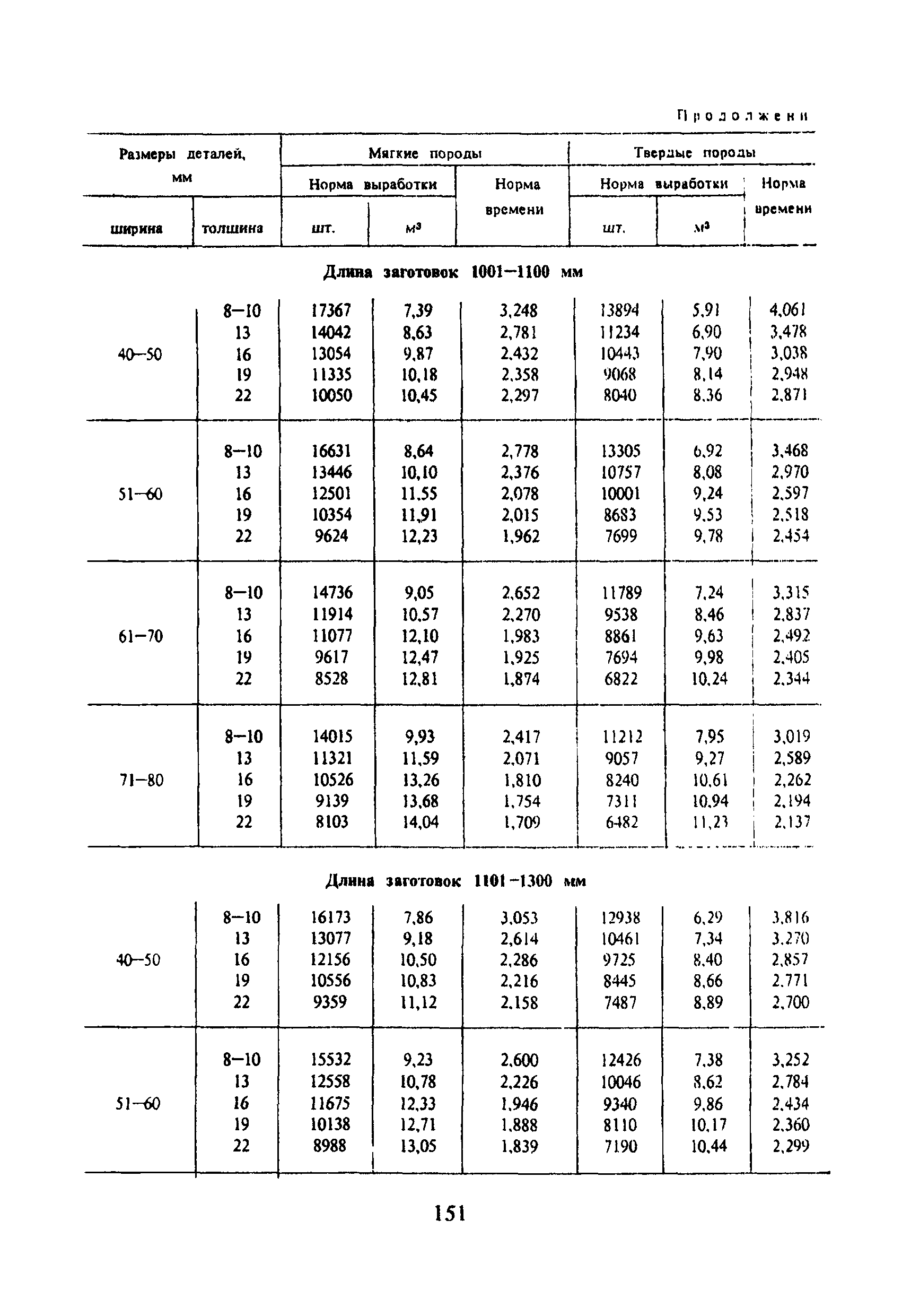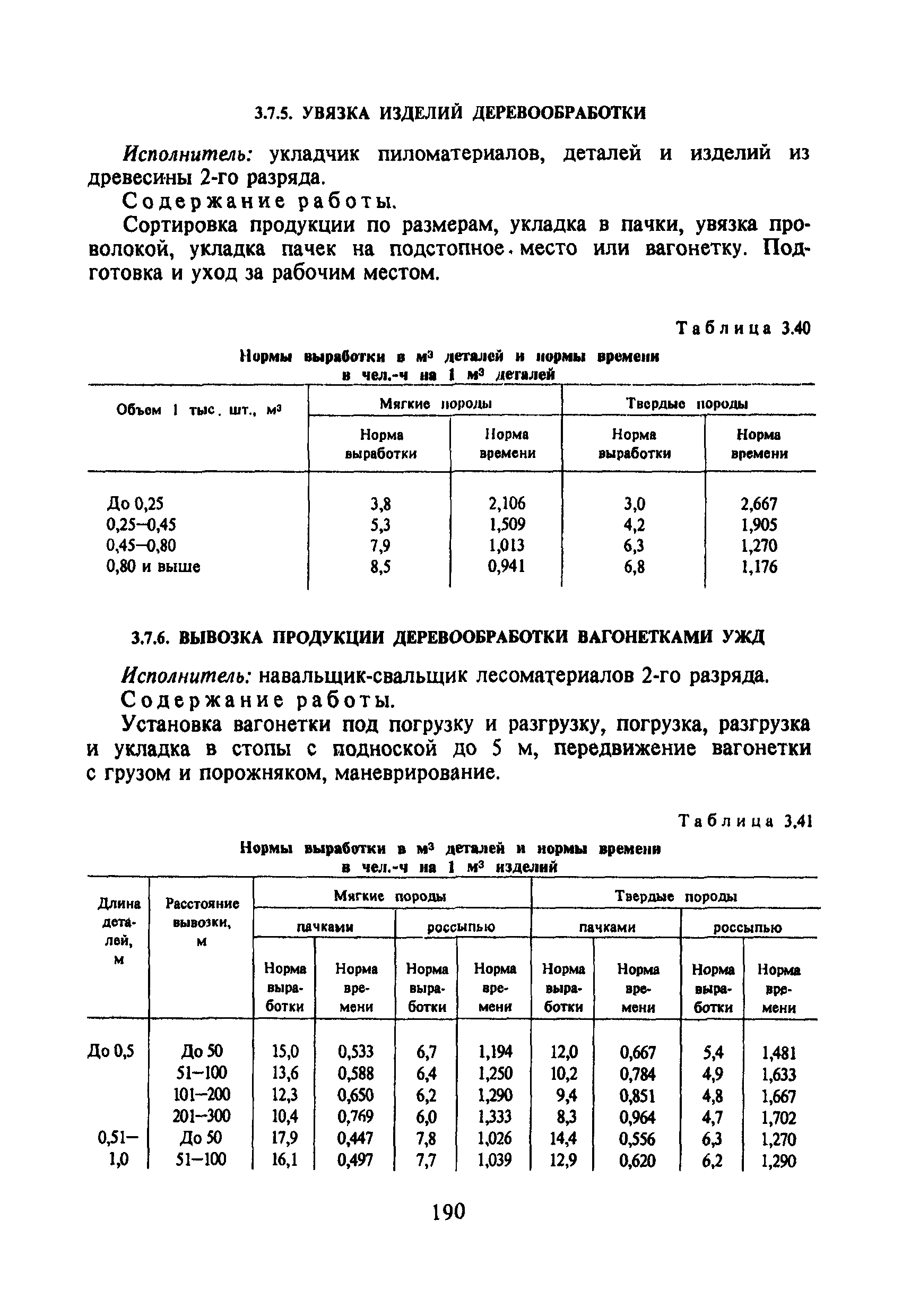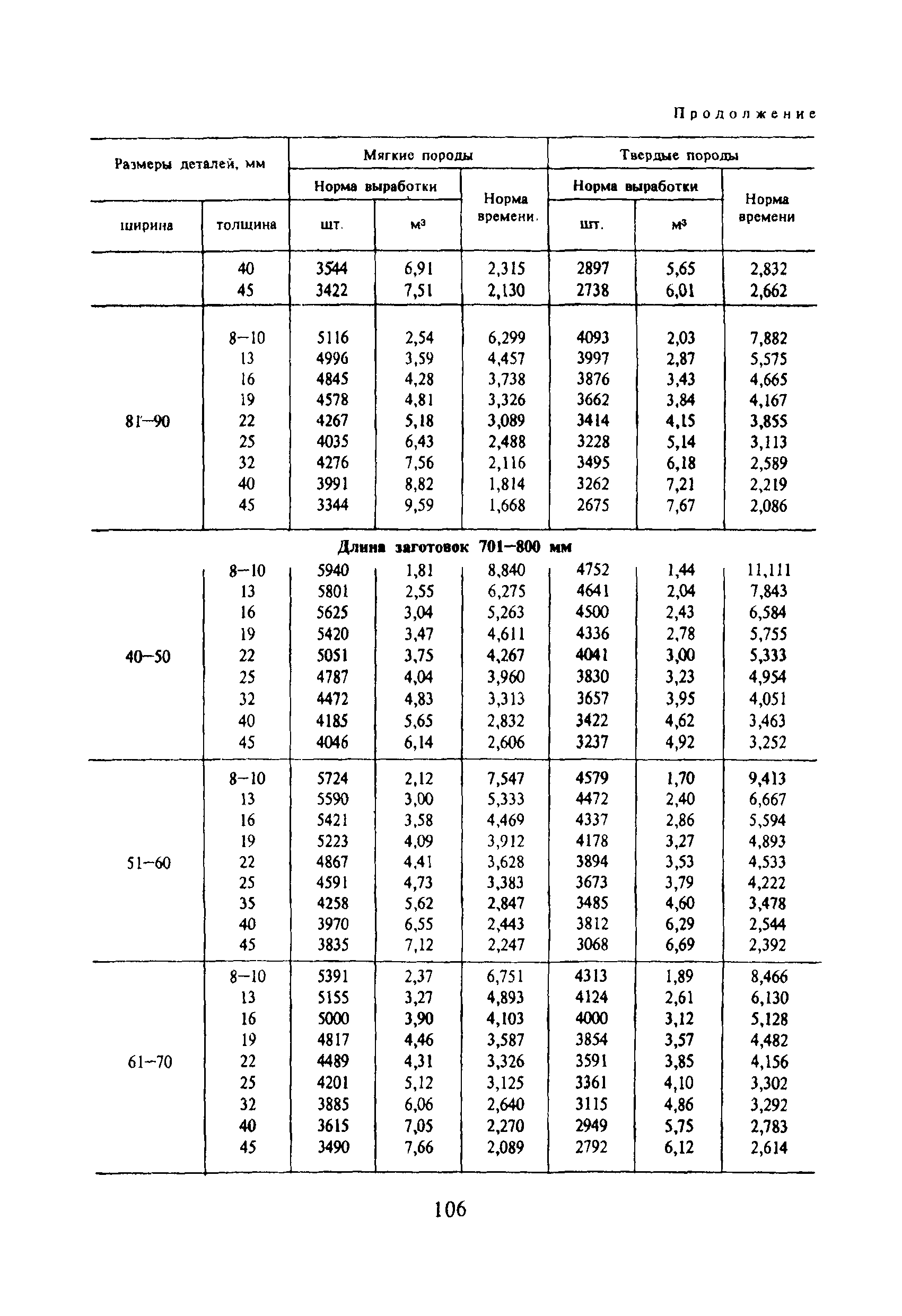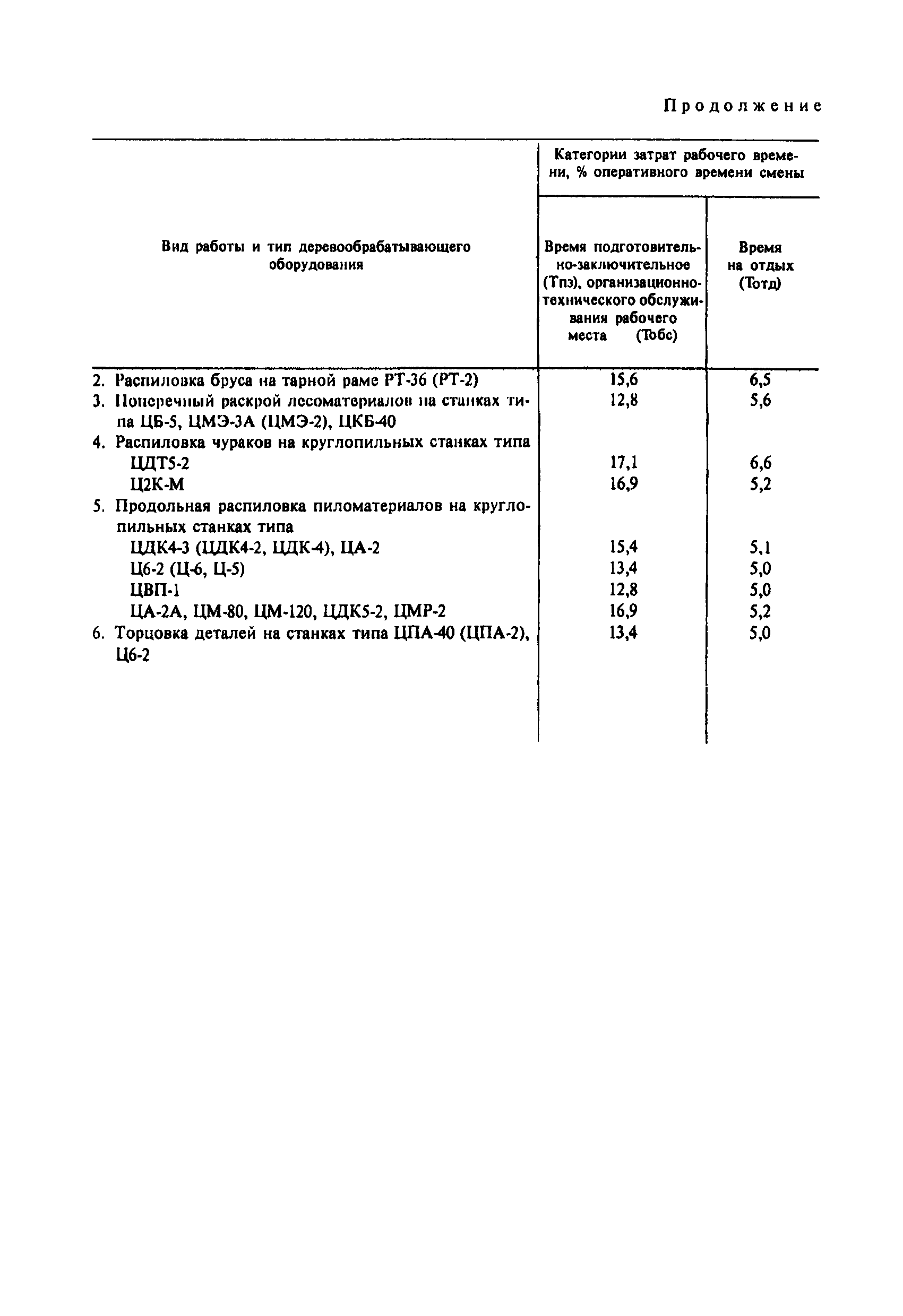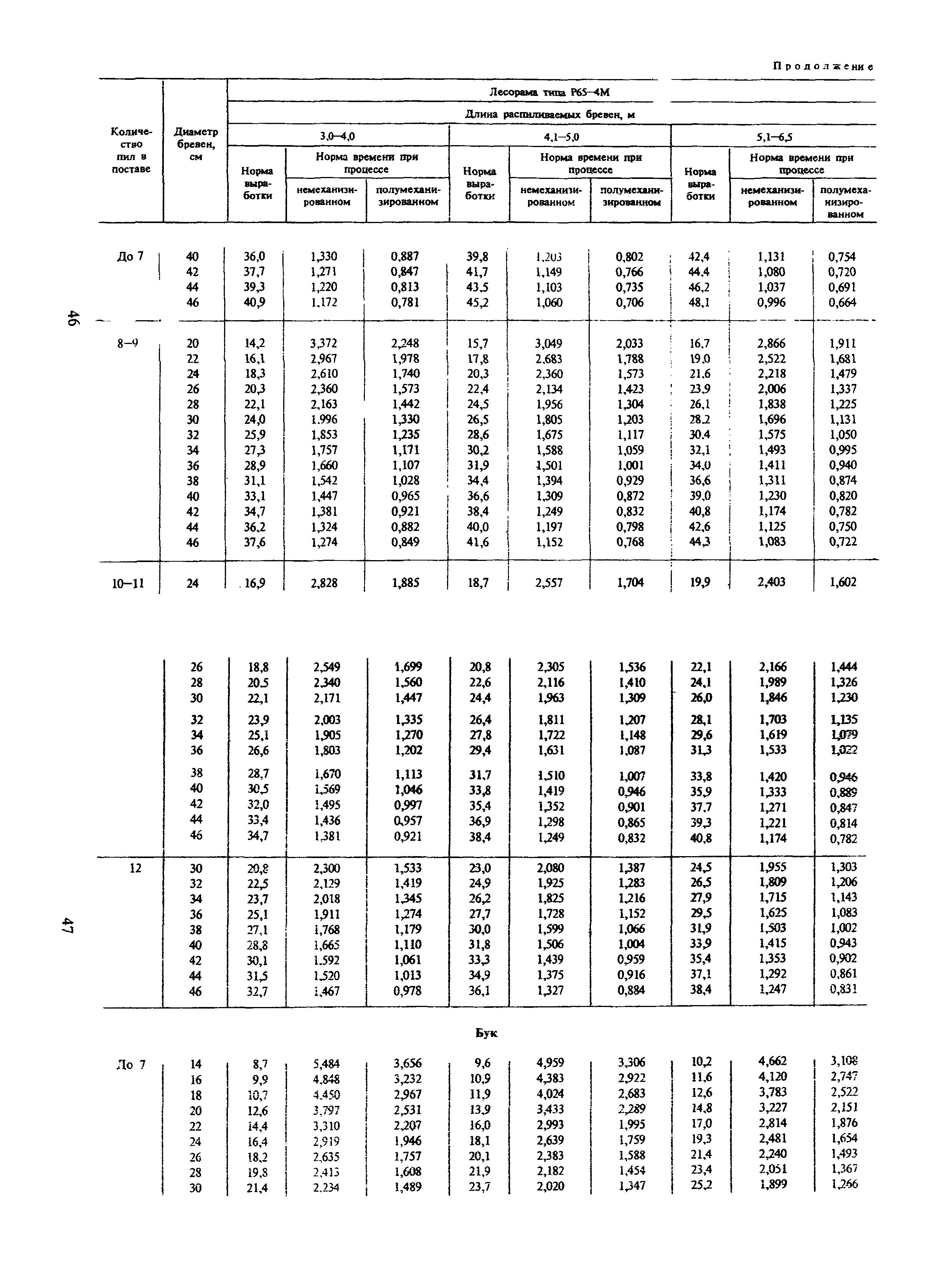 Типовые нормы выработки и времени на лесопильные работы (Работы, выполняемые на одноэтажных лесопильных рамах и круглопильных станках)| Статус: | справочные материалы, мп, тпр | | Название рус.: | Типовые нормы выработки и времени на лесопильные работы (Работы, выполняемые на одноэтажных лесопильных рамах и круглопильных станках) | | Дата добавления в базу: | 01.10.2014 | | Дата актуализации: | 01.01.2021 | | Область применения: | Типовые нормы предназначены для нормирования труда рабочих, выполняющих работы на лесопильных и тарных рамах, круглопильных станках, а также работы по перемещению, увязке и укладке сырья и изделий деревообработки, на всех предприятиях независимо от их ведомственной подчиненности | | Оглавление: | 1. Общая часть 2. Технология работы и организация труда 2.1. Переработка круглых сортиментов мягких пород 2.2. Переработка круглых сортиментов твердых пород 2.3. Переработка круглых короткомерных сортиментов 3. Нормативная часть 3.1. Нормы выработки и времени на распиловку круглых лесоматериалов на одноэтажных лесопильных рамах 3.1.1. Распиловка круглых сортиментов длиной 2,1 - 6,5 м вразвал при немеханизированном и полумеханизированном процессах лесопиления 3.1.2. Распиловка круглых сортиментов длиной 2,1 - 6,5 м на обрезные пиломатериалы при немеханизированном и полумеханизированном процессах лесопиления 3.1.3. Распиловка круглых сортиментов длиной 2,1 - 6,5 м вразвал при механизированном процессе лесопиления 3.1.4. Распиловка круглых сортиментов длиной 2,1 - 6,5 м на обрезные пиломатериалы при механизированном процессе лесопиления 3.1.5. Распиловка круглых сортиментов длиной 1 - 2 м на лесопильной раме РК 3.2. Нормы выработки и времени на поперечный раскрой древесины на круглопильных станках 3.2.1. Поперечный раскрой/круглых сортиментов на станке ЦБ-5 3.2.2. Поперечный раскрой пиломатериалов на станках типа ЦКБ-40 (ЦМЭ-3А, ЦМЭ-2), оборудованных поперечным транспортером для подачи пиломатериалов на стол станка 3.3. Нормы выработки и времени на продольный раскрой чураков на круглопильных станках 3.3.1. Продольный раскрой чураков на станке ЦДТ5-2 3.3.2. Продольный раскрой чураков на станке типа Ц2К- (Ц2К) 3.4. Нормы выработки и времени на продольный раскрой заготовок из пиломатериалов на круглопильных станках 3.4.1. Продольный раскрой необрезных пиломатериалов на станке ЦА-2 3.4.2. Продольный раскрой необрезных пиломатериалов на станках типа ЦДК4-3 (ЦДК4-2, ЦДК-4) 3.4.3. Продольный раскрой необрезных пиломатериалов на круглопильном станке ЦВП-1 3.4.4. Продольный раскрой необрезных пиломатериалов на станке типа Ц6-2 (Ц-6, Ц-5) 3.4 5. Продольный раскрой необрезных пиломатериалов на многопильных станках ЦА-2А, ЦДК5-2, ЦМ-80, ЦМ-120, ЦМР-2 3.5. Нормы выработки и времени на продольную распиловку пиломатериалов на тарной раме 3.5.1. Продольная распиловка пиломатериалов на тарных рамах РТ-2, РТ-36 3.6. Нормы выработки и времени на торцовку и поперечный раскрой заготовок кратной длины на детали на круглопильных станках 3.6.1. Пакетная торцовка деталей с одного конца на станке типа ЦПА-40 (ЦПА-2) 3.6.2. Групповой раскрой заготовок кратной длины на детали на станке ЦПА-40 3.6.3. Индивидуальный раскрой заготовок кратной длины на детали на станке Ц6-2 3.7. Нормы выработки на вспомогательные работы 3.7.1. Подача сырья в лесопильный цех вагонетками УЖД при погрузке мостовым краном 3.7.2. Подача сырья в лесопильный цех и вывозка п