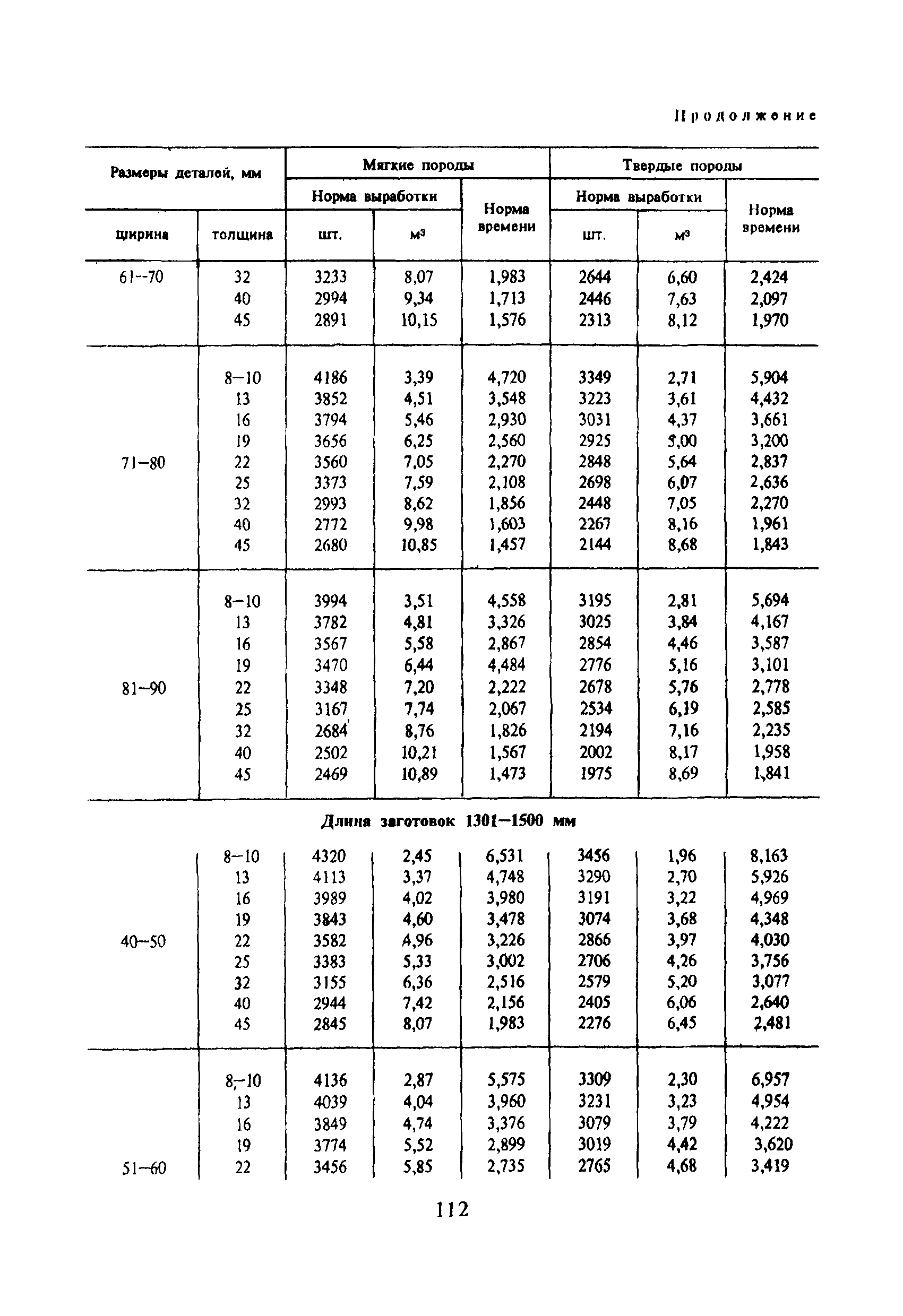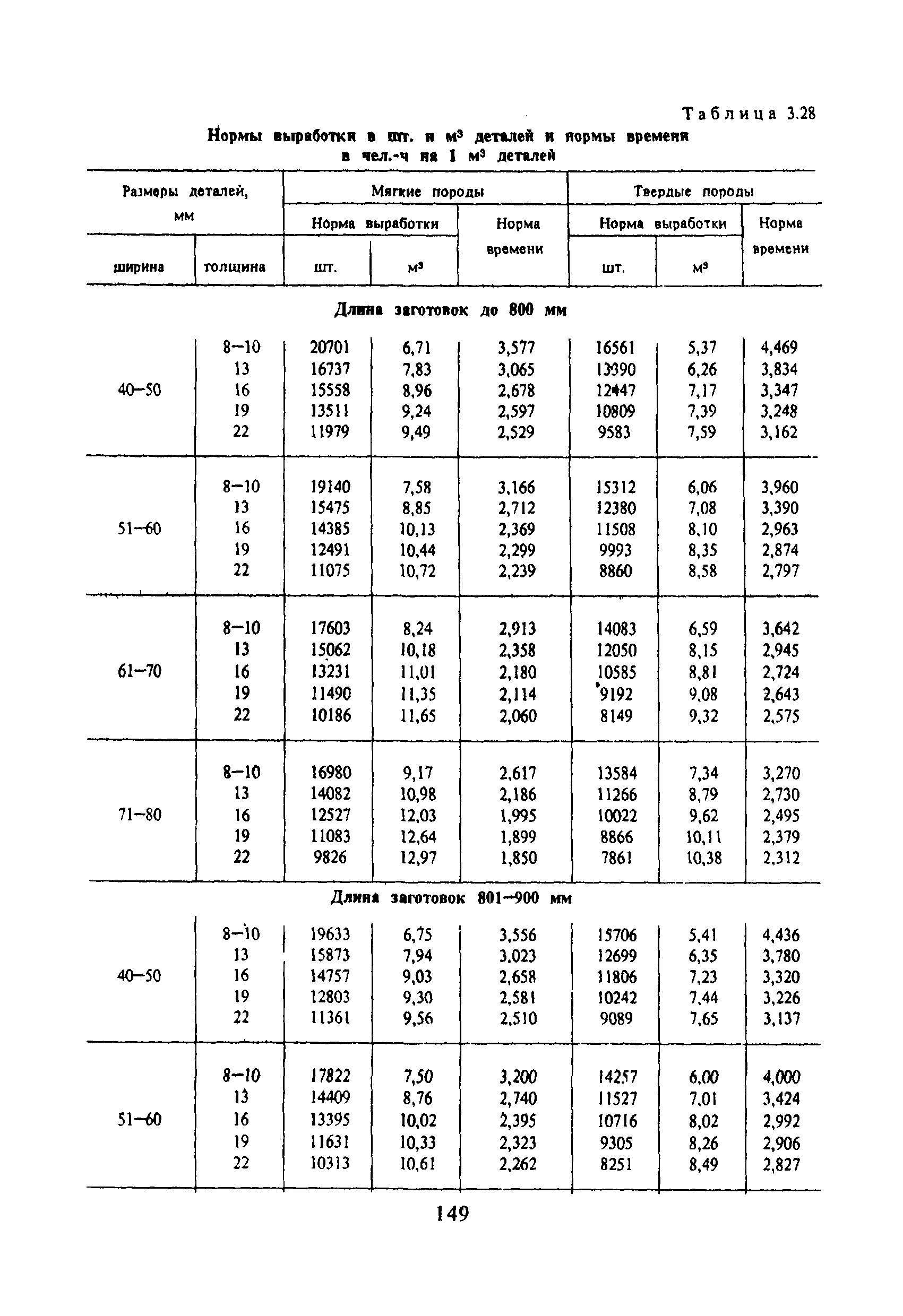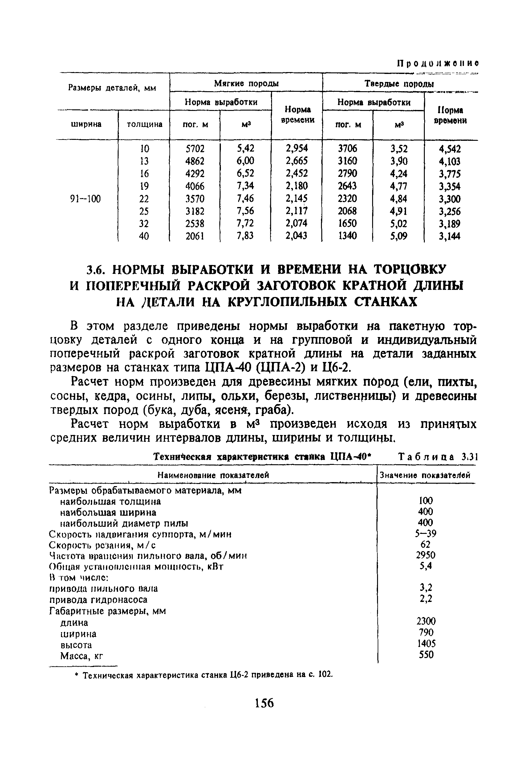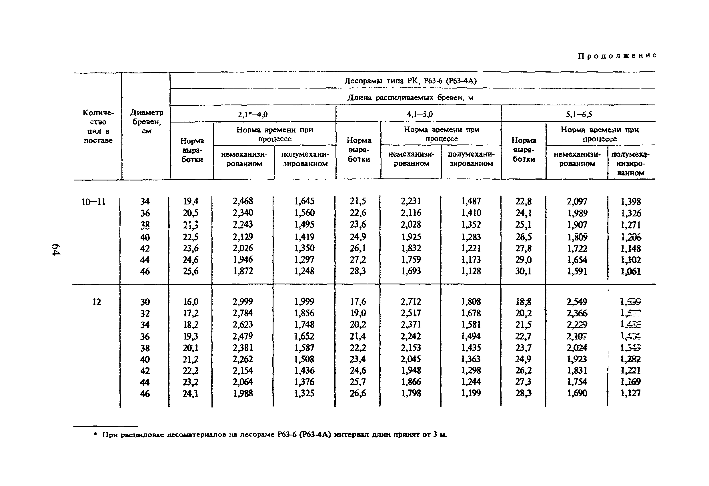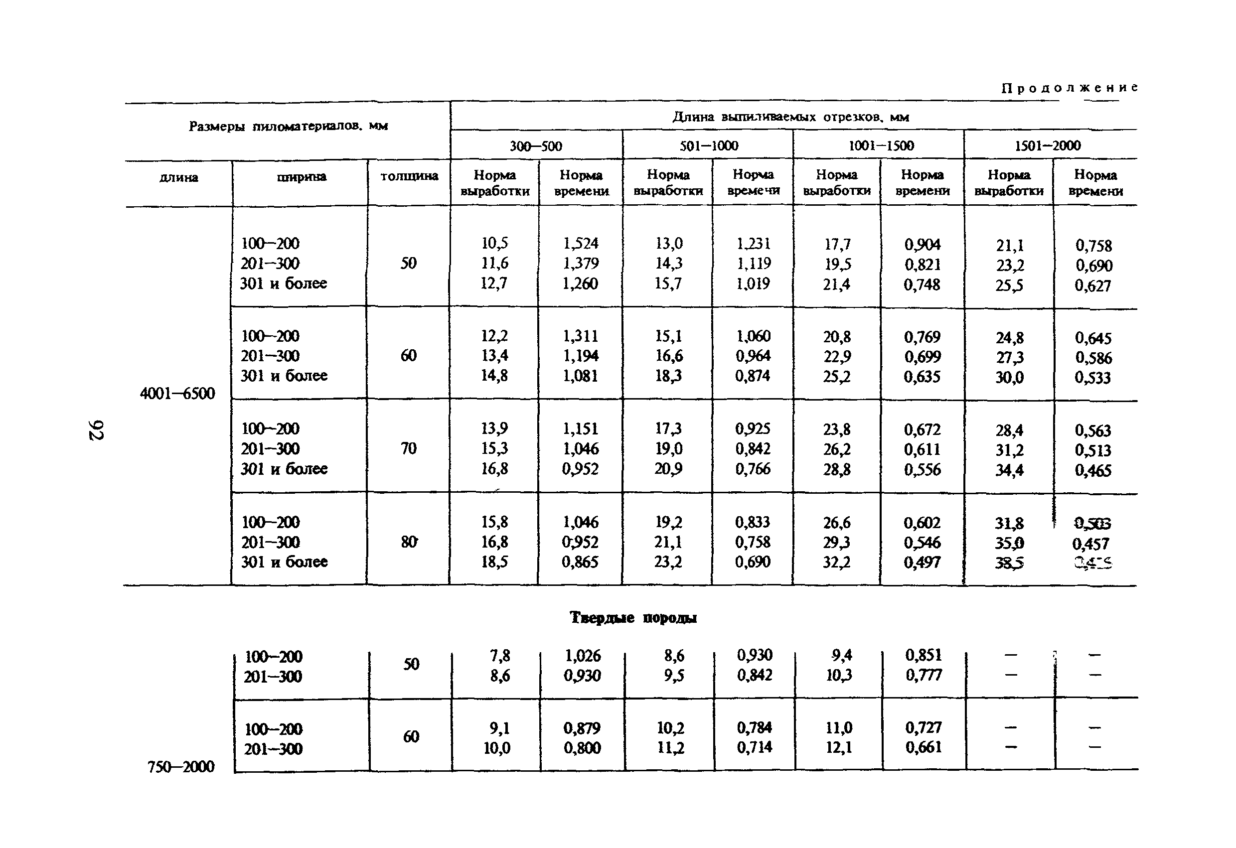 Типовые нормы выработки и времени на лесопильные работы (Работы, выполняемые на одноэтажных лесопильных рамах и круглопильных станках)| Статус: | справочные материалы, мп, тпр | | Название рус.: | Типовые нормы выработки и времени на лесопильные работы (Работы, выполняемые на одноэтажных лесопильных рамах и круглопильных станках) | | Дата добавления в базу: | 01.10.2014 | | Дата актуализации: | 01.01.2021 | | Область применения: | Типовые нормы предназначены для нормирования труда рабочих, выполняющих работы на лесопильных и тарных рамах, круглопильных станках, а также работы по перемещению, увязке и укладке сырья и изделий деревообработки, на всех предприятиях независимо от их ведомственной подчиненности | | Оглавление: | 1. Общая часть 2. Технология работы и организация труда 2.1. Переработка круглых сортиментов мягких пород 2.2. Переработка круглых сортиментов твердых пород 2.3. Переработка круглых короткомерных сортиментов 3. Нормативная часть 3.1. Нормы выработки и времени на распиловку круглых лесоматериалов на одноэтажных лесопильных рамах 3.1.1. Распиловка круглых сортиментов длиной 2,1 - 6,5 м вразвал при немеханизированном и полумеханизированном процессах лесопиления 3.1.2. Распиловка круглых сортиментов длиной 2,1 - 6,5 м на обрезные пиломатериалы при немеханизированном и полумеханизированном процессах лесопиления 3.1.3. Распиловка круглых сортиментов длиной 2,1 - 6,5 м вразвал при механизированном процессе лесопиления 3.1.4. Распиловка круглых сортиментов длиной 2,1 - 6,5 м на обрезные пиломатериалы при механизированном процессе лесопиления 3.1.5. Распиловка круглых сортиментов длиной 1 - 2 м на лесопильной раме РК 3.2. Нормы выработки и времени на поперечный раскрой древесины на круглопильных станках 3.2.1. Поперечный раскрой/круглых сортиментов на станке ЦБ-5 3.2.2. Поперечный раскрой пиломатериалов на станках типа ЦКБ-40 (ЦМЭ-3А, ЦМЭ-2), оборудованных поперечным транспортером для подачи пиломатериалов на стол станка 3.3. Нормы выработки и времени на продольный раскрой чураков на круглопильных станках 3.3.1. Продольный раскрой чураков на станке ЦДТ5-2 3.3.2. Продольный раскрой чураков на станке типа Ц2К- (Ц2К) 3.4. Нормы выработки и времени на продольный раскрой заготовок из пиломатериалов на круглопильных станках 3.4.1. Продольный раскрой необрезных пиломатериалов на станке ЦА-2 3.4.2. Продольный раскрой необрезных пиломатериалов на станках типа ЦДК4-3 (ЦДК4-2, ЦДК-4) 3.4.3. Продольный раскрой необрезных пиломатериалов на круглопильном станке ЦВП-1 3.4.4. Продольный раскрой необрезных пиломатериалов на станке типа Ц6-2 (Ц-6, Ц-5) 3.4 5. Продольный раскрой необрезных пиломатериалов на многопильных станках ЦА-2А, ЦДК5-2, ЦМ-80, ЦМ-120, ЦМР-2 3.5. Нормы выработки и времени на продольную распиловку пиломатериалов на тарной раме 3.5.1. Продольная распиловка пиломатериалов на тарных рамах РТ-2, РТ-36 3.6. Нормы выработки и времени на торцовку и поперечный раскрой заготовок кратной длины на детали на круглопильных станках 3.6.1. Пакетная торцовка деталей с одного конца на станке типа ЦПА-40 (ЦПА-2) 3.6.2. Групповой раскрой заготовок кратной длины на детали на станке ЦПА-40 3.6.3. Индивидуальный раскрой заготовок кратной длины на детали на станке Ц6-2 3.7. Нормы выработки на вспомогательные работы 3.7.1. Подача сырья в лесопильный цех вагонетками УЖД при погрузке мостовым краном 3.7.2. Подача сырья в лесопильный цех и вывозка п