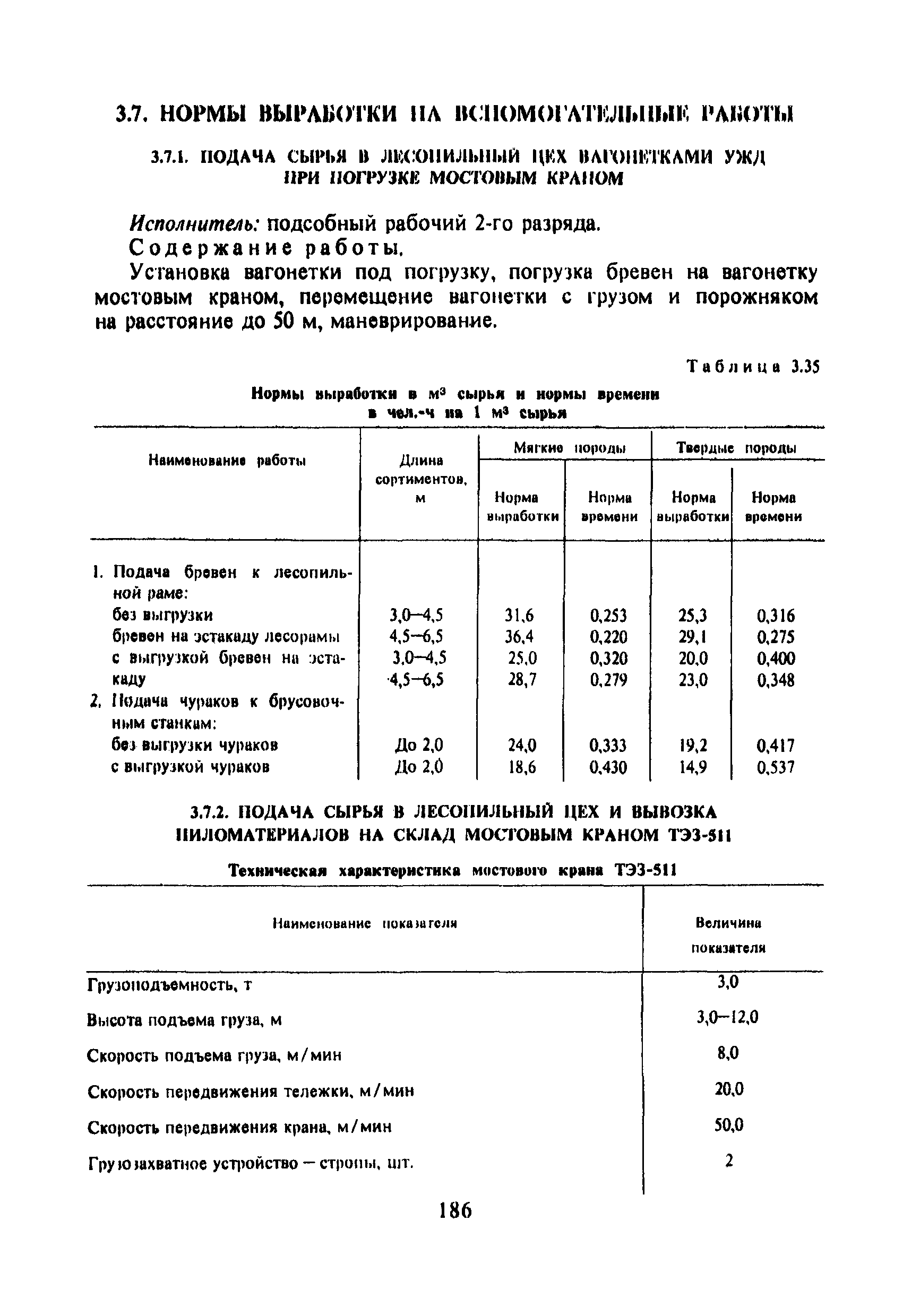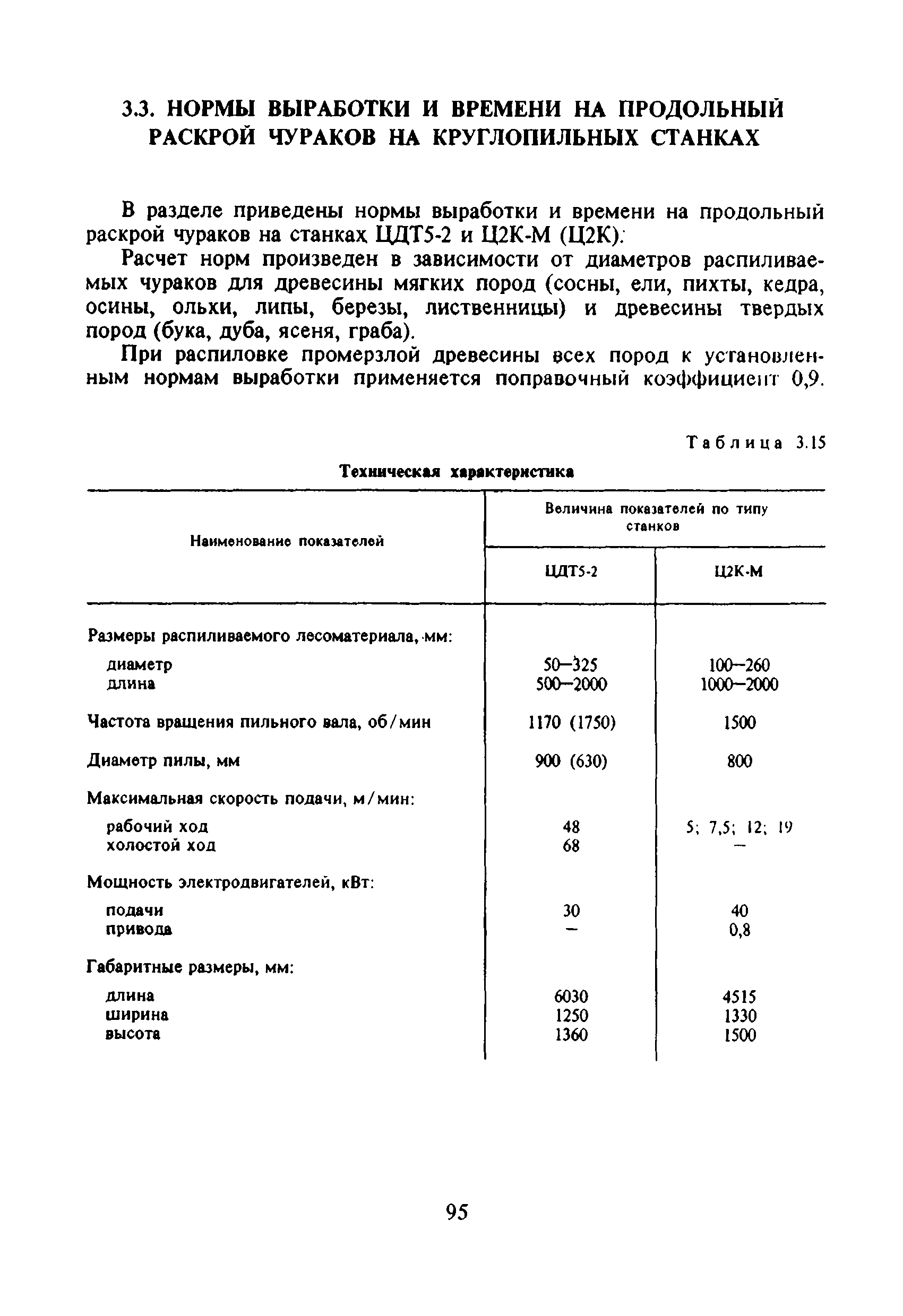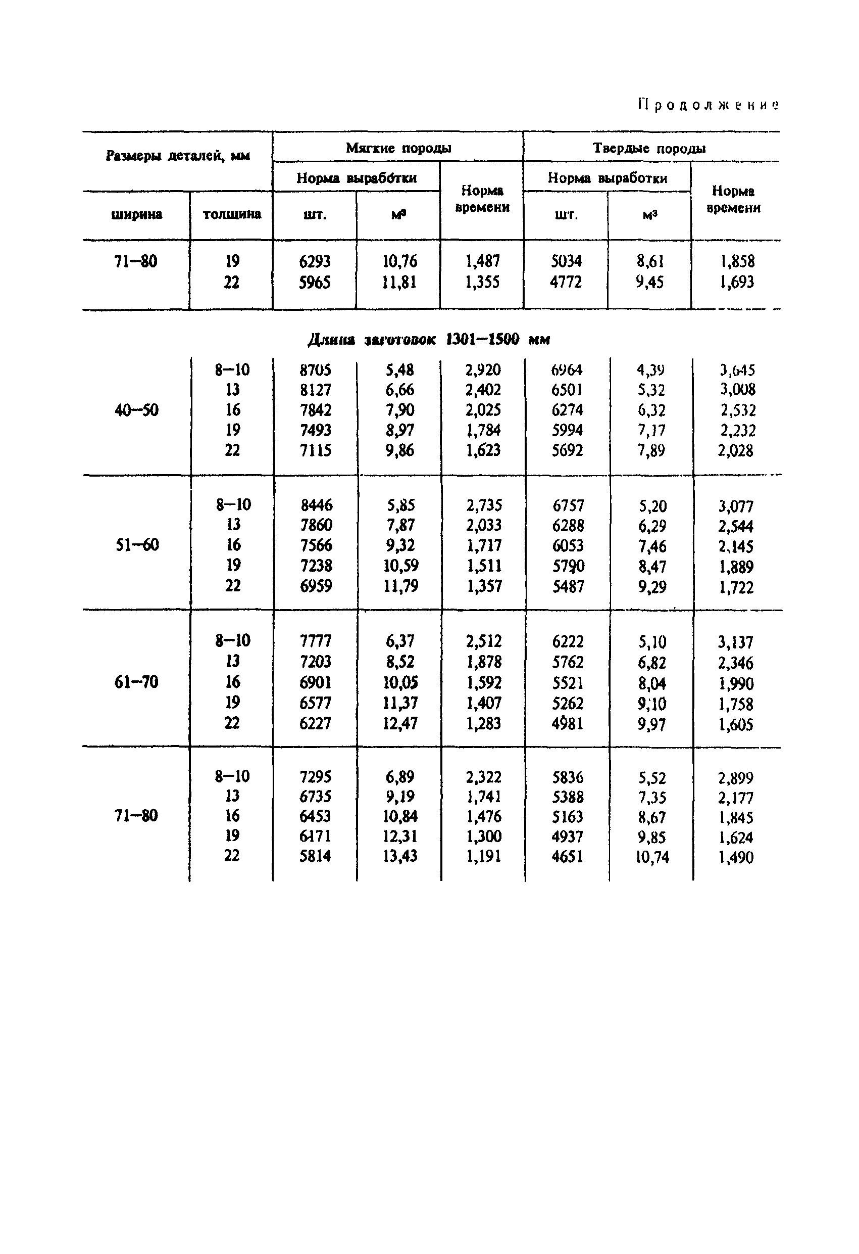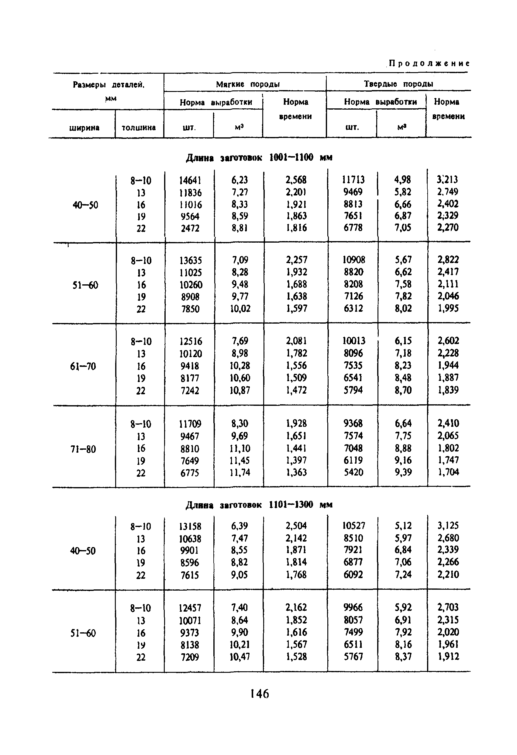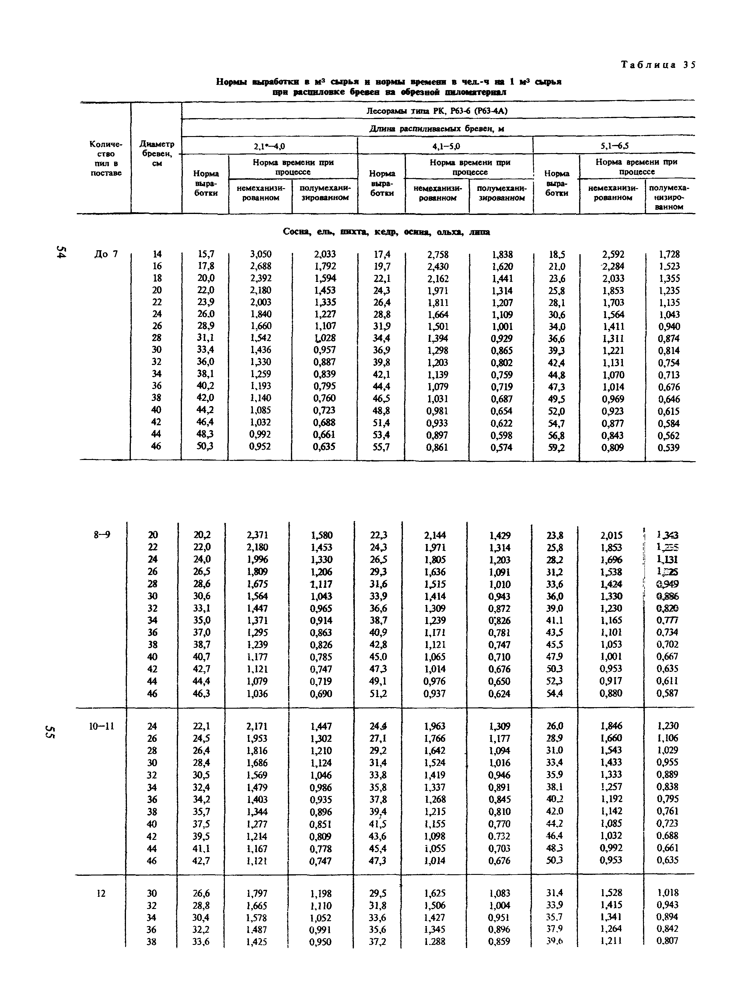 Типовые нормы выработки и времени на лесопильные работы (Работы, выполняемые на одноэтажных лесопильных рамах и круглопильных станках)| Статус: | справочные материалы, мп, тпр | | Название рус.: | Типовые нормы выработки и времени на лесопильные работы (Работы, выполняемые на одноэтажных лесопильных рамах и круглопильных станках) | | Дата добавления в базу: | 01.10.2014 | | Дата актуализации: | 01.01.2021 | | Область применения: | Типовые нормы предназначены для нормирования труда рабочих, выполняющих работы на лесопильных и тарных рамах, круглопильных станках, а также работы по перемещению, увязке и укладке сырья и изделий деревообработки, на всех предприятиях независимо от их ведомственной подчиненности | | Оглавление: | 1. Общая часть 2. Технология работы и организация труда 2.1. Переработка круглых сортиментов мягких пород 2.2. Переработка круглых сортиментов твердых пород 2.3. Переработка круглых короткомерных сортиментов 3. Нормативная часть 3.1. Нормы выработки и времени на распиловку круглых лесоматериалов на одноэтажных лесопильных рамах 3.1.1. Распиловка круглых сортиментов длиной 2,1 - 6,5 м вразвал при немеханизированном и полумеханизированном процессах лесопиления 3.1.2. Распиловка круглых сортиментов длиной 2,1 - 6,5 м на обрезные пиломатериалы при немеханизированном и полумеханизированном процессах лесопиления 3.1.3. Распиловка круглых сортиментов длиной 2,1 - 6,5 м вразвал при механизированном процессе лесопиления 3.1.4. Распиловка круглых сортиментов длиной 2,1 - 6,5 м на обрезные пиломатериалы при механизированном процессе лесопиления 3.1.5. Распиловка круглых сортиментов длиной 1 - 2 м на лесопильной раме РК 3.2. Нормы выработки и времени на поперечный раскрой древесины на круглопильных станках 3.2.1. Поперечный раскрой/круглых сортиментов на станке ЦБ-5 3.2.2. Поперечный раскрой пиломатериалов на станках типа ЦКБ-40 (ЦМЭ-3А, ЦМЭ-2), оборудованных поперечным транспортером для подачи пиломатериалов на стол станка 3.3. Нормы выработки и времени на продольный раскрой чураков на круглопильных станках 3.3.1. Продольный раскрой чураков на станке ЦДТ5-2 3.3.2. Продольный раскрой чураков на станке типа Ц2К- (Ц2К) 3.4. Нормы выработки и времени на продольный раскрой заготовок из пиломатериалов на круглопильных станках 3.4.1. Продольный раскрой необрезных пиломатериалов на станке ЦА-2 3.4.2. Продольный раскрой необрезных пиломатериалов на станках типа ЦДК4-3 (ЦДК4-2, ЦДК-4) 3.4.3. Продольный раскрой необрезных пиломатериалов на круглопильном станке ЦВП-1 3.4.4. Продольный раскрой необрезных пиломатериалов на станке типа Ц6-2 (Ц-6, Ц-5) 3.4 5. Продольный раскрой необрезных пиломатериалов на многопильных станках ЦА-2А, ЦДК5-2, ЦМ-80, ЦМ-120, ЦМР-2 3.5. Нормы выработки и времени на продольную распиловку пиломатериалов на тарной раме 3.5.1. Продольная распиловка пиломатериалов на тарных рамах РТ-2, РТ-36 3.6. Нормы выработки и времени на торцовку и поперечный раскрой заготовок кратной длины на детали на круглопильных станках 3.6.1. Пакетная торцовка деталей с одного конца на станке типа ЦПА-40 (ЦПА-2) 3.6.2. Групповой раскрой заготовок кратной длины на детали на станке ЦПА-40 3.6.3. Индивидуальный раскрой заготовок кратной длины на детали на станке Ц6-2 3.7. Нормы выработки на вспомогательные работы 3.7.1. Подача сырья в лесопильный цех вагонетками УЖД при погрузке мостовым краном 3.7.2. Подача сырья в лесопильный цех и вывозка п