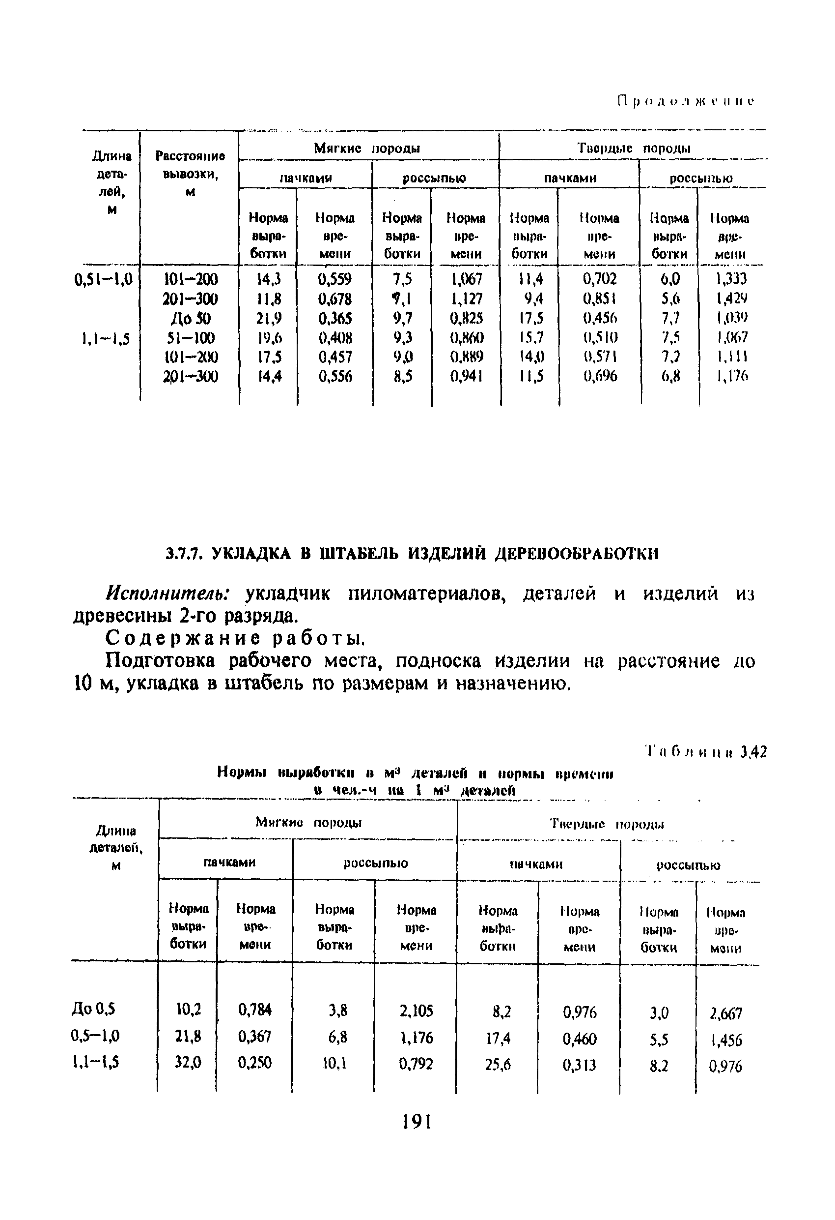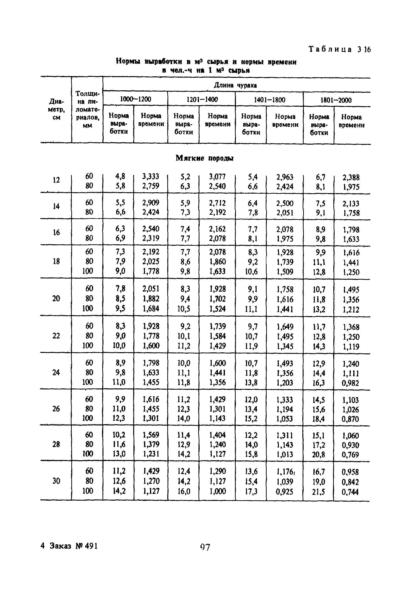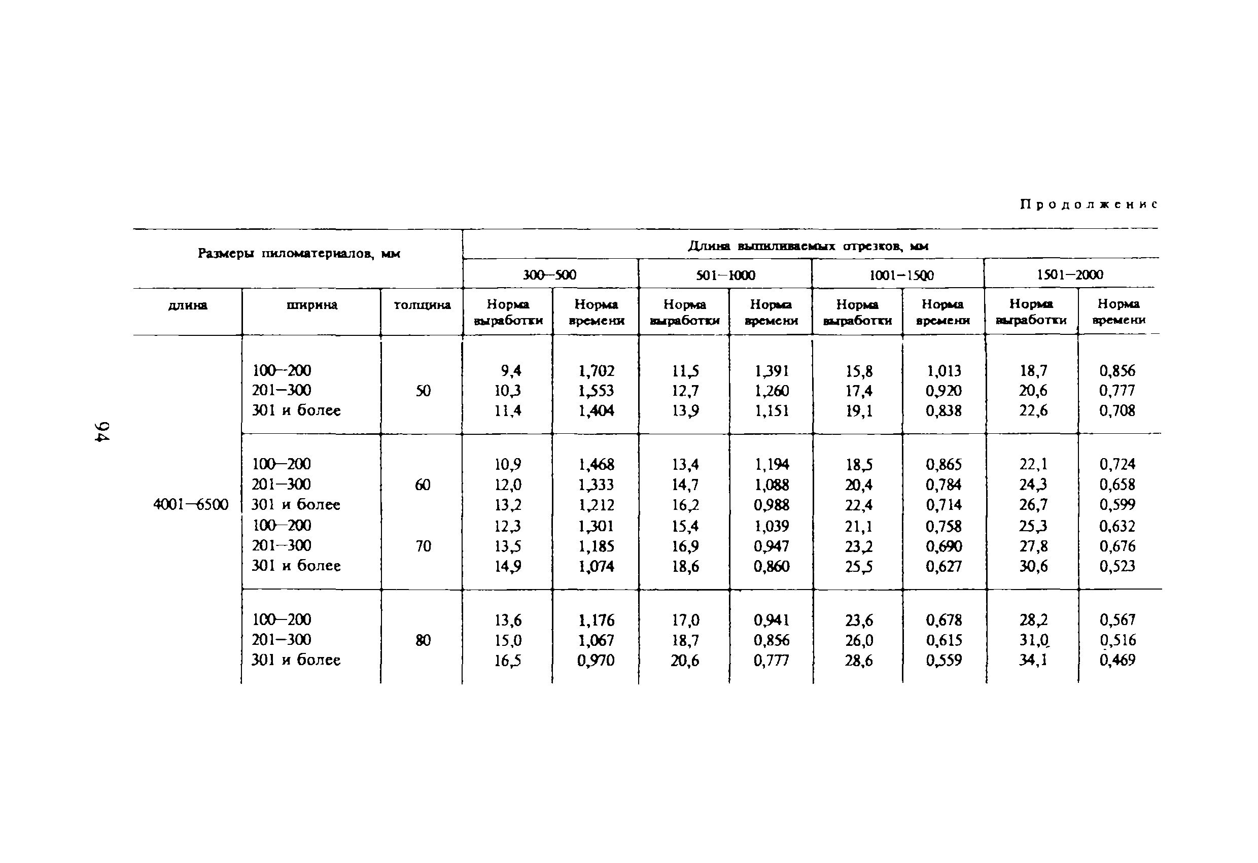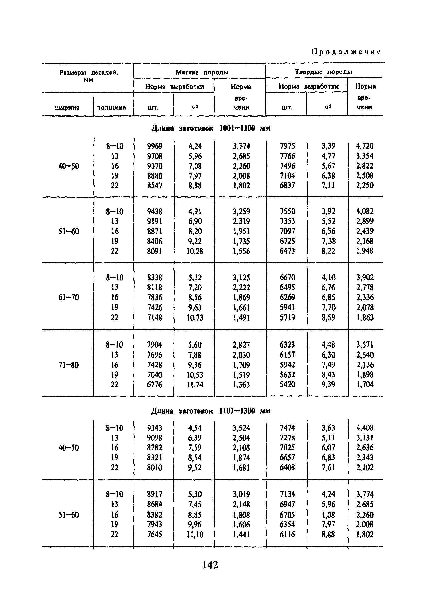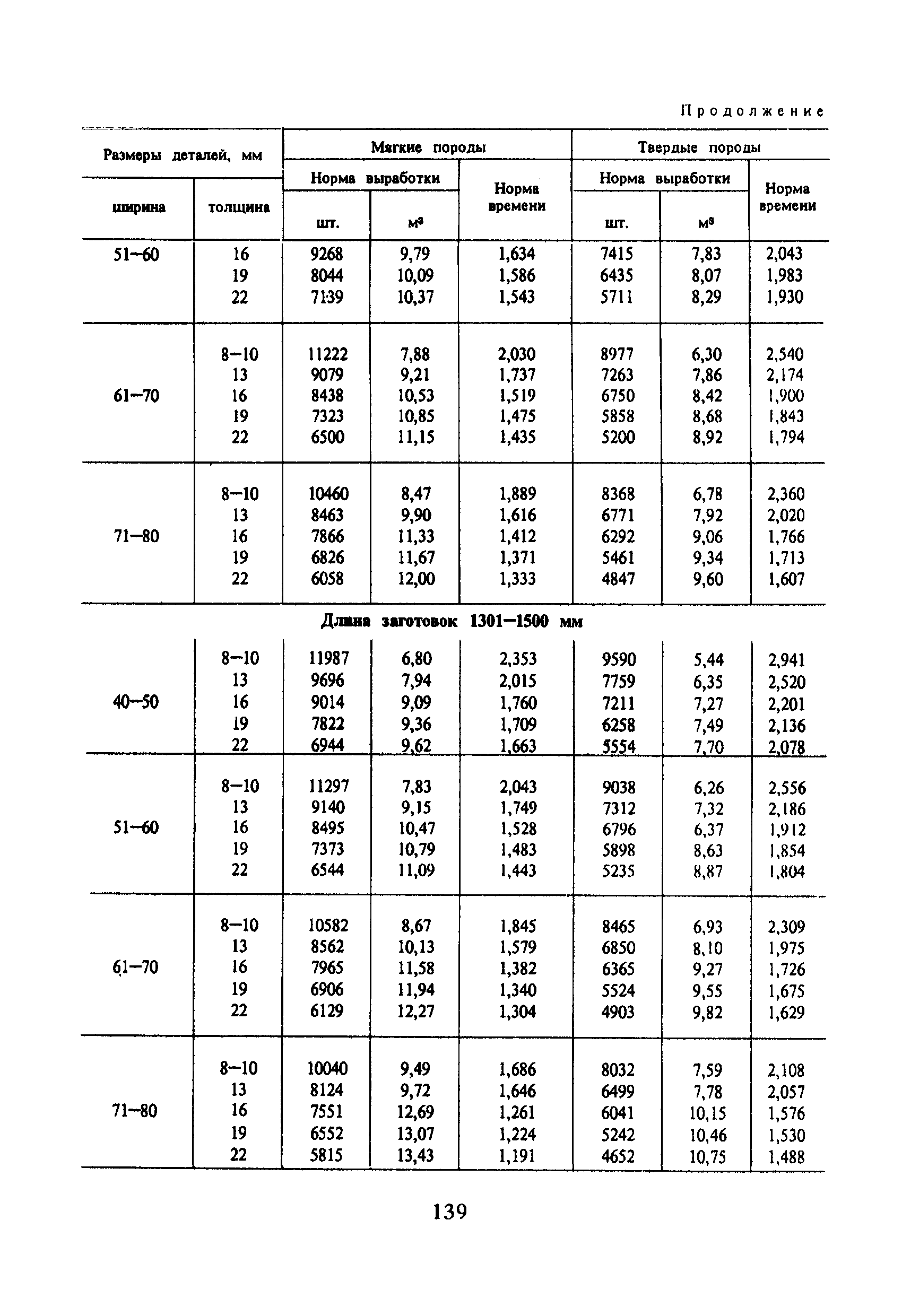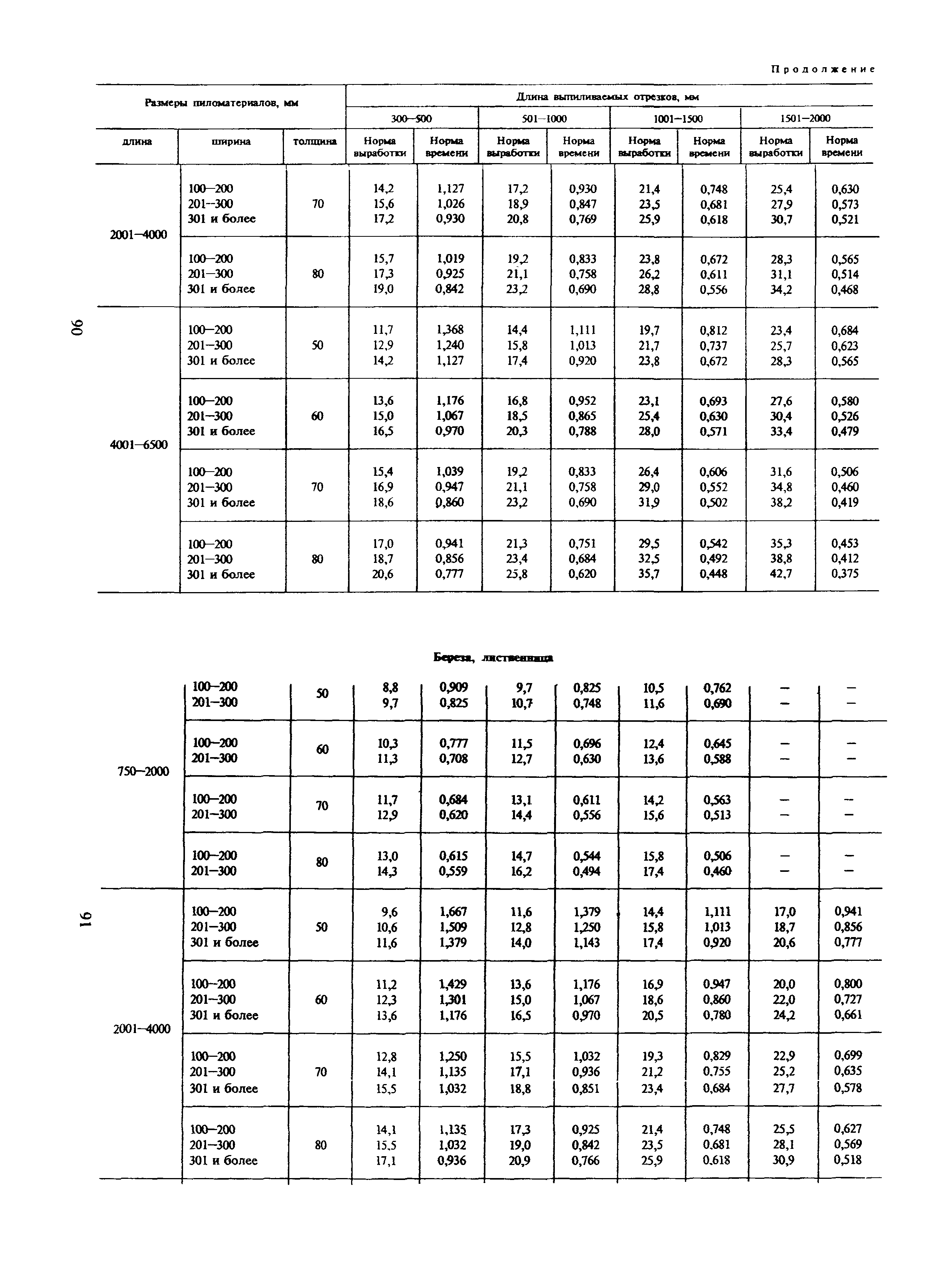 Типовые нормы выработки и времени на лесопильные работы (Работы, выполняемые на одноэтажных лесопильных рамах и круглопильных станках)| Статус: | справочные материалы, мп, тпр | | Название рус.: | Типовые нормы выработки и времени на лесопильные работы (Работы, выполняемые на одноэтажных лесопильных рамах и круглопильных станках) | | Дата добавления в базу: | 01.10.2014 | | Дата актуализации: | 01.01.2021 | | Область применения: | Типовые нормы предназначены для нормирования труда рабочих, выполняющих работы на лесопильных и тарных рамах, круглопильных станках, а также работы по перемещению, увязке и укладке сырья и изделий деревообработки, на всех предприятиях независимо от их ведомственной подчиненности | | Оглавление: | 1. Общая часть 2. Технология работы и организация труда 2.1. Переработка круглых сортиментов мягких пород 2.2. Переработка круглых сортиментов твердых пород 2.3. Переработка круглых короткомерных сортиментов 3. Нормативная часть 3.1. Нормы выработки и времени на распиловку круглых лесоматериалов на одноэтажных лесопильных рамах 3.1.1. Распиловка круглых сортиментов длиной 2,1 - 6,5 м вразвал при немеханизированном и полумеханизированном процессах лесопиления 3.1.2. Распиловка круглых сортиментов длиной 2,1 - 6,5 м на обрезные пиломатериалы при немеханизированном и полумеханизированном процессах лесопиления 3.1.3. Распиловка круглых сортиментов длиной 2,1 - 6,5 м вразвал при механизированном процессе лесопиления 3.1.4. Распиловка круглых сортиментов длиной 2,1 - 6,5 м на обрезные пиломатериалы при механизированном процессе лесопиления 3.1.5. Распиловка круглых сортиментов длиной 1 - 2 м на лесопильной раме РК 3.2. Нормы выработки и времени на поперечный раскрой древесины на круглопильных станках 3.2.1. Поперечный раскрой/круглых сортиментов на станке ЦБ-5 3.2.2. Поперечный раскрой пиломатериалов на станках типа ЦКБ-40 (ЦМЭ-3А, ЦМЭ-2), оборудованных поперечным транспортером для подачи пиломатериалов на стол станка 3.3. Нормы выработки и времени на продольный раскрой чураков на круглопильных станках 3.3.1. Продольный раскрой чураков на станке ЦДТ5-2 3.3.2. Продольный раскрой чураков на станке типа Ц2К- (Ц2К) 3.4. Нормы выработки и времени на продольный раскрой заготовок из пиломатериалов на круглопильных станках 3.4.1. Продольный раскрой необрезных пиломатериалов на станке ЦА-2 3.4.2. Продольный раскрой необрезных пиломатериалов на станках типа ЦДК4-3 (ЦДК4-2, ЦДК-4) 3.4.3. Продольный раскрой необрезных пиломатериалов на круглопильном станке ЦВП-1 3.4.4. Продольный раскрой необрезных пиломатериалов на станке типа Ц6-2 (Ц-6, Ц-5) 3.4 5. Продольный раскрой необрезных пиломатериалов на многопильных станках ЦА-2А, ЦДК5-2, ЦМ-80, ЦМ-120, ЦМР-2 3.5. Нормы выработки и времени на продольную распиловку пиломатериалов на тарной раме 3.5.1. Продольная распиловка пиломатериалов на тарных рамах РТ-2, РТ-36 3.6. Нормы выработки и времени на торцовку и поперечный раскрой заготовок кратной длины на детали на круглопильных станках 3.6.1. Пакетная торцовка деталей с одного конца на станке типа ЦПА-40 (ЦПА-2) 3.6.2. Групповой раскрой заготовок кратной длины на детали на станке ЦПА-40 3.6.3. Индивидуальный раскрой заготовок кратной длины на детали на станке Ц6-2 3.7. Нормы выработки на вспомогательные работы 3.7.1. Подача сырья в лесопильный цех вагонетками УЖД при погрузке мостовым краном 3.7.2. Подача сырья в лесопильный цех и вывозка п