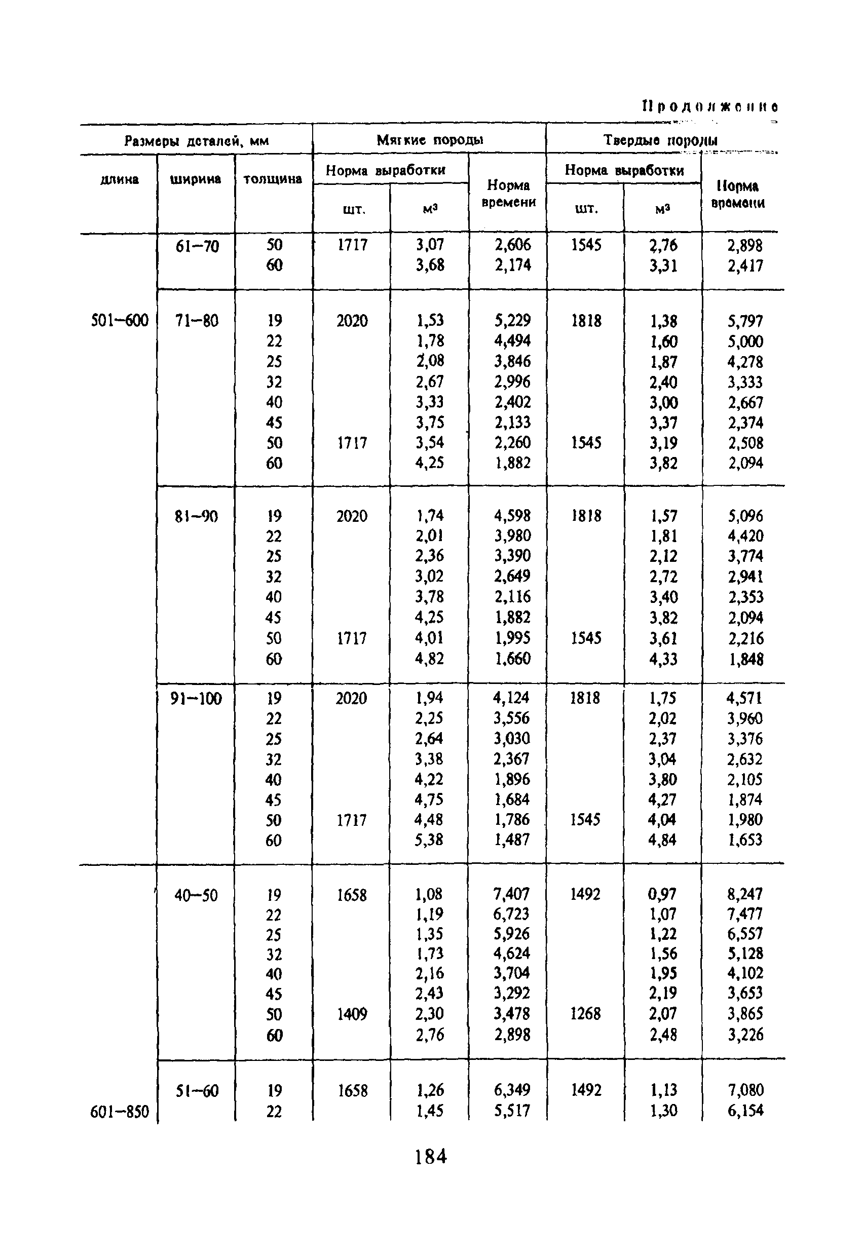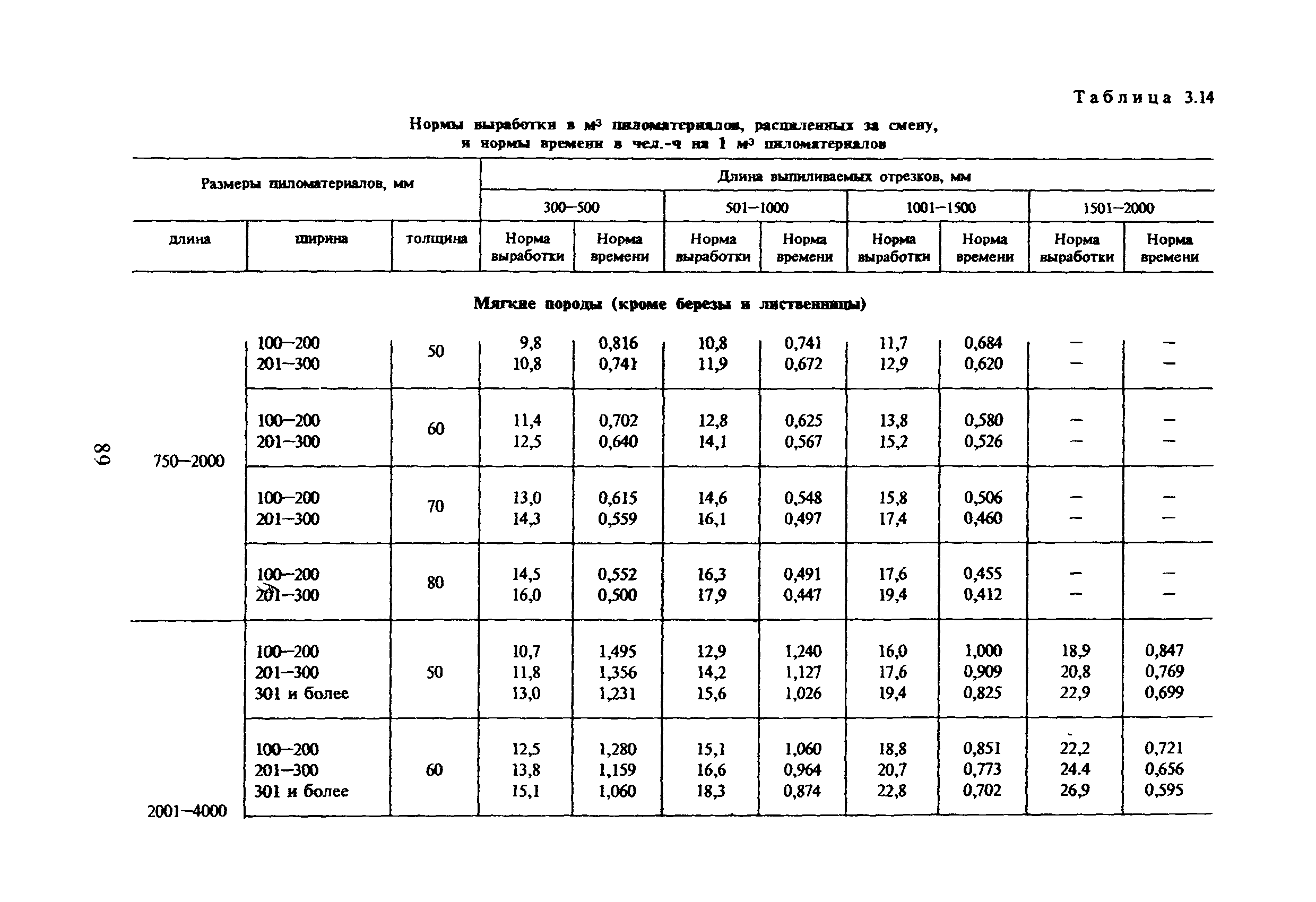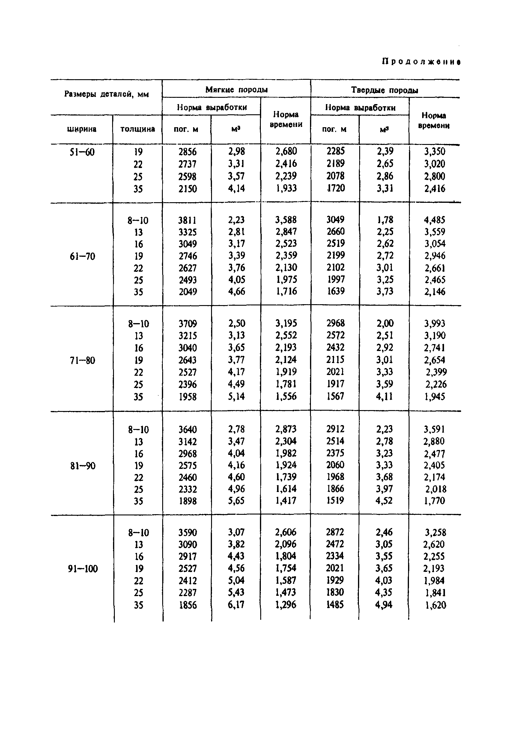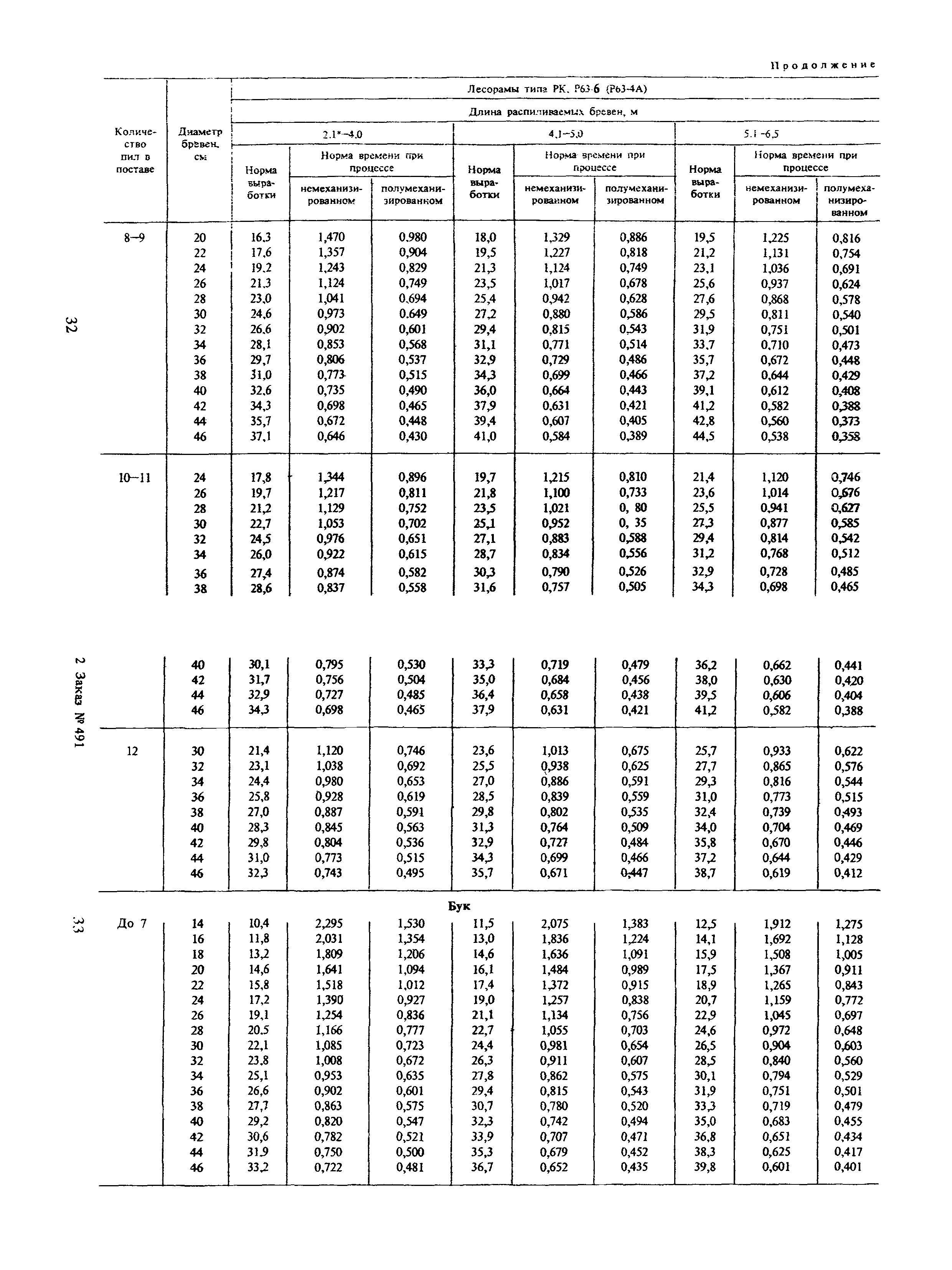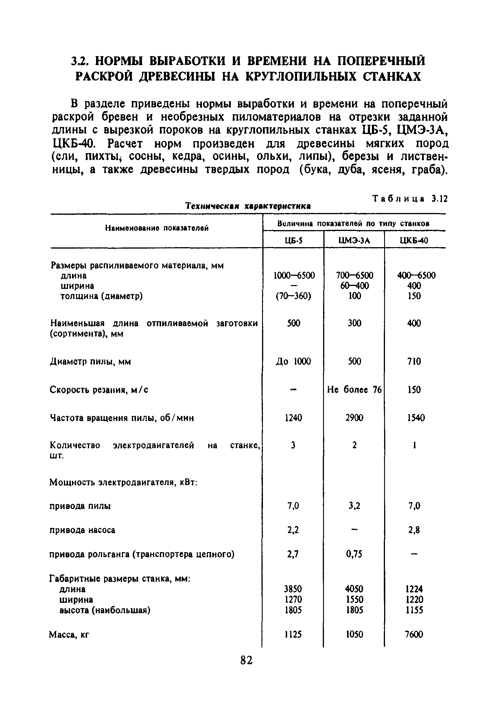 Типовые нормы выработки и времени на лесопильные работы (Работы, выполняемые на одноэтажных лесопильных рамах и круглопильных станках)| Статус: | справочные материалы, мп, тпр | | Название рус.: | Типовые нормы выработки и времени на лесопильные работы (Работы, выполняемые на одноэтажных лесопильных рамах и круглопильных станках) | | Дата добавления в базу: | 01.10.2014 | | Дата актуализации: | 01.01.2021 | | Область применения: | Типовые нормы предназначены для нормирования труда рабочих, выполняющих работы на лесопильных и тарных рамах, круглопильных станках, а также работы по перемещению, увязке и укладке сырья и изделий деревообработки, на всех предприятиях независимо от их ведомственной подчиненности | | Оглавление: | 1. Общая часть 2. Технология работы и организация труда 2.1. Переработка круглых сортиментов мягких пород 2.2. Переработка круглых сортиментов твердых пород 2.3. Переработка круглых короткомерных сортиментов 3. Нормативная часть 3.1. Нормы выработки и времени на распиловку круглых лесоматериалов на одноэтажных лесопильных рамах 3.1.1. Распиловка круглых сортиментов длиной 2,1 - 6,5 м вразвал при немеханизированном и полумеханизированном процессах лесопиления 3.1.2. Распиловка круглых сортиментов длиной 2,1 - 6,5 м на обрезные пиломатериалы при немеханизированном и полумеханизированном процессах лесопиления 3.1.3. Распиловка круглых сортиментов длиной 2,1 - 6,5 м вразвал при механизированном процессе лесопиления 3.1.4. Распиловка круглых сортиментов длиной 2,1 - 6,5 м на обрезные пиломатериалы при механизированном процессе лесопиления 3.1.5. Распиловка круглых сортиментов длиной 1 - 2 м на лесопильной раме РК 3.2. Нормы выработки и времени на поперечный раскрой древесины на круглопильных станках 3.2.1. Поперечный раскрой/круглых сортиментов на станке ЦБ-5 3.2.2. Поперечный раскрой пиломатериалов на станках типа ЦКБ-40 (ЦМЭ-3А, ЦМЭ-2), оборудованных поперечным транспортером для подачи пиломатериалов на стол станка 3.3. Нормы выработки и времени на продольный раскрой чураков на круглопильных станках 3.3.1. Продольный раскрой чураков на станке ЦДТ5-2 3.3.2. Продольный раскрой чураков на станке типа Ц2К- (Ц2К) 3.4. Нормы выработки и времени на продольный раскрой заготовок из пиломатериалов на круглопильных станках 3.4.1. Продольный раскрой необрезных пиломатериалов на станке ЦА-2 3.4.2. Продольный раскрой необрезных пиломатериалов на станках типа ЦДК4-3 (ЦДК4-2, ЦДК-4) 3.4.3. Продольный раскрой необрезных пиломатериалов на круглопильном станке ЦВП-1 3.4.4. Продольный раскрой необрезных пиломатериалов на станке типа Ц6-2 (Ц-6, Ц-5) 3.4 5. Продольный раскрой необрезных пиломатериалов на многопильных станках ЦА-2А, ЦДК5-2, ЦМ-80, ЦМ-120, ЦМР-2 3.5. Нормы выработки и времени на продольную распиловку пиломатериалов на тарной раме 3.5.1. Продольная распиловка пиломатериалов на тарных рамах РТ-2, РТ-36 3.6. Нормы выработки и времени на торцовку и поперечный раскрой заготовок кратной длины на детали на круглопильных станках 3.6.1. Пакетная торцовка деталей с одного конца на станке типа ЦПА-40 (ЦПА-2) 3.6.2. Групповой раскрой заготовок кратной длины на детали на станке ЦПА-40 3.6.3. Индивидуальный раскрой заготовок кратной длины на детали на станке Ц6-2 3.7. Нормы выработки на вспомогательные работы 3.7.1. Подача сырья в лесопильный цех вагонетками УЖД при погрузке мостовым краном 3.7.2. Подача сырья в лесопильный цех и вывозка п