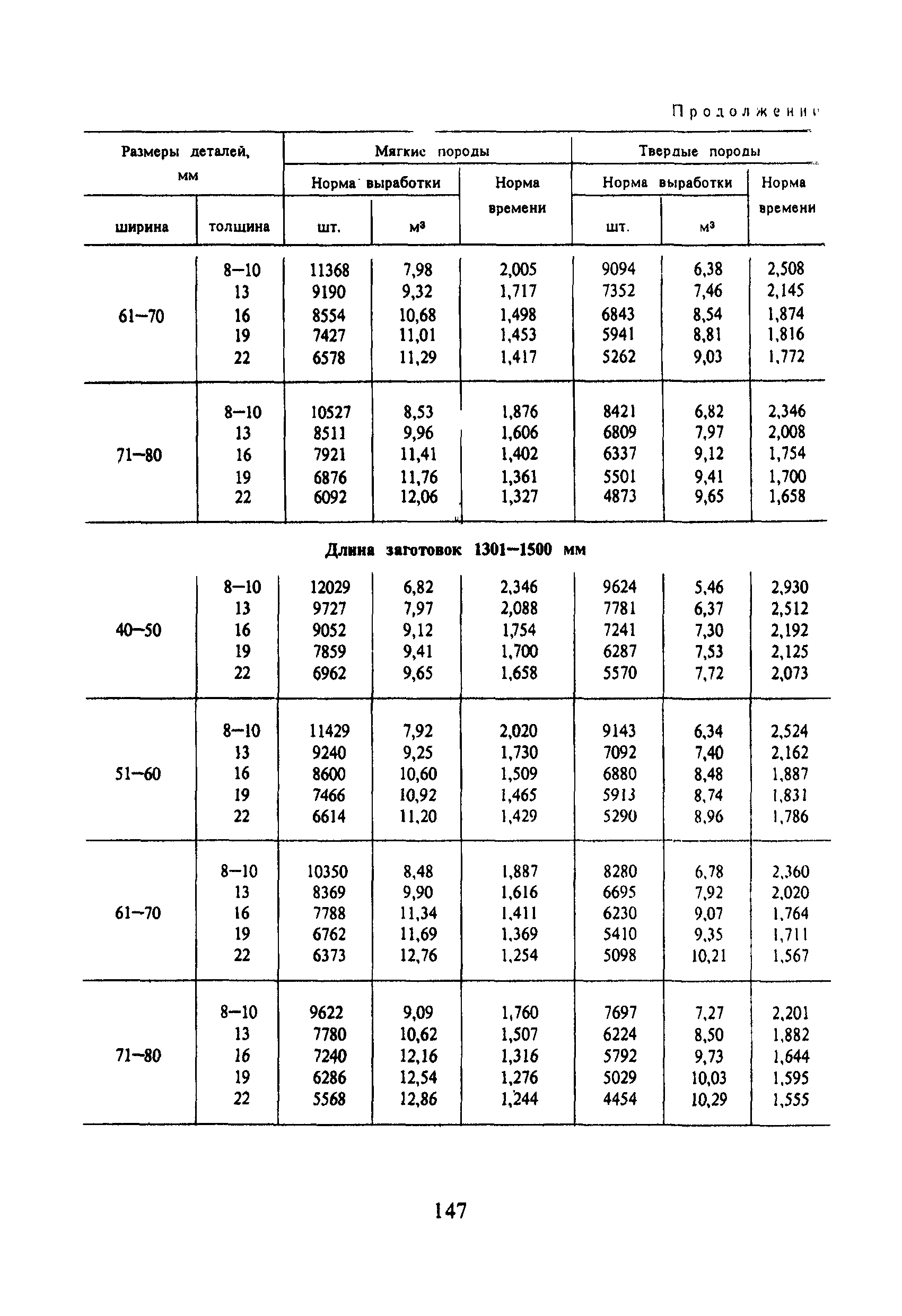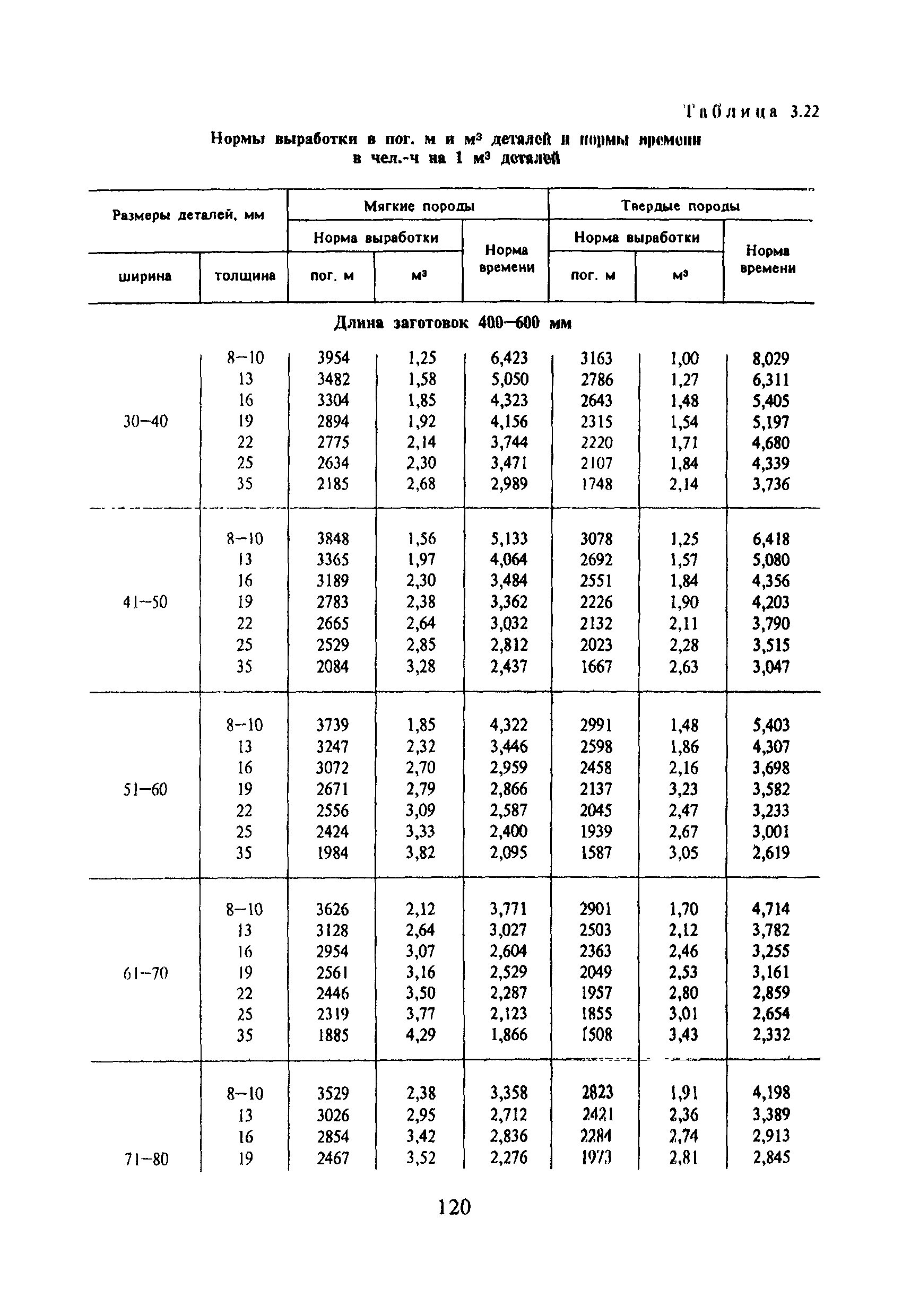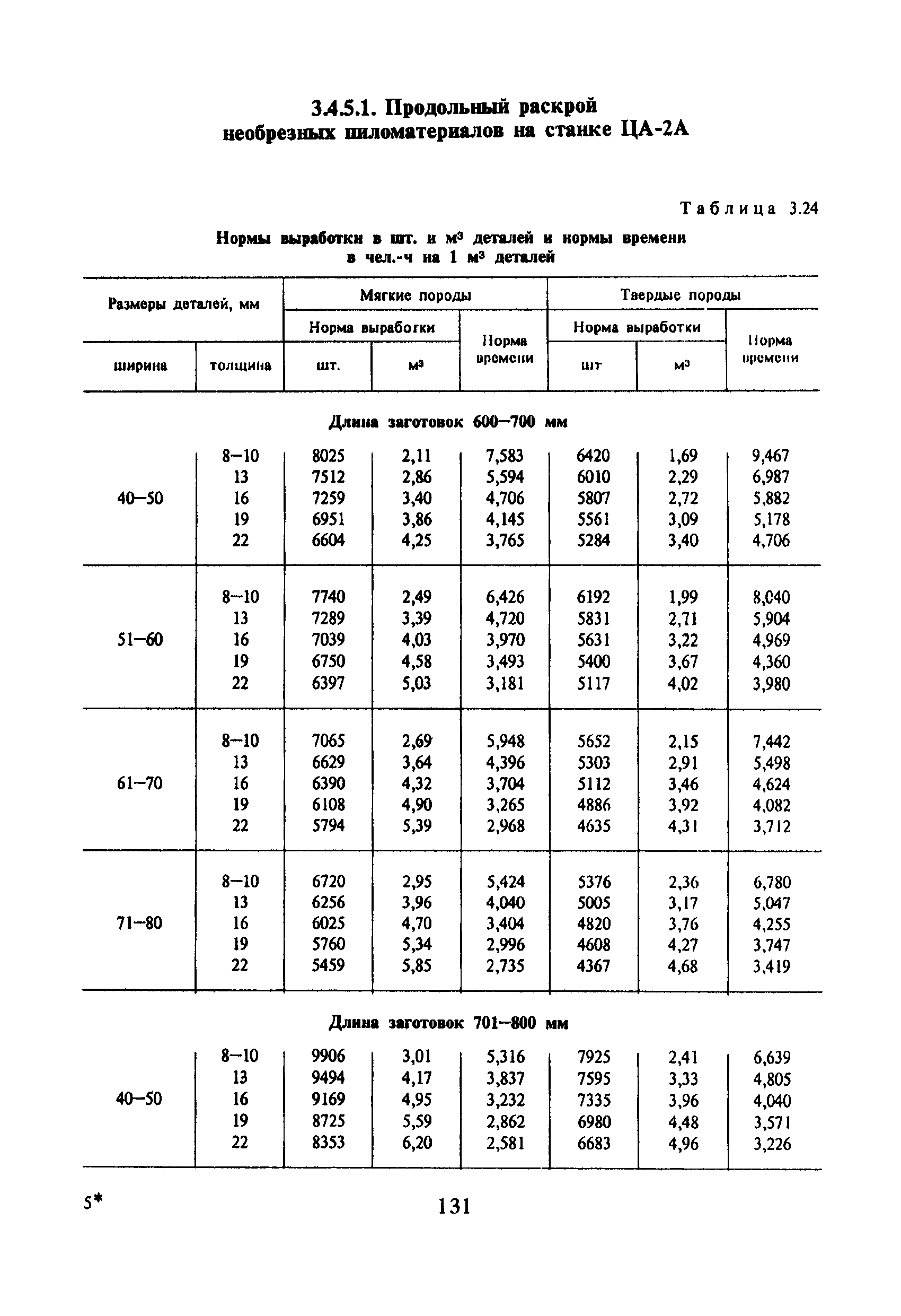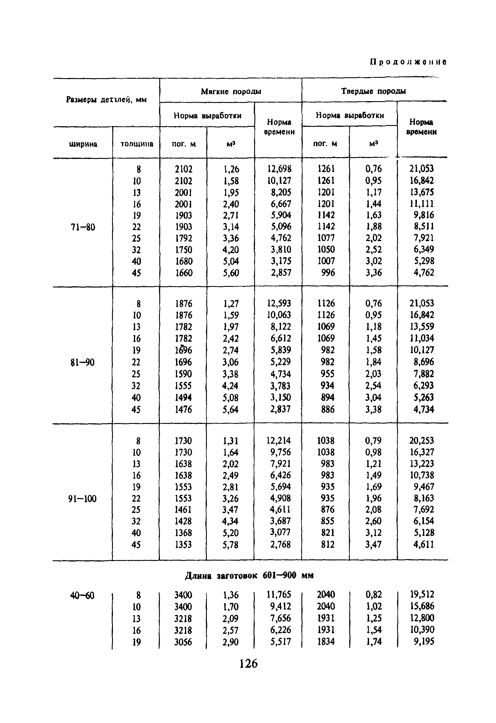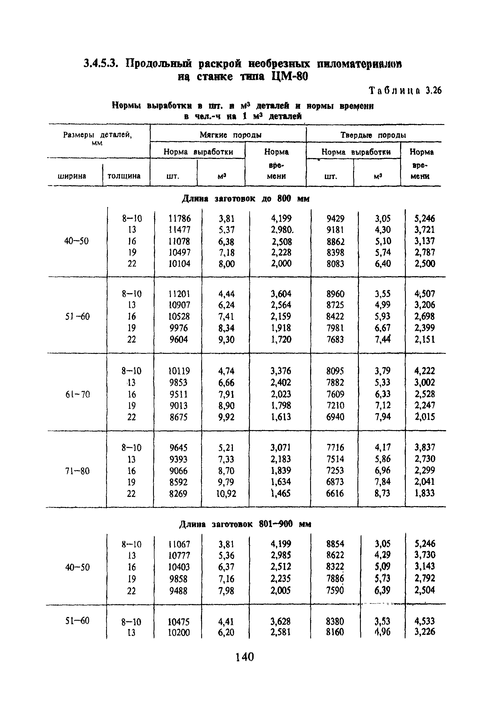 Типовые нормы выработки и времени на лесопильные работы (Работы, выполняемые на одноэтажных лесопильных рамах и круглопильных станках)| Статус: | справочные материалы, мп, тпр | | Название рус.: | Типовые нормы выработки и времени на лесопильные работы (Работы, выполняемые на одноэтажных лесопильных рамах и круглопильных станках) | | Дата добавления в базу: | 01.10.2014 | | Дата актуализации: | 01.01.2021 | | Область применения: | Типовые нормы предназначены для нормирования труда рабочих, выполняющих работы на лесопильных и тарных рамах, круглопильных станках, а также работы по перемещению, увязке и укладке сырья и изделий деревообработки, на всех предприятиях независимо от их ведомственной подчиненности | | Оглавление: | 1. Общая часть 2. Технология работы и организация труда 2.1. Переработка круглых сортиментов мягких пород 2.2. Переработка круглых сортиментов твердых пород 2.3. Переработка круглых короткомерных сортиментов 3. Нормативная часть 3.1. Нормы выработки и времени на распиловку круглых лесоматериалов на одноэтажных лесопильных рамах 3.1.1. Распиловка круглых сортиментов длиной 2,1 - 6,5 м вразвал при немеханизированном и полумеханизированном процессах лесопиления 3.1.2. Распиловка круглых сортиментов длиной 2,1 - 6,5 м на обрезные пиломатериалы при немеханизированном и полумеханизированном процессах лесопиления 3.1.3. Распиловка круглых сортиментов длиной 2,1 - 6,5 м вразвал при механизированном процессе лесопиления 3.1.4. Распиловка круглых сортиментов длиной 2,1 - 6,5 м на обрезные пиломатериалы при механизированном процессе лесопиления 3.1.5. Распиловка круглых сортиментов длиной 1 - 2 м на лесопильной раме РК 3.2. Нормы выработки и времени на поперечный раскрой древесины на круглопильных станках 3.2.1. Поперечный раскрой/круглых сортиментов на станке ЦБ-5 3.2.2. Поперечный раскрой пиломатериалов на станках типа ЦКБ-40 (ЦМЭ-3А, ЦМЭ-2), оборудованных поперечным транспортером для подачи пиломатериалов на стол станка 3.3. Нормы выработки и времени на продольный раскрой чураков на круглопильных станках 3.3.1. Продольный раскрой чураков на станке ЦДТ5-2 3.3.2. Продольный раскрой чураков на станке типа Ц2К- (Ц2К) 3.4. Нормы выработки и времени на продольный раскрой заготовок из пиломатериалов на круглопильных станках 3.4.1. Продольный раскрой необрезных пиломатериалов на станке ЦА-2 3.4.2. Продольный раскрой необрезных пиломатериалов на станках типа ЦДК4-3 (ЦДК4-2, ЦДК-4) 3.4.3. Продольный раскрой необрезных пиломатериалов на круглопильном станке ЦВП-1 3.4.4. Продольный раскрой необрезных пиломатериалов на станке типа Ц6-2 (Ц-6, Ц-5) 3.4 5. Продольный раскрой необрезных пиломатериалов на многопильных станках ЦА-2А, ЦДК5-2, ЦМ-80, ЦМ-120, ЦМР-2 3.5. Нормы выработки и времени на продольную распиловку пиломатериалов на тарной раме 3.5.1. Продольная распиловка пиломатериалов на тарных рамах РТ-2, РТ-36 3.6. Нормы выработки и времени на торцовку и поперечный раскрой заготовок кратной длины на детали на круглопильных станках 3.6.1. Пакетная торцовка деталей с одного конца на станке типа ЦПА-40 (ЦПА-2) 3.6.2. Групповой раскрой заготовок кратной длины на детали на станке ЦПА-40 3.6.3. Индивидуальный раскрой заготовок кратной длины на детали на станке Ц6-2 3.7. Нормы выработки на вспомогательные работы 3.7.1. Подача сырья в лесопильный цех вагонетками УЖД при погрузке мостовым краном 3.7.2. Подача сырья в лесопильный цех и вывозка п