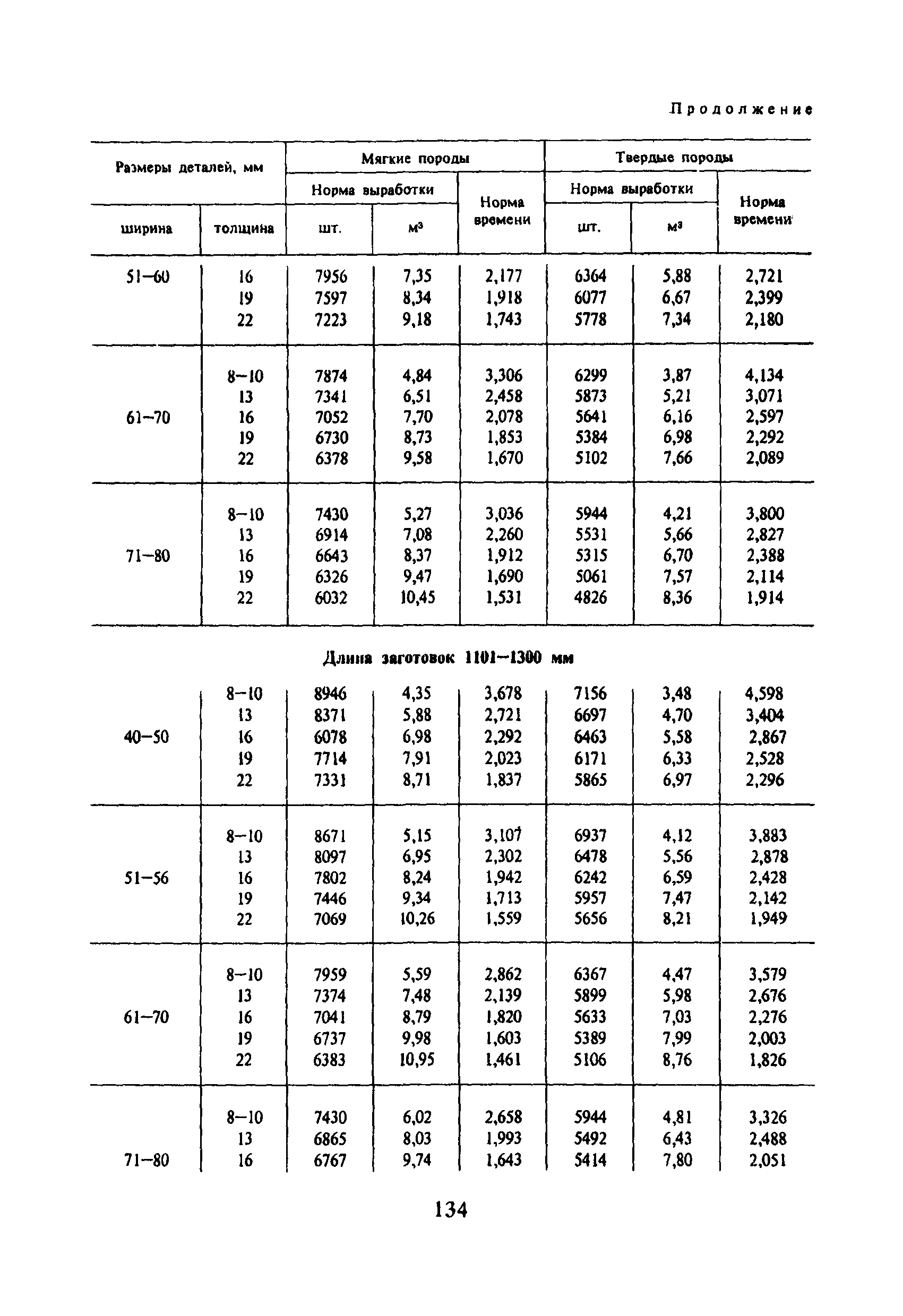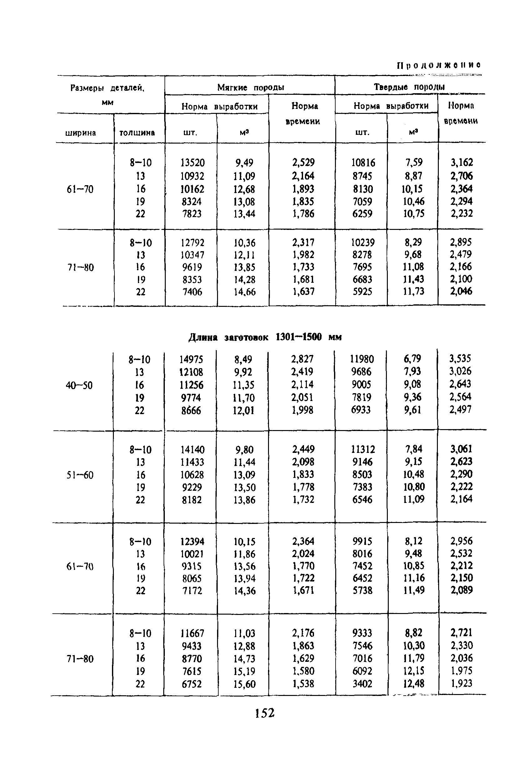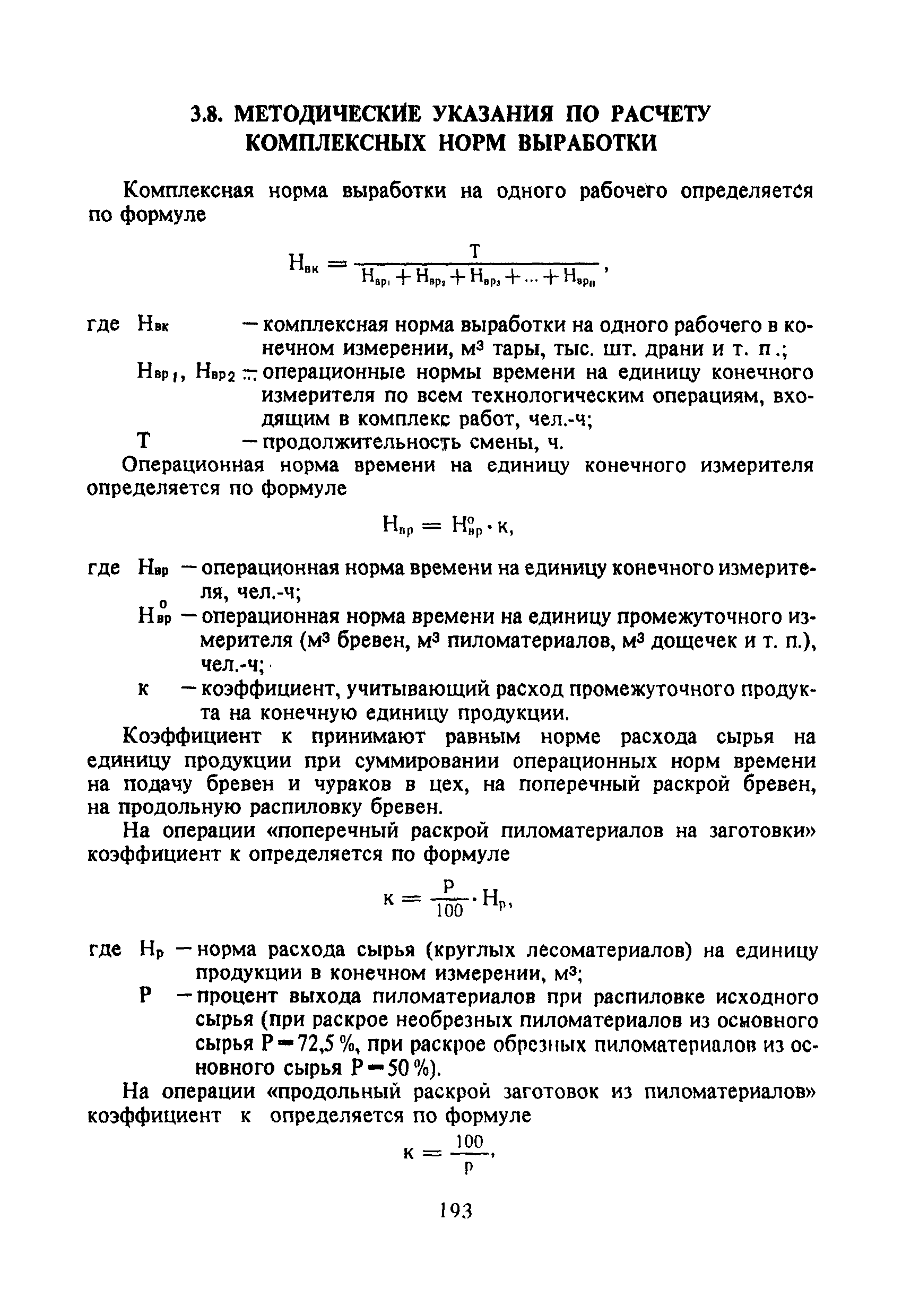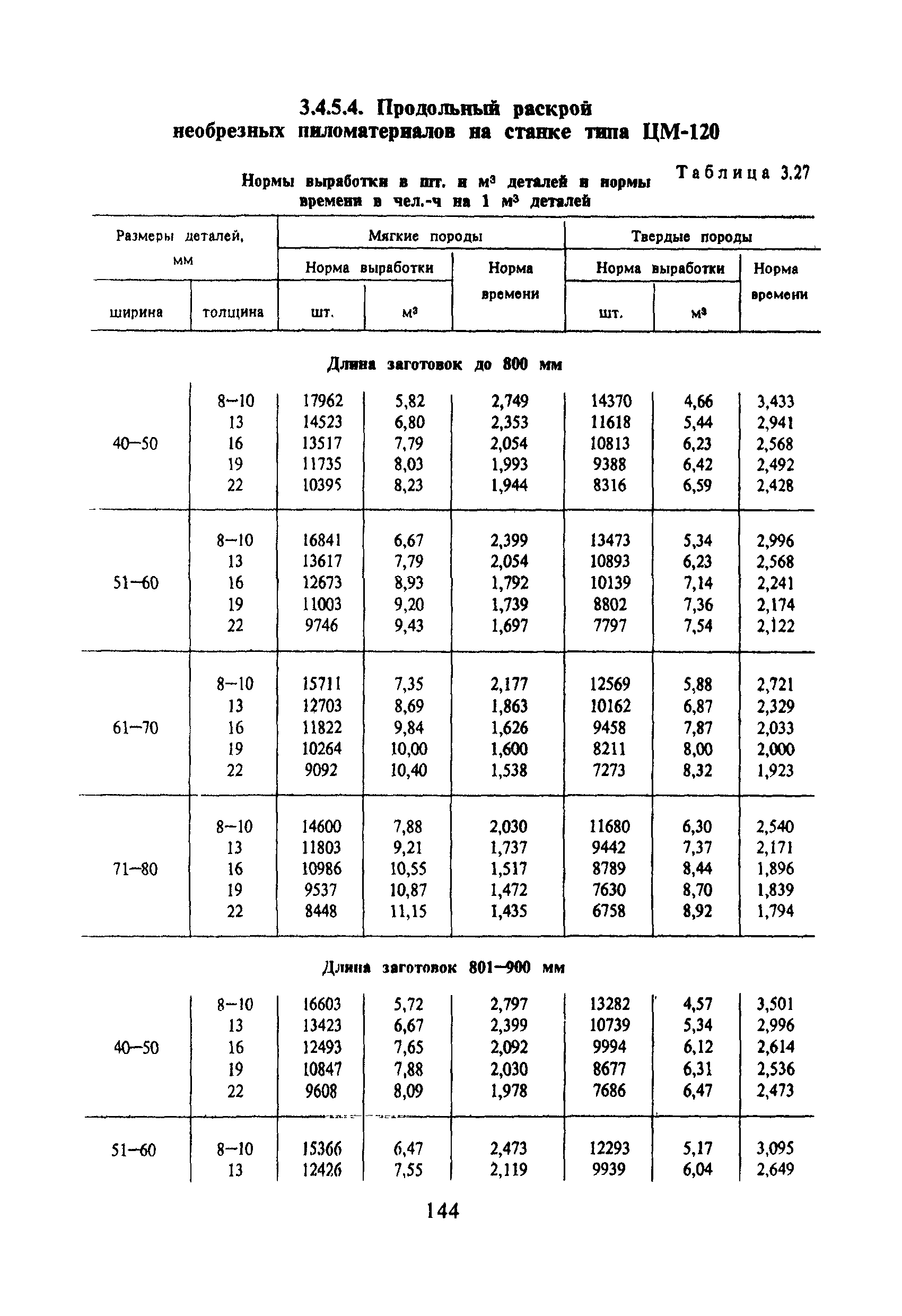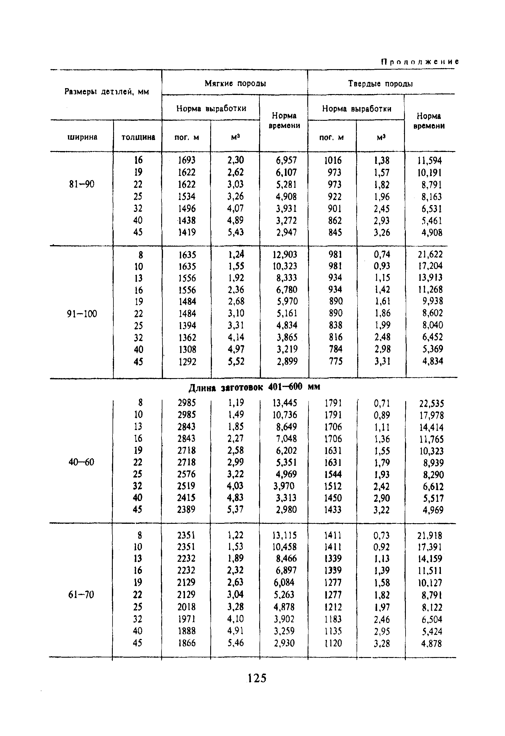Типовые нормы выработки и времени на лесопильные работы (Работы, выполняемые на одноэтажных лесопильных рамах и круглопильных станках)| Статус: | справочные материалы, мп, тпр | | Название рус.: | Типовые нормы выработки и времени на лесопильные работы (Работы, выполняемые на одноэтажных лесопильных рамах и круглопильных станках) | | Дата добавления в базу: | 01.10.2014 | | Дата актуализации: | 01.01.2021 | | Область применения: | Типовые нормы предназначены для нормирования труда рабочих, выполняющих работы на лесопильных и тарных рамах, круглопильных станках, а также работы по перемещению, увязке и укладке сырья и изделий деревообработки, на всех предприятиях независимо от их ведомственной подчиненности | | Оглавление: | 1. Общая часть 2. Технология работы и организация труда 2.1. Переработка круглых сортиментов мягких пород 2.2. Переработка круглых сортиментов твердых пород 2.3. Переработка круглых короткомерных сортиментов 3. Нормативная часть 3.1. Нормы выработки и времени на распиловку круглых лесоматериалов на одноэтажных лесопильных рамах 3.1.1. Распиловка круглых сортиментов длиной 2,1 - 6,5 м вразвал при немеханизированном и полумеханизированном процессах лесопиления 3.1.2. Распиловка круглых сортиментов длиной 2,1 - 6,5 м на обрезные пиломатериалы при немеханизированном и полумеханизированном процессах лесопиления 3.1.3. Распиловка круглых сортиментов длиной 2,1 - 6,5 м вразвал при механизированном процессе лесопиления 3.1.4. Распиловка круглых сортиментов длиной 2,1 - 6,5 м на обрезные пиломатериалы при механизированном процессе лесопиления 3.1.5. Распиловка круглых сортиментов длиной 1 - 2 м на лесопильной раме РК 3.2. Нормы выработки и времени на поперечный раскрой древесины на круглопильных станках 3.2.1. Поперечный раскрой/круглых сортиментов на станке ЦБ-5 3.2.2. Поперечный раскрой пиломатериалов на станках типа ЦКБ-40 (ЦМЭ-3А, ЦМЭ-2), оборудованных поперечным транспортером для подачи пиломатериалов на стол станка 3.3. Нормы выработки и времени на продольный раскрой чураков на круглопильных станках 3.3.1. Продольный раскрой чураков на станке ЦДТ5-2 3.3.2. Продольный раскрой чураков на станке типа Ц2К- (Ц2К) 3.4. Нормы выработки и времени на продольный раскрой заготовок из пиломатериалов на круглопильных станках 3.4.1. Продольный раскрой необрезных пиломатериалов на станке ЦА-2 3.4.2. Продольный раскрой необрезных пиломатериалов на станках типа ЦДК4-3 (ЦДК4-2, ЦДК-4) 3.4.3. Продольный раскрой необрезных пиломатериалов на круглопильном станке ЦВП-1 3.4.4. Продольный раскрой необрезных пиломатериалов на станке типа Ц6-2 (Ц-6, Ц-5) 3.4 5. Продольный раскрой необрезных пиломатериалов на многопильных станках ЦА-2А, ЦДК5-2, ЦМ-80, ЦМ-120, ЦМР-2 3.5. Нормы выработки и времени на продольную распиловку пиломатериалов на тарной раме 3.5.1. Продольная распиловка пиломатериалов на тарных рамах РТ-2, РТ-36 3.6. Нормы выработки и времени на торцовку и поперечный раскрой заготовок кратной длины на детали на круглопильных станках 3.6.1. Пакетная торцовка деталей с одного конца на станке типа ЦПА-40 (ЦПА-2) 3.6.2. Групповой раскрой заготовок кратной длины на детали на станке ЦПА-40 3.6.3. Индивидуальный раскрой заготовок кратной длины на детали на станке Ц6-2 3.7. Нормы выработки на вспомогательные работы 3.7.1. Подача сырья в лесопильный цех вагонетками УЖД при погрузке мостовым краном 3.7.2. Подача сырья в лесопильный цех и вывозка п