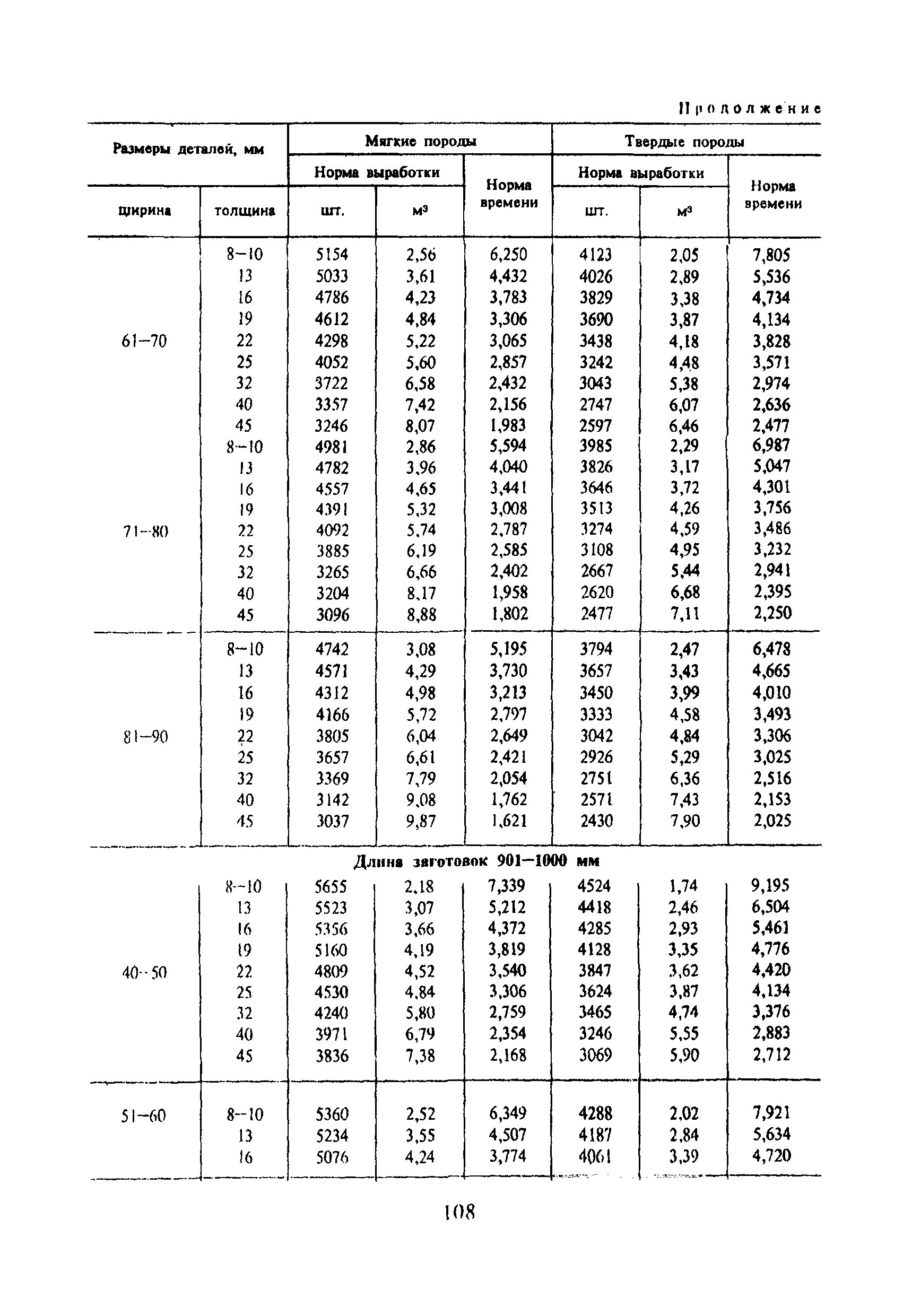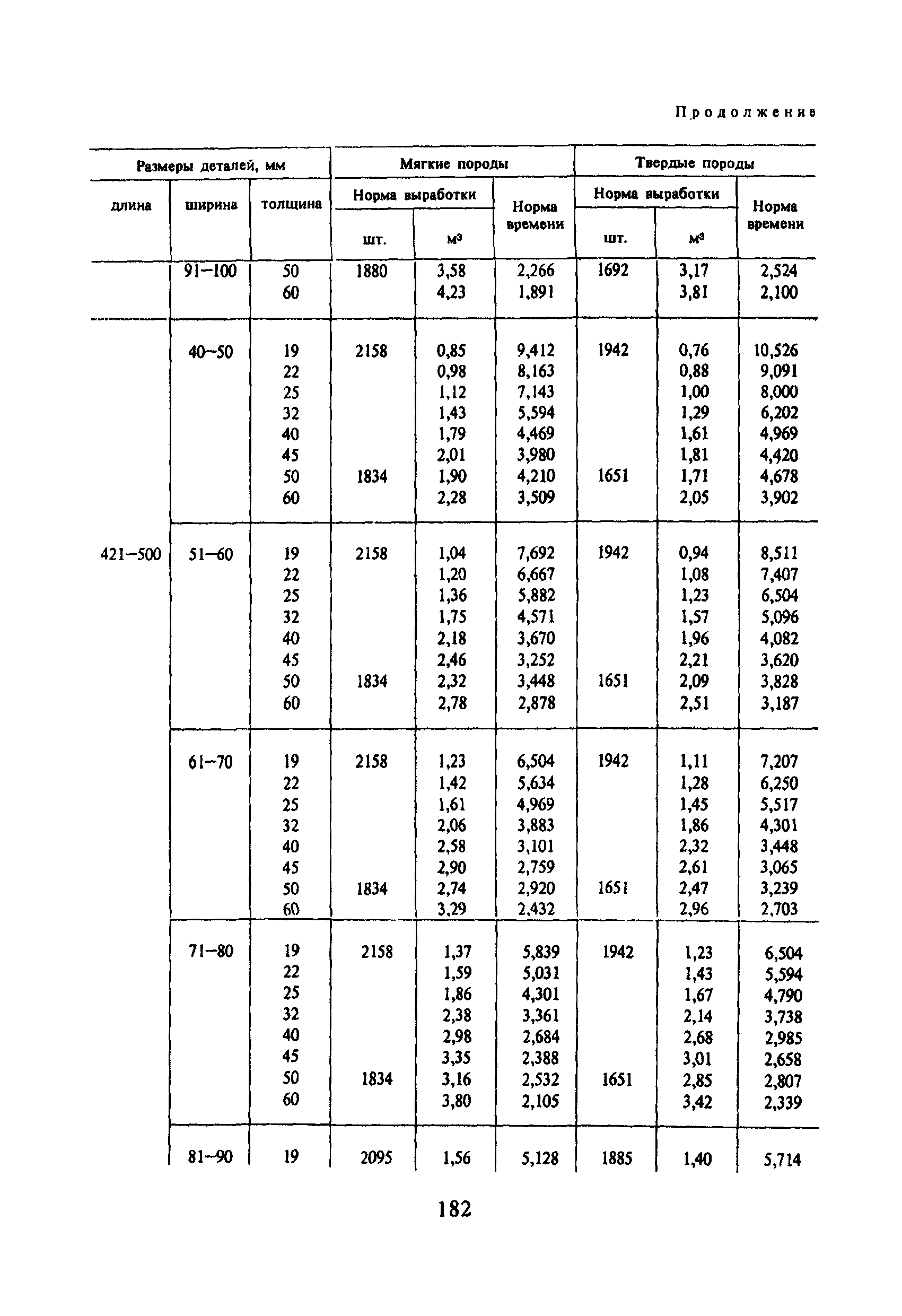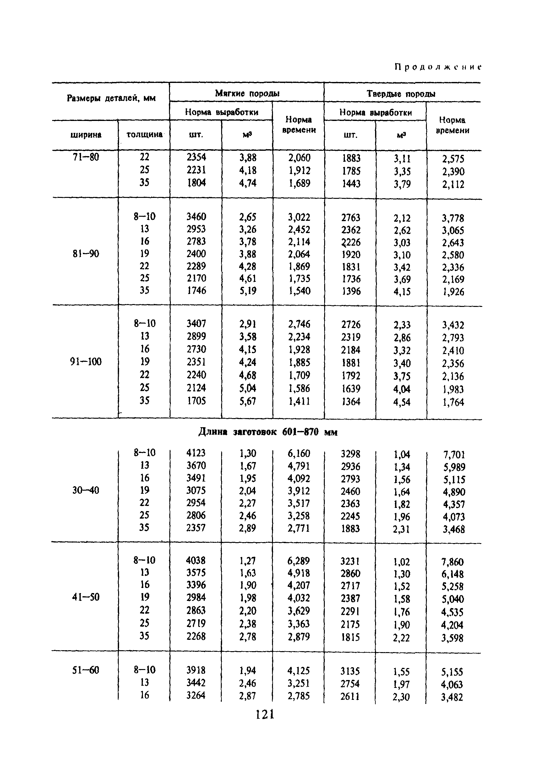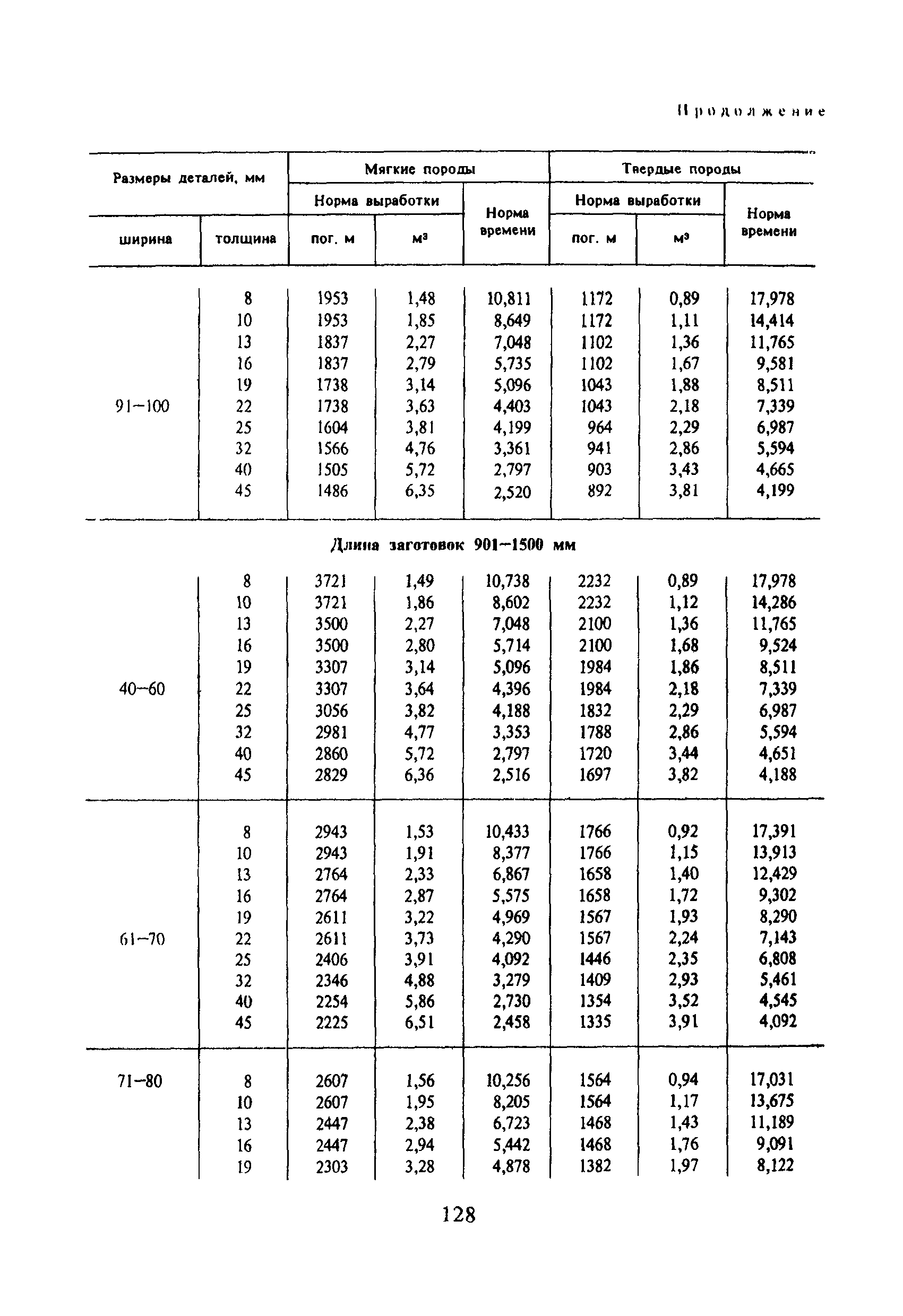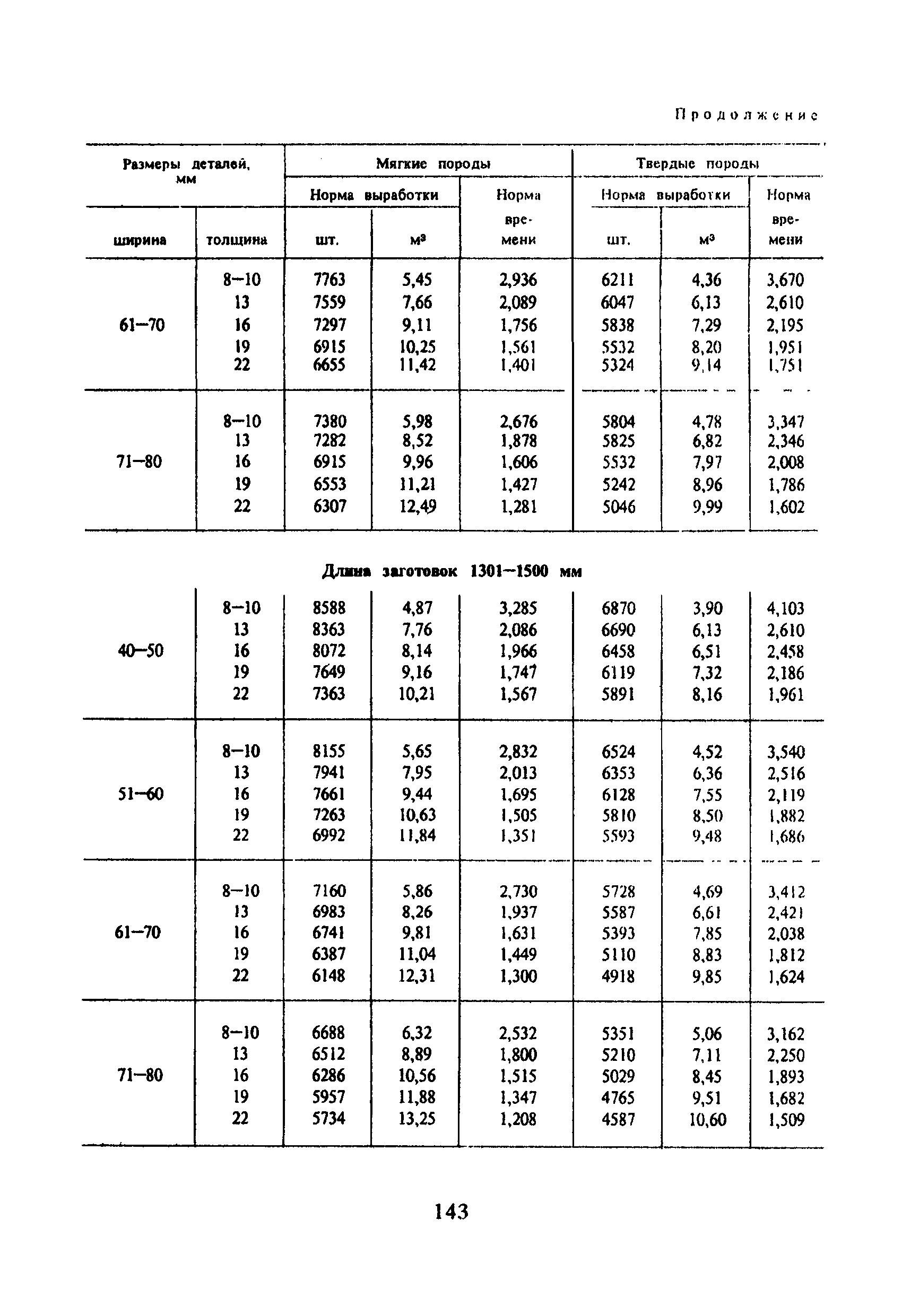 Типовые нормы выработки и времени на лесопильные работы (Работы, выполняемые на одноэтажных лесопильных рамах и круглопильных станках)| Статус: | справочные материалы, мп, тпр | | Название рус.: | Типовые нормы выработки и времени на лесопильные работы (Работы, выполняемые на одноэтажных лесопильных рамах и круглопильных станках) | | Дата добавления в базу: | 01.10.2014 | | Дата актуализации: | 01.01.2021 | | Область применения: | Типовые нормы предназначены для нормирования труда рабочих, выполняющих работы на лесопильных и тарных рамах, круглопильных станках, а также работы по перемещению, увязке и укладке сырья и изделий деревообработки, на всех предприятиях независимо от их ведомственной подчиненности | | Оглавление: | 1. Общая часть 2. Технология работы и организация труда 2.1. Переработка круглых сортиментов мягких пород 2.2. Переработка круглых сортиментов твердых пород 2.3. Переработка круглых короткомерных сортиментов 3. Нормативная часть 3.1. Нормы выработки и времени на распиловку круглых лесоматериалов на одноэтажных лесопильных рамах 3.1.1. Распиловка круглых сортиментов длиной 2,1 - 6,5 м вразвал при немеханизированном и полумеханизированном процессах лесопиления 3.1.2. Распиловка круглых сортиментов длиной 2,1 - 6,5 м на обрезные пиломатериалы при немеханизированном и полумеханизированном процессах лесопиления 3.1.3. Распиловка круглых сортиментов длиной 2,1 - 6,5 м вразвал при механизированном процессе лесопиления 3.1.4. Распиловка круглых сортиментов длиной 2,1 - 6,5 м на обрезные пиломатериалы при механизированном процессе лесопиления 3.1.5. Распиловка круглых сортиментов длиной 1 - 2 м на лесопильной раме РК 3.2. Нормы выработки и времени на поперечный раскрой древесины на круглопильных станках 3.2.1. Поперечный раскрой/круглых сортиментов на станке ЦБ-5 3.2.2. Поперечный раскрой пиломатериалов на станках типа ЦКБ-40 (ЦМЭ-3А, ЦМЭ-2), оборудованных поперечным транспортером для подачи пиломатериалов на стол станка 3.3. Нормы выработки и времени на продольный раскрой чураков на круглопильных станках 3.3.1. Продольный раскрой чураков на станке ЦДТ5-2 3.3.2. Продольный раскрой чураков на станке типа Ц2К- (Ц2К) 3.4. Нормы выработки и времени на продольный раскрой заготовок из пиломатериалов на круглопильных станках 3.4.1. Продольный раскрой необрезных пиломатериалов на станке ЦА-2 3.4.2. Продольный раскрой необрезных пиломатериалов на станках типа ЦДК4-3 (ЦДК4-2, ЦДК-4) 3.4.3. Продольный раскрой необрезных пиломатериалов на круглопильном станке ЦВП-1 3.4.4. Продольный раскрой необрезных пиломатериалов на станке типа Ц6-2 (Ц-6, Ц-5) 3.4 5. Продольный раскрой необрезных пиломатериалов на многопильных станках ЦА-2А, ЦДК5-2, ЦМ-80, ЦМ-120, ЦМР-2 3.5. Нормы выработки и времени на продольную распиловку пиломатериалов на тарной раме 3.5.1. Продольная распиловка пиломатериалов на тарных рамах РТ-2, РТ-36 3.6. Нормы выработки и времени на торцовку и поперечный раскрой заготовок кратной длины на детали на круглопильных станках 3.6.1. Пакетная торцовка деталей с одного конца на станке типа ЦПА-40 (ЦПА-2) 3.6.2. Групповой раскрой заготовок кратной длины на детали на станке ЦПА-40 3.6.3. Индивидуальный раскрой заготовок кратной длины на детали на станке Ц6-2 3.7. Нормы выработки на вспомогательные работы 3.7.1. Подача сырья в лесопильный цех вагонетками УЖД при погрузке мостовым краном 3.7.2. Подача сырья в лесопильный цех и вывозка п