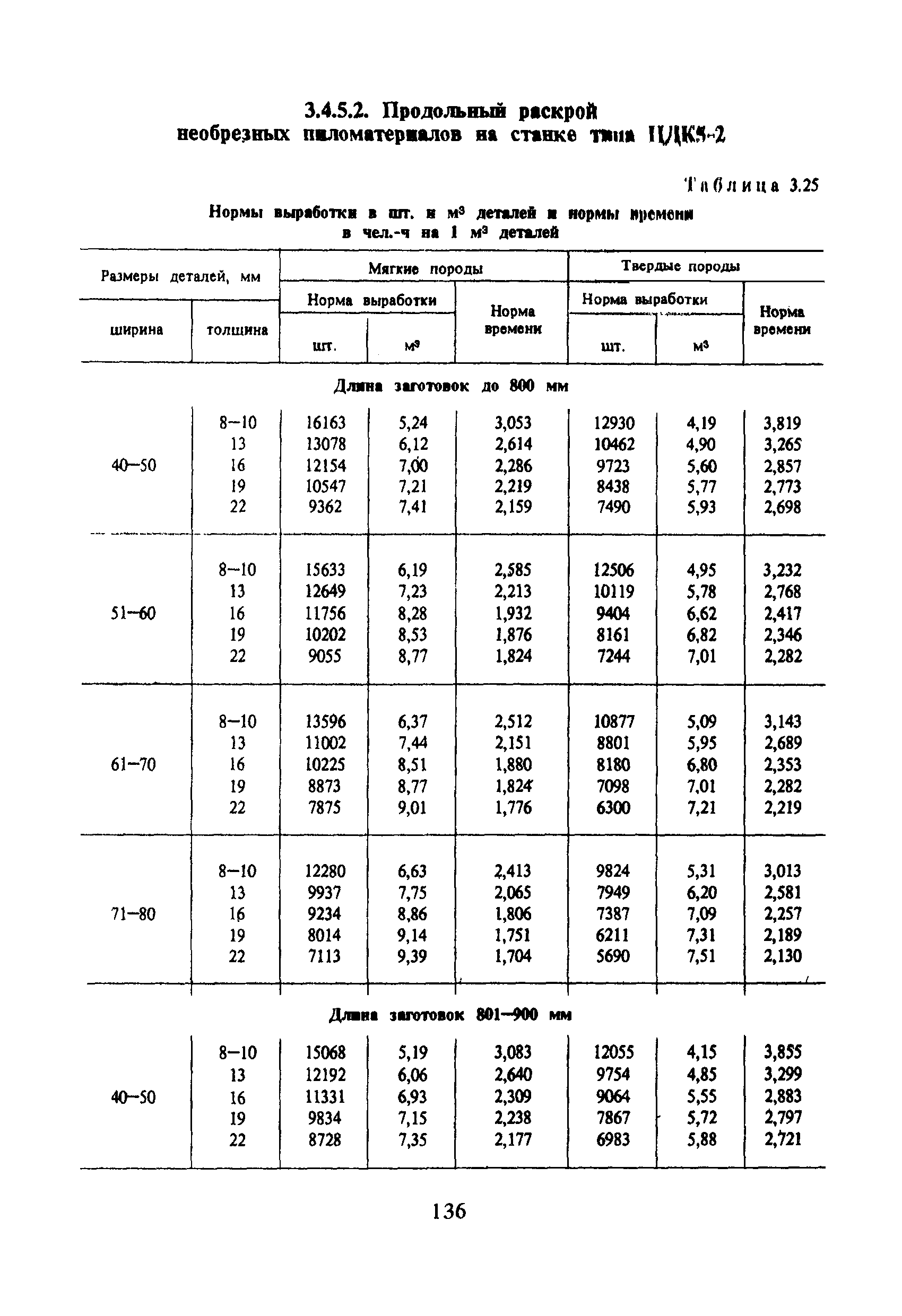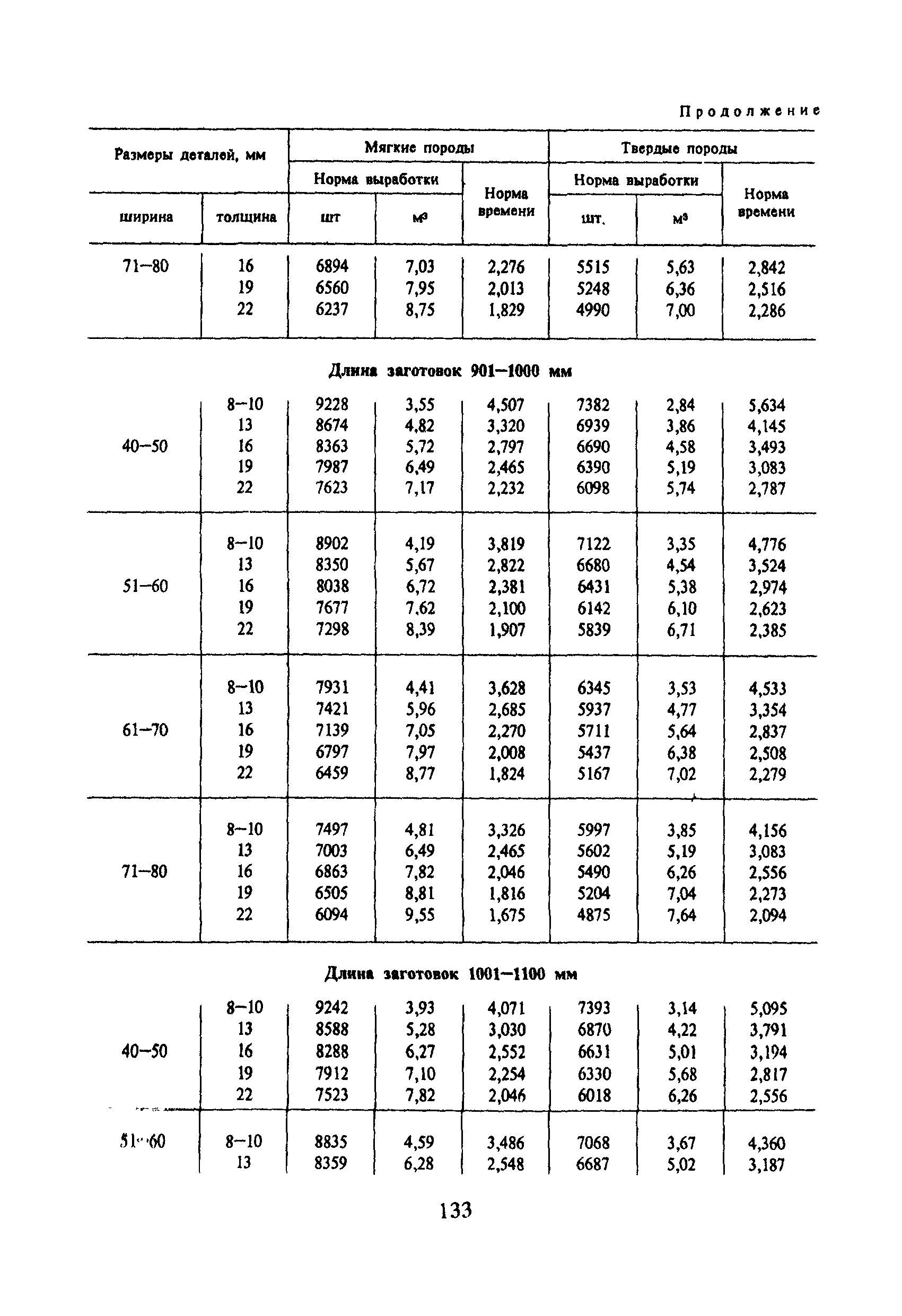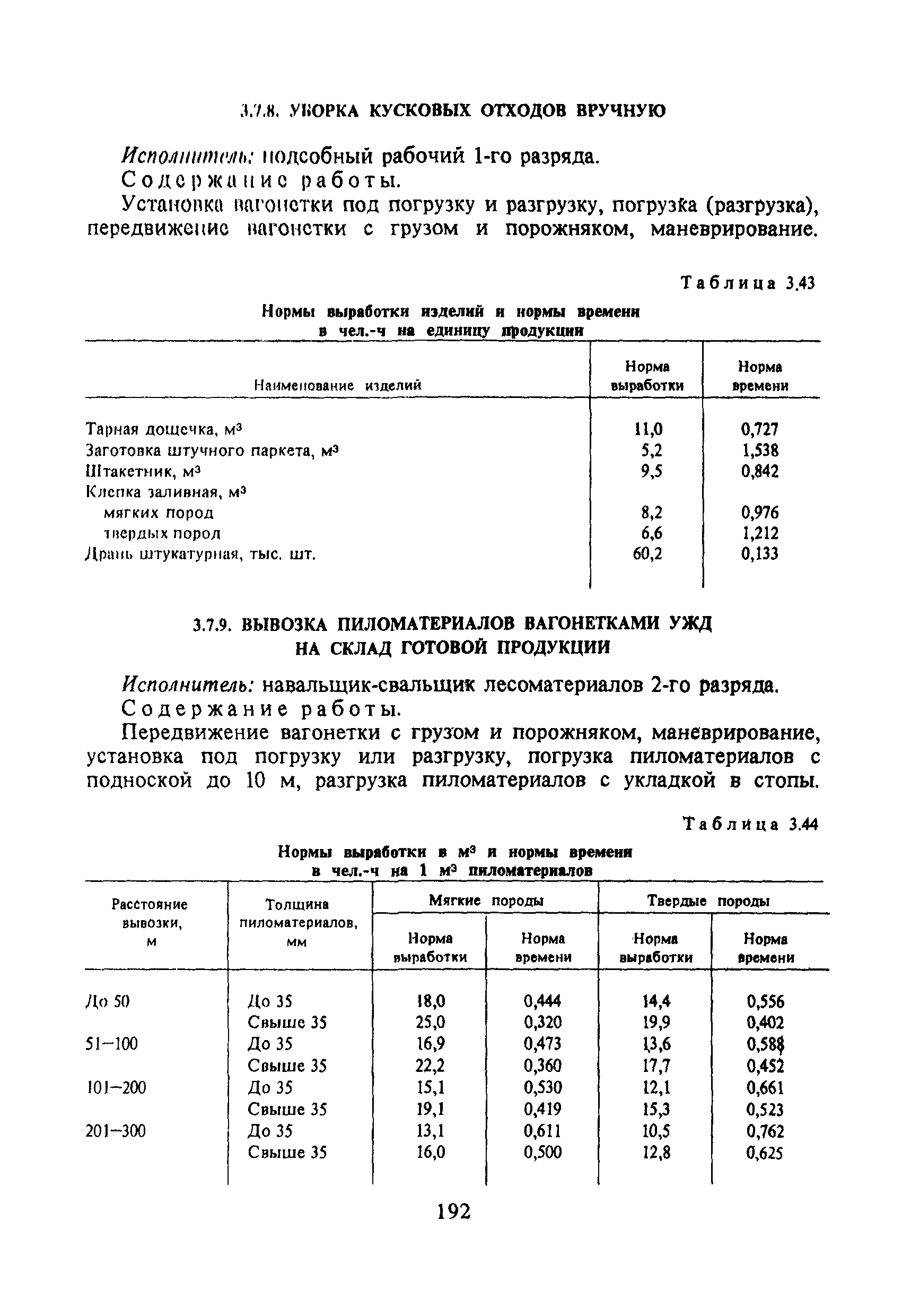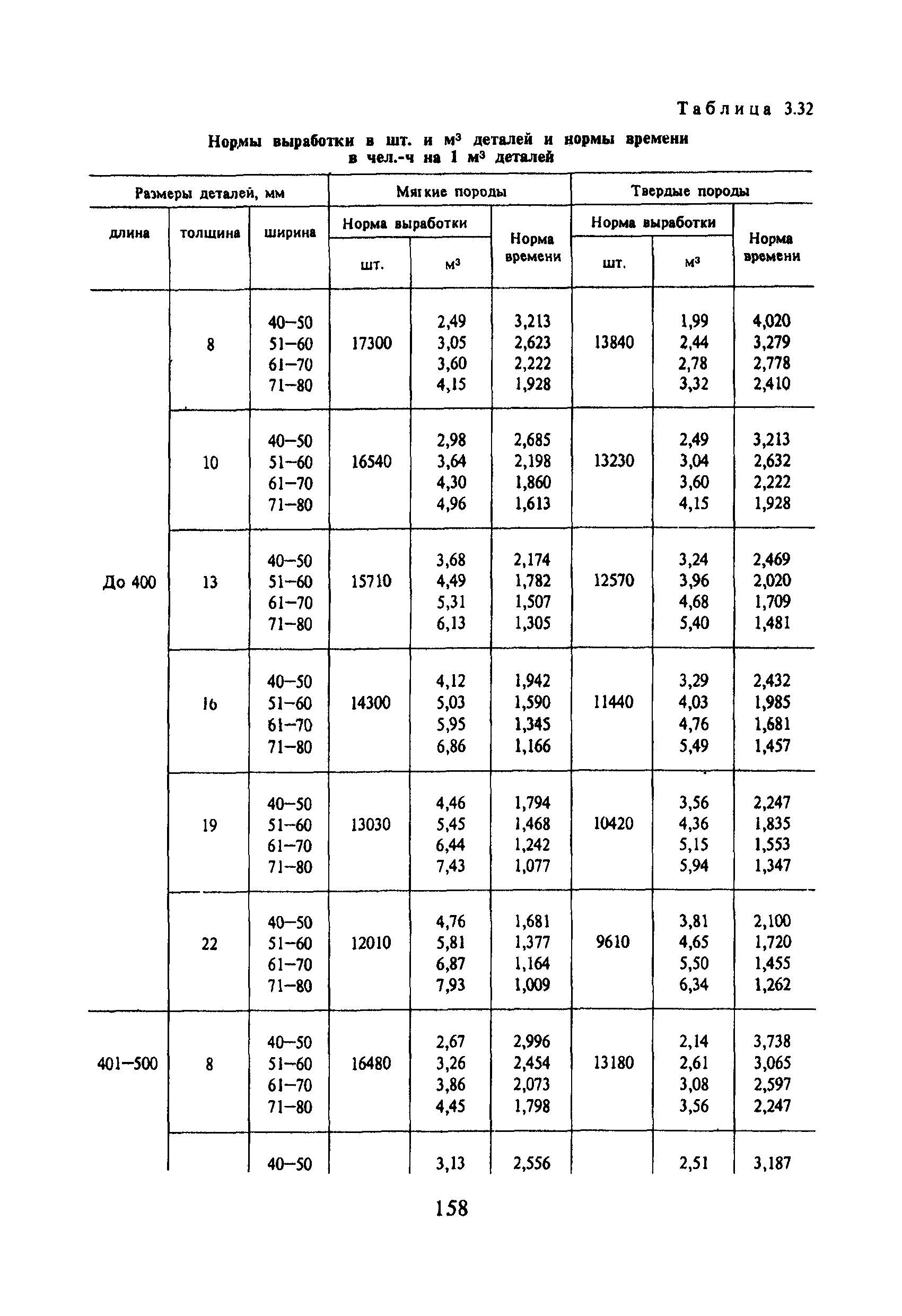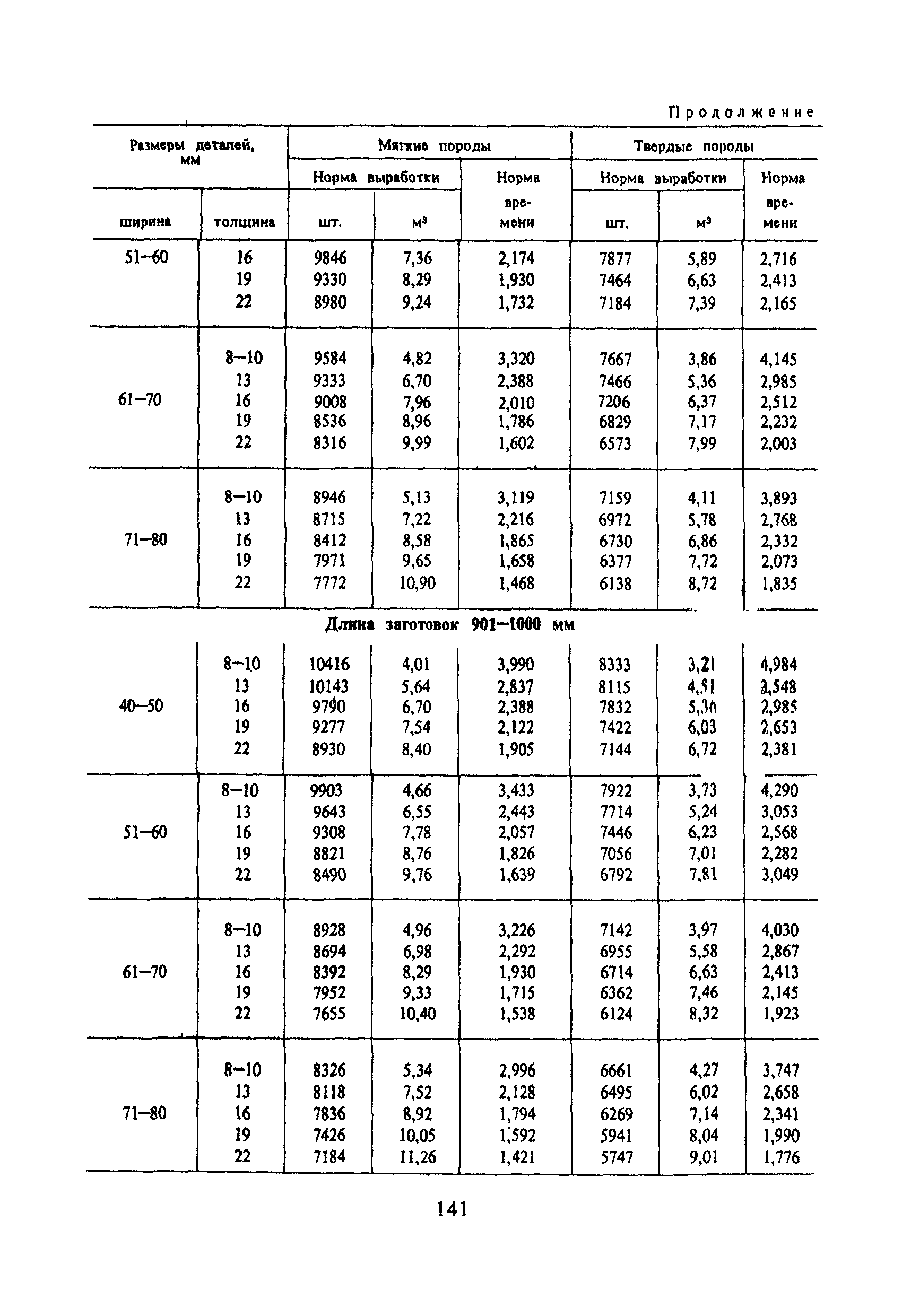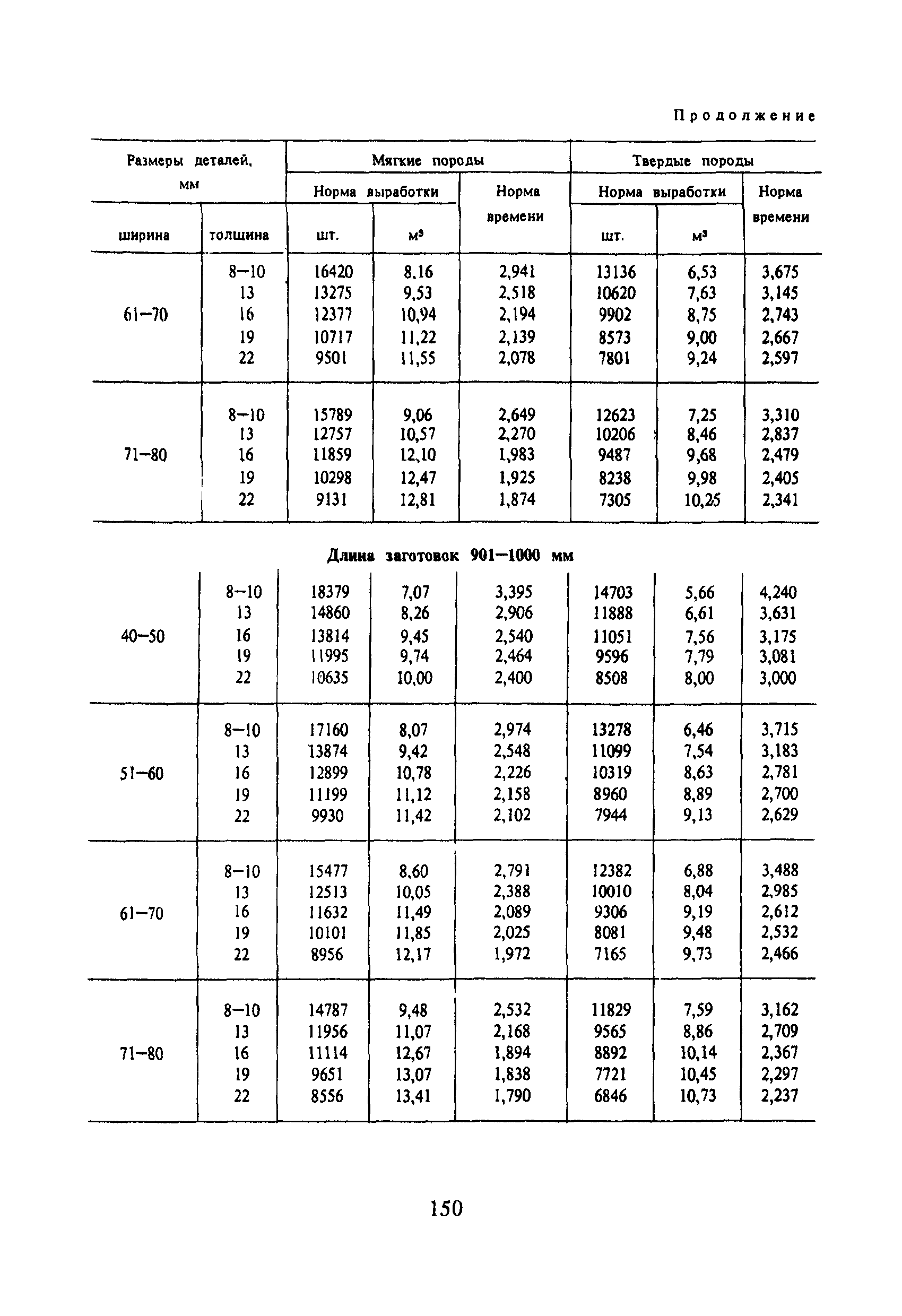 Типовые нормы выработки и времени на лесопильные работы (Работы, выполняемые на одноэтажных лесопильных рамах и круглопильных станках)| Статус: | справочные материалы, мп, тпр | | Название рус.: | Типовые нормы выработки и времени на лесопильные работы (Работы, выполняемые на одноэтажных лесопильных рамах и круглопильных станках) | | Дата добавления в базу: | 01.10.2014 | | Дата актуализации: | 01.01.2021 | | Область применения: | Типовые нормы предназначены для нормирования труда рабочих, выполняющих работы на лесопильных и тарных рамах, круглопильных станках, а также работы по перемещению, увязке и укладке сырья и изделий деревообработки, на всех предприятиях независимо от их ведомственной подчиненности | | Оглавление: | 1. Общая часть 2. Технология работы и организация труда 2.1. Переработка круглых сортиментов мягких пород 2.2. Переработка круглых сортиментов твердых пород 2.3. Переработка круглых короткомерных сортиментов 3. Нормативная часть 3.1. Нормы выработки и времени на распиловку круглых лесоматериалов на одноэтажных лесопильных рамах 3.1.1. Распиловка круглых сортиментов длиной 2,1 - 6,5 м вразвал при немеханизированном и полумеханизированном процессах лесопиления 3.1.2. Распиловка круглых сортиментов длиной 2,1 - 6,5 м на обрезные пиломатериалы при немеханизированном и полумеханизированном процессах лесопиления 3.1.3. Распиловка круглых сортиментов длиной 2,1 - 6,5 м вразвал при механизированном процессе лесопиления 3.1.4. Распиловка круглых сортиментов длиной 2,1 - 6,5 м на обрезные пиломатериалы при механизированном процессе лесопиления 3.1.5. Распиловка круглых сортиментов длиной 1 - 2 м на лесопильной раме РК 3.2. Нормы выработки и времени на поперечный раскрой древесины на круглопильных станках 3.2.1. Поперечный раскрой/круглых сортиментов на станке ЦБ-5 3.2.2. Поперечный раскрой пиломатериалов на станках типа ЦКБ-40 (ЦМЭ-3А, ЦМЭ-2), оборудованных поперечным транспортером для подачи пиломатериалов на стол станка 3.3. Нормы выработки и времени на продольный раскрой чураков на круглопильных станках 3.3.1. Продольный раскрой чураков на станке ЦДТ5-2 3.3.2. Продольный раскрой чураков на станке типа Ц2К- (Ц2К) 3.4. Нормы выработки и времени на продольный раскрой заготовок из пиломатериалов на круглопильных станках 3.4.1. Продольный раскрой необрезных пиломатериалов на станке ЦА-2 3.4.2. Продольный раскрой необрезных пиломатериалов на станках типа ЦДК4-3 (ЦДК4-2, ЦДК-4) 3.4.3. Продольный раскрой необрезных пиломатериалов на круглопильном станке ЦВП-1 3.4.4. Продольный раскрой необрезных пиломатериалов на станке типа Ц6-2 (Ц-6, Ц-5) 3.4 5. Продольный раскрой необрезных пиломатериалов на многопильных станках ЦА-2А, ЦДК5-2, ЦМ-80, ЦМ-120, ЦМР-2 3.5. Нормы выработки и времени на продольную распиловку пиломатериалов на тарной раме 3.5.1. Продольная распиловка пиломатериалов на тарных рамах РТ-2, РТ-36 3.6. Нормы выработки и времени на торцовку и поперечный раскрой заготовок кратной длины на детали на круглопильных станках 3.6.1. Пакетная торцовка деталей с одного конца на станке типа ЦПА-40 (ЦПА-2) 3.6.2. Групповой раскрой заготовок кратной длины на детали на станке ЦПА-40 3.6.3. Индивидуальный раскрой заготовок кратной длины на детали на станке Ц6-2 3.7. Нормы выработки на вспомогательные работы 3.7.1. Подача сырья в лесопильный цех вагонетками УЖД при погрузке мостовым краном 3.7.2. Подача сырья в лесопильный цех и вывозка п