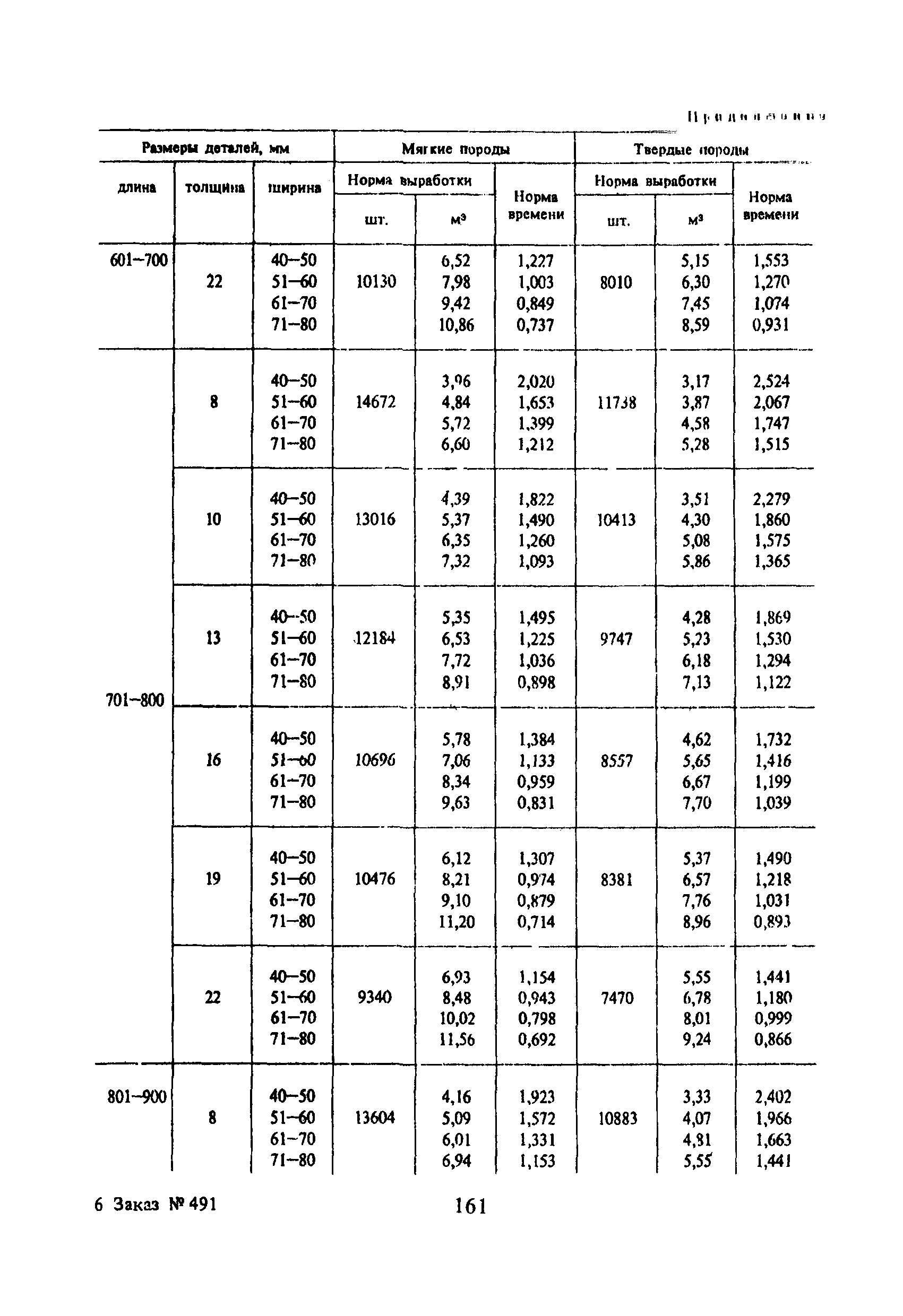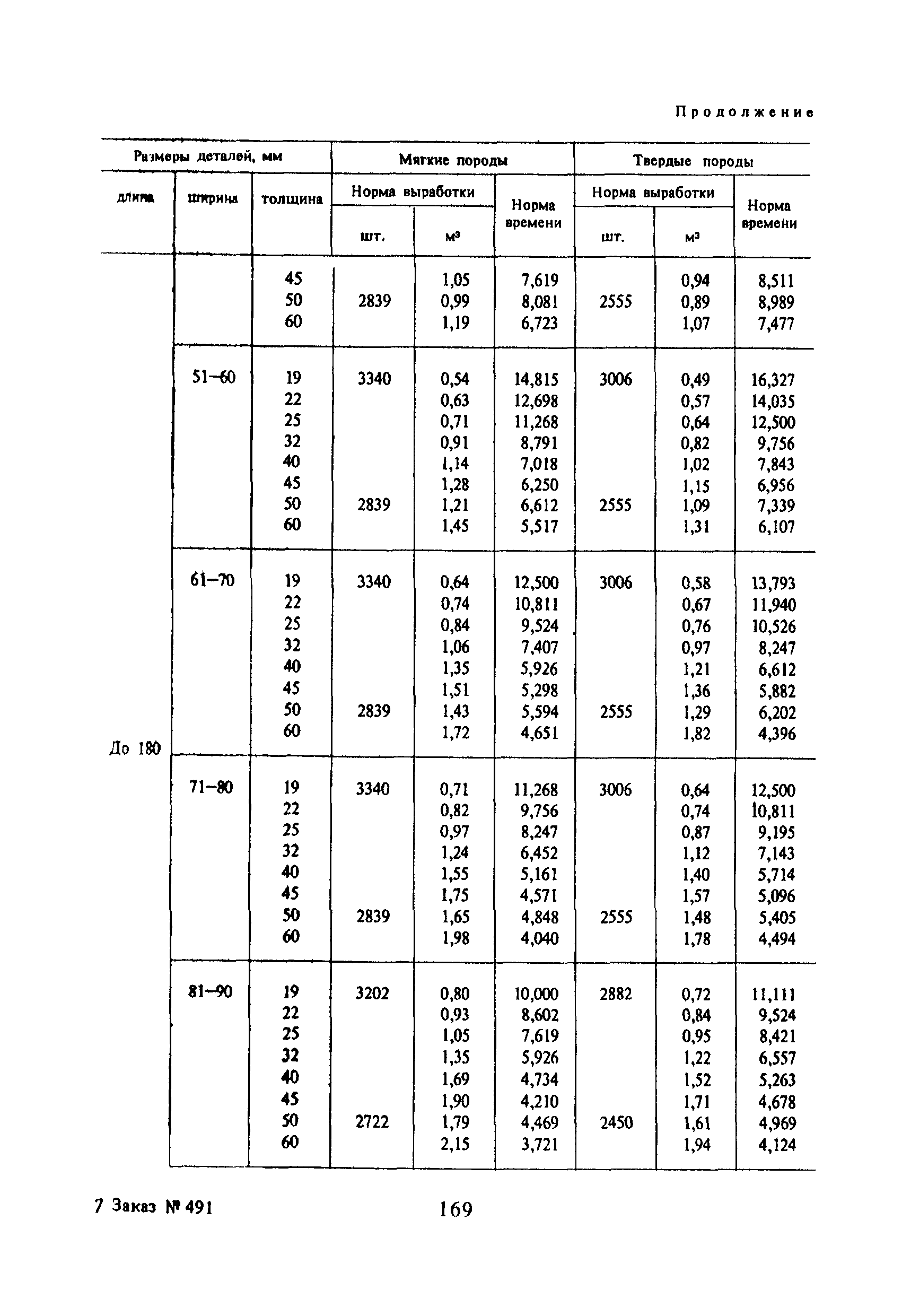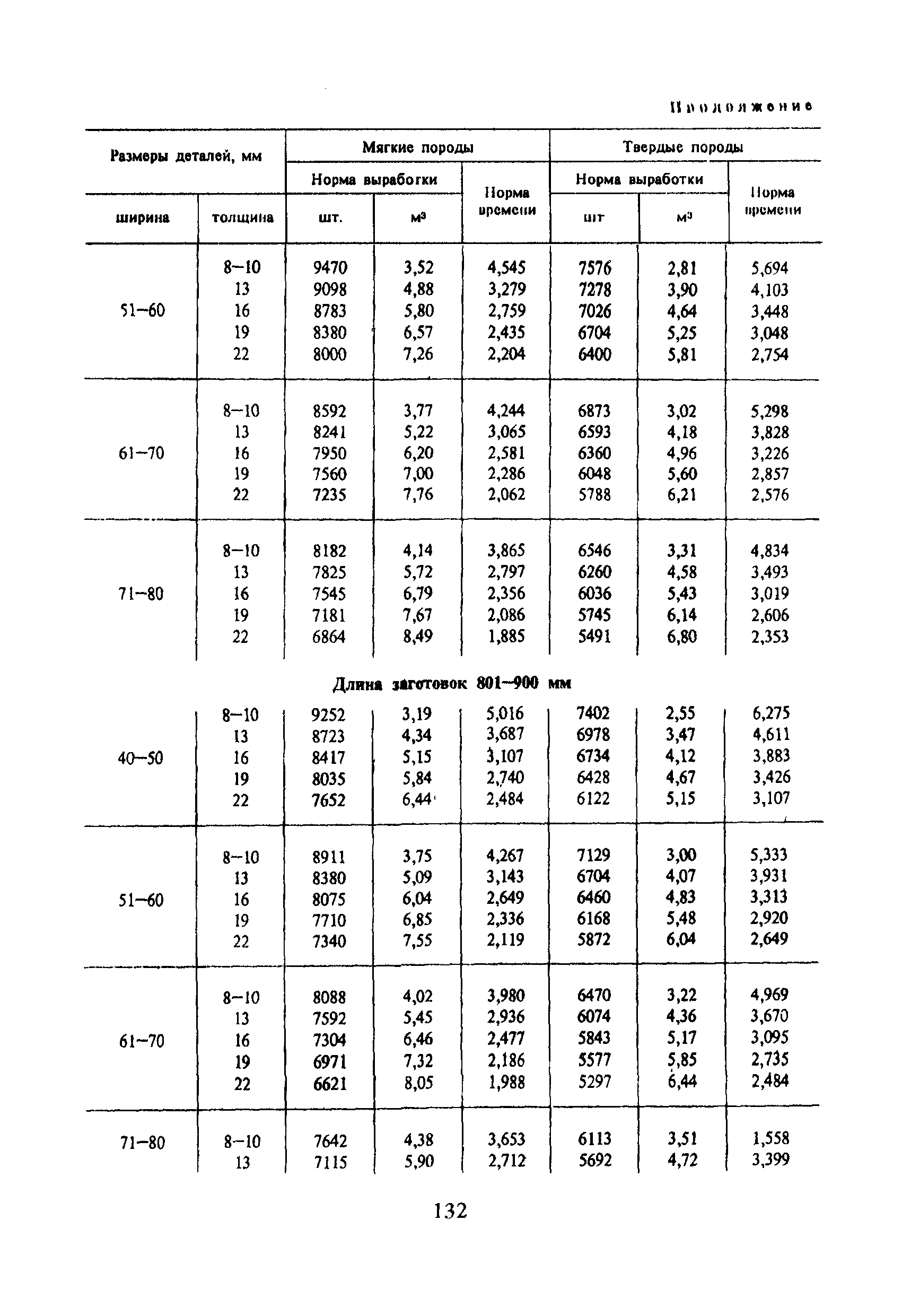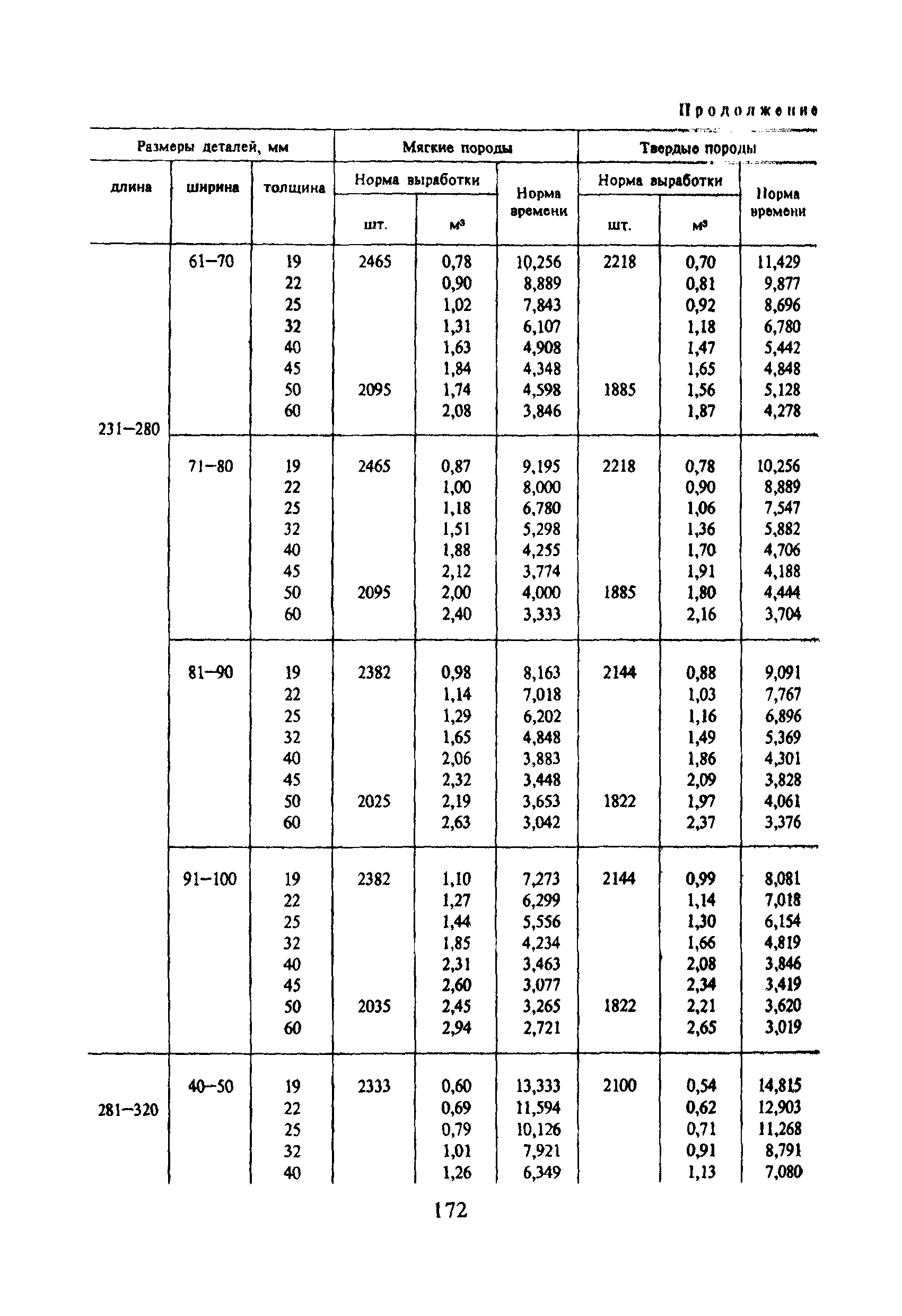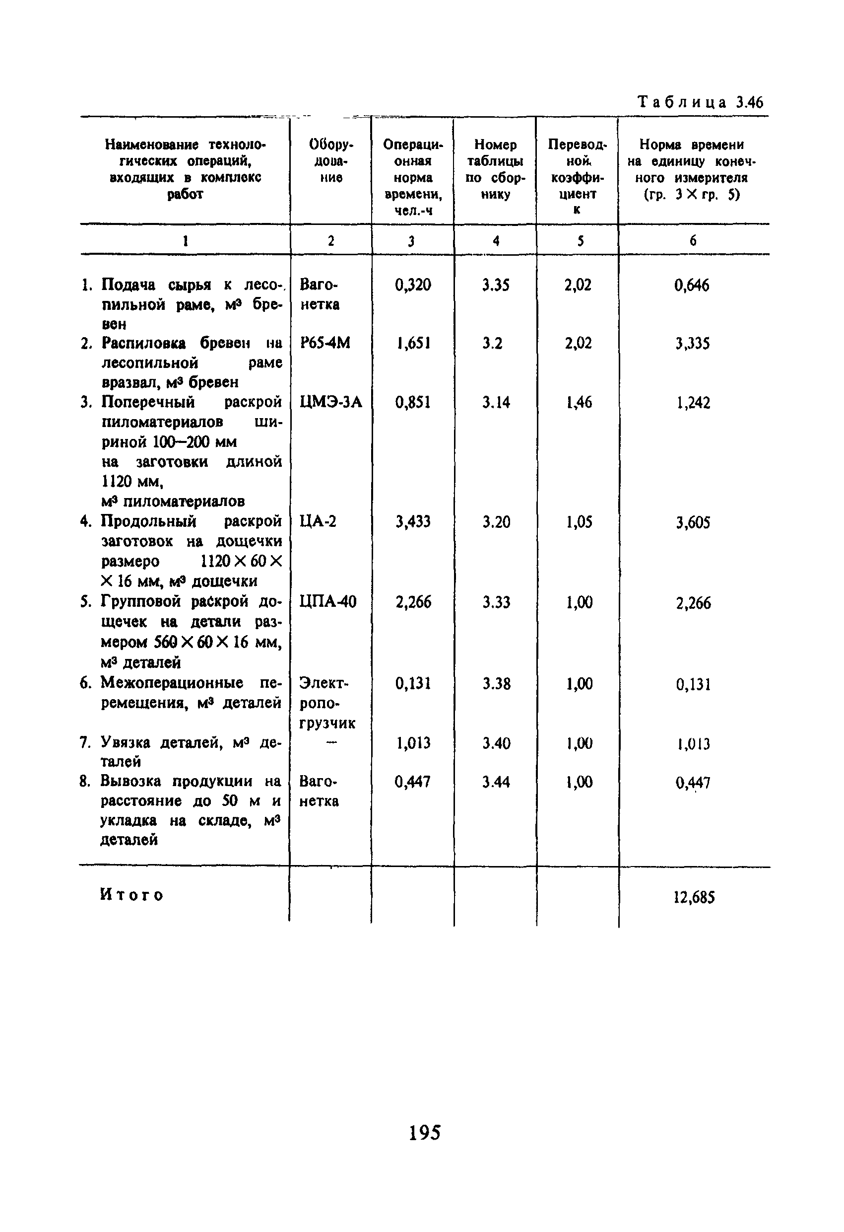 Типовые нормы выработки и времени на лесопильные работы (Работы, выполняемые на одноэтажных лесопильных рамах и круглопильных станках)| Статус: | справочные материалы, мп, тпр | | Название рус.: | Типовые нормы выработки и времени на лесопильные работы (Работы, выполняемые на одноэтажных лесопильных рамах и круглопильных станках) | | Дата добавления в базу: | 01.10.2014 | | Дата актуализации: | 01.01.2021 | | Область применения: | Типовые нормы предназначены для нормирования труда рабочих, выполняющих работы на лесопильных и тарных рамах, круглопильных станках, а также работы по перемещению, увязке и укладке сырья и изделий деревообработки, на всех предприятиях независимо от их ведомственной подчиненности | | Оглавление: | 1. Общая часть 2. Технология работы и организация труда 2.1. Переработка круглых сортиментов мягких пород 2.2. Переработка круглых сортиментов твердых пород 2.3. Переработка круглых короткомерных сортиментов 3. Нормативная часть 3.1. Нормы выработки и времени на распиловку круглых лесоматериалов на одноэтажных лесопильных рамах 3.1.1. Распиловка круглых сортиментов длиной 2,1 - 6,5 м вразвал при немеханизированном и полумеханизированном процессах лесопиления 3.1.2. Распиловка круглых сортиментов длиной 2,1 - 6,5 м на обрезные пиломатериалы при немеханизированном и полумеханизированном процессах лесопиления 3.1.3. Распиловка круглых сортиментов длиной 2,1 - 6,5 м вразвал при механизированном процессе лесопиления 3.1.4. Распиловка круглых сортиментов длиной 2,1 - 6,5 м на обрезные пиломатериалы при механизированном процессе лесопиления 3.1.5. Распиловка круглых сортиментов длиной 1 - 2 м на лесопильной раме РК 3.2. Нормы выработки и времени на поперечный раскрой древесины на круглопильных станках 3.2.1. Поперечный раскрой/круглых сортиментов на станке ЦБ-5 3.2.2. Поперечный раскрой пиломатериалов на станках типа ЦКБ-40 (ЦМЭ-3А, ЦМЭ-2), оборудованных поперечным транспортером для подачи пиломатериалов на стол станка 3.3. Нормы выработки и времени на продольный раскрой чураков на круглопильных станках 3.3.1. Продольный раскрой чураков на станке ЦДТ5-2 3.3.2. Продольный раскрой чураков на станке типа Ц2К- (Ц2К) 3.4. Нормы выработки и времени на продольный раскрой заготовок из пиломатериалов на круглопильных станках 3.4.1. Продольный раскрой необрезных пиломатериалов на станке ЦА-2 3.4.2. Продольный раскрой необрезных пиломатериалов на станках типа ЦДК4-3 (ЦДК4-2, ЦДК-4) 3.4.3. Продольный раскрой необрезных пиломатериалов на круглопильном станке ЦВП-1 3.4.4. Продольный раскрой необрезных пиломатериалов на станке типа Ц6-2 (Ц-6, Ц-5) 3.4 5. Продольный раскрой необрезных пиломатериалов на многопильных станках ЦА-2А, ЦДК5-2, ЦМ-80, ЦМ-120, ЦМР-2 3.5. Нормы выработки и времени на продольную распиловку пиломатериалов на тарной раме 3.5.1. Продольная распиловка пиломатериалов на тарных рамах РТ-2, РТ-36 3.6. Нормы выработки и времени на торцовку и поперечный раскрой заготовок кратной длины на детали на круглопильных станках 3.6.1. Пакетная торцовка деталей с одного конца на станке типа ЦПА-40 (ЦПА-2) 3.6.2. Групповой раскрой заготовок кратной длины на детали на станке ЦПА-40 3.6.3. Индивидуальный раскрой заготовок кратной длины на детали на станке Ц6-2 3.7. Нормы выработки на вспомогательные работы 3.7.1. Подача сырья в лесопильный цех вагонетками УЖД при погрузке мостовым краном 3.7.2. Подача сырья в лесопильный цех и вывозка п