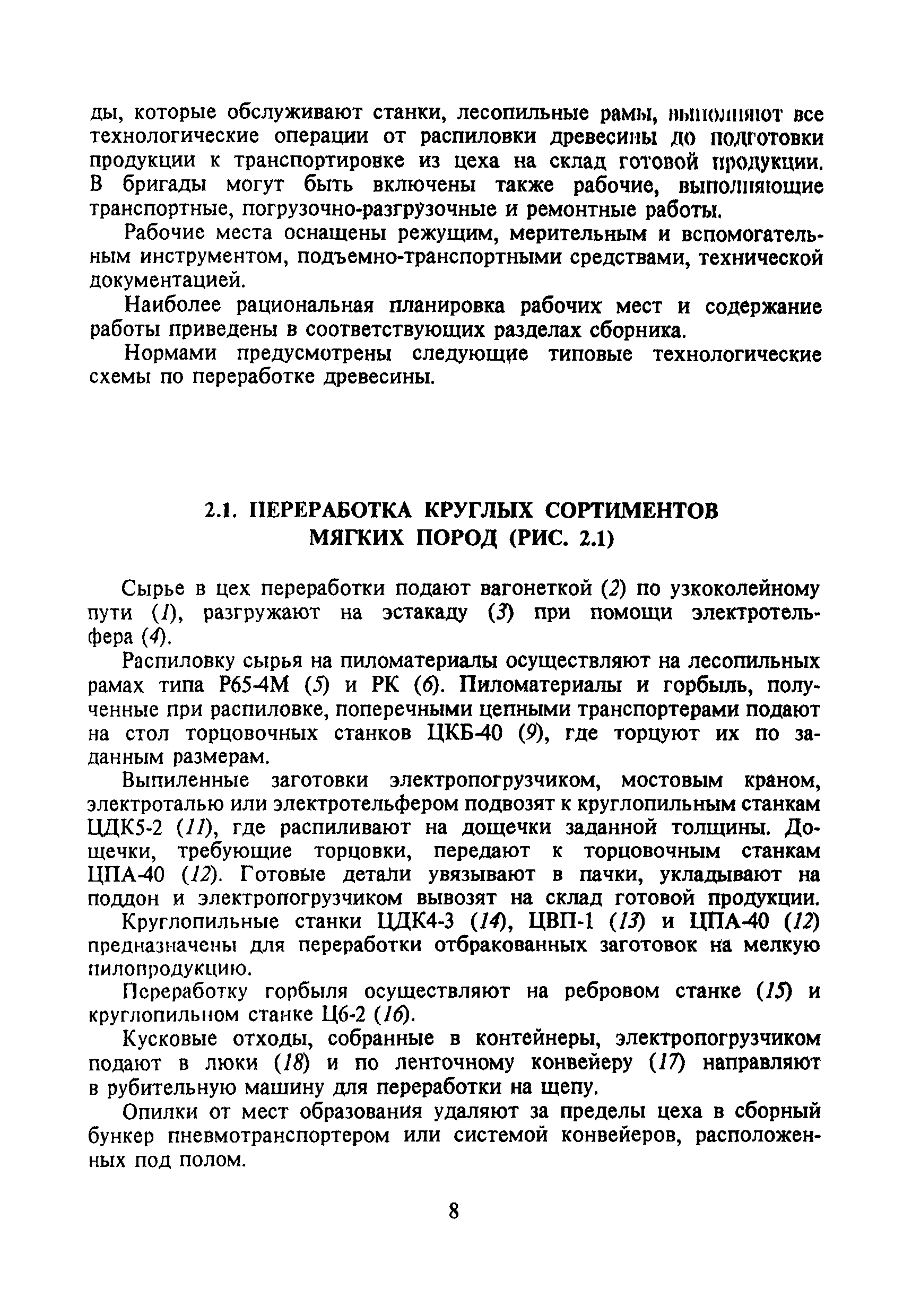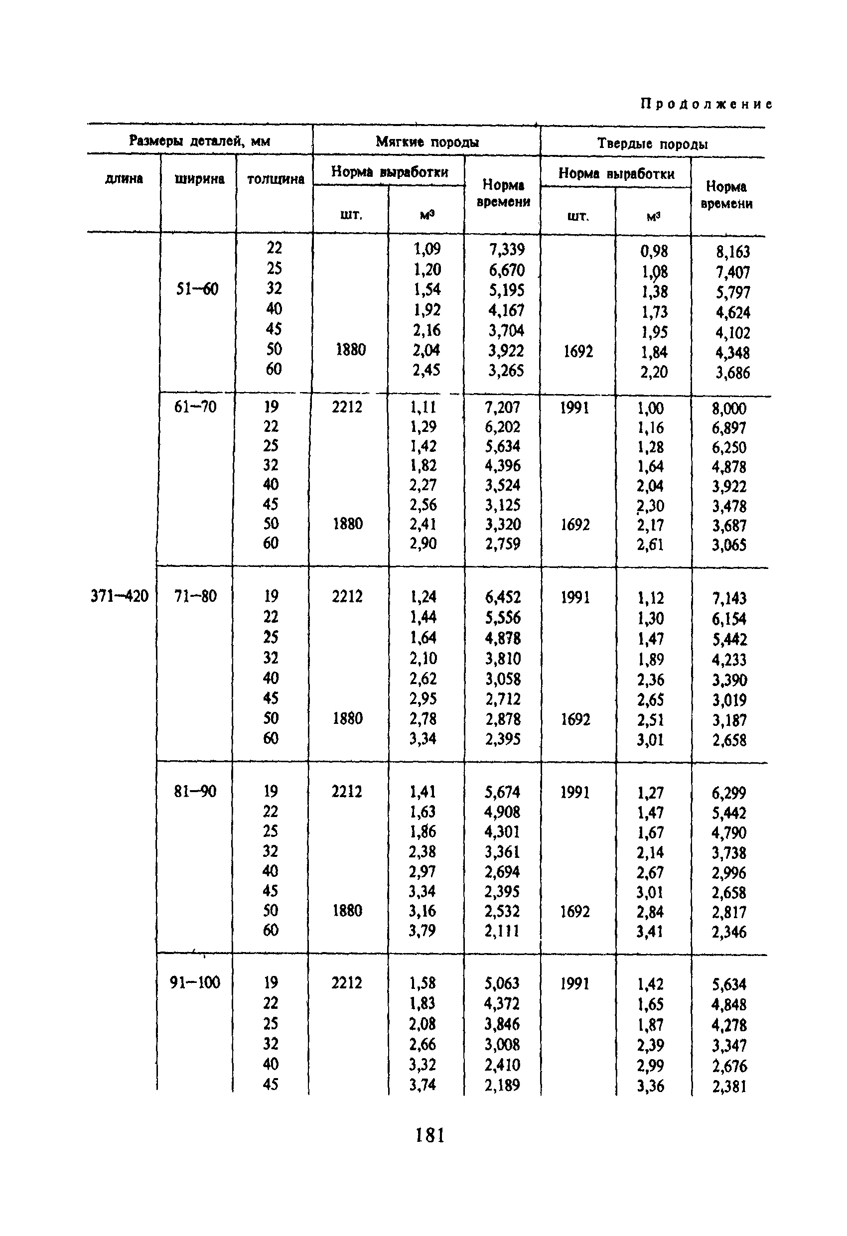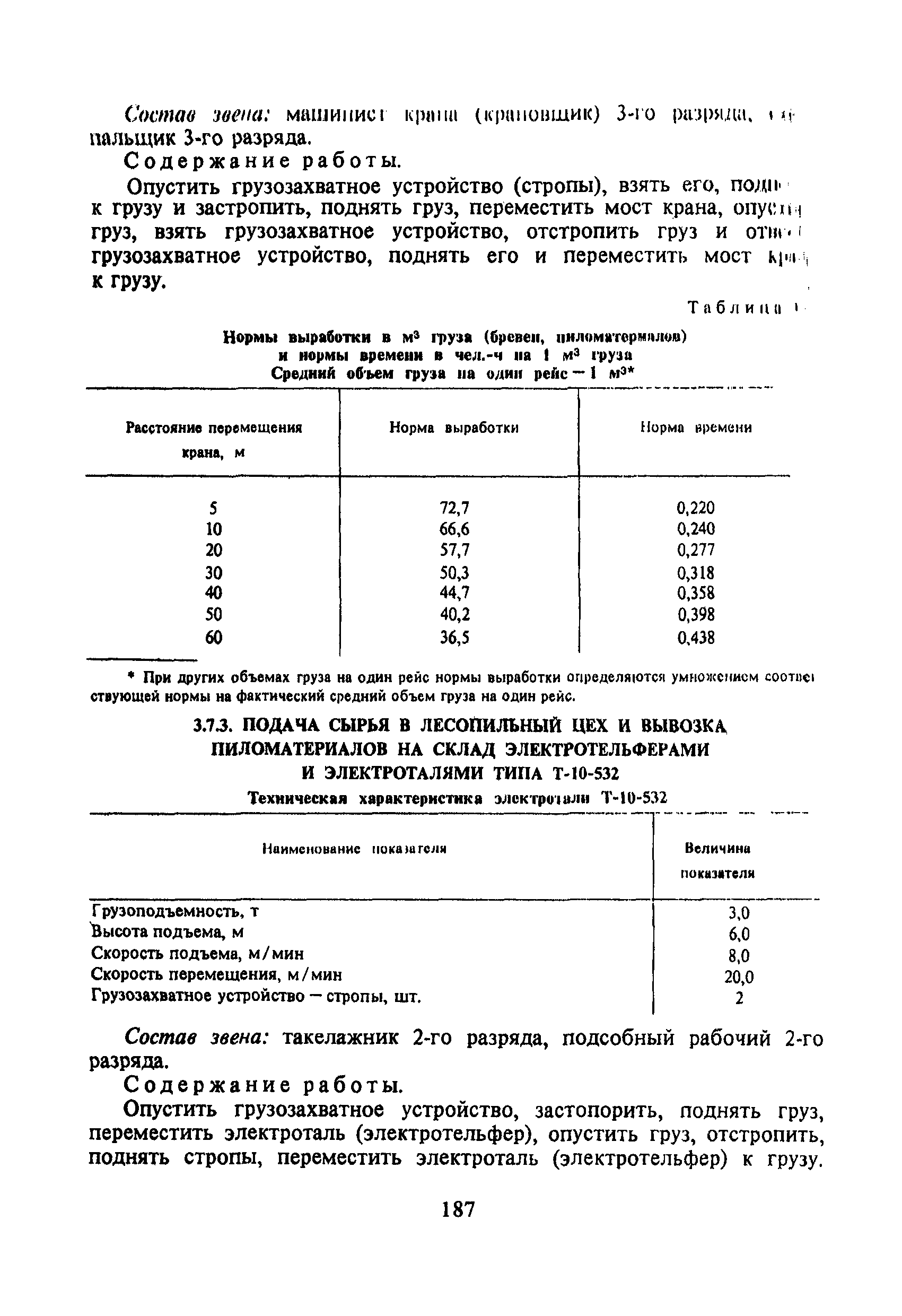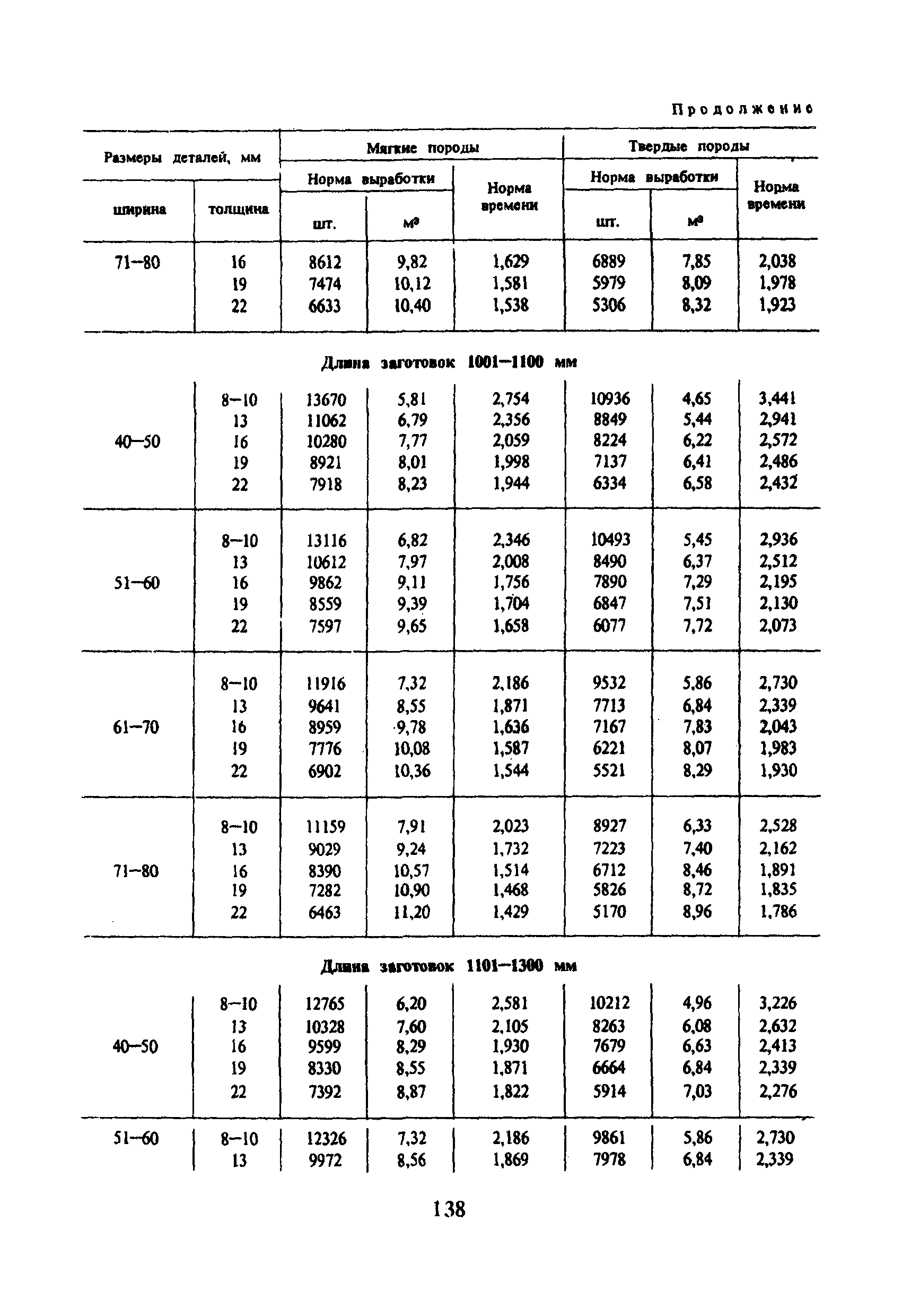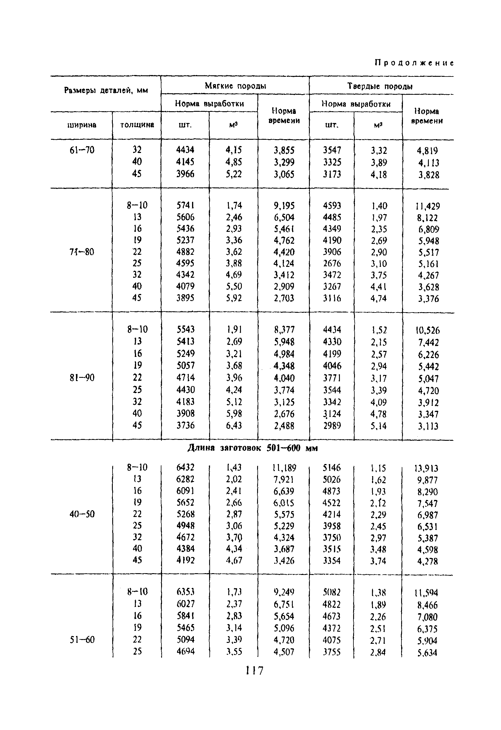 Типовые нормы выработки и времени на лесопильные работы (Работы, выполняемые на одноэтажных лесопильных рамах и круглопильных станках)| Статус: | справочные материалы, мп, тпр | | Название рус.: | Типовые нормы выработки и времени на лесопильные работы (Работы, выполняемые на одноэтажных лесопильных рамах и круглопильных станках) | | Дата добавления в базу: | 01.10.2014 | | Дата актуализации: | 01.01.2021 | | Область применения: | Типовые нормы предназначены для нормирования труда рабочих, выполняющих работы на лесопильных и тарных рамах, круглопильных станках, а также работы по перемещению, увязке и укладке сырья и изделий деревообработки, на всех предприятиях независимо от их ведомственной подчиненности | | Оглавление: | 1. Общая часть 2. Технология работы и организация труда 2.1. Переработка круглых сортиментов мягких пород 2.2. Переработка круглых сортиментов твердых пород 2.3. Переработка круглых короткомерных сортиментов 3. Нормативная часть 3.1. Нормы выработки и времени на распиловку круглых лесоматериалов на одноэтажных лесопильных рамах 3.1.1. Распиловка круглых сортиментов длиной 2,1 - 6,5 м вразвал при немеханизированном и полумеханизированном процессах лесопиления 3.1.2. Распиловка круглых сортиментов длиной 2,1 - 6,5 м на обрезные пиломатериалы при немеханизированном и полумеханизированном процессах лесопиления 3.1.3. Распиловка круглых сортиментов длиной 2,1 - 6,5 м вразвал при механизированном процессе лесопиления 3.1.4. Распиловка круглых сортиментов длиной 2,1 - 6,5 м на обрезные пиломатериалы при механизированном процессе лесопиления 3.1.5. Распиловка круглых сортиментов длиной 1 - 2 м на лесопильной раме РК 3.2. Нормы выработки и времени на поперечный раскрой древесины на круглопильных станках 3.2.1. Поперечный раскрой/круглых сортиментов на станке ЦБ-5 3.2.2. Поперечный раскрой пиломатериалов на станках типа ЦКБ-40 (ЦМЭ-3А, ЦМЭ-2), оборудованных поперечным транспортером для подачи пиломатериалов на стол станка 3.3. Нормы выработки и времени на продольный раскрой чураков на круглопильных станках 3.3.1. Продольный раскрой чураков на станке ЦДТ5-2 3.3.2. Продольный раскрой чураков на станке типа Ц2К- (Ц2К) 3.4. Нормы выработки и времени на продольный раскрой заготовок из пиломатериалов на круглопильных станках 3.4.1. Продольный раскрой необрезных пиломатериалов на станке ЦА-2 3.4.2. Продольный раскрой необрезных пиломатериалов на станках типа ЦДК4-3 (ЦДК4-2, ЦДК-4) 3.4.3. Продольный раскрой необрезных пиломатериалов на круглопильном станке ЦВП-1 3.4.4. Продольный раскрой необрезных пиломатериалов на станке типа Ц6-2 (Ц-6, Ц-5) 3.4 5. Продольный раскрой необрезных пиломатериалов на многопильных станках ЦА-2А, ЦДК5-2, ЦМ-80, ЦМ-120, ЦМР-2 3.5. Нормы выработки и времени на продольную распиловку пиломатериалов на тарной раме 3.5.1. Продольная распиловка пиломатериалов на тарных рамах РТ-2, РТ-36 3.6. Нормы выработки и времени на торцовку и поперечный раскрой заготовок кратной длины на детали на круглопильных станках 3.6.1. Пакетная торцовка деталей с одного конца на станке типа ЦПА-40 (ЦПА-2) 3.6.2. Групповой раскрой заготовок кратной длины на детали на станке ЦПА-40 3.6.3. Индивидуальный раскрой заготовок кратной длины на детали на станке Ц6-2 3.7. Нормы выработки на вспомогательные работы 3.7.1. Подача сырья в лесопильный цех вагонетками УЖД при погрузке мостовым краном 3.7.2. Подача сырья в лесопильный цех и вывозка п