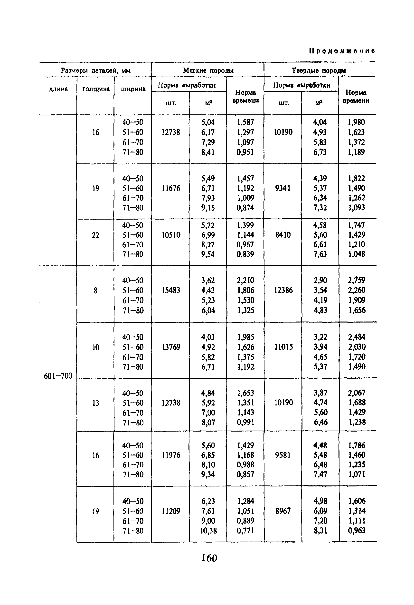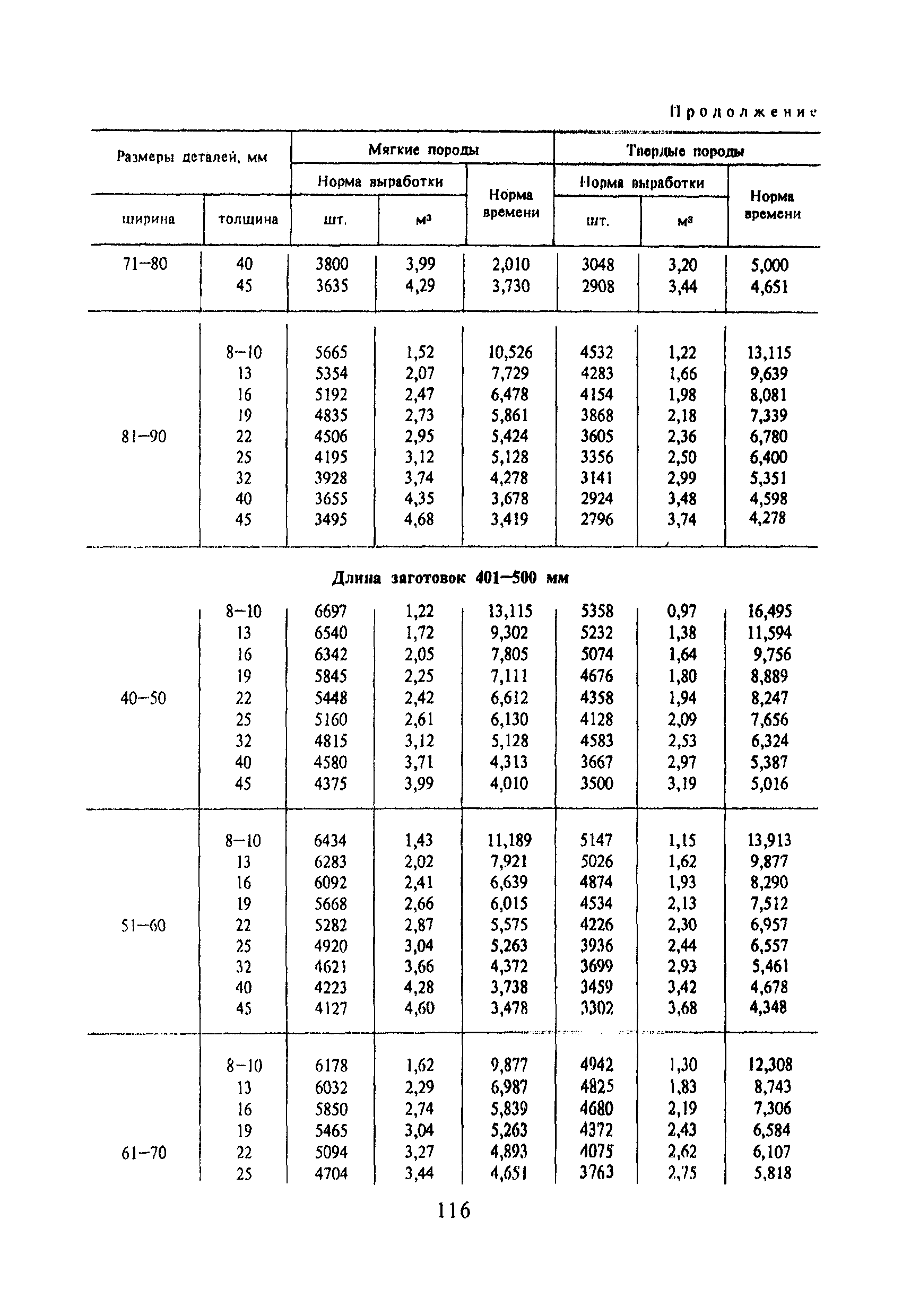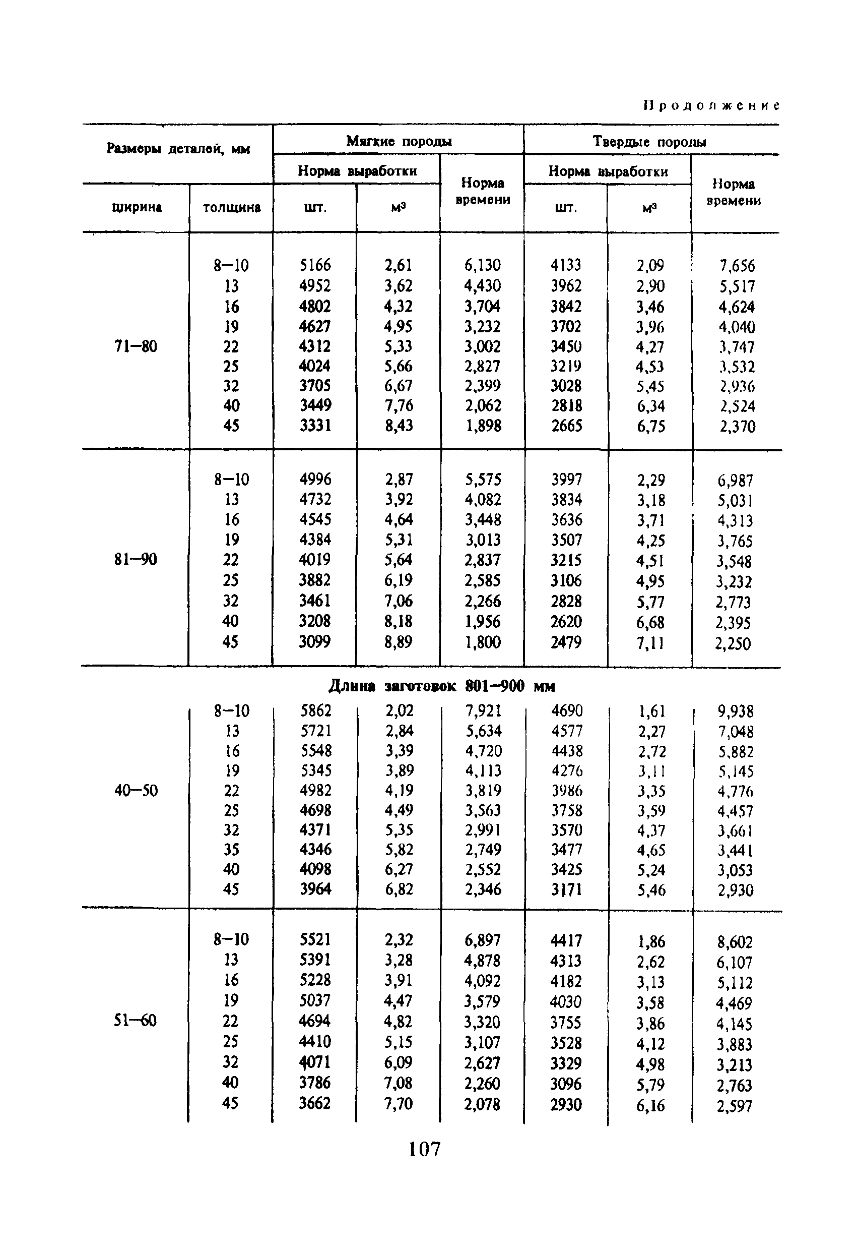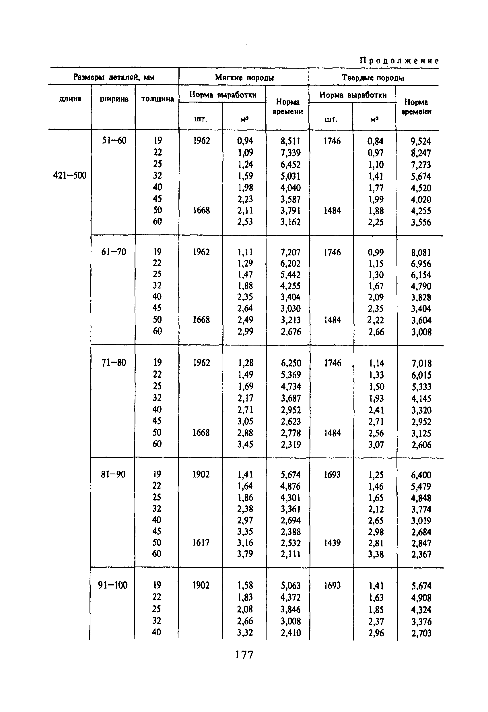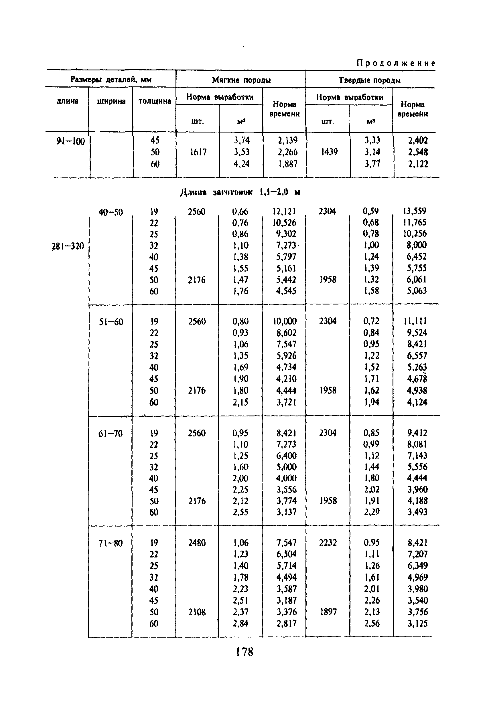 Типовые нормы выработки и времени на лесопильные работы (Работы, выполняемые на одноэтажных лесопильных рамах и круглопильных станках)| Статус: | справочные материалы, мп, тпр | | Название рус.: | Типовые нормы выработки и времени на лесопильные работы (Работы, выполняемые на одноэтажных лесопильных рамах и круглопильных станках) | | Дата добавления в базу: | 01.10.2014 | | Дата актуализации: | 01.01.2021 | | Область применения: | Типовые нормы предназначены для нормирования труда рабочих, выполняющих работы на лесопильных и тарных рамах, круглопильных станках, а также работы по перемещению, увязке и укладке сырья и изделий деревообработки, на всех предприятиях независимо от их ведомственной подчиненности | | Оглавление: | 1. Общая часть 2. Технология работы и организация труда 2.1. Переработка круглых сортиментов мягких пород 2.2. Переработка круглых сортиментов твердых пород 2.3. Переработка круглых короткомерных сортиментов 3. Нормативная часть 3.1. Нормы выработки и времени на распиловку круглых лесоматериалов на одноэтажных лесопильных рамах 3.1.1. Распиловка круглых сортиментов длиной 2,1 - 6,5 м вразвал при немеханизированном и полумеханизированном процессах лесопиления 3.1.2. Распиловка круглых сортиментов длиной 2,1 - 6,5 м на обрезные пиломатериалы при немеханизированном и полумеханизированном процессах лесопиления 3.1.3. Распиловка круглых сортиментов длиной 2,1 - 6,5 м вразвал при механизированном процессе лесопиления 3.1.4. Распиловка круглых сортиментов длиной 2,1 - 6,5 м на обрезные пиломатериалы при механизированном процессе лесопиления 3.1.5. Распиловка круглых сортиментов длиной 1 - 2 м на лесопильной раме РК 3.2. Нормы выработки и времени на поперечный раскрой древесины на круглопильных станках 3.2.1. Поперечный раскрой/круглых сортиментов на станке ЦБ-5 3.2.2. Поперечный раскрой пиломатериалов на станках типа ЦКБ-40 (ЦМЭ-3А, ЦМЭ-2), оборудованных поперечным транспортером для подачи пиломатериалов на стол станка 3.3. Нормы выработки и времени на продольный раскрой чураков на круглопильных станках 3.3.1. Продольный раскрой чураков на станке ЦДТ5-2 3.3.2. Продольный раскрой чураков на станке типа Ц2К- (Ц2К) 3.4. Нормы выработки и времени на продольный раскрой заготовок из пиломатериалов на круглопильных станках 3.4.1. Продольный раскрой необрезных пиломатериалов на станке ЦА-2 3.4.2. Продольный раскрой необрезных пиломатериалов на станках типа ЦДК4-3 (ЦДК4-2, ЦДК-4) 3.4.3. Продольный раскрой необрезных пиломатериалов на круглопильном станке ЦВП-1 3.4.4. Продольный раскрой необрезных пиломатериалов на станке типа Ц6-2 (Ц-6, Ц-5) 3.4 5. Продольный раскрой необрезных пиломатериалов на многопильных станках ЦА-2А, ЦДК5-2, ЦМ-80, ЦМ-120, ЦМР-2 3.5. Нормы выработки и времени на продольную распиловку пиломатериалов на тарной раме 3.5.1. Продольная распиловка пиломатериалов на тарных рамах РТ-2, РТ-36 3.6. Нормы выработки и времени на торцовку и поперечный раскрой заготовок кратной длины на детали на круглопильных станках 3.6.1. Пакетная торцовка деталей с одного конца на станке типа ЦПА-40 (ЦПА-2) 3.6.2. Групповой раскрой заготовок кратной длины на детали на станке ЦПА-40 3.6.3. Индивидуальный раскрой заготовок кратной длины на детали на станке Ц6-2 3.7. Нормы выработки на вспомогательные работы 3.7.1. Подача сырья в лесопильный цех вагонетками УЖД при погрузке мостовым краном 3.7.2. Подача сырья в лесопильный цех и вывозка п