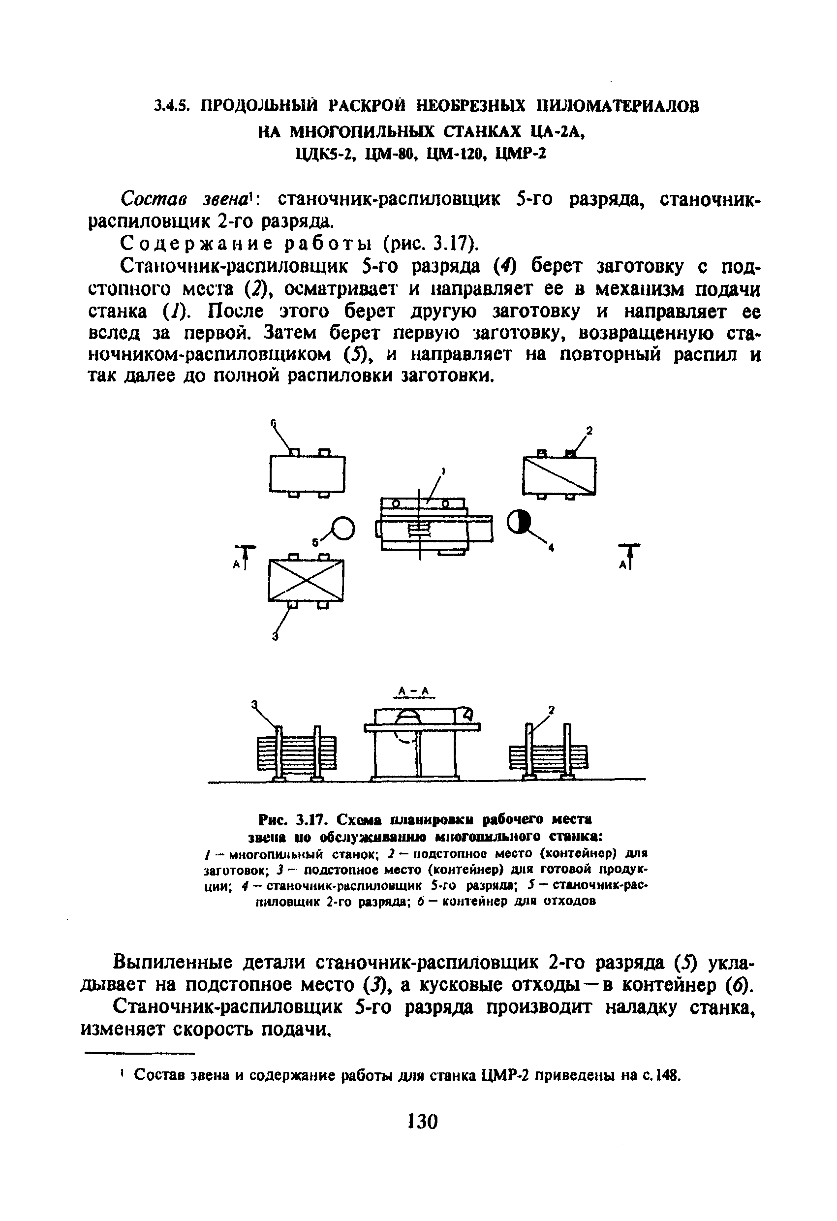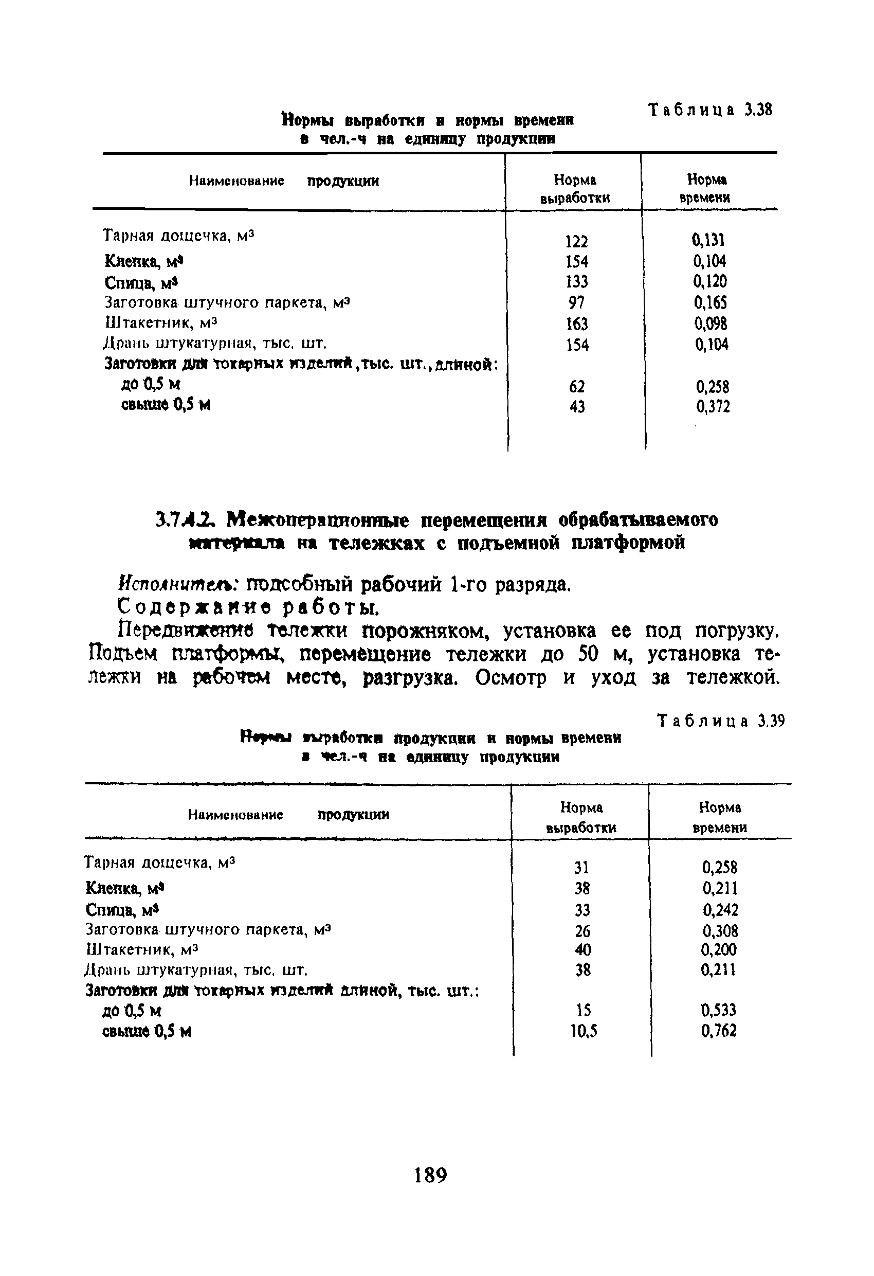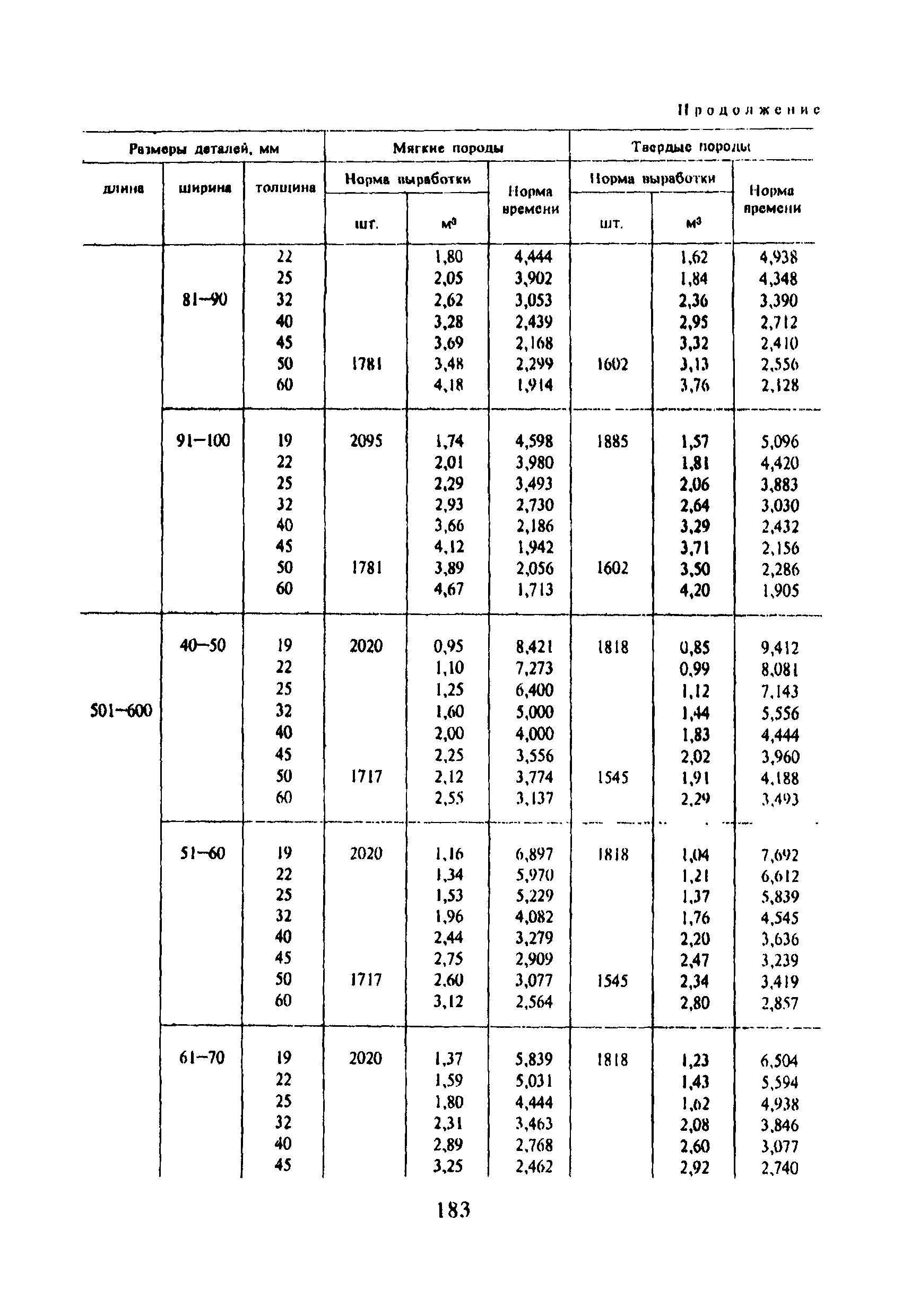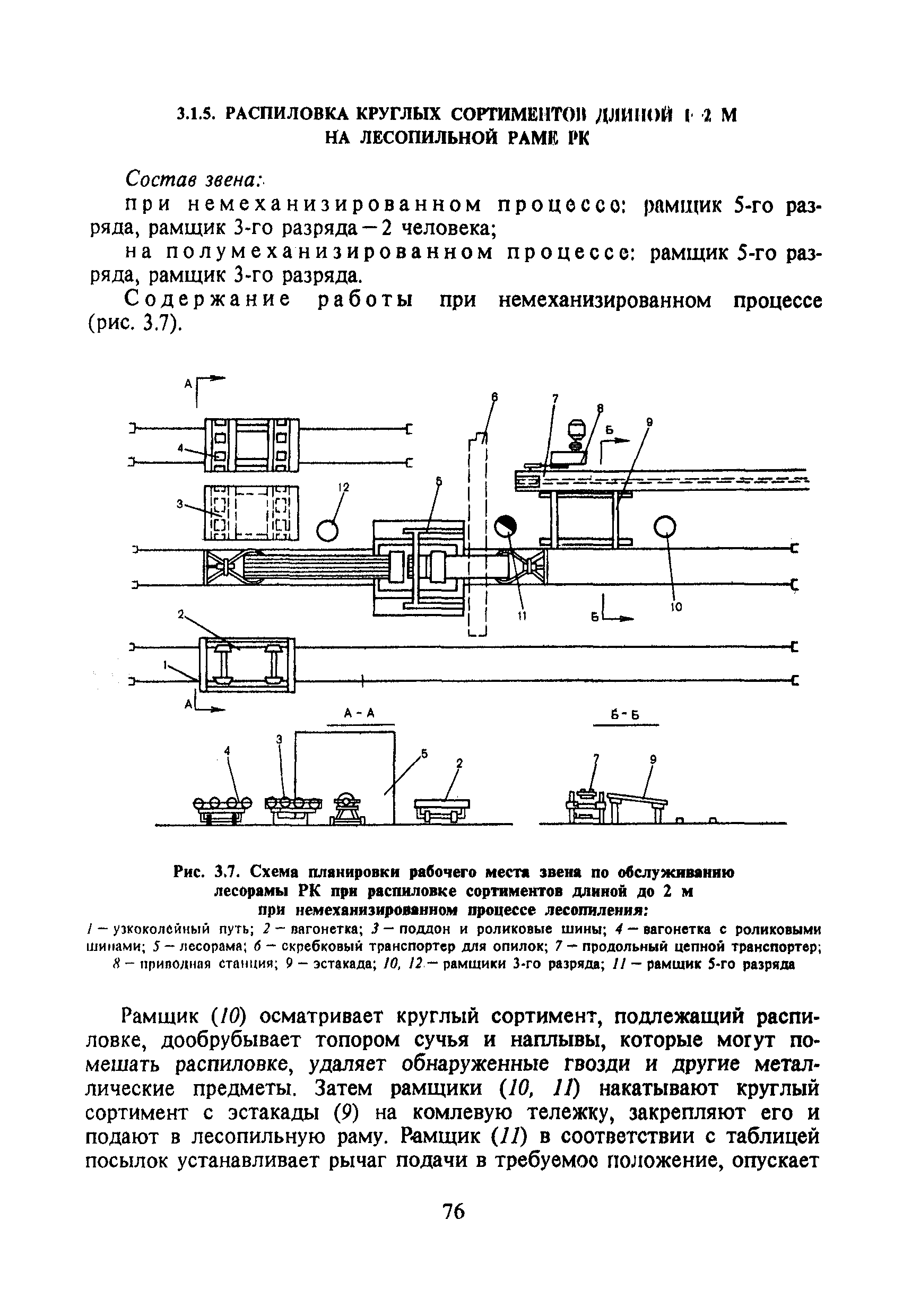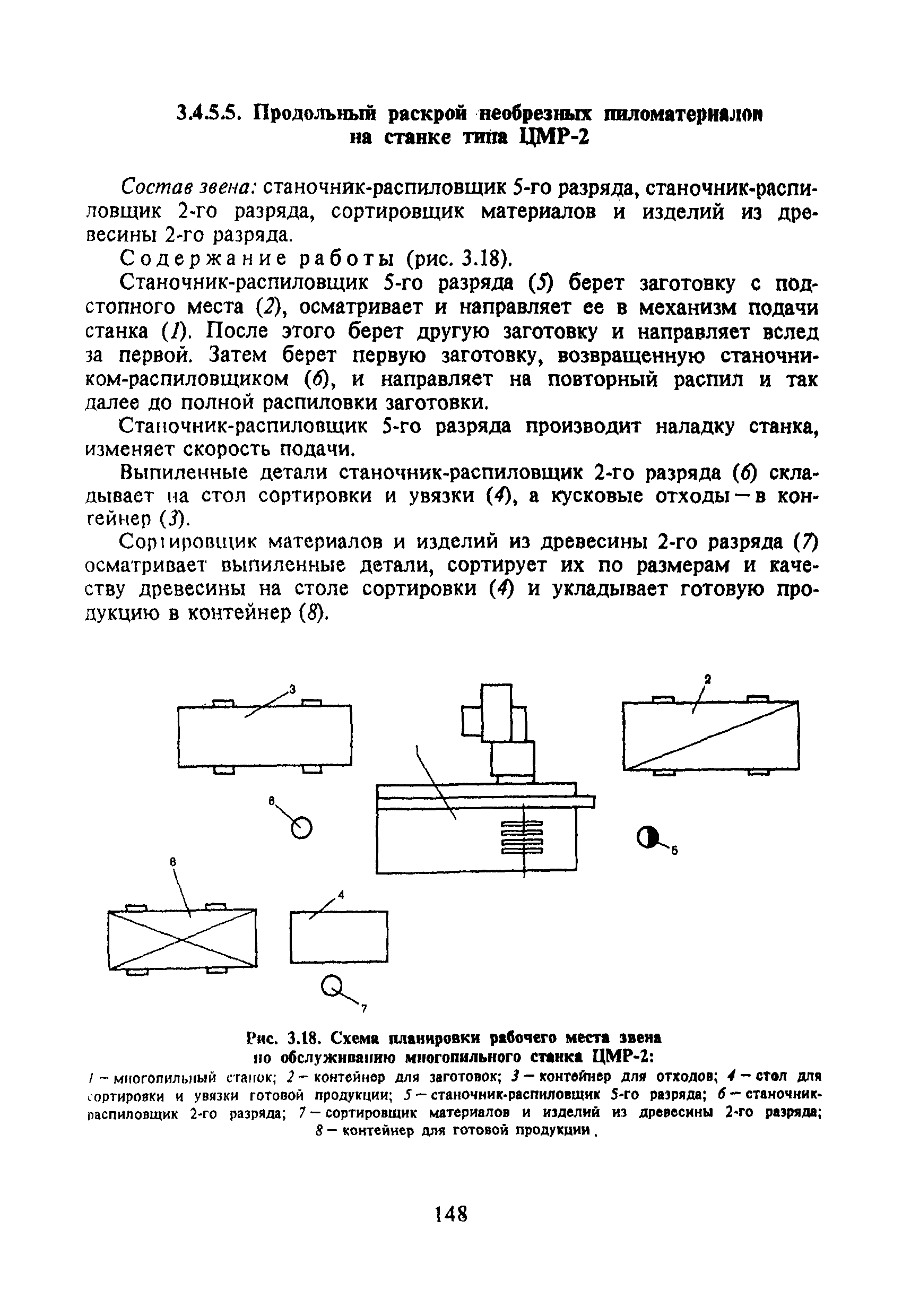 Типовые нормы выработки и времени на лесопильные работы (Работы, выполняемые на одноэтажных лесопильных рамах и круглопильных станках)| Статус: | справочные материалы, мп, тпр | | Название рус.: | Типовые нормы выработки и времени на лесопильные работы (Работы, выполняемые на одноэтажных лесопильных рамах и круглопильных станках) | | Дата добавления в базу: | 01.10.2014 | | Дата актуализации: | 01.01.2021 | | Область применения: | Типовые нормы предназначены для нормирования труда рабочих, выполняющих работы на лесопильных и тарных рамах, круглопильных станках, а также работы по перемещению, увязке и укладке сырья и изделий деревообработки, на всех предприятиях независимо от их ведомственной подчиненности | | Оглавление: | 1. Общая часть 2. Технология работы и организация труда 2.1. Переработка круглых сортиментов мягких пород 2.2. Переработка круглых сортиментов твердых пород 2.3. Переработка круглых короткомерных сортиментов 3. Нормативная часть 3.1. Нормы выработки и времени на распиловку круглых лесоматериалов на одноэтажных лесопильных рамах 3.1.1. Распиловка круглых сортиментов длиной 2,1 - 6,5 м вразвал при немеханизированном и полумеханизированном процессах лесопиления 3.1.2. Распиловка круглых сортиментов длиной 2,1 - 6,5 м на обрезные пиломатериалы при немеханизированном и полумеханизированном процессах лесопиления 3.1.3. Распиловка круглых сортиментов длиной 2,1 - 6,5 м вразвал при механизированном процессе лесопиления 3.1.4. Распиловка круглых сортиментов длиной 2,1 - 6,5 м на обрезные пиломатериалы при механизированном процессе лесопиления 3.1.5. Распиловка круглых сортиментов длиной 1 - 2 м на лесопильной раме РК 3.2. Нормы выработки и времени на поперечный раскрой древесины на круглопильных станках 3.2.1. Поперечный раскрой/круглых сортиментов на станке ЦБ-5 3.2.2. Поперечный раскрой пиломатериалов на станках типа ЦКБ-40 (ЦМЭ-3А, ЦМЭ-2), оборудованных поперечным транспортером для подачи пиломатериалов на стол станка 3.3. Нормы выработки и времени на продольный раскрой чураков на круглопильных станках 3.3.1. Продольный раскрой чураков на станке ЦДТ5-2 3.3.2. Продольный раскрой чураков на станке типа Ц2К- (Ц2К) 3.4. Нормы выработки и времени на продольный раскрой заготовок из пиломатериалов на круглопильных станках 3.4.1. Продольный раскрой необрезных пиломатериалов на станке ЦА-2 3.4.2. Продольный раскрой необрезных пиломатериалов на станках типа ЦДК4-3 (ЦДК4-2, ЦДК-4) 3.4.3. Продольный раскрой необрезных пиломатериалов на круглопильном станке ЦВП-1 3.4.4. Продольный раскрой необрезных пиломатериалов на станке типа Ц6-2 (Ц-6, Ц-5) 3.4 5. Продольный раскрой необрезных пиломатериалов на многопильных станках ЦА-2А, ЦДК5-2, ЦМ-80, ЦМ-120, ЦМР-2 3.5. Нормы выработки и времени на продольную распиловку пиломатериалов на тарной раме 3.5.1. Продольная распиловка пиломатериалов на тарных рамах РТ-2, РТ-36 3.6. Нормы выработки и времени на торцовку и поперечный раскрой заготовок кратной длины на детали на круглопильных станках 3.6.1. Пакетная торцовка деталей с одного конца на станке типа ЦПА-40 (ЦПА-2) 3.6.2. Групповой раскрой заготовок кратной длины на детали на станке ЦПА-40 3.6.3. Индивидуальный раскрой заготовок кратной длины на детали на станке Ц6-2 3.7. Нормы выработки на вспомогательные работы 3.7.1. Подача сырья в лесопильный цех вагонетками УЖД при погрузке мостовым краном 3.7.2. Подача сырья в лесопильный цех и вывозка п