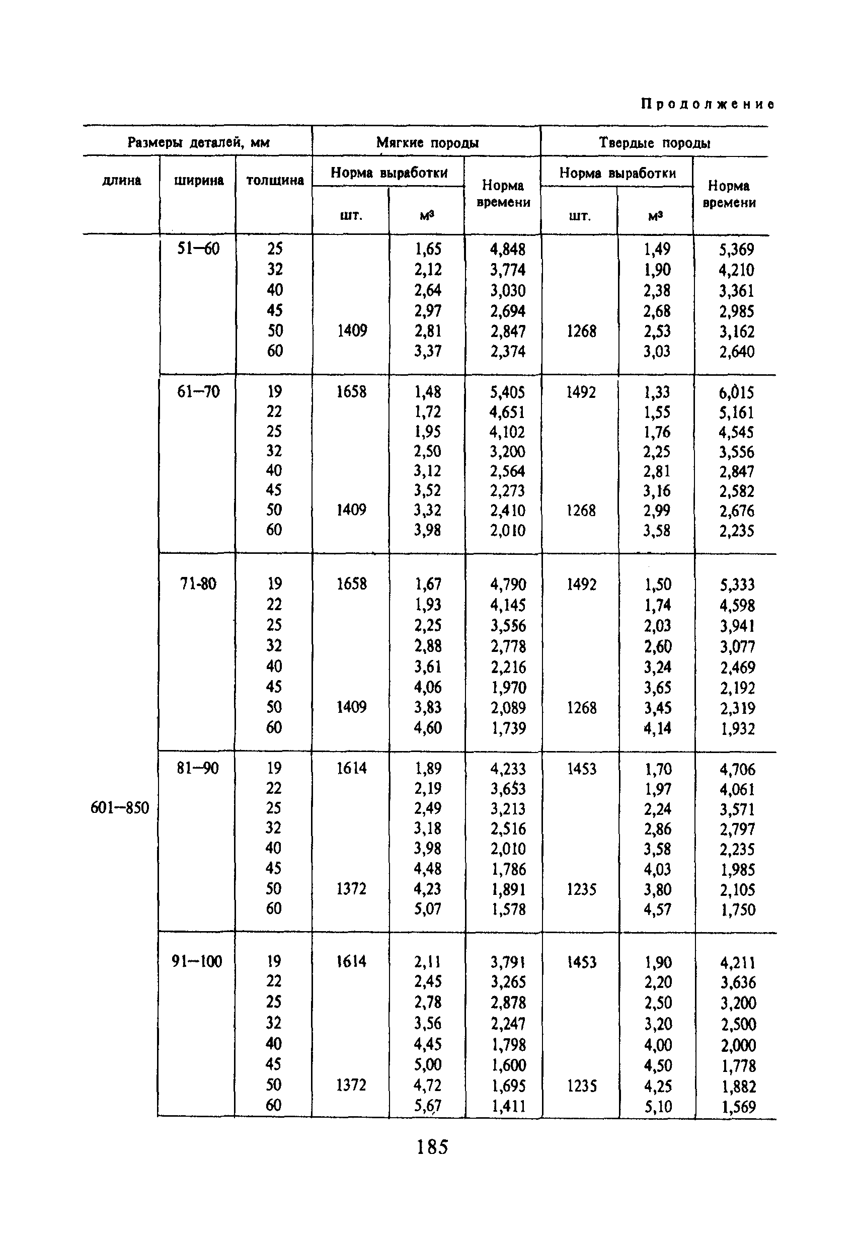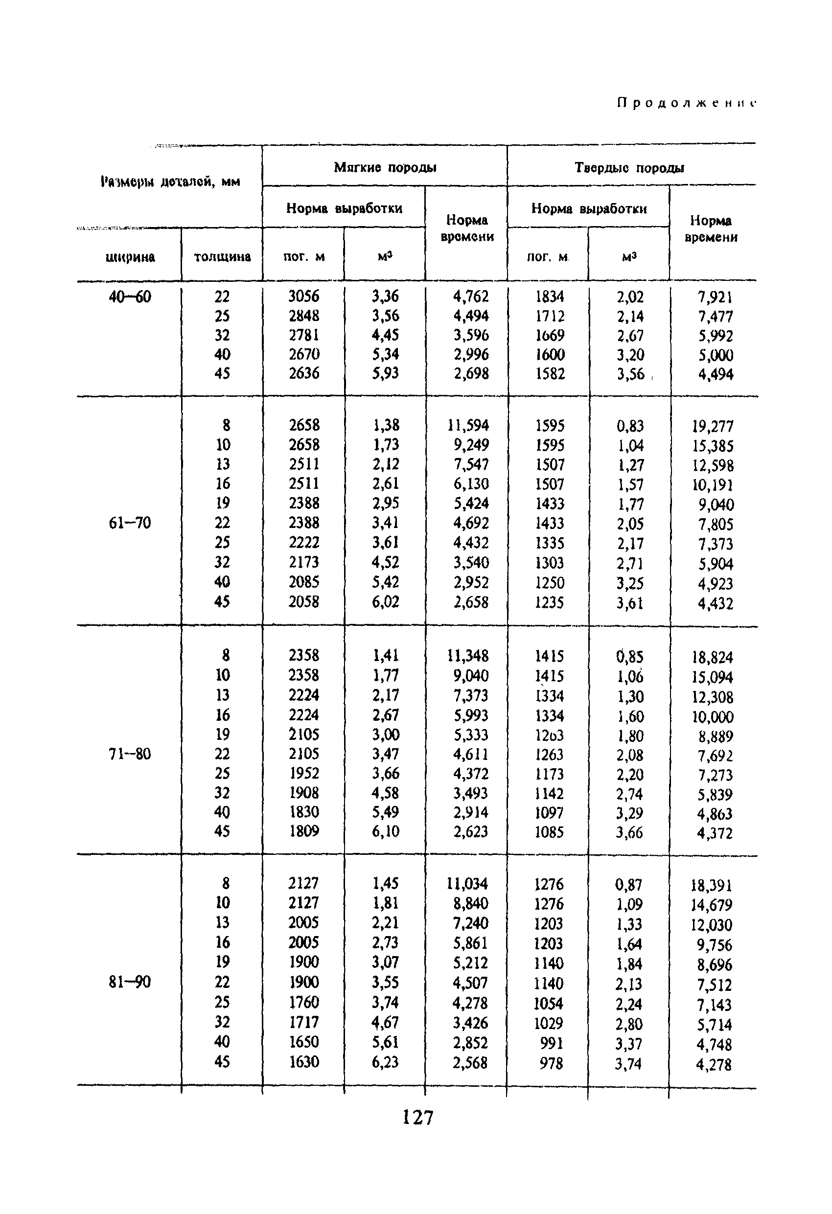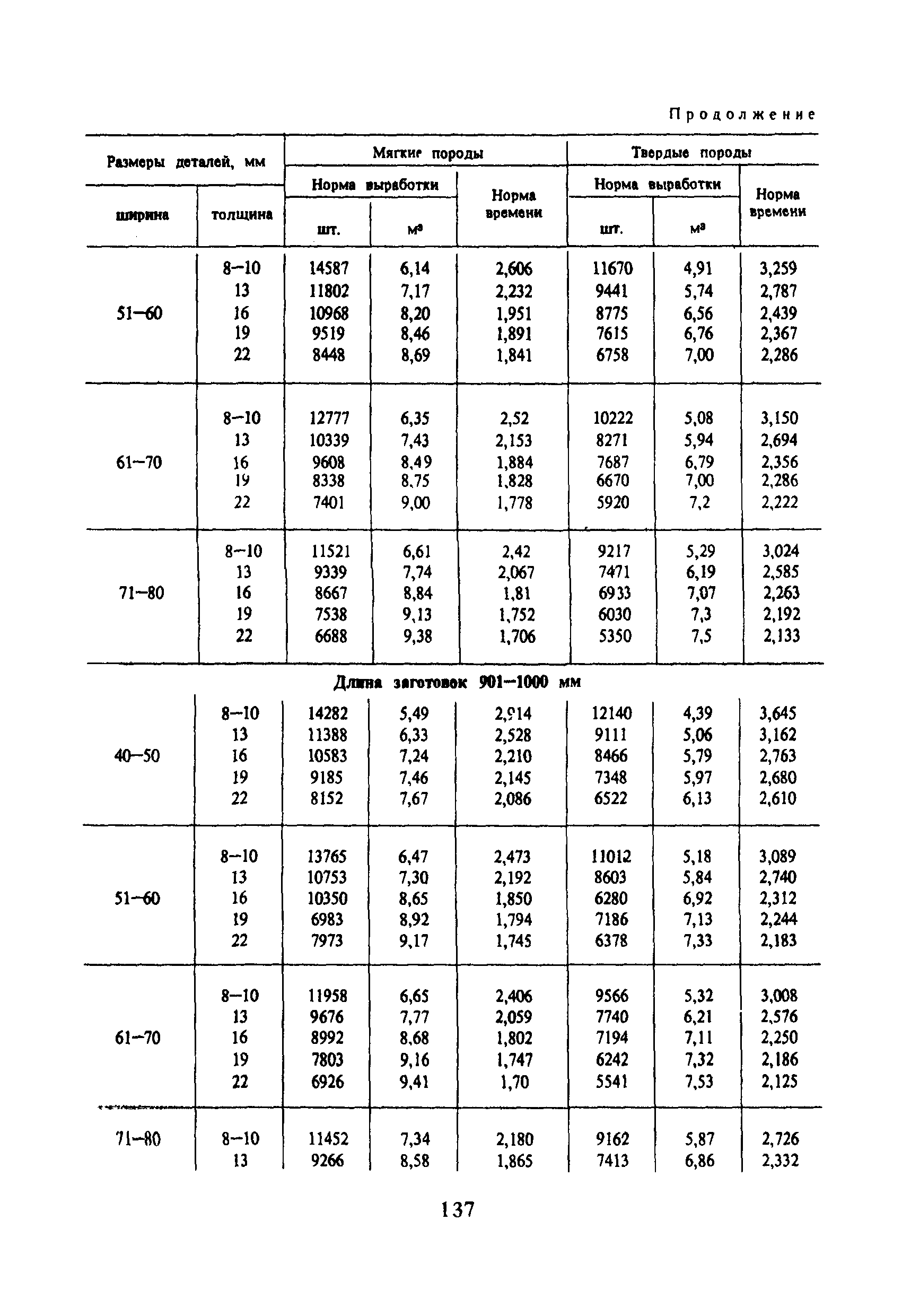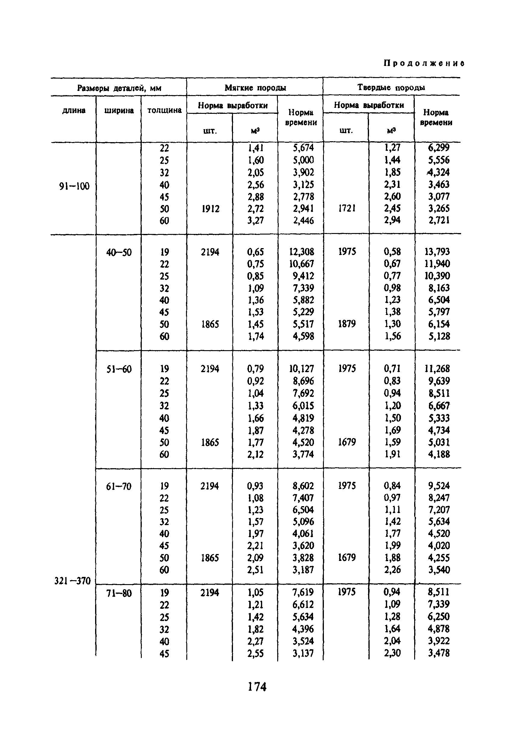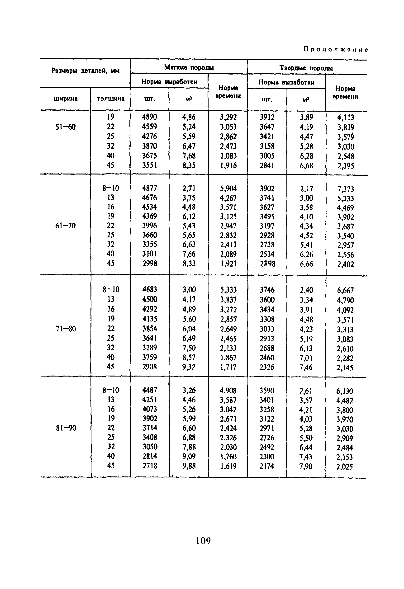Типовые нормы выработки и времени на лесопильные работы (Работы, выполняемые на одноэтажных лесопильных рамах и круглопильных станках)| Статус: | справочные материалы, мп, тпр | | Название рус.: | Типовые нормы выработки и времени на лесопильные работы (Работы, выполняемые на одноэтажных лесопильных рамах и круглопильных станках) | | Дата добавления в базу: | 01.10.2014 | | Дата актуализации: | 01.01.2021 | | Область применения: | Типовые нормы предназначены для нормирования труда рабочих, выполняющих работы на лесопильных и тарных рамах, круглопильных станках, а также работы по перемещению, увязке и укладке сырья и изделий деревообработки, на всех предприятиях независимо от их ведомственной подчиненности | | Оглавление: | 1. Общая часть 2. Технология работы и организация труда 2.1. Переработка круглых сортиментов мягких пород 2.2. Переработка круглых сортиментов твердых пород 2.3. Переработка круглых короткомерных сортиментов 3. Нормативная часть 3.1. Нормы выработки и времени на распиловку круглых лесоматериалов на одноэтажных лесопильных рамах 3.1.1. Распиловка круглых сортиментов длиной 2,1 - 6,5 м вразвал при немеханизированном и полумеханизированном процессах лесопиления 3.1.2. Распиловка круглых сортиментов длиной 2,1 - 6,5 м на обрезные пиломатериалы при немеханизированном и полумеханизированном процессах лесопиления 3.1.3. Распиловка круглых сортиментов длиной 2,1 - 6,5 м вразвал при механизированном процессе лесопиления 3.1.4. Распиловка круглых сортиментов длиной 2,1 - 6,5 м на обрезные пиломатериалы при механизированном процессе лесопиления 3.1.5. Распиловка круглых сортиментов длиной 1 - 2 м на лесопильной раме РК 3.2. Нормы выработки и времени на поперечный раскрой древесины на круглопильных станках 3.2.1. Поперечный раскрой/круглых сортиментов на станке ЦБ-5 3.2.2. Поперечный раскрой пиломатериалов на станках типа ЦКБ-40 (ЦМЭ-3А, ЦМЭ-2), оборудованных поперечным транспортером для подачи пиломатериалов на стол станка 3.3. Нормы выработки и времени на продольный раскрой чураков на круглопильных станках 3.3.1. Продольный раскрой чураков на станке ЦДТ5-2 3.3.2. Продольный раскрой чураков на станке типа Ц2К- (Ц2К) 3.4. Нормы выработки и времени на продольный раскрой заготовок из пиломатериалов на круглопильных станках 3.4.1. Продольный раскрой необрезных пиломатериалов на станке ЦА-2 3.4.2. Продольный раскрой необрезных пиломатериалов на станках типа ЦДК4-3 (ЦДК4-2, ЦДК-4) 3.4.3. Продольный раскрой необрезных пиломатериалов на круглопильном станке ЦВП-1 3.4.4. Продольный раскрой необрезных пиломатериалов на станке типа Ц6-2 (Ц-6, Ц-5) 3.4 5. Продольный раскрой необрезных пиломатериалов на многопильных станках ЦА-2А, ЦДК5-2, ЦМ-80, ЦМ-120, ЦМР-2 3.5. Нормы выработки и времени на продольную распиловку пиломатериалов на тарной раме 3.5.1. Продольная распиловка пиломатериалов на тарных рамах РТ-2, РТ-36 3.6. Нормы выработки и времени на торцовку и поперечный раскрой заготовок кратной длины на детали на круглопильных станках 3.6.1. Пакетная торцовка деталей с одного конца на станке типа ЦПА-40 (ЦПА-2) 3.6.2. Групповой раскрой заготовок кратной длины на детали на станке ЦПА-40 3.6.3. Индивидуальный раскрой заготовок кратной длины на детали на станке Ц6-2 3.7. Нормы выработки на вспомогательные работы 3.7.1. Подача сырья в лесопильный цех вагонетками УЖД при погрузке мостовым краном 3.7.2. Подача сырья в лесопильный цех и вывозка п