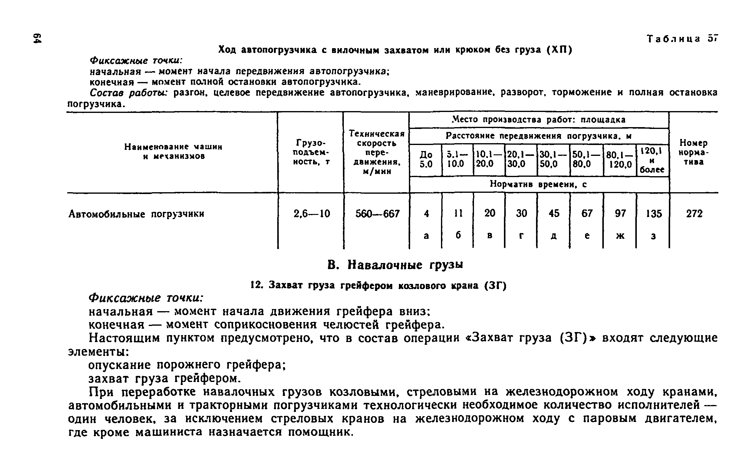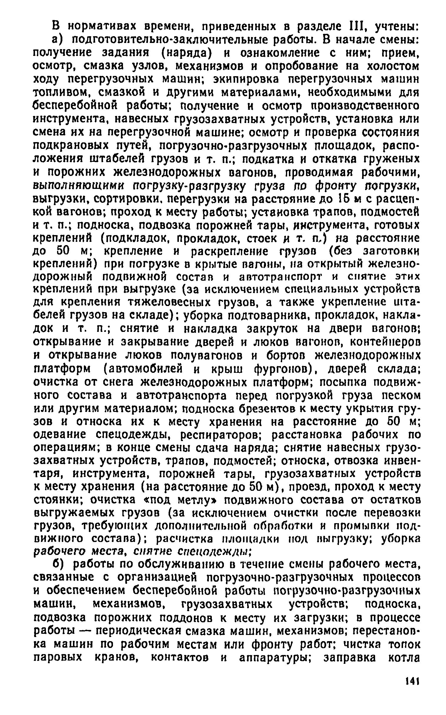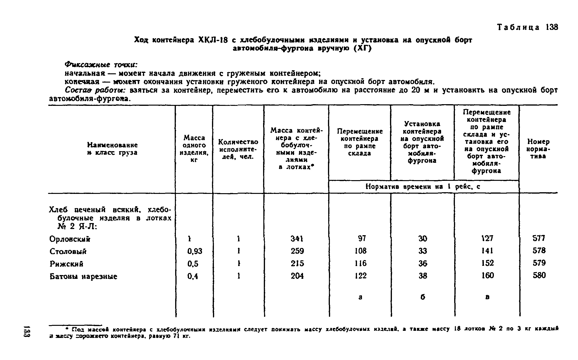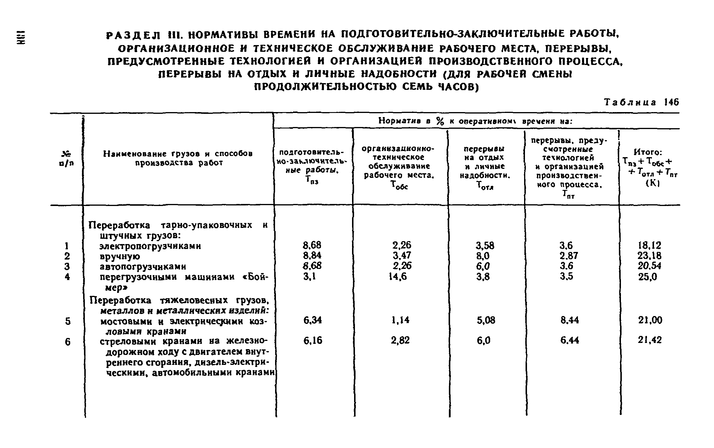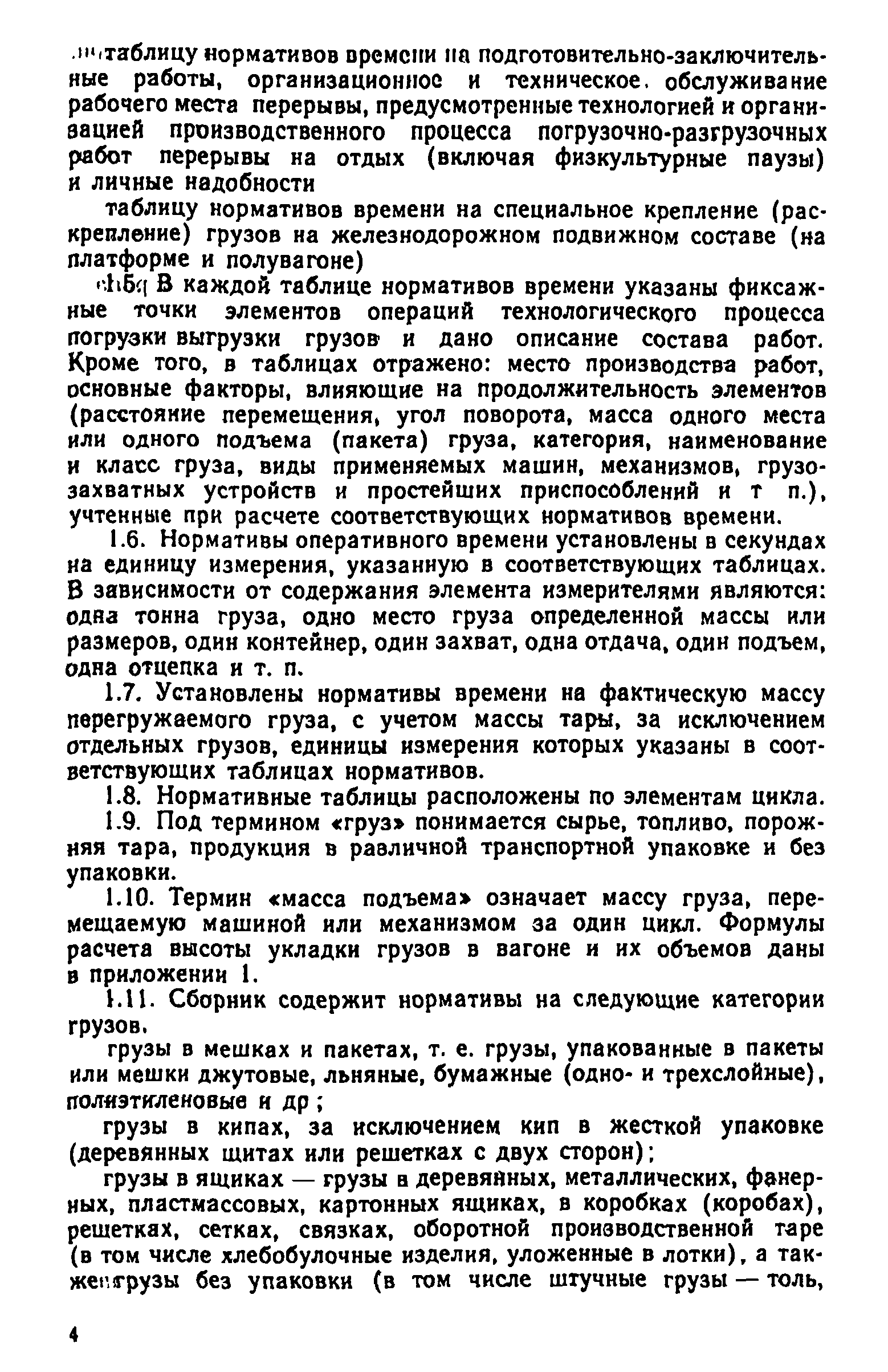 Нормативы времени на погрузочно-разгрузочные работы, выполняемые на железнодорожном, водном и автомобильном транспорте. Часть I. Погрузочно-разгрузочные работы, выполняемые на станциях железных дорог, предприятиях, в организациях, учреждениях отраслей народного хозяйства| Статус: | действует | | Название рус.: | Нормативы времени на погрузочно-разгрузочные работы, выполняемые на железнодорожном, водном и автомобильном транспорте. Часть I. Погрузочно-разгрузочные работы, выполняемые на станциях железных дорог, предприятиях, в организациях, учреждениях отраслей народного хозяйства | | Дата добавления в базу: | 01.09.2013 | | Дата актуализации: | 01.01.2021 | | Область применения: | Нормативы времени предназначены для разработки единых норм выработки и времени на вагонные, автотранспортные и складские погрузочно-разгрузочные работы, а также для разработки местных норм выработки и времени на работы, выполняемые более производительными машинами, механизмами, грузозахватными устройствами при более совершенной организации труда на станциях железных дорог, предприятиях, в организациях и учреждениях отраслей народного хозяйства | | Оглавление: | 1. Общая часть 2. Организация труда 3. Нормативная часть Раздел 1. Нормативы оперативного времени на элементы (комплексы приемов) операций технологического процесса полностью и не полностью механизированных погрузочно-разгрузочных работ А. Тарно-упаковочные и штучные грузы Б. Тяжеловесные грузы, металлы, металлические изделия и лесоматериалы В. Наволочные грузы Раздел II. Нормативы времени на элементы операций технологического процесса погрузочно-разгрузочных работ, выполняемых вручную с применением и без применения простейших приспособлений Раздел III. Нормативы времени на подготовительно-заключительные работы, организационное и техническое обслуживание рабочего места, перерывы, предусмотренные технологией и организацией производственного процесса, перерывы на отдых и личные надобности Раздел IV. Нормативы времени на специальное крепление (раскрепление) грузов на железнодорожном подвижном составе (на платформе или в полувагоне) Раздел V. Примеры расчета комплексных норм выработки и времени по нормативам Приложение 1. Формула расчета высоты укладки грузов в вагоне и их объемов Приложение 2. Классификационный список грузов Приложение 3. Классификационные показатели грузов Приложение 4. Примерный перечень основных погрузочно-разгрузочных машин и механизмов Приложение 5. Примерные схемы укладки груза на поддоны Приложение 6. Коэффициент заполнения грузозахватных устройств навалочными грузами | | Разработан: | ЦБНТ