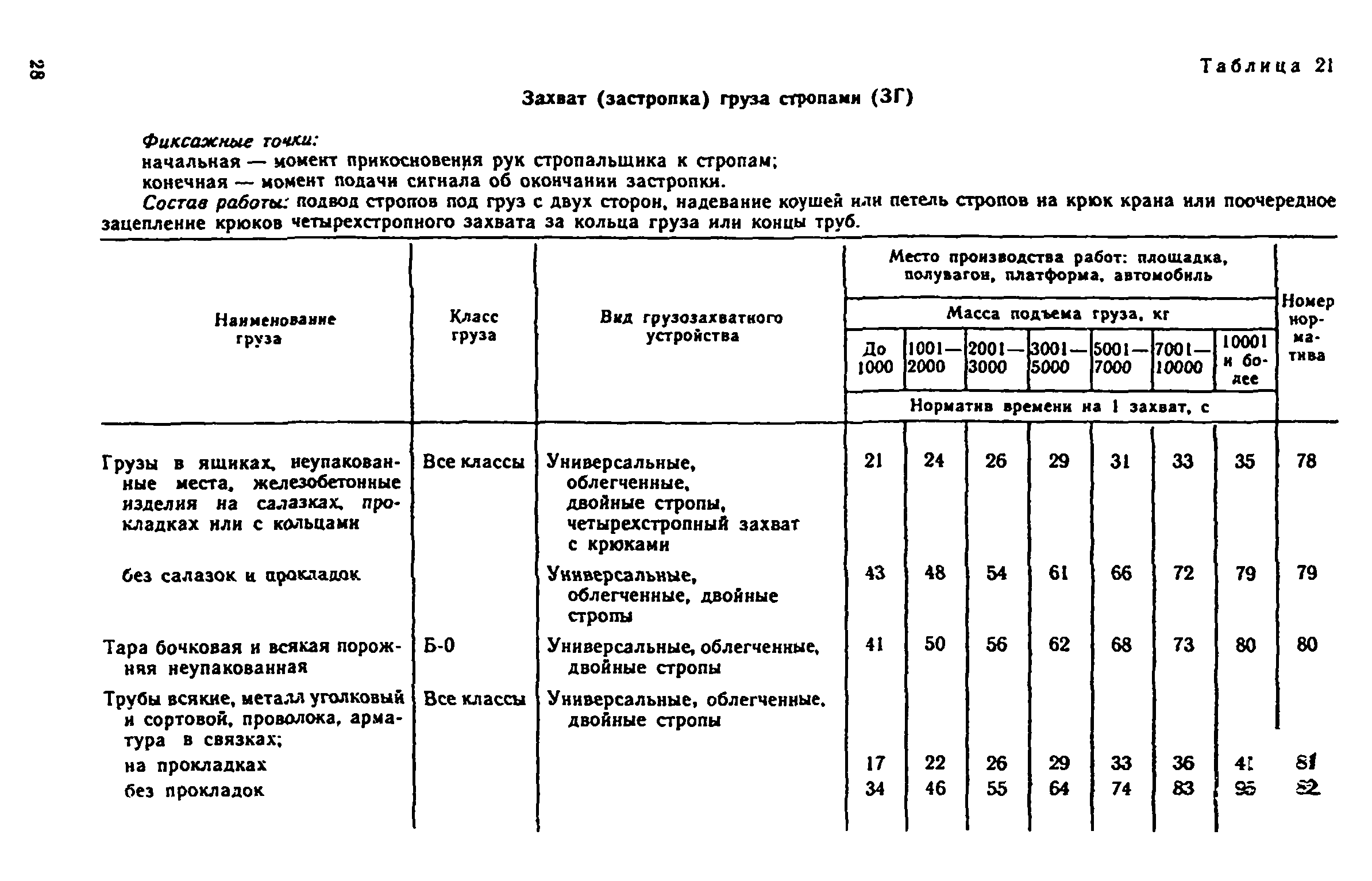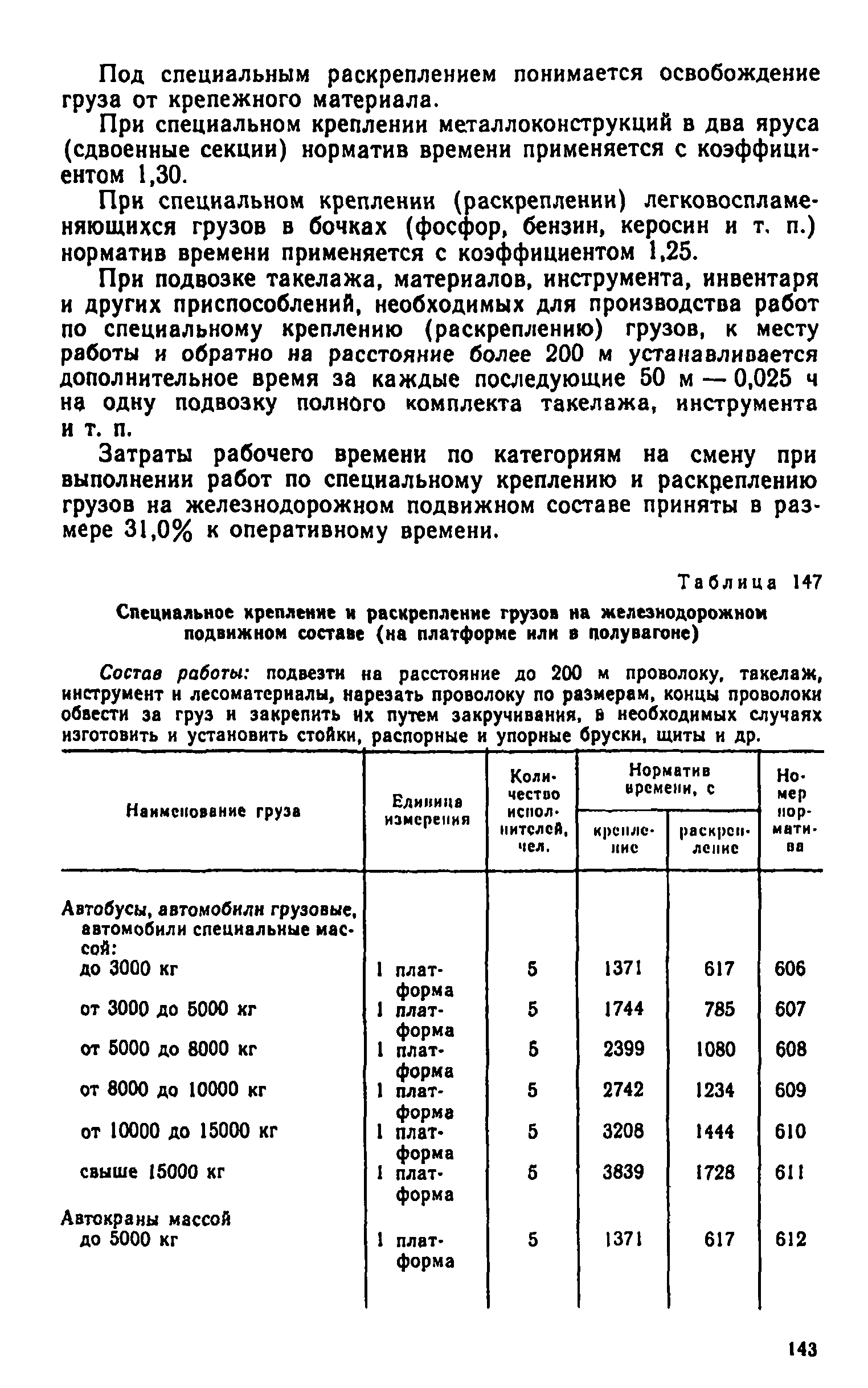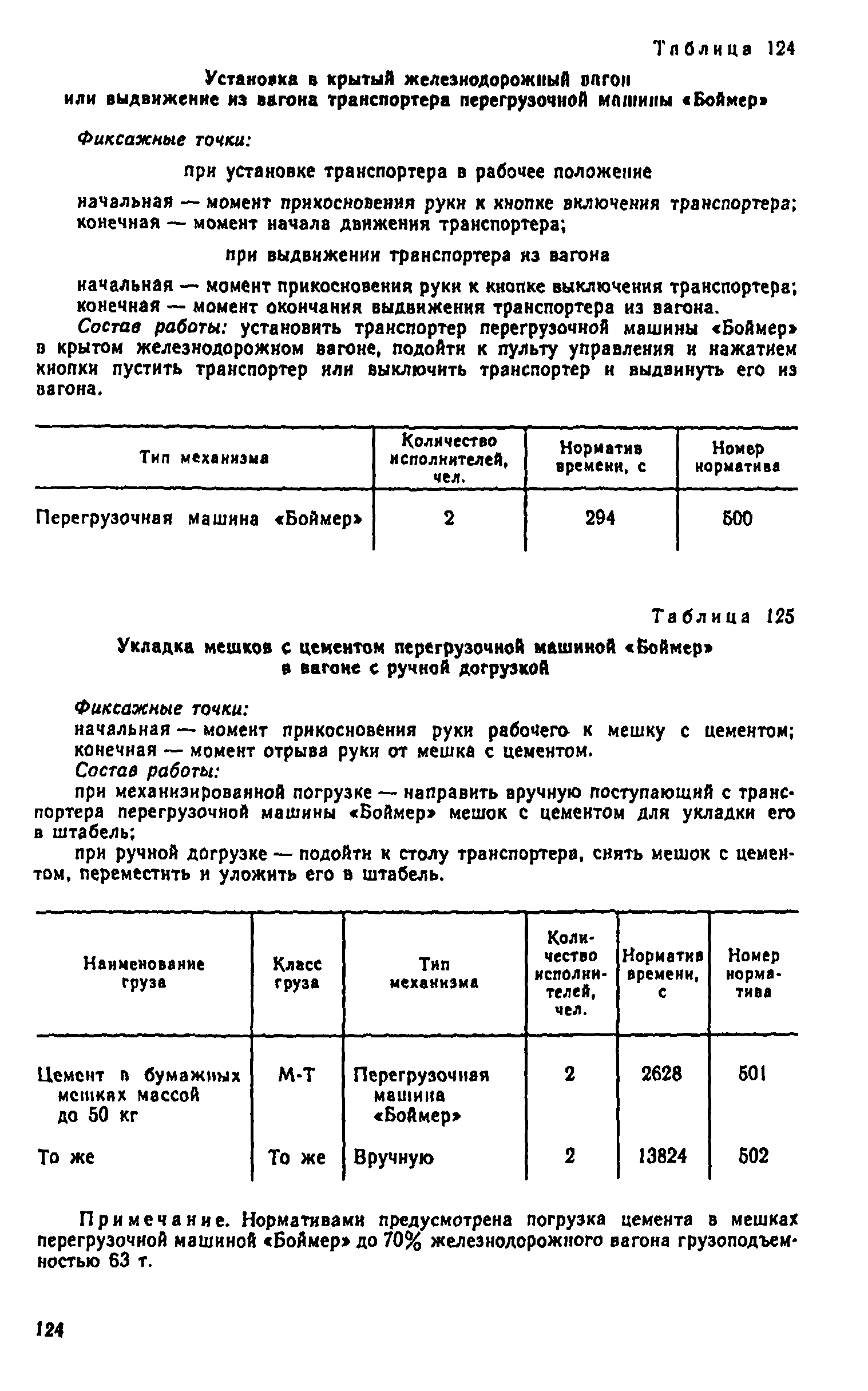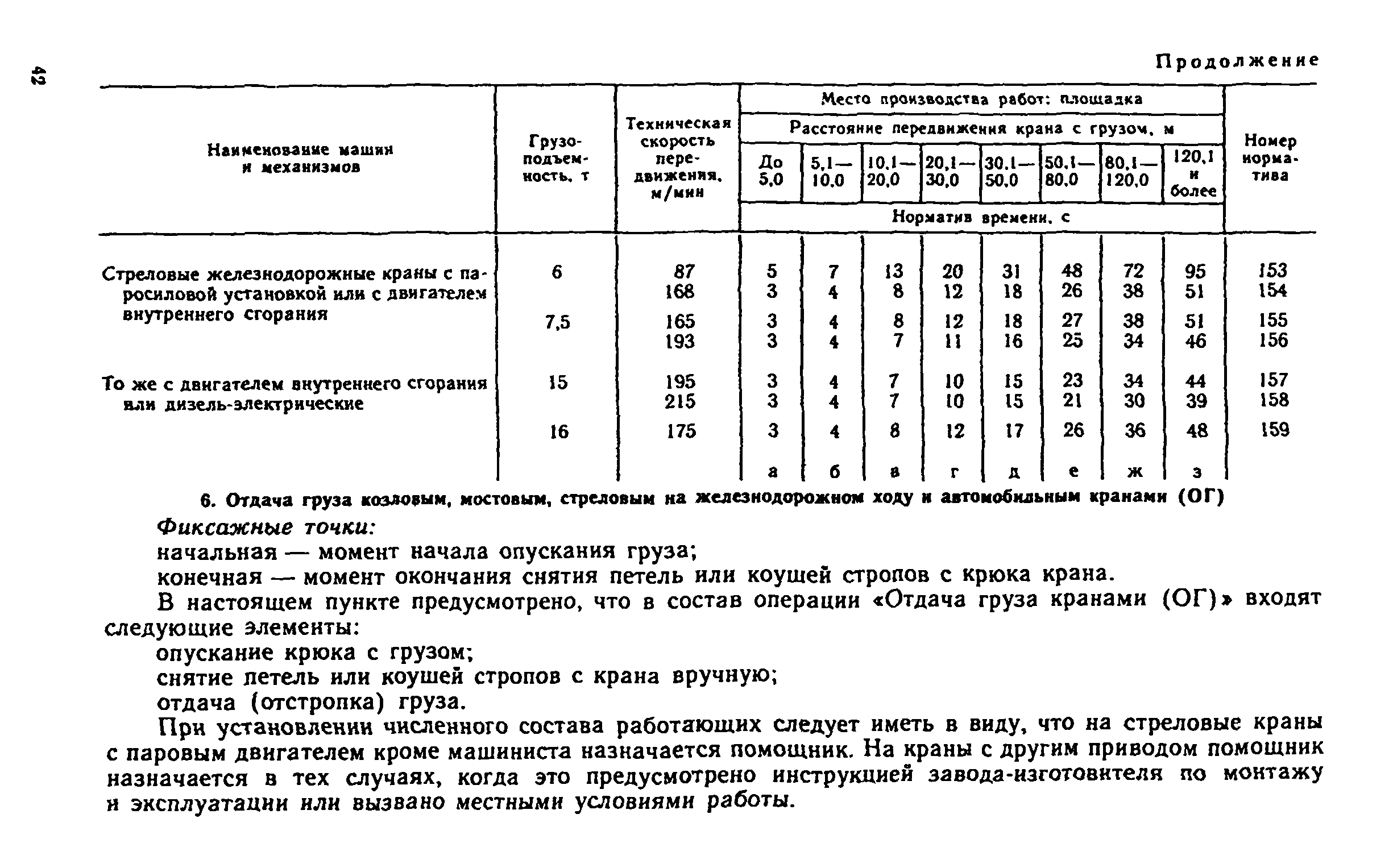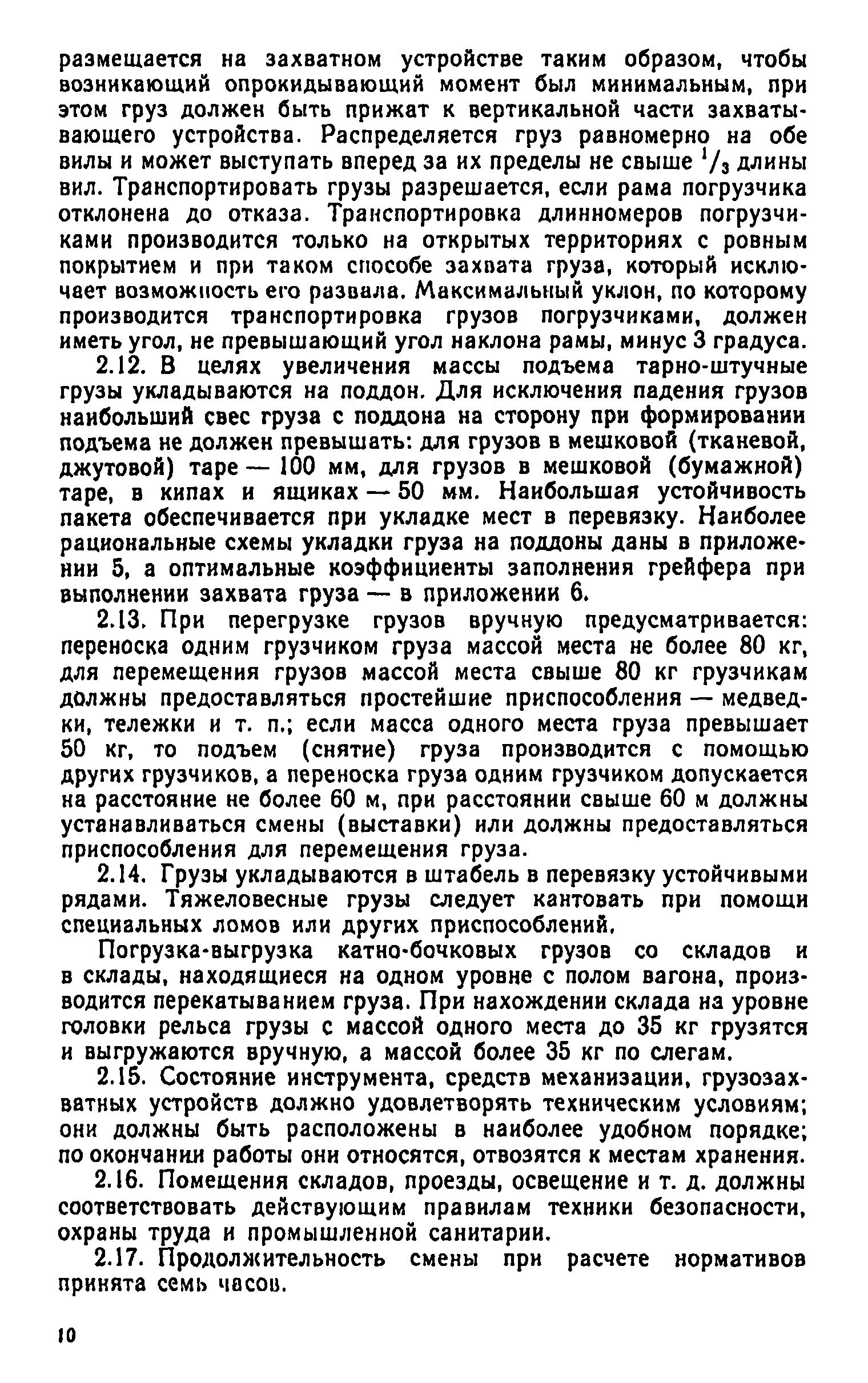 Нормативы времени на погрузочно-разгрузочные работы, выполняемые на железнодорожном, водном и автомобильном транспорте. Часть I. Погрузочно-разгрузочные работы, выполняемые на станциях железных дорог, предприятиях, в организациях, учреждениях отраслей народного хозяйства| Статус: | действует | | Название рус.: | Нормативы времени на погрузочно-разгрузочные работы, выполняемые на железнодорожном, водном и автомобильном транспорте. Часть I. Погрузочно-разгрузочные работы, выполняемые на станциях железных дорог, предприятиях, в организациях, учреждениях отраслей народного хозяйства | | Дата добавления в базу: | 01.09.2013 | | Дата актуализации: | 01.01.2021 | | Область применения: | Нормативы времени предназначены для разработки единых норм выработки и времени на вагонные, автотранспортные и складские погрузочно-разгрузочные работы, а также для разработки местных норм выработки и времени на работы, выполняемые более производительными машинами, механизмами, грузозахватными устройствами при более совершенной организации труда на станциях железных дорог, предприятиях, в организациях и учреждениях отраслей народного хозяйства | | Оглавление: | 1. Общая часть 2. Организация труда 3. Нормативная часть Раздел 1. Нормативы оперативного времени на элементы (комплексы приемов) операций технологического процесса полностью и не полностью механизированных погрузочно-разгрузочных работ А. Тарно-упаковочные и штучные грузы Б. Тяжеловесные грузы, металлы, металлические изделия и лесоматериалы В. Наволочные грузы Раздел II. Нормативы времени на элементы операций технологического процесса погрузочно-разгрузочных работ, выполняемых вручную с применением и без применения простейших приспособлений Раздел III. Нормативы времени на подготовительно-заключительные работы, организационное и техническое обслуживание рабочего места, перерывы, предусмотренные технологией и организацией производственного процесса, перерывы на отдых и личные надобности Раздел IV. Нормативы времени на специальное крепление (раскрепление) грузов на железнодорожном подвижном составе (на платформе или в полувагоне) Раздел V. Примеры расчета комплексных норм выработки и времени по нормативам Приложение 1. Формула расчета высоты укладки грузов в вагоне и их объемов Приложение 2. Классификационный список грузов Приложение 3. Классификационные показатели грузов Приложение 4. Примерный перечень основных погрузочно-разгрузочных машин и механизмов Приложение 5. Примерные схемы укладки груза на поддоны Приложение 6. Коэффициент заполнения грузозахватных устройств навалочными грузами | | Разработан: | ЦБНТ