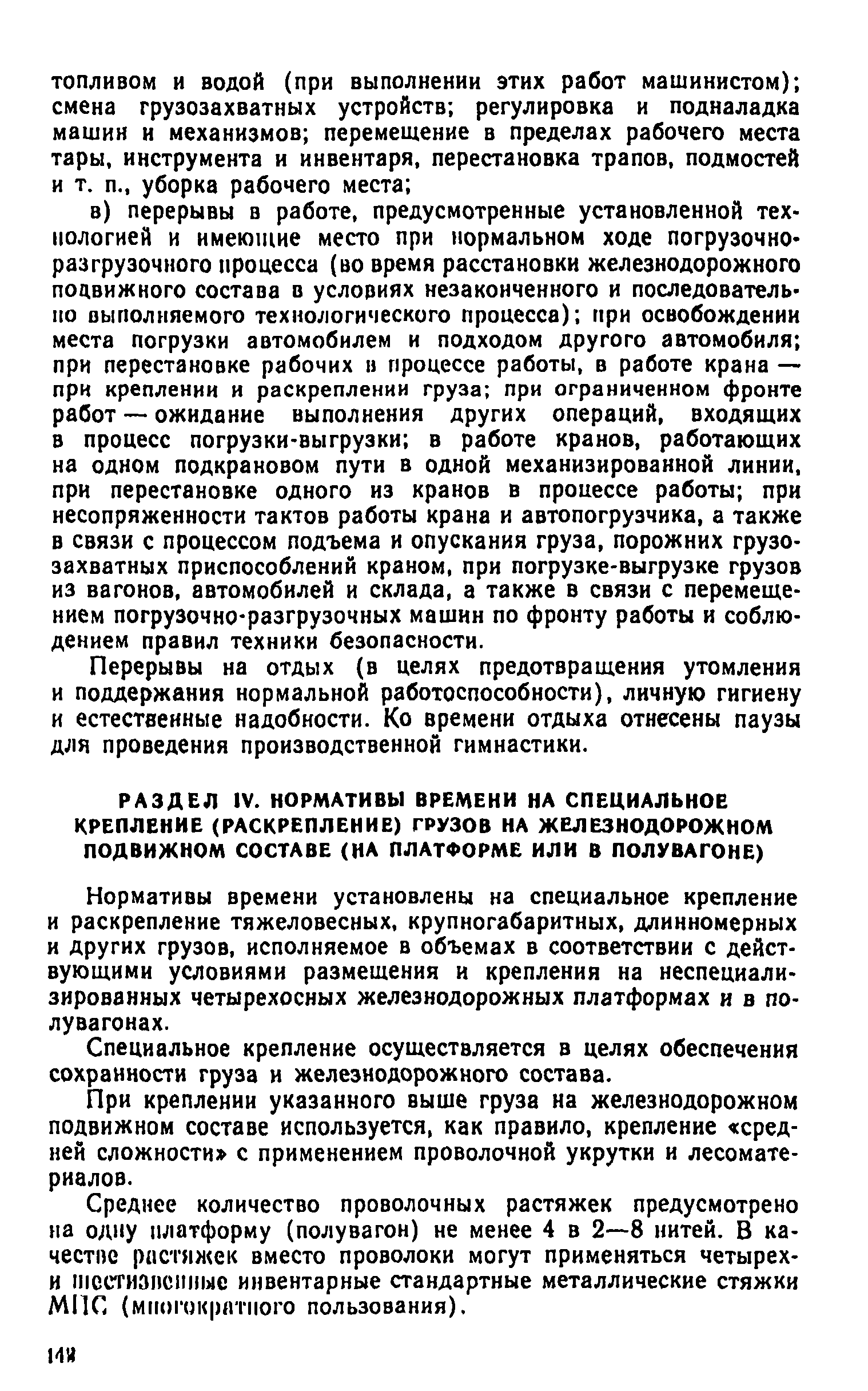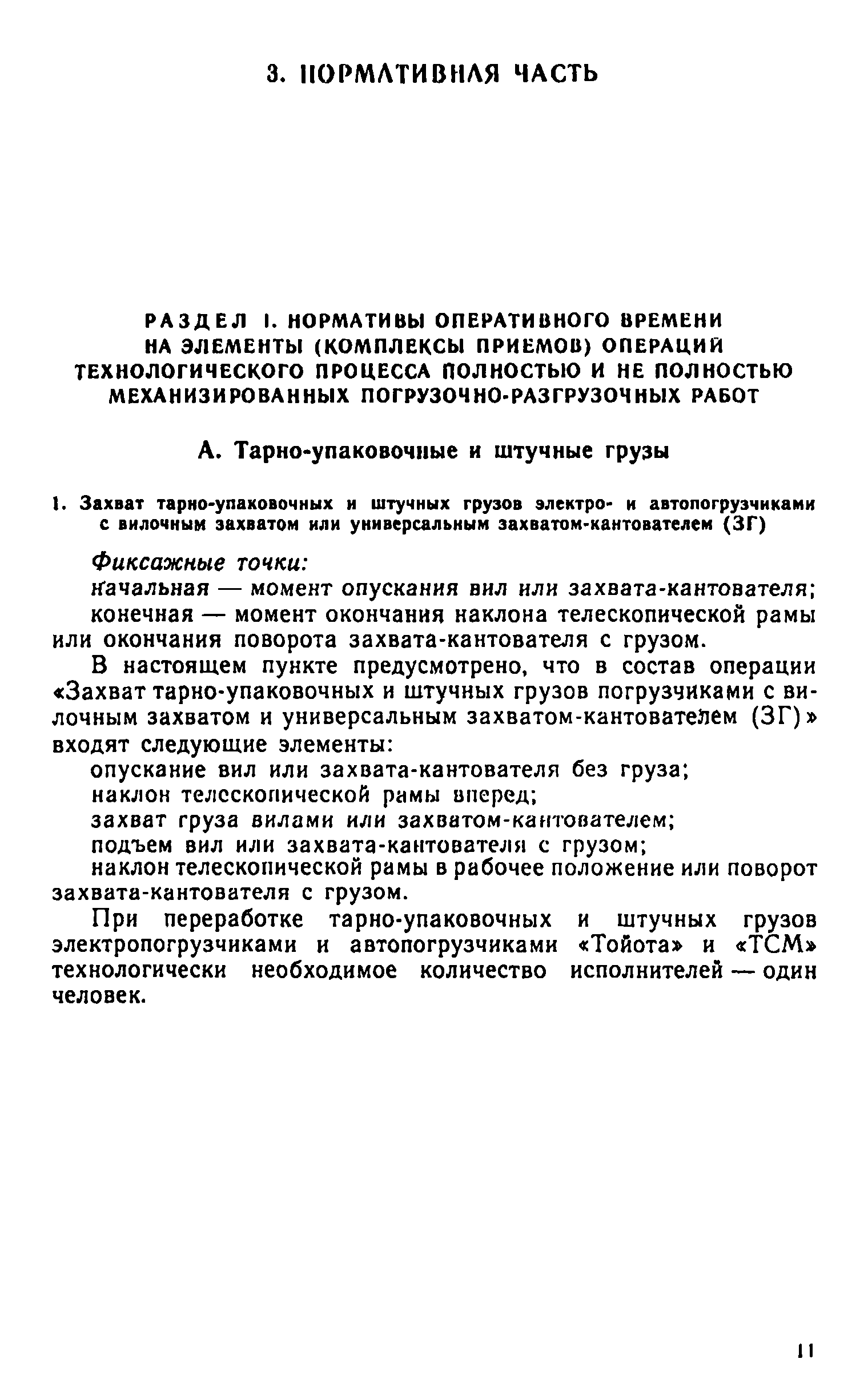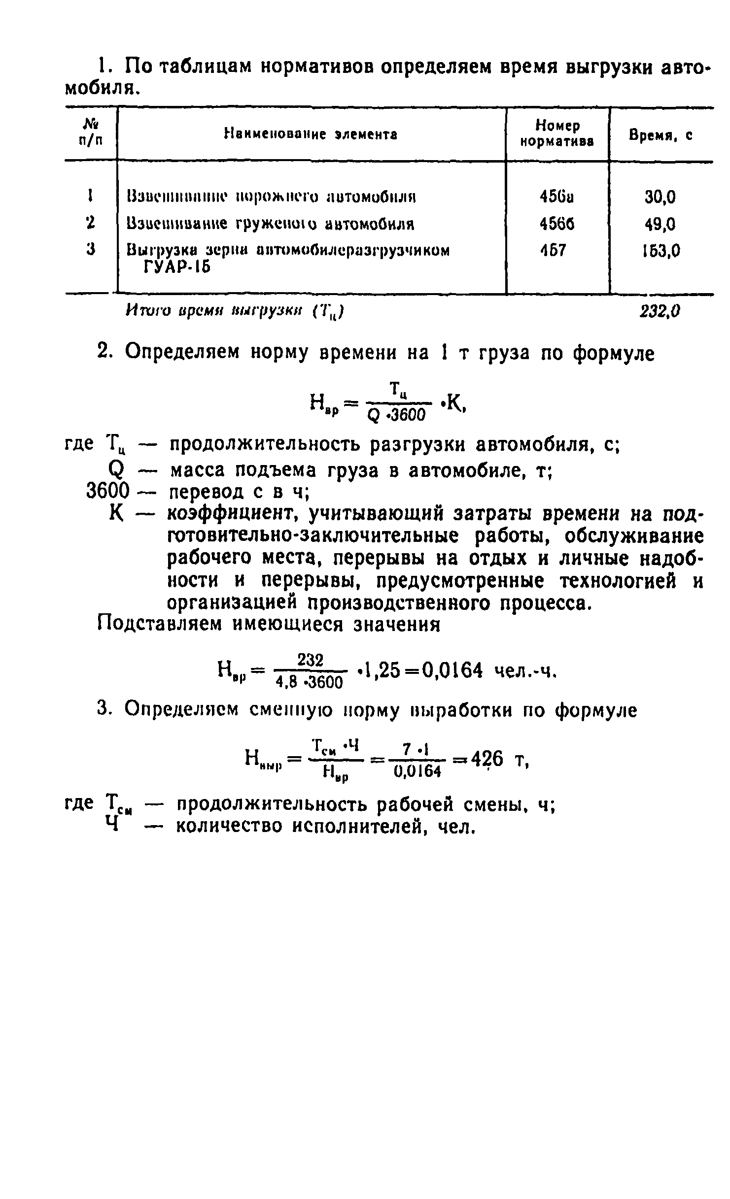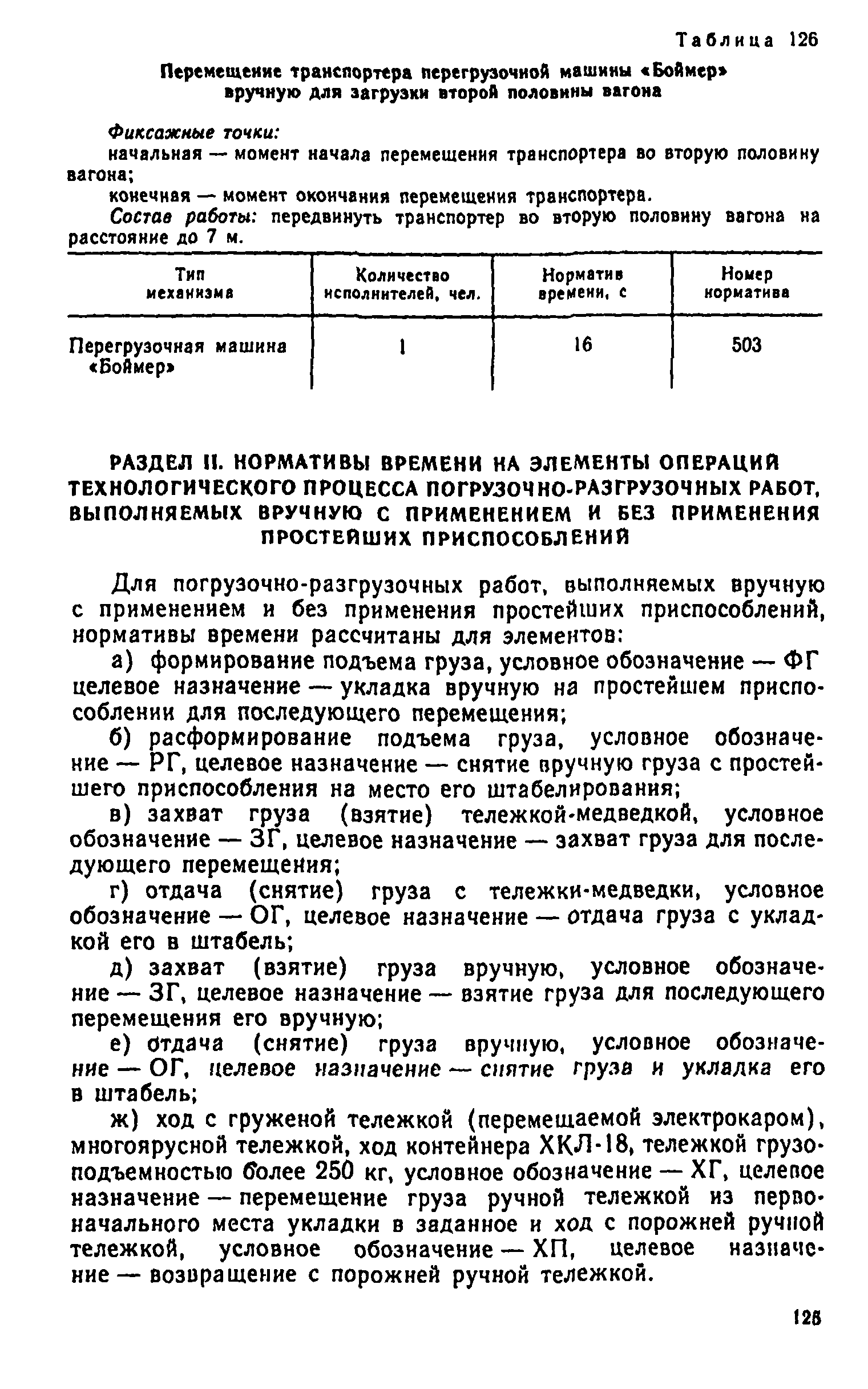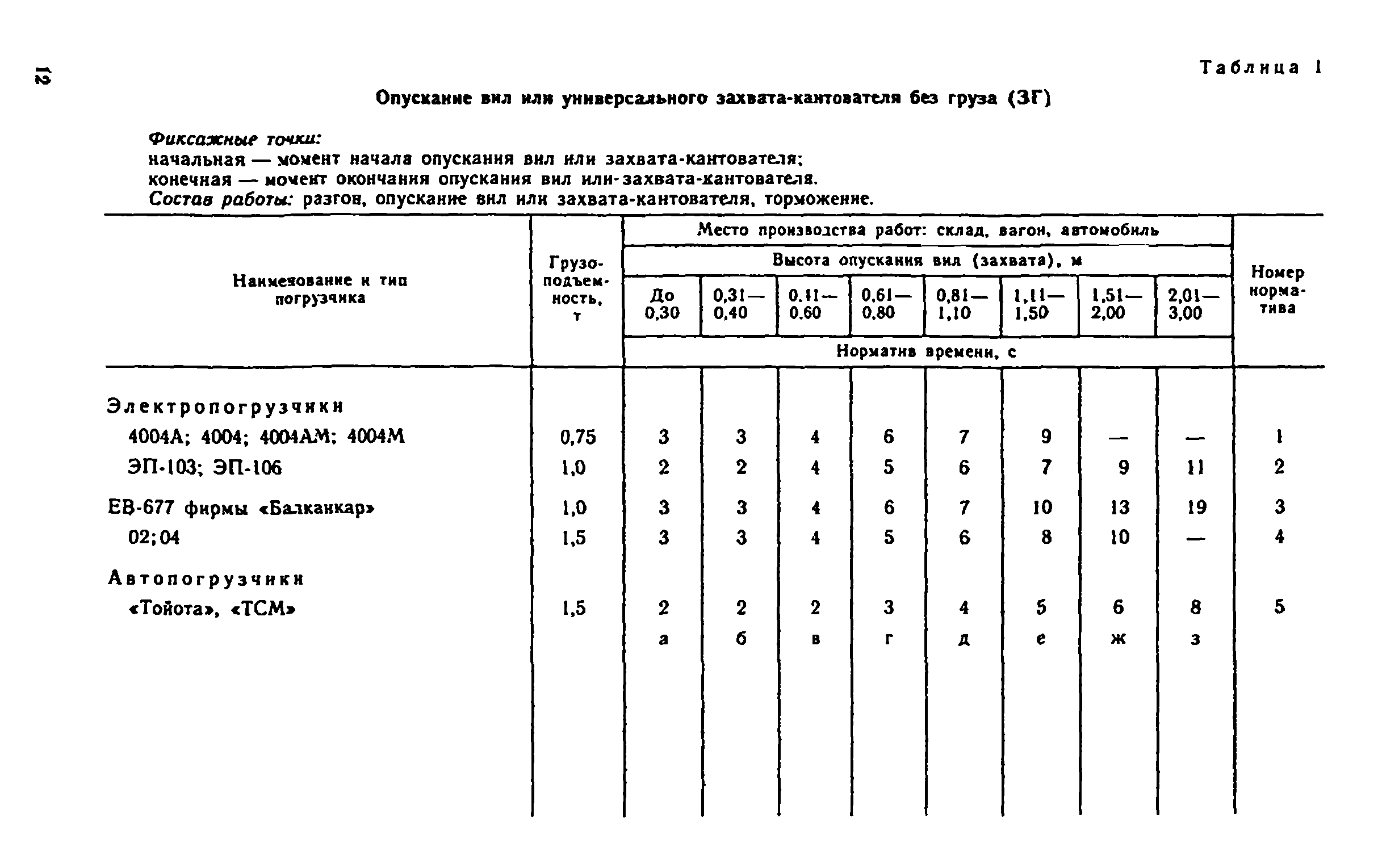 Нормативы времени на погрузочно-разгрузочные работы, выполняемые на железнодорожном, водном и автомобильном транспорте. Часть I. Погрузочно-разгрузочные работы, выполняемые на станциях железных дорог, предприятиях, в организациях, учреждениях отраслей народного хозяйства| Статус: | действует | | Название рус.: | Нормативы времени на погрузочно-разгрузочные работы, выполняемые на железнодорожном, водном и автомобильном транспорте. Часть I. Погрузочно-разгрузочные работы, выполняемые на станциях железных дорог, предприятиях, в организациях, учреждениях отраслей народного хозяйства | | Дата добавления в базу: | 01.09.2013 | | Дата актуализации: | 01.01.2021 | | Область применения: | Нормативы времени предназначены для разработки единых норм выработки и времени на вагонные, автотранспортные и складские погрузочно-разгрузочные работы, а также для разработки местных норм выработки и времени на работы, выполняемые более производительными машинами, механизмами, грузозахватными устройствами при более совершенной организации труда на станциях железных дорог, предприятиях, в организациях и учреждениях отраслей народного хозяйства | | Оглавление: | 1. Общая часть 2. Организация труда 3. Нормативная часть Раздел 1. Нормативы оперативного времени на элементы (комплексы приемов) операций технологического процесса полностью и не полностью механизированных погрузочно-разгрузочных работ А. Тарно-упаковочные и штучные грузы Б. Тяжеловесные грузы, металлы, металлические изделия и лесоматериалы В. Наволочные грузы Раздел II. Нормативы времени на элементы операций технологического процесса погрузочно-разгрузочных работ, выполняемых вручную с применением и без применения простейших приспособлений Раздел III. Нормативы времени на подготовительно-заключительные работы, организационное и техническое обслуживание рабочего места, перерывы, предусмотренные технологией и организацией производственного процесса, перерывы на отдых и личные надобности Раздел IV. Нормативы времени на специальное крепление (раскрепление) грузов на железнодорожном подвижном составе (на платформе или в полувагоне) Раздел V. Примеры расчета комплексных норм выработки и времени по нормативам Приложение 1. Формула расчета высоты укладки грузов в вагоне и их объемов Приложение 2. Классификационный список грузов Приложение 3. Классификационные показатели грузов Приложение 4. Примерный перечень основных погрузочно-разгрузочных машин и механизмов Приложение 5. Примерные схемы укладки груза на поддоны Приложение 6. Коэффициент заполнения грузозахватных устройств навалочными грузами | | Разработан: | ЦБНТ