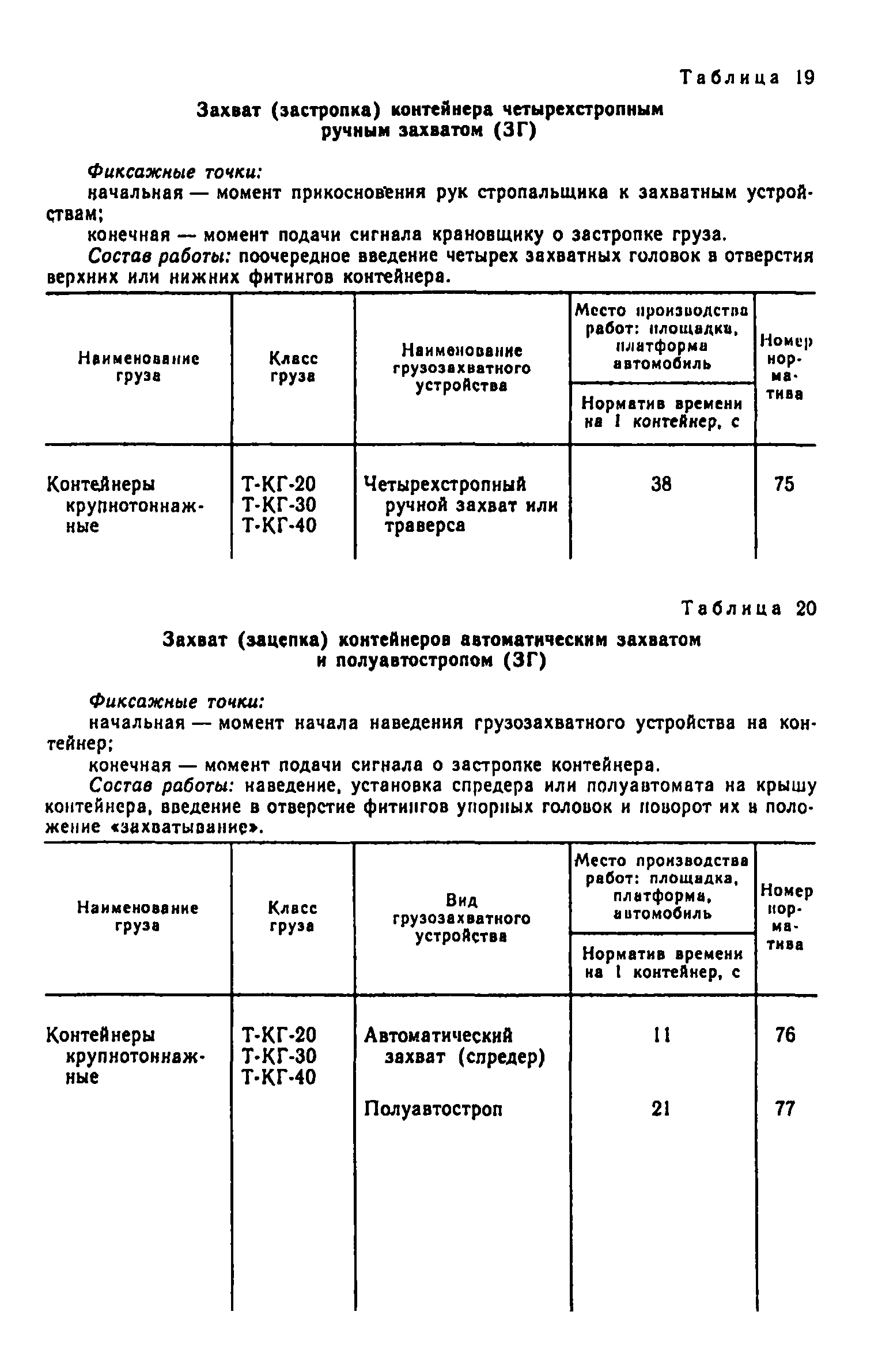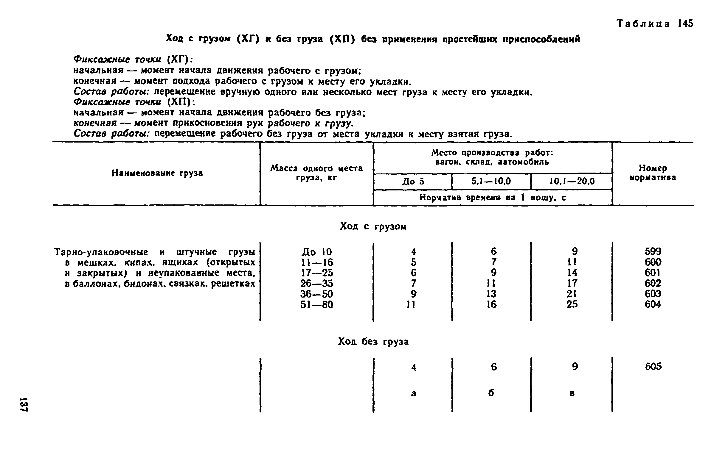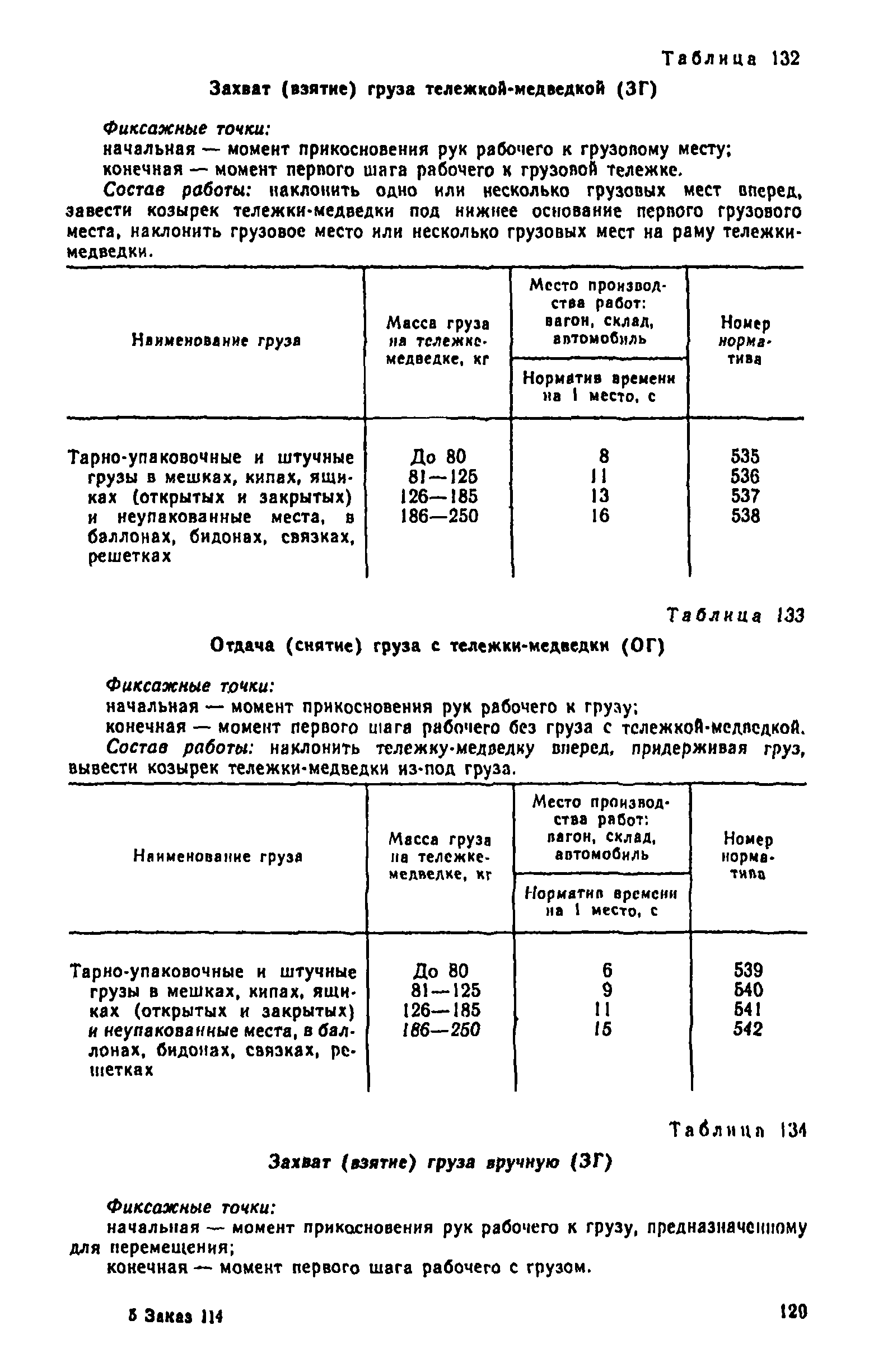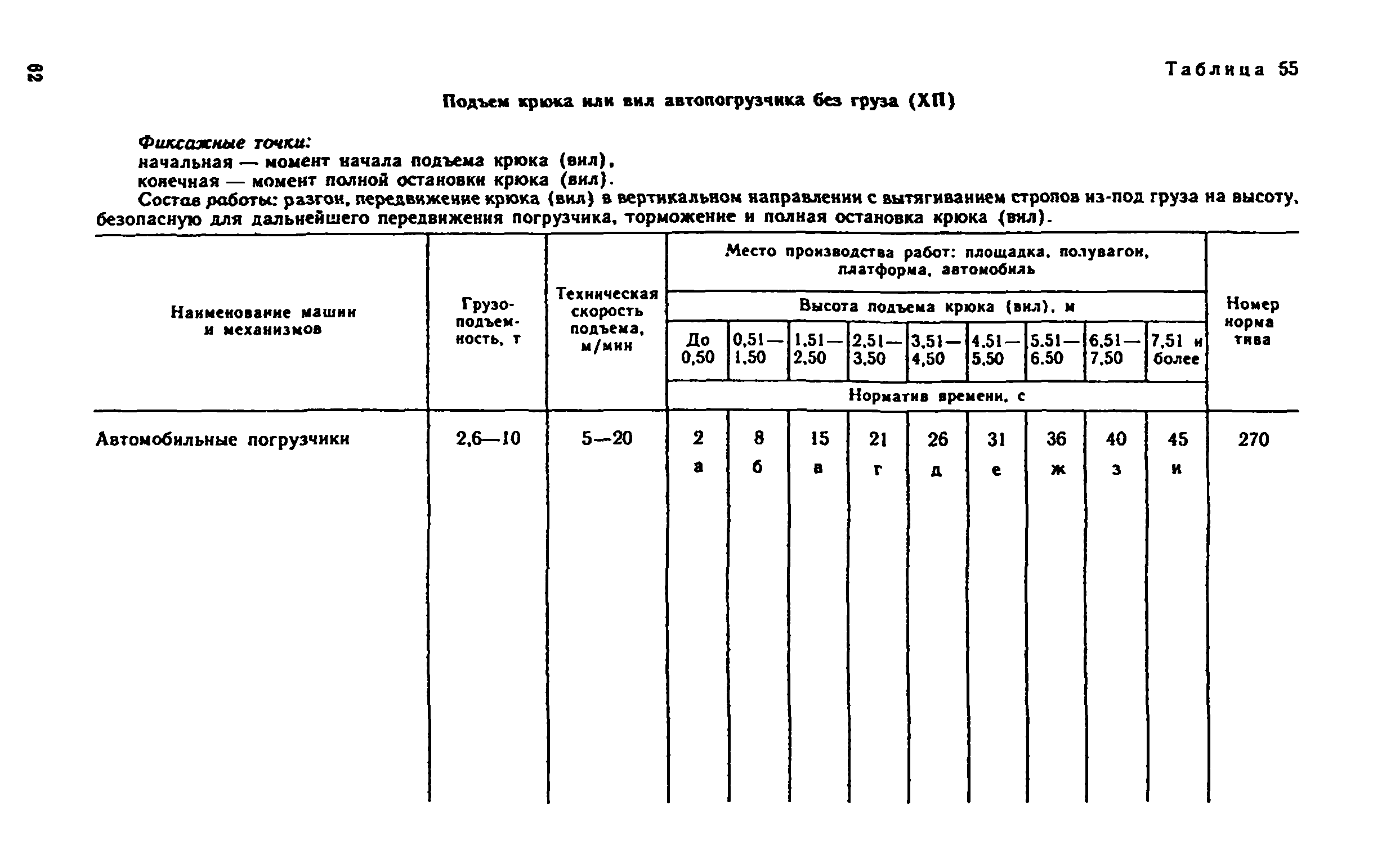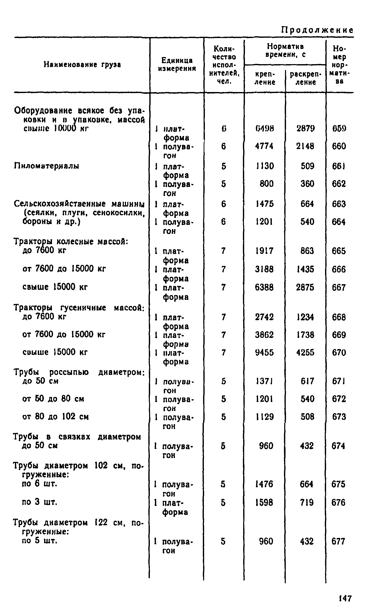 Нормативы времени на погрузочно-разгрузочные работы, выполняемые на железнодорожном, водном и автомобильном транспорте. Часть I. Погрузочно-разгрузочные работы, выполняемые на станциях железных дорог, предприятиях, в организациях, учреждениях отраслей народного хозяйства| Статус: | действует | | Название рус.: | Нормативы времени на погрузочно-разгрузочные работы, выполняемые на железнодорожном, водном и автомобильном транспорте. Часть I. Погрузочно-разгрузочные работы, выполняемые на станциях железных дорог, предприятиях, в организациях, учреждениях отраслей народного хозяйства | | Дата добавления в базу: | 01.09.2013 | | Дата актуализации: | 01.01.2021 | | Область применения: | Нормативы времени предназначены для разработки единых норм выработки и времени на вагонные, автотранспортные и складские погрузочно-разгрузочные работы, а также для разработки местных норм выработки и времени на работы, выполняемые более производительными машинами, механизмами, грузозахватными устройствами при более совершенной организации труда на станциях железных дорог, предприятиях, в организациях и учреждениях отраслей народного хозяйства | | Оглавление: | 1. Общая часть 2. Организация труда 3. Нормативная часть Раздел 1. Нормативы оперативного времени на элементы (комплексы приемов) операций технологического процесса полностью и не полностью механизированных погрузочно-разгрузочных работ А. Тарно-упаковочные и штучные грузы Б. Тяжеловесные грузы, металлы, металлические изделия и лесоматериалы В. Наволочные грузы Раздел II. Нормативы времени на элементы операций технологического процесса погрузочно-разгрузочных работ, выполняемых вручную с применением и без применения простейших приспособлений Раздел III. Нормативы времени на подготовительно-заключительные работы, организационное и техническое обслуживание рабочего места, перерывы, предусмотренные технологией и организацией производственного процесса, перерывы на отдых и личные надобности Раздел IV. Нормативы времени на специальное крепление (раскрепление) грузов на железнодорожном подвижном составе (на платформе или в полувагоне) Раздел V. Примеры расчета комплексных норм выработки и времени по нормативам Приложение 1. Формула расчета высоты укладки грузов в вагоне и их объемов Приложение 2. Классификационный список грузов Приложение 3. Классификационные показатели грузов Приложение 4. Примерный перечень основных погрузочно-разгрузочных машин и механизмов Приложение 5. Примерные схемы укладки груза на поддоны Приложение 6. Коэффициент заполнения грузозахватных устройств навалочными грузами | | Разработан: | ЦБНТ