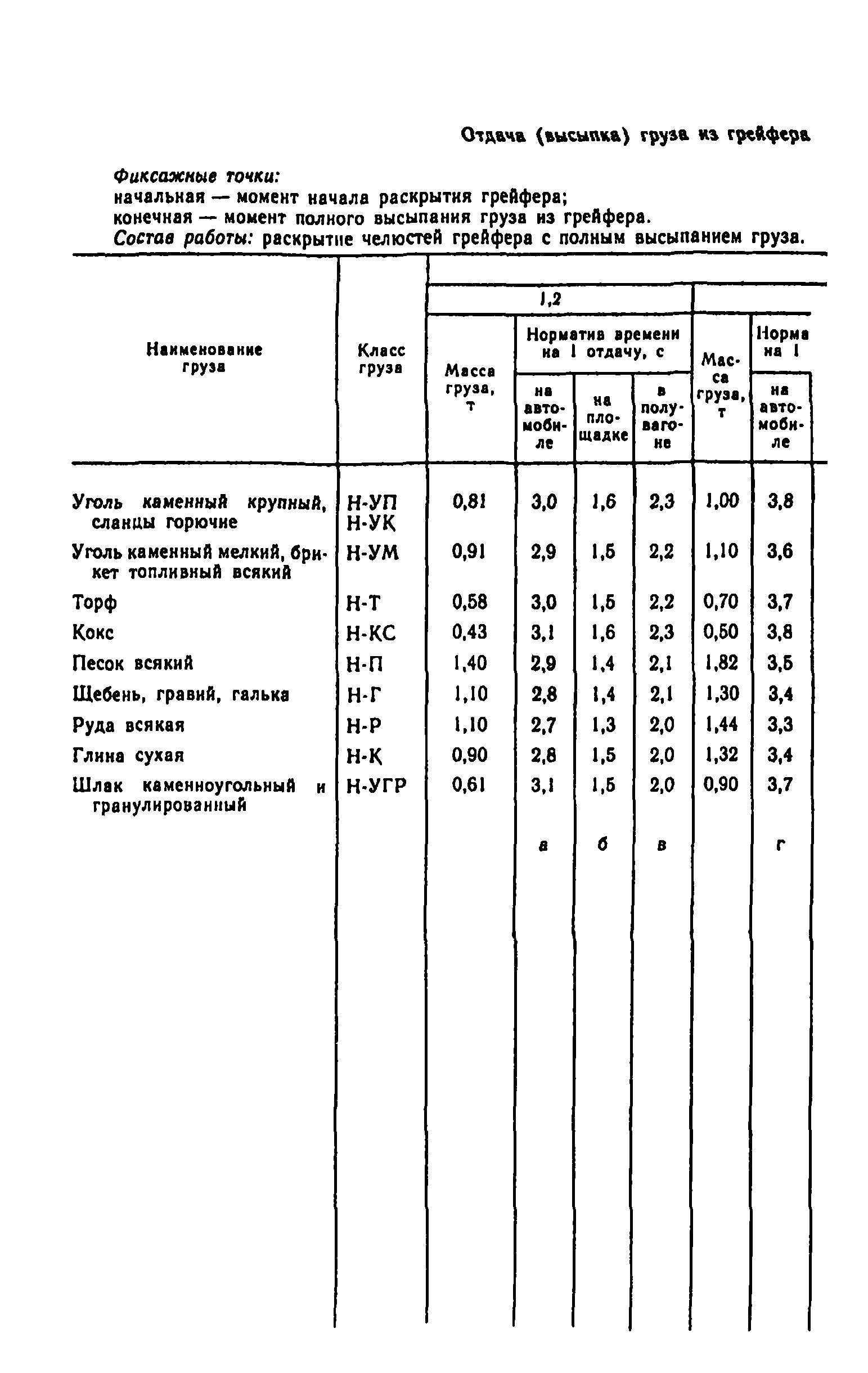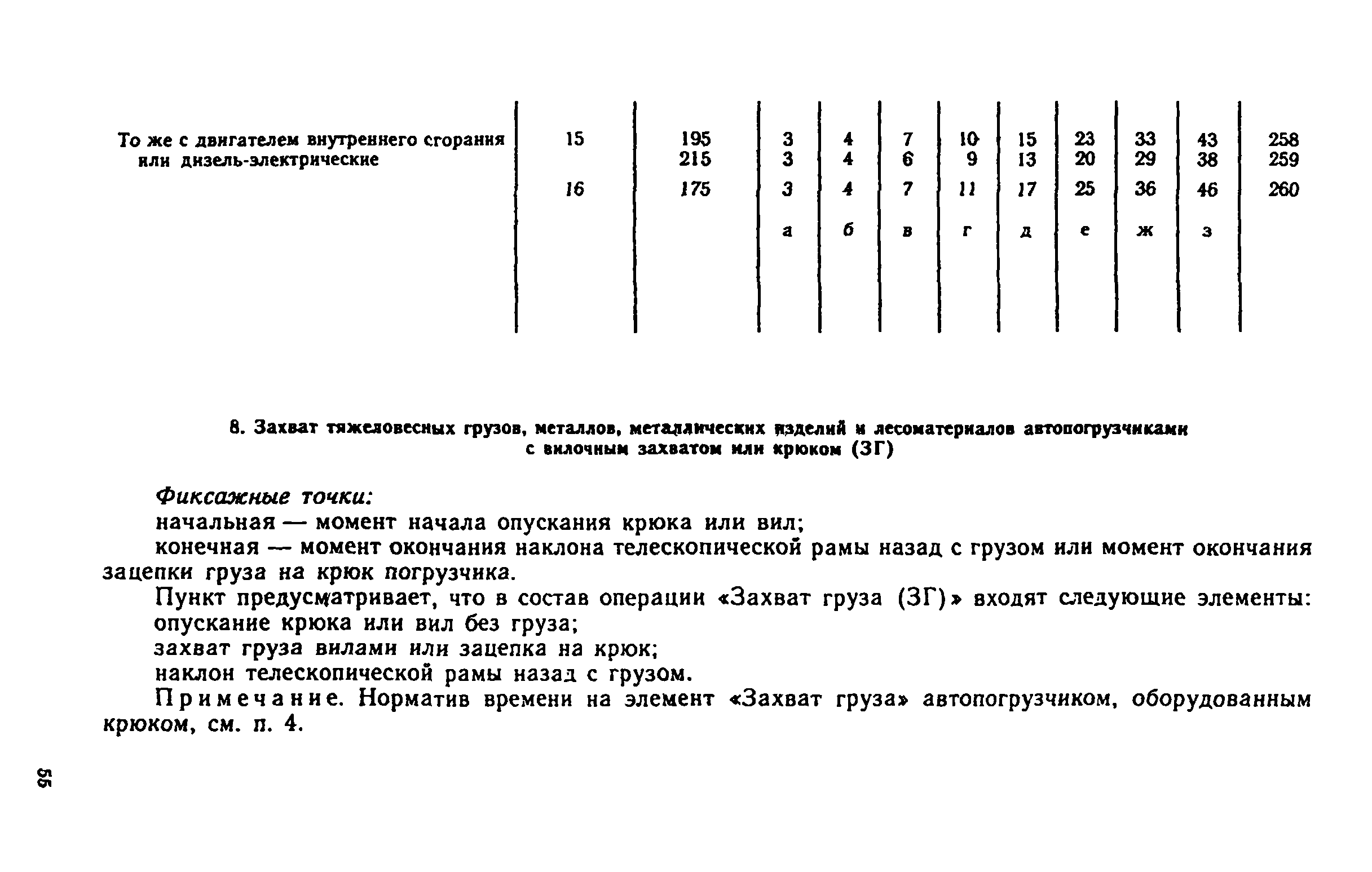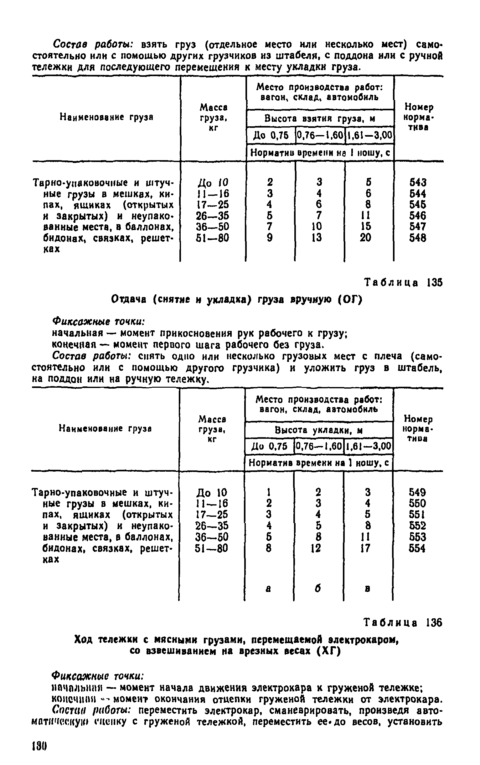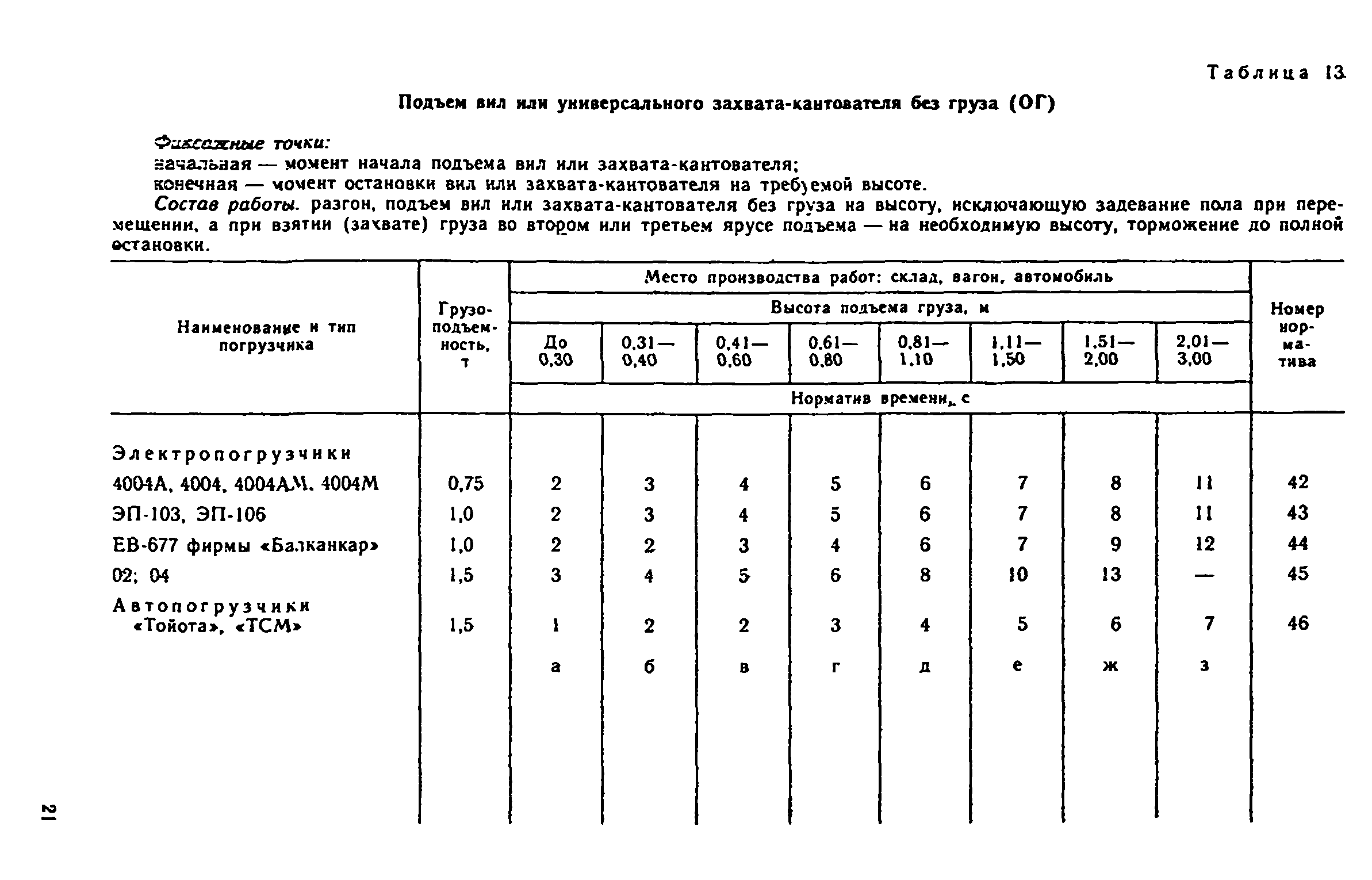 Нормативы времени на погрузочно-разгрузочные работы, выполняемые на железнодорожном, водном и автомобильном транспорте. Часть I. Погрузочно-разгрузочные работы, выполняемые на станциях железных дорог, предприятиях, в организациях, учреждениях отраслей народного хозяйства| Статус: | действует | | Название рус.: | Нормативы времени на погрузочно-разгрузочные работы, выполняемые на железнодорожном, водном и автомобильном транспорте. Часть I. Погрузочно-разгрузочные работы, выполняемые на станциях железных дорог, предприятиях, в организациях, учреждениях отраслей народного хозяйства | | Дата добавления в базу: | 01.09.2013 | | Дата актуализации: | 01.01.2021 | | Область применения: | Нормативы времени предназначены для разработки единых норм выработки и времени на вагонные, автотранспортные и складские погрузочно-разгрузочные работы, а также для разработки местных норм выработки и времени на работы, выполняемые более производительными машинами, механизмами, грузозахватными устройствами при более совершенной организации труда на станциях железных дорог, предприятиях, в организациях и учреждениях отраслей народного хозяйства | | Оглавление: | 1. Общая часть 2. Организация труда 3. Нормативная часть Раздел 1. Нормативы оперативного времени на элементы (комплексы приемов) операций технологического процесса полностью и не полностью механизированных погрузочно-разгрузочных работ А. Тарно-упаковочные и штучные грузы Б. Тяжеловесные грузы, металлы, металлические изделия и лесоматериалы В. Наволочные грузы Раздел II. Нормативы времени на элементы операций технологического процесса погрузочно-разгрузочных работ, выполняемых вручную с применением и без применения простейших приспособлений Раздел III. Нормативы времени на подготовительно-заключительные работы, организационное и техническое обслуживание рабочего места, перерывы, предусмотренные технологией и организацией производственного процесса, перерывы на отдых и личные надобности Раздел IV. Нормативы времени на специальное крепление (раскрепление) грузов на железнодорожном подвижном составе (на платформе или в полувагоне) Раздел V. Примеры расчета комплексных норм выработки и времени по нормативам Приложение 1. Формула расчета высоты укладки грузов в вагоне и их объемов Приложение 2. Классификационный список грузов Приложение 3. Классификационные показатели грузов Приложение 4. Примерный перечень основных погрузочно-разгрузочных машин и механизмов Приложение 5. Примерные схемы укладки груза на поддоны Приложение 6. Коэффициент заполнения грузозахватных устройств навалочными грузами | | Разработан: | ЦБНТ